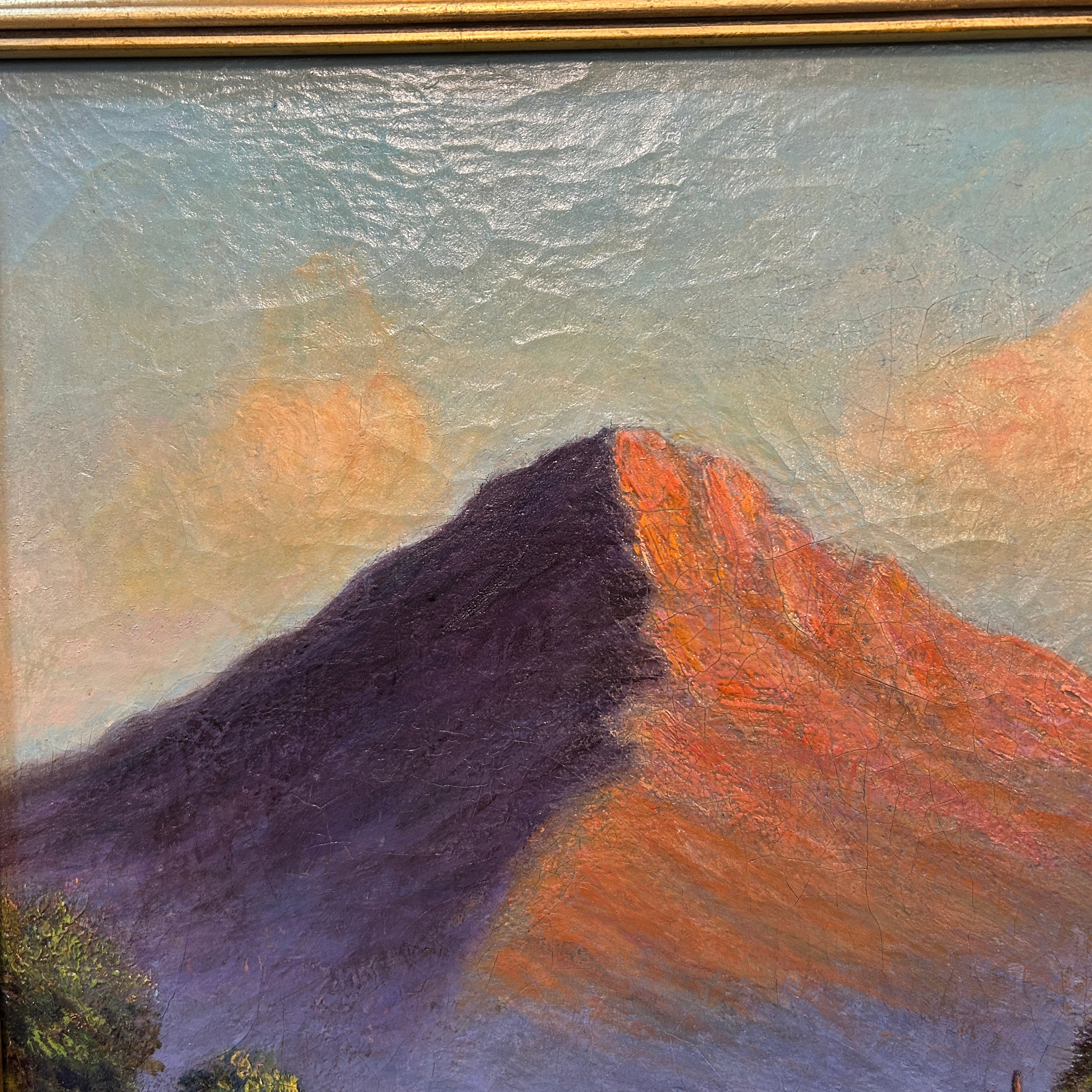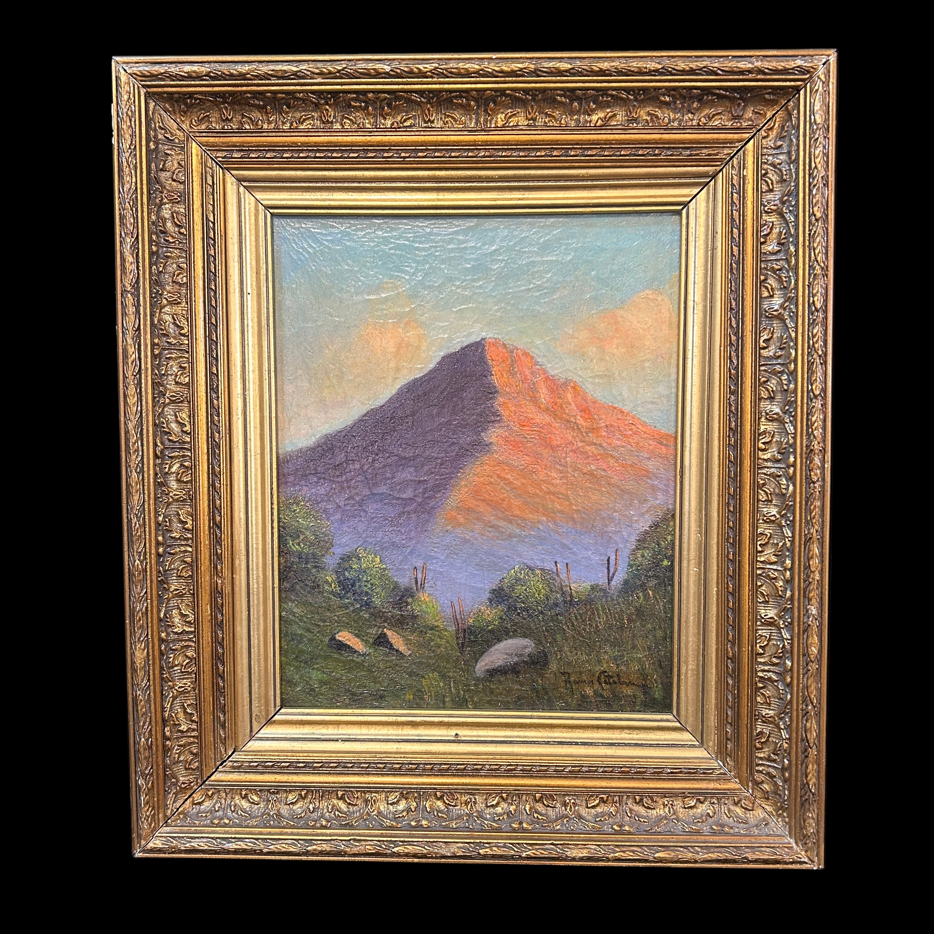 Hermosa pintura de Ramos Catalán, que registra una imponente montaña en tonos rosas y celestres, que a sus pies le acompaña una vegetación con verdes muy intensos.