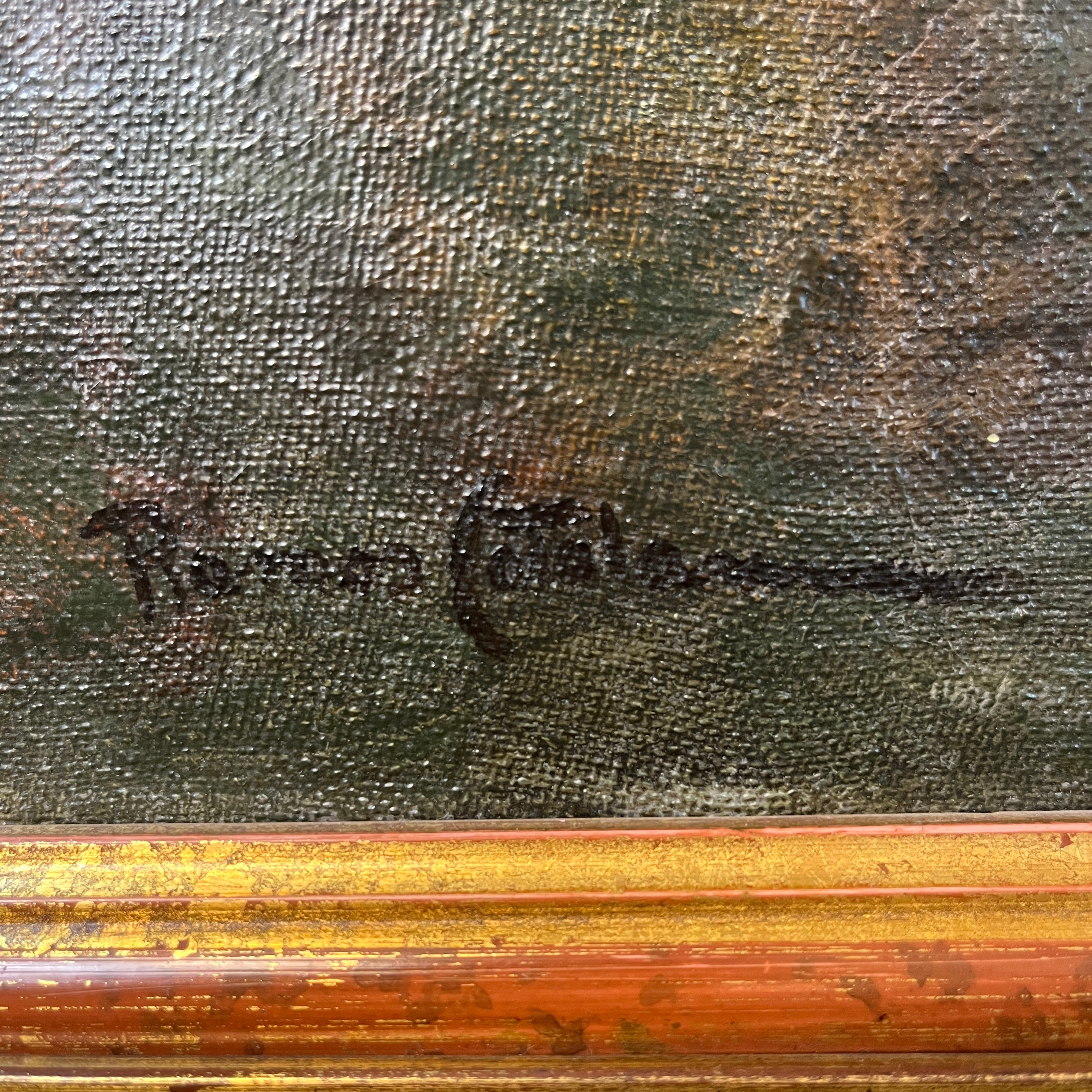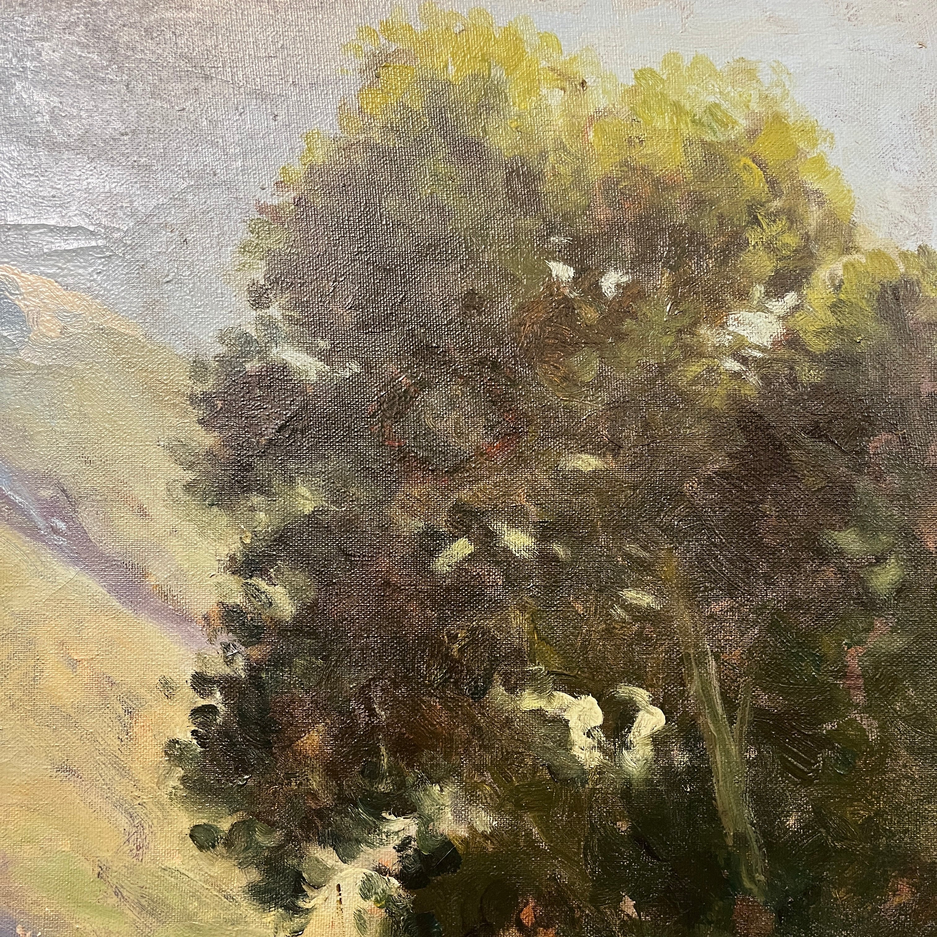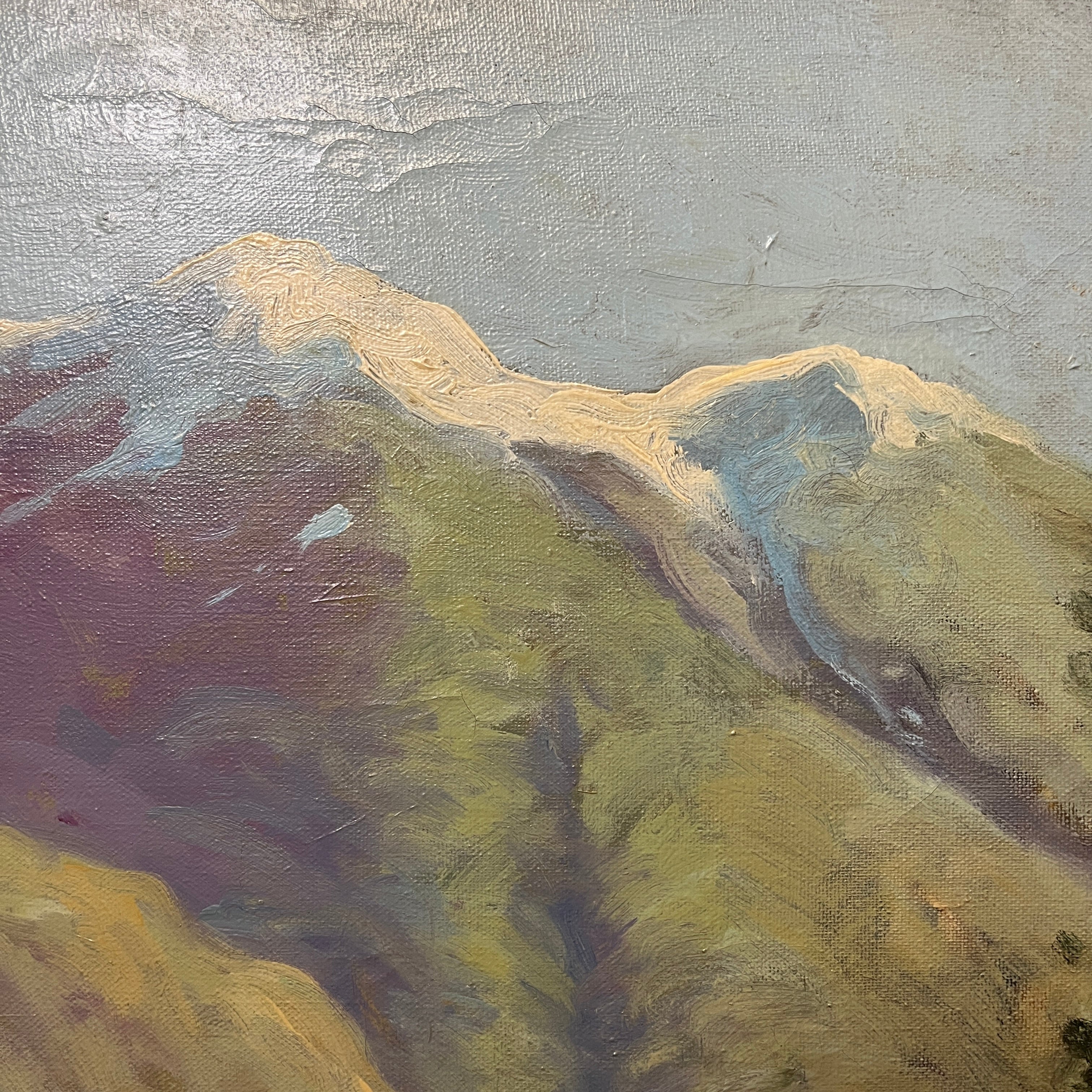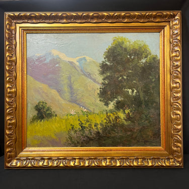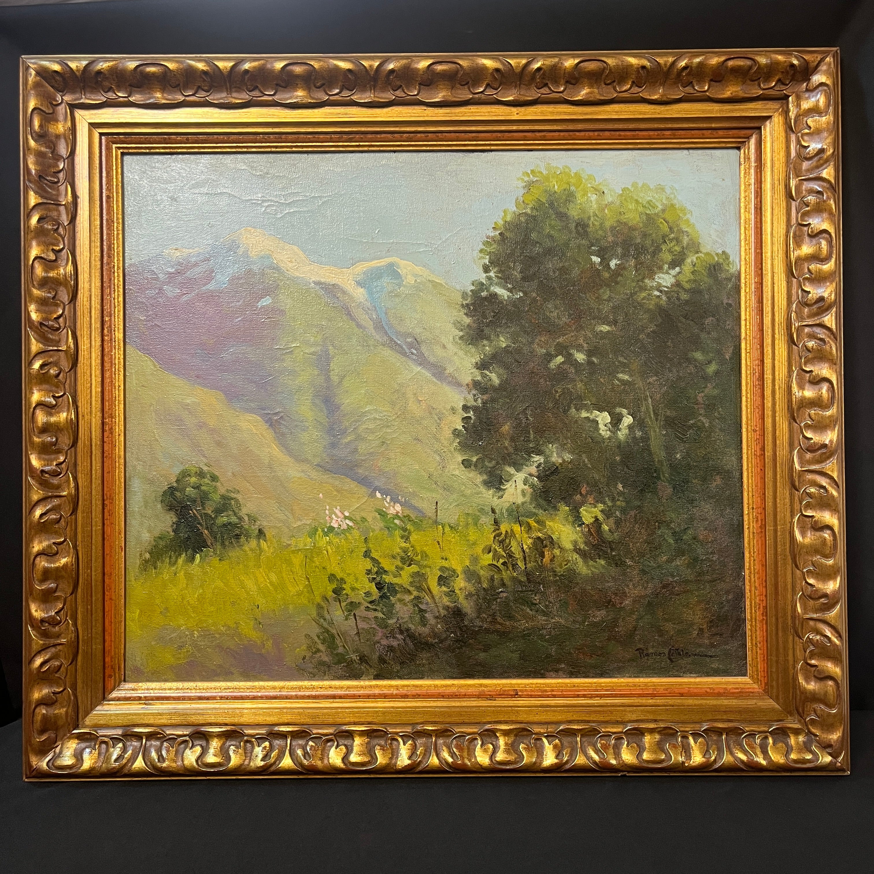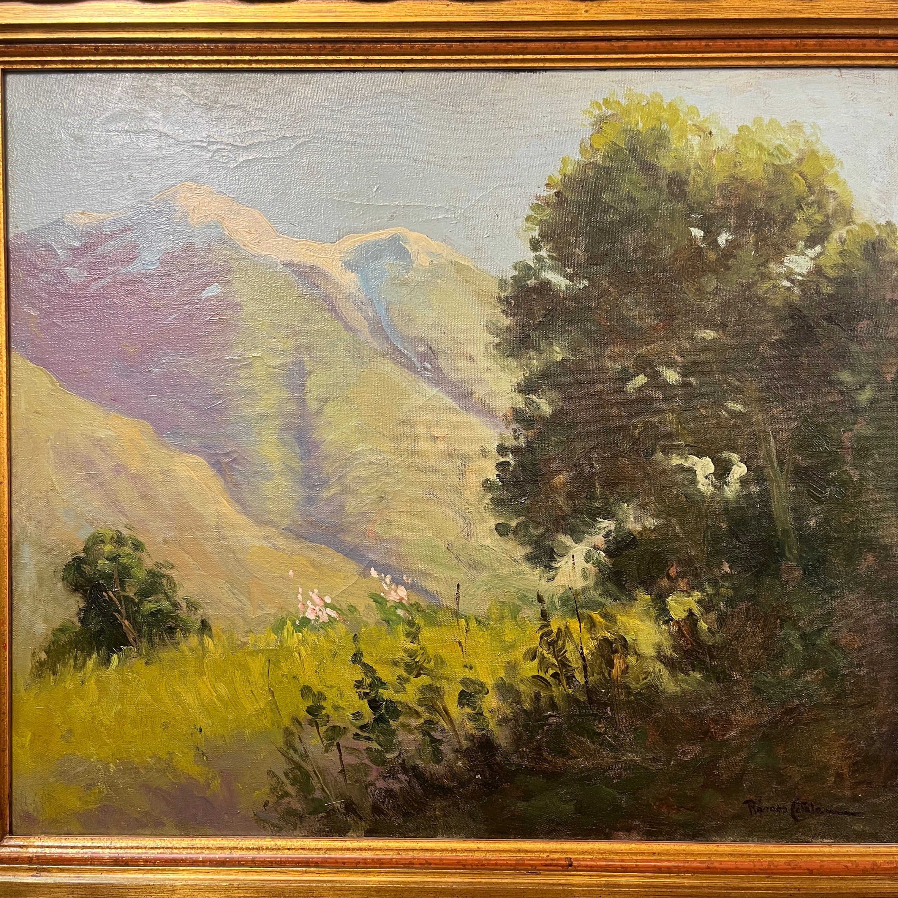 Hermoso óleo del talentoso pintor chileno Ramos Catalán. Su pasión por retratar la cordillera logra imponer un estilo único que se puede apreciar en esta obra. Tenemos un fondo de cordillera verde lo que nos hace inferir en un día primaveral con un cielo celeste y la pradera que acompaña parte de lo que podría ser un bosque esclerófilo.