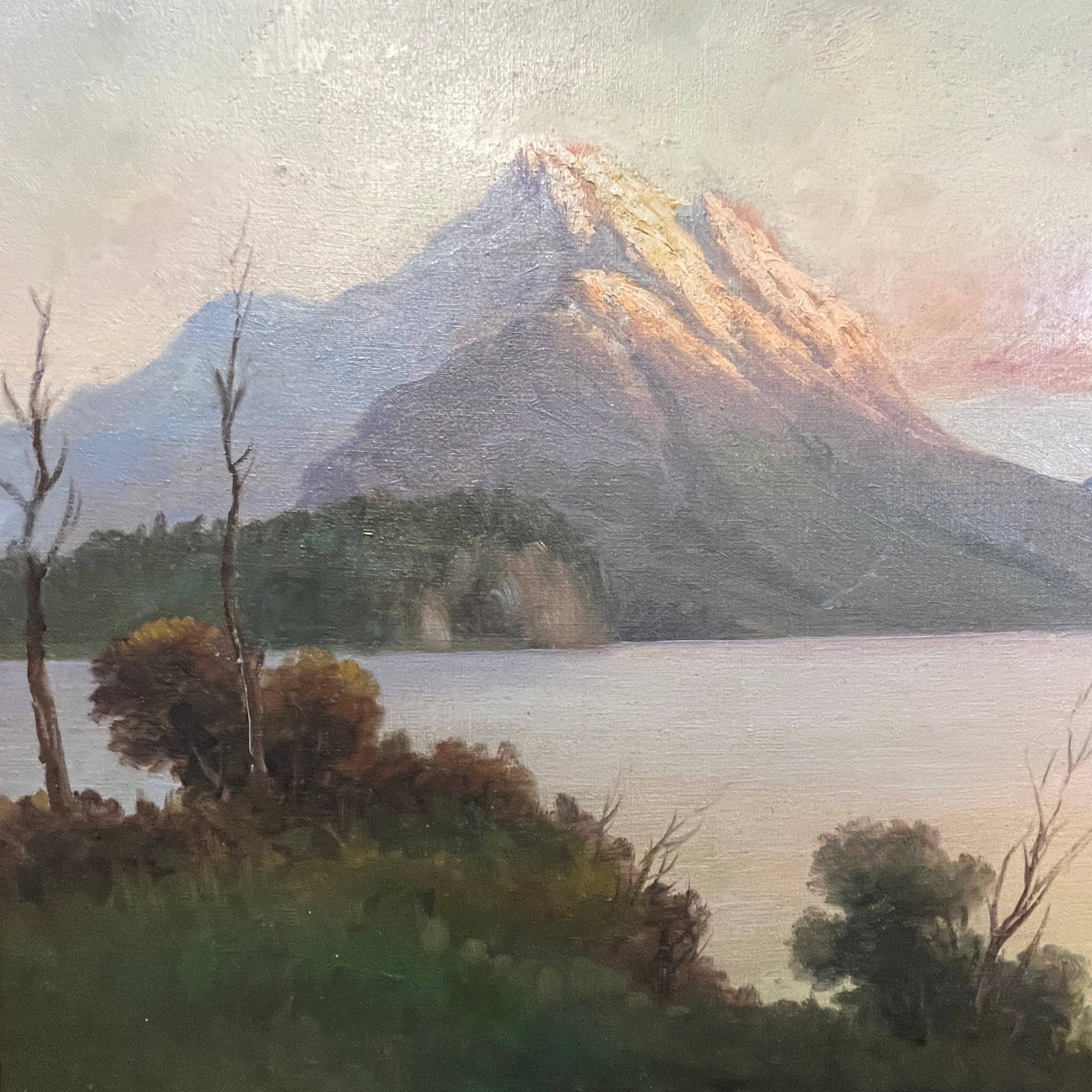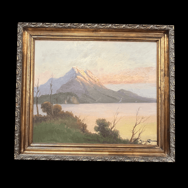 Un bello paisaje que nos invita a la contemplación pintado por el destacado pintor chileno Benito Ramos Catalán. Con su pincel logra plasmar la majestuosidad del la naturaleza chilena, con una montaña nevada al horizonte y con un lago a su pies y finalmente todo acompañado de sutiles de vegetación, nos entrega una imagen en la cual podemos perdernos viendo sus detalles.