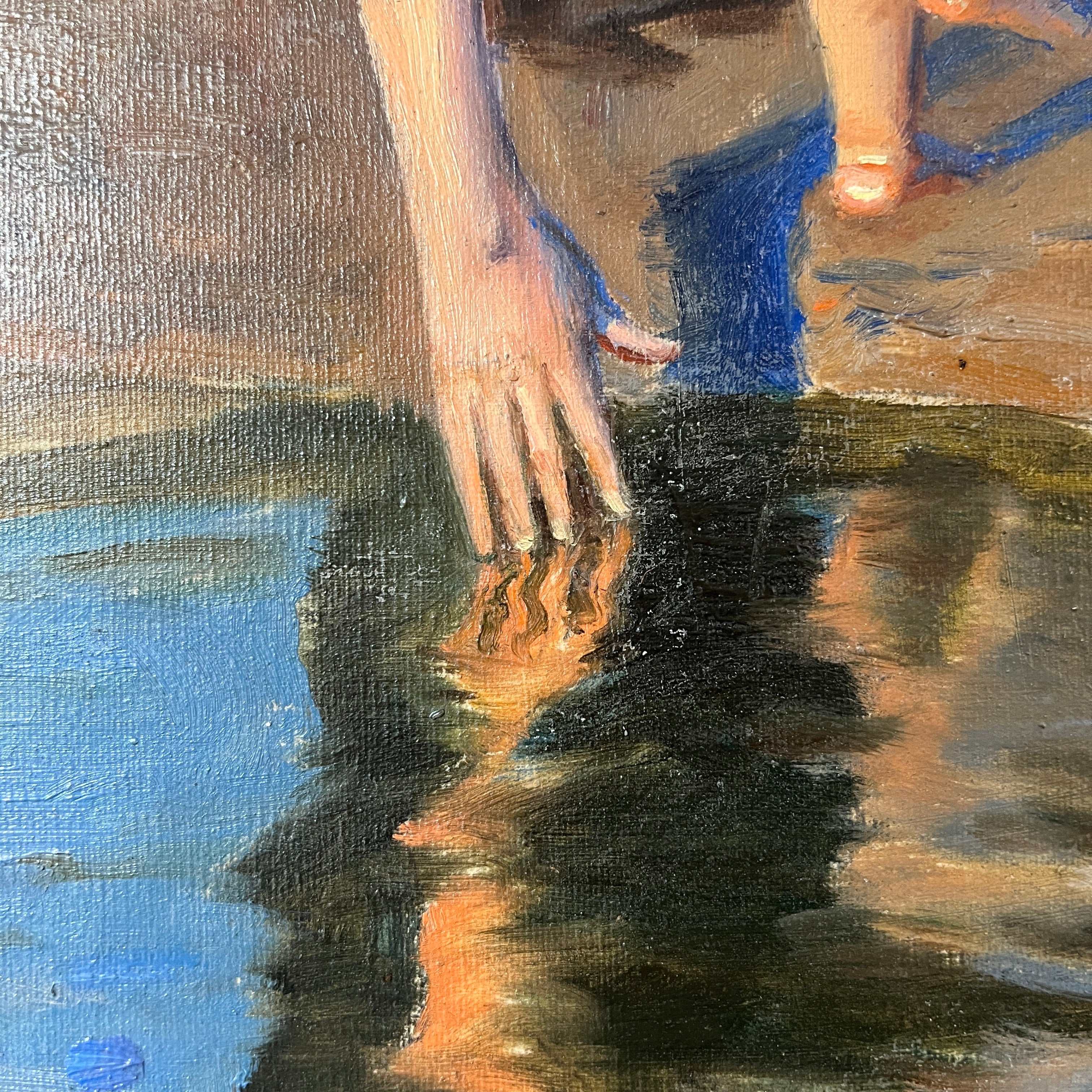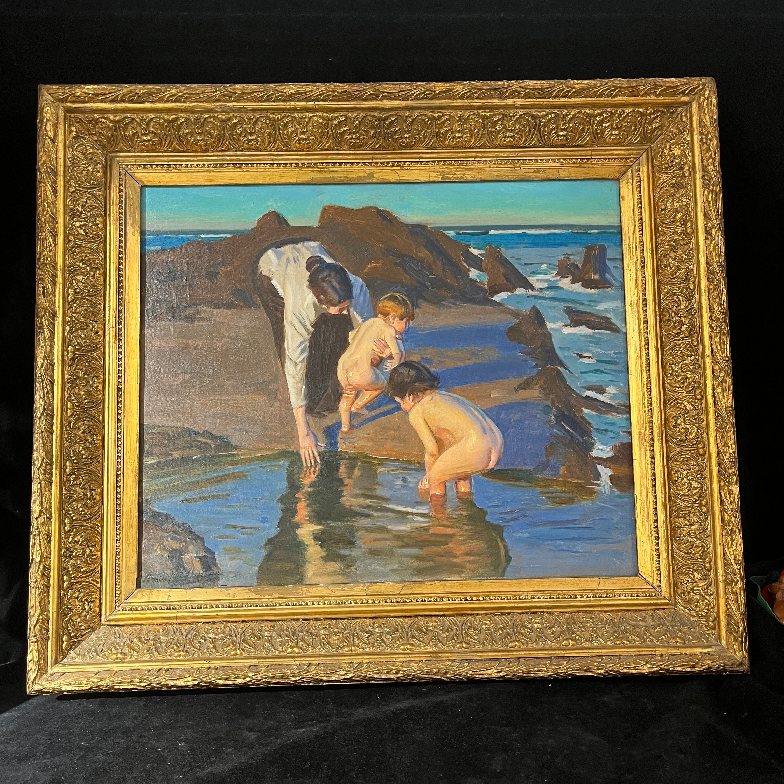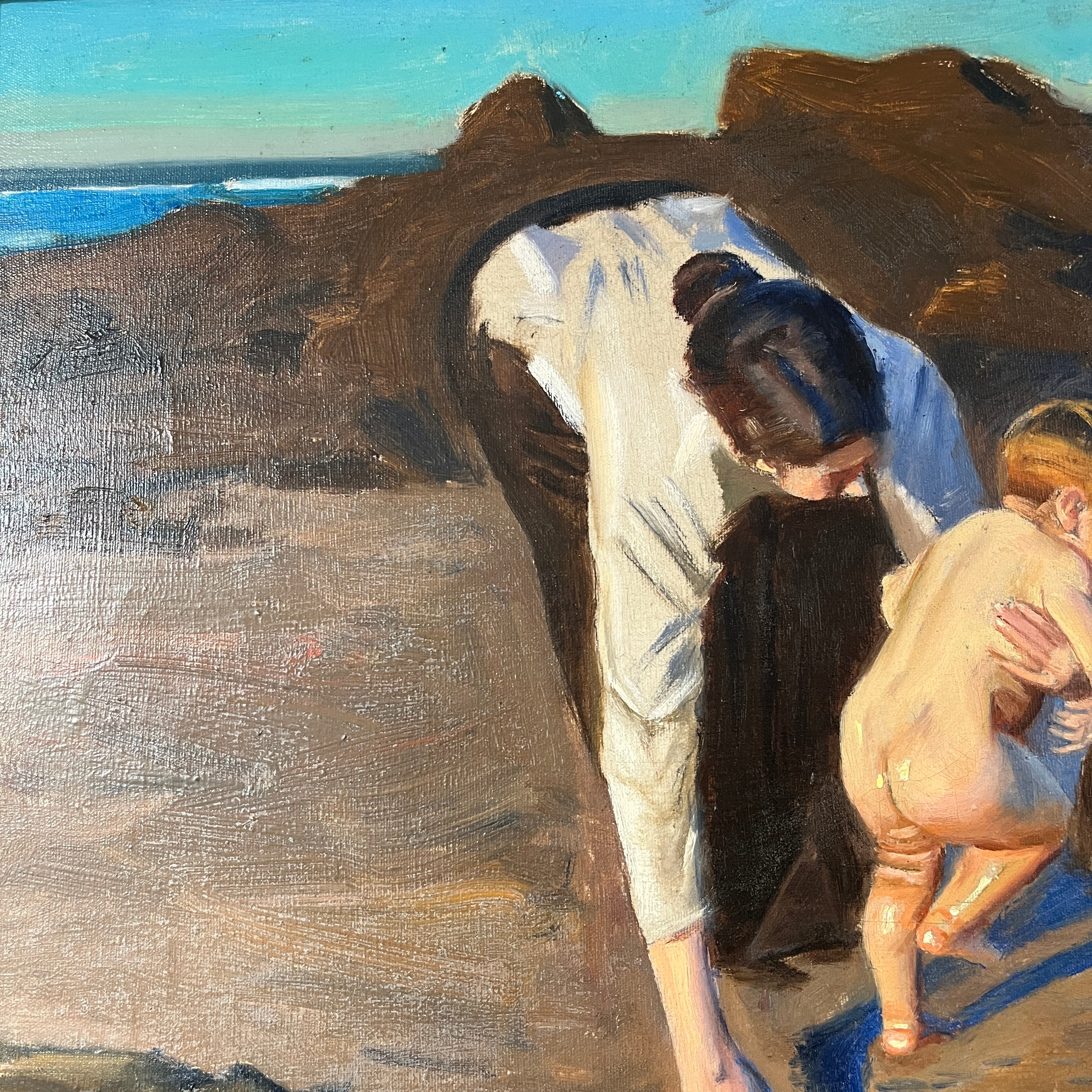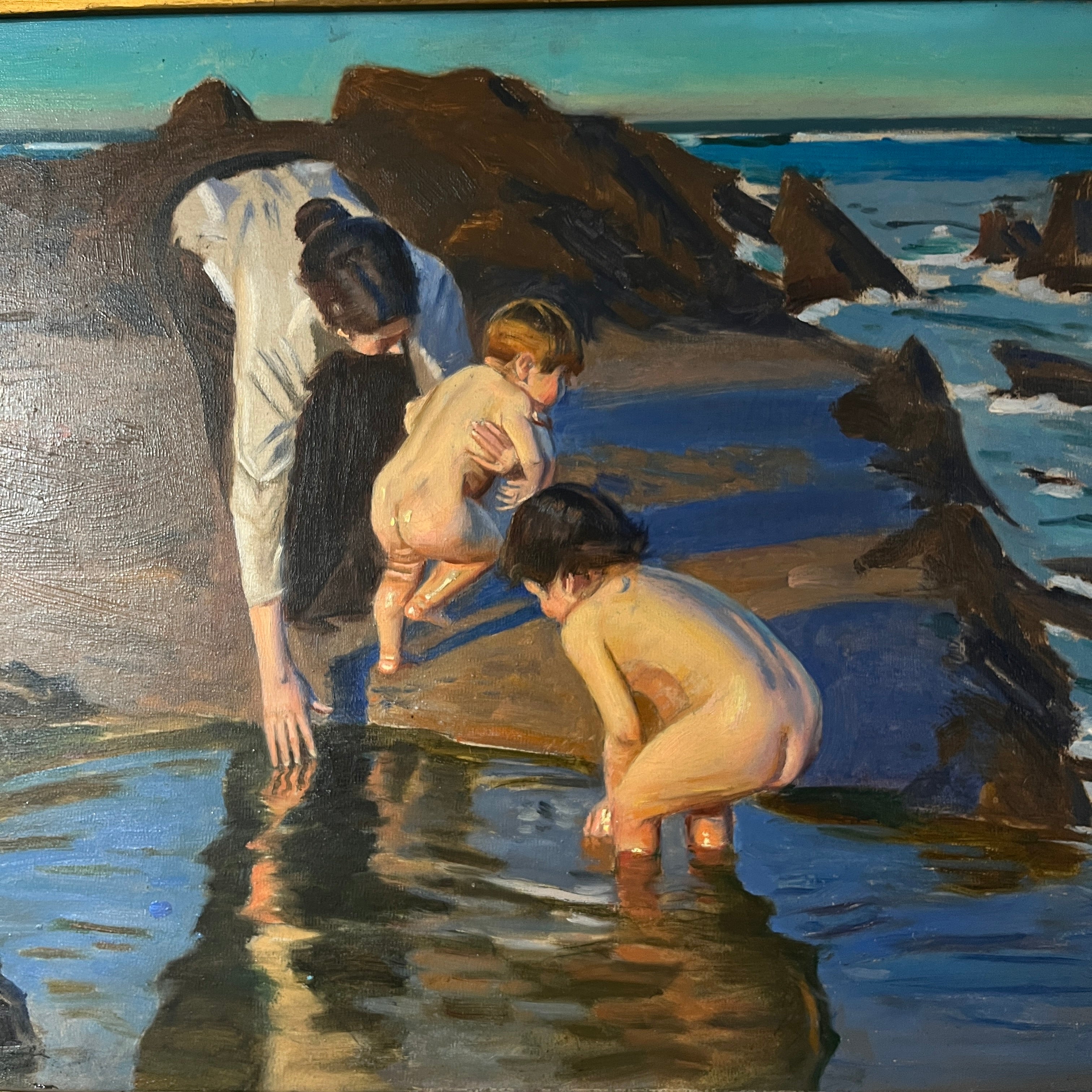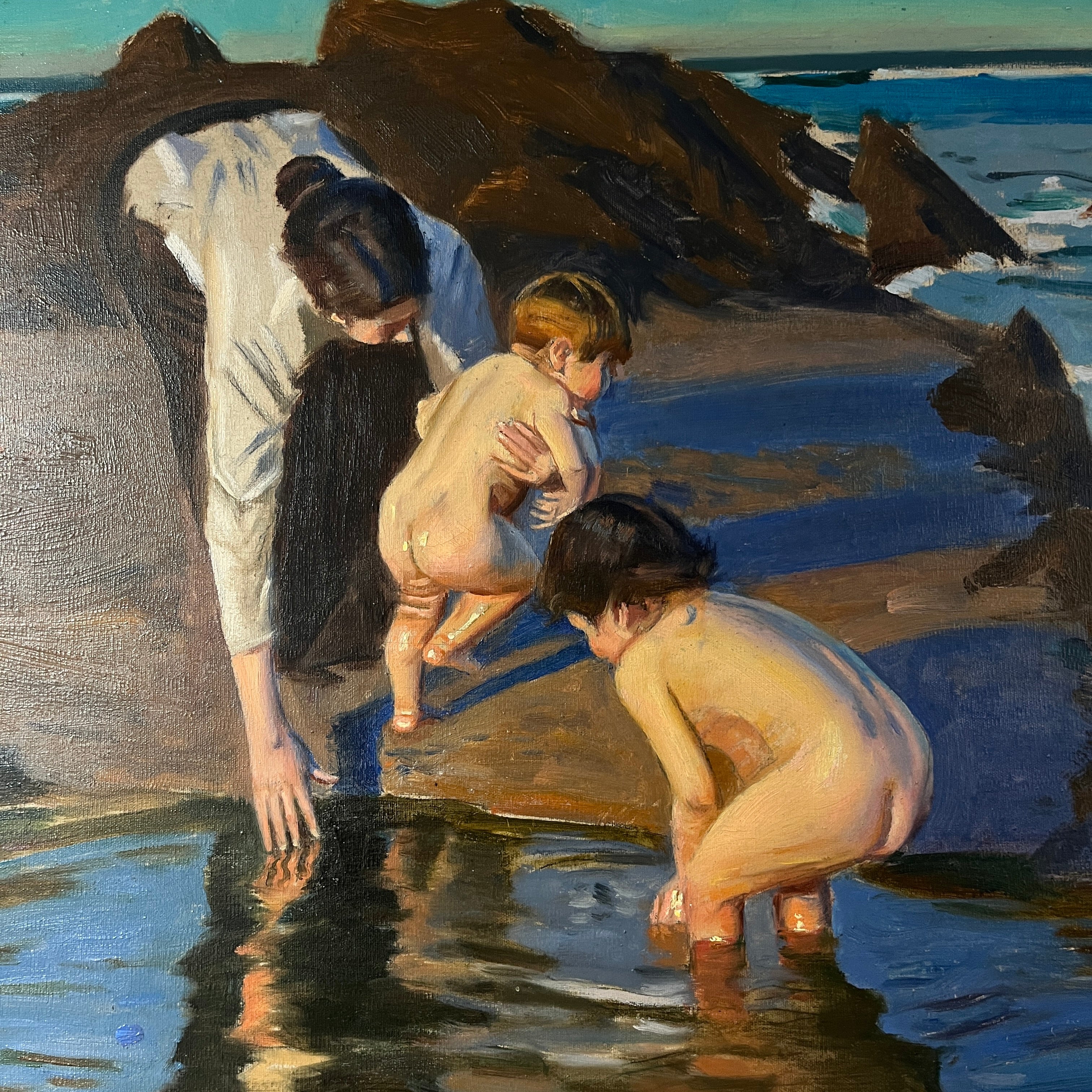 Nostálgico óleo de Benito Rebolledo, que nos muestra una mujer con un bebe en los brazos mientras lo lava junto a otro niño que juega en una clásica piscina natural formada en las playas y sus roqueríos. Es una escena muy íntima y que nos otorga esa calidez visual propia de las pinturas de Rebolledo. Esta en particular se caracteriza por tener tonalidades más vibrantes e intensas, con un cielo calipso y sus personajes muy iluminados como si estuviéramos viendo un día soleado.