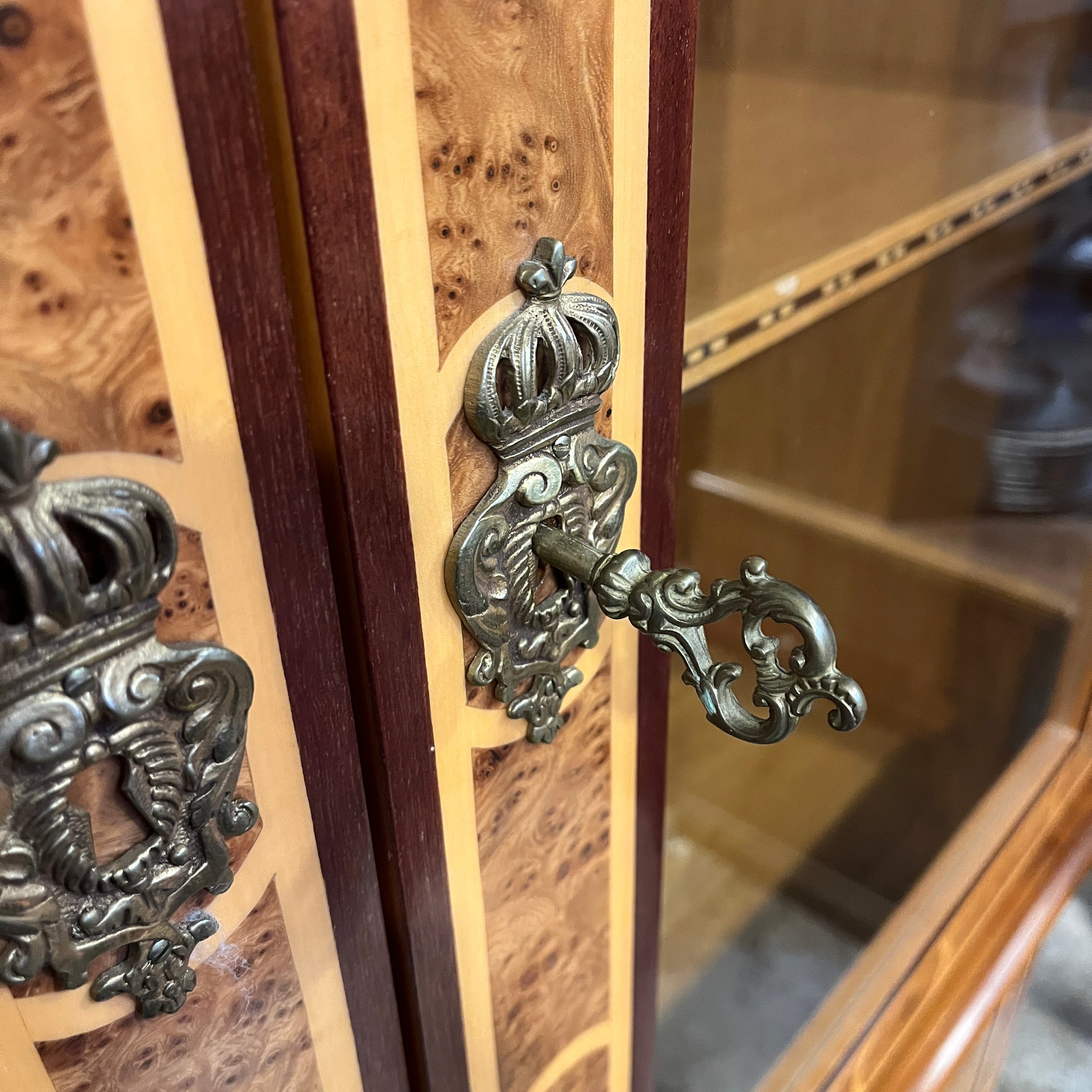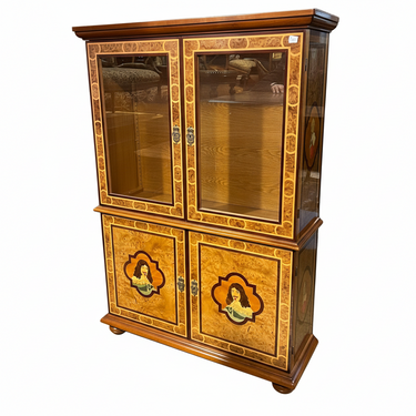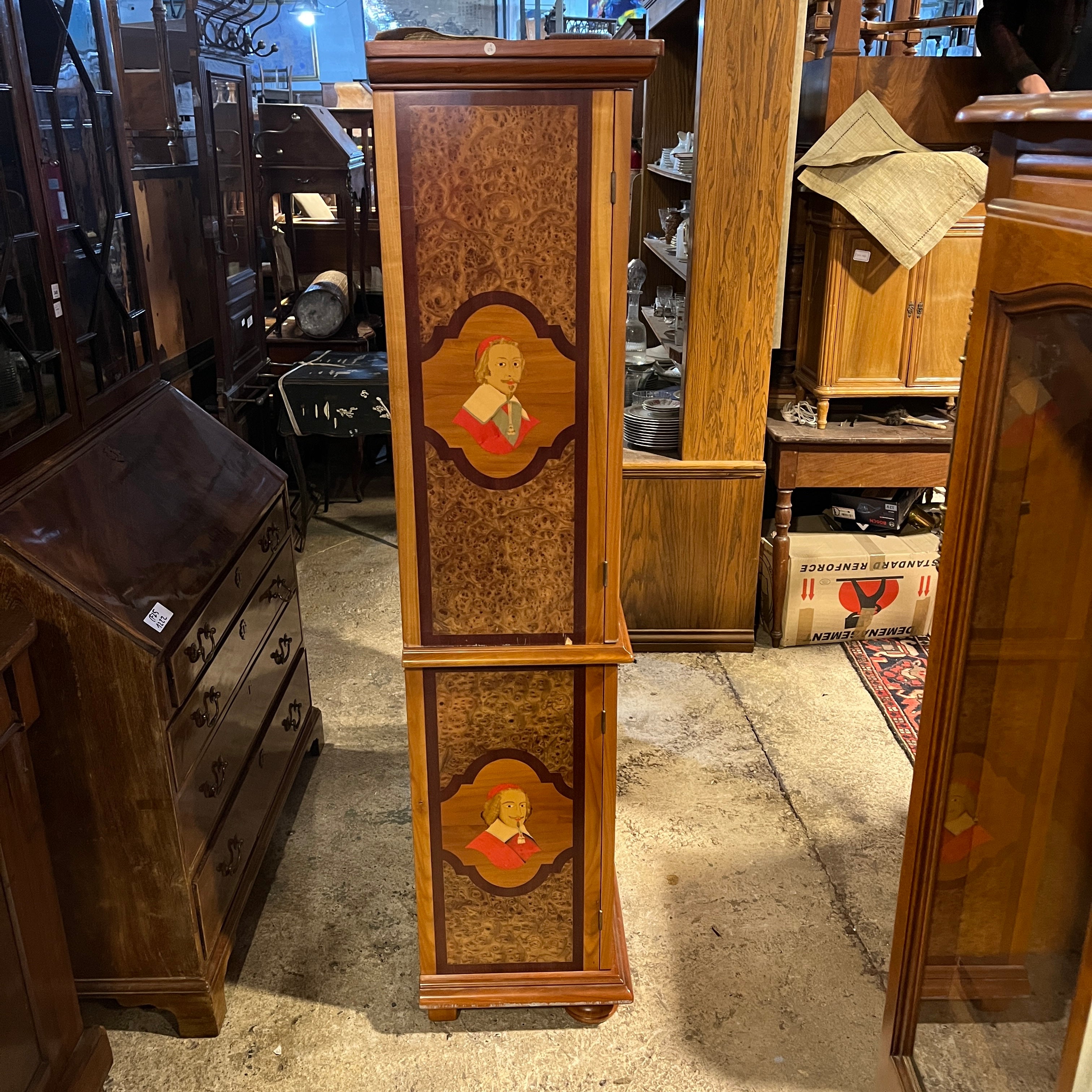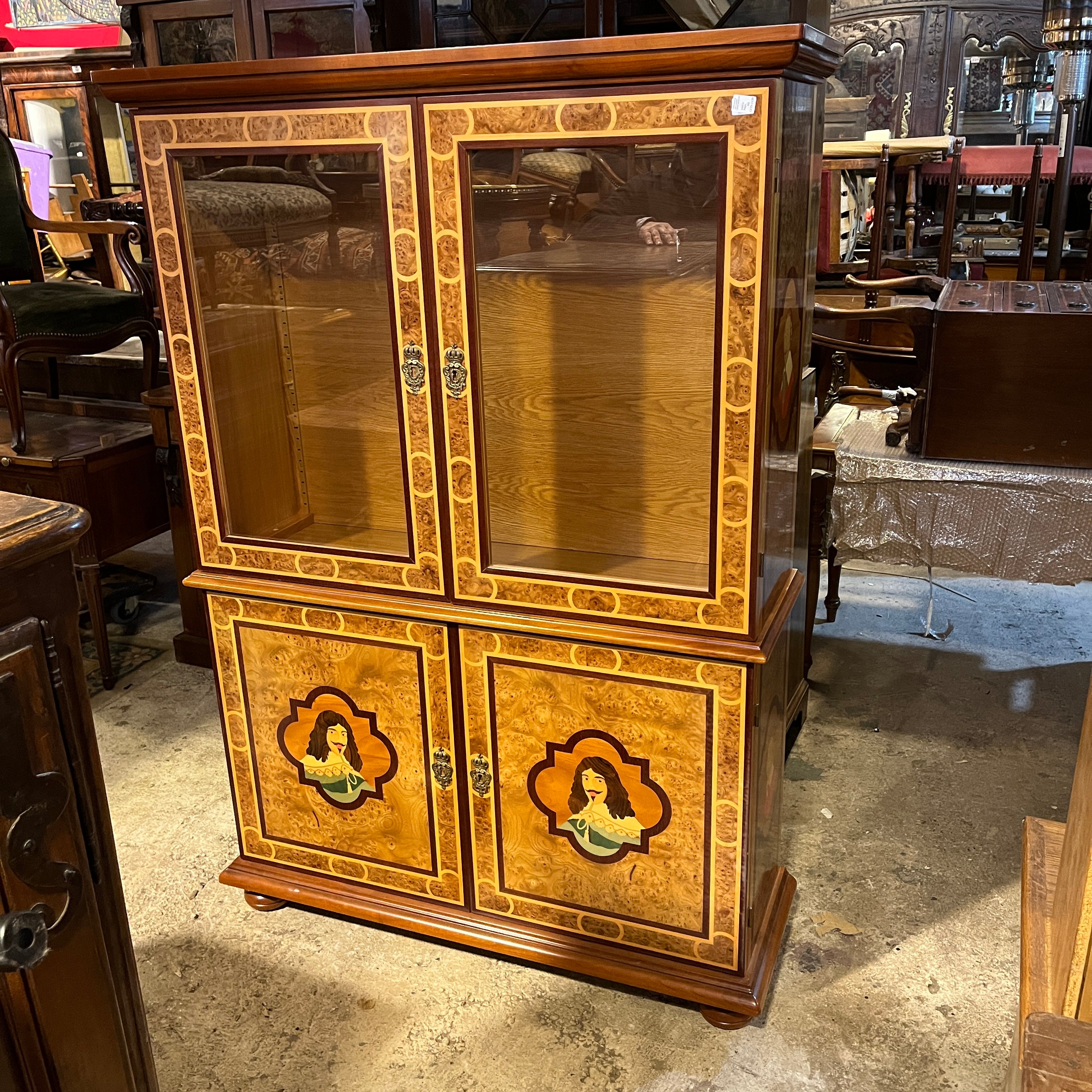 Biblioteca de dos cuerpos en estilo Transición. Enchapada en raíz, y con un complejo trabajo de marquetería representando retratos de Jean-Baptiste Poquelin, llamado 'Molière', dramaturgo francés del s.XVIII, y del Cardenal Richelieu, también del s. XVIII. Ambos personajes famosos por haber servido en la corte del rey Luis XIV. Firmada René Barde. Francia, años 2000.