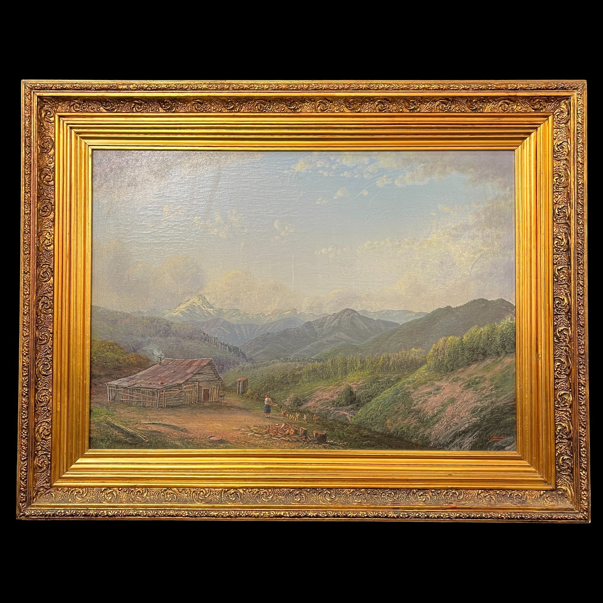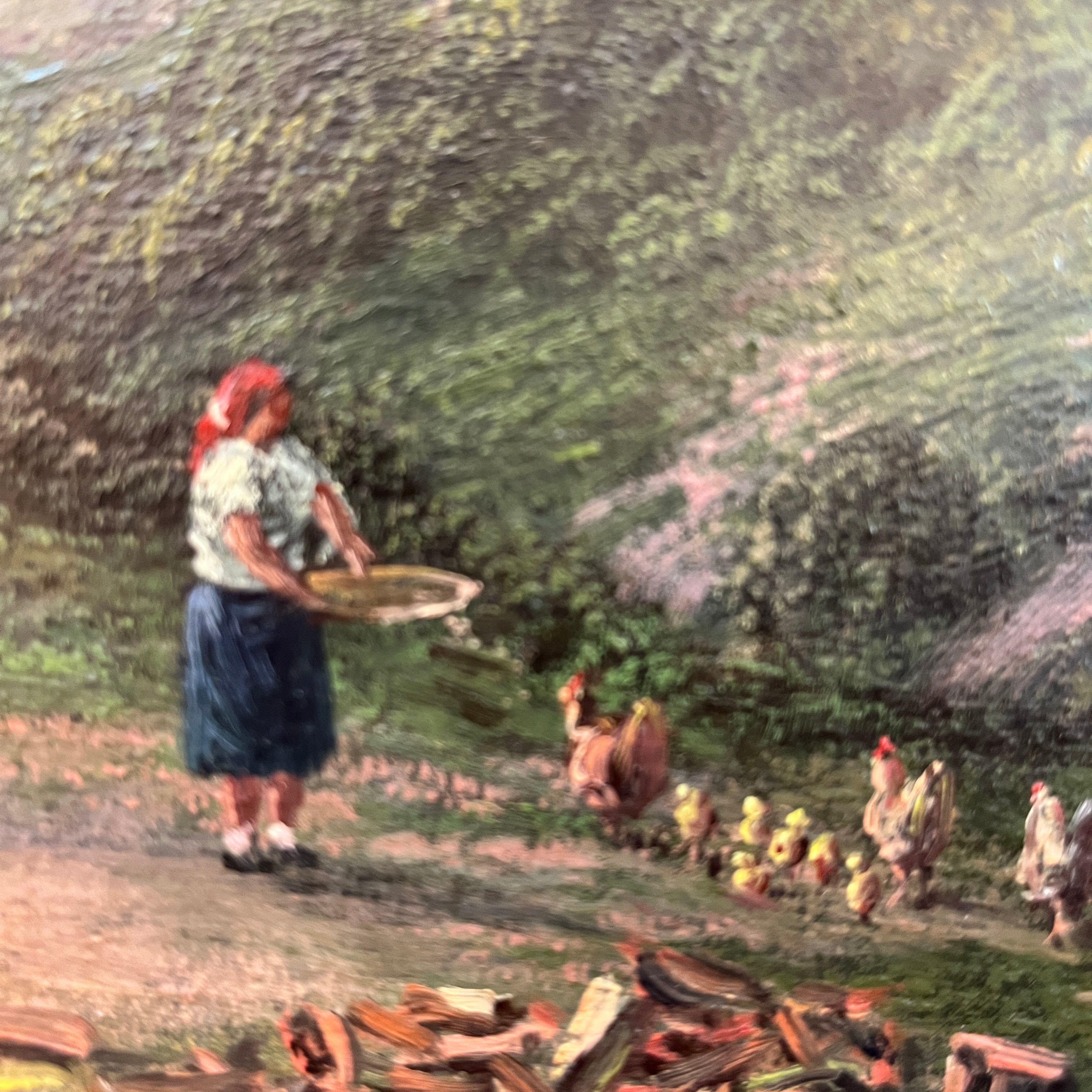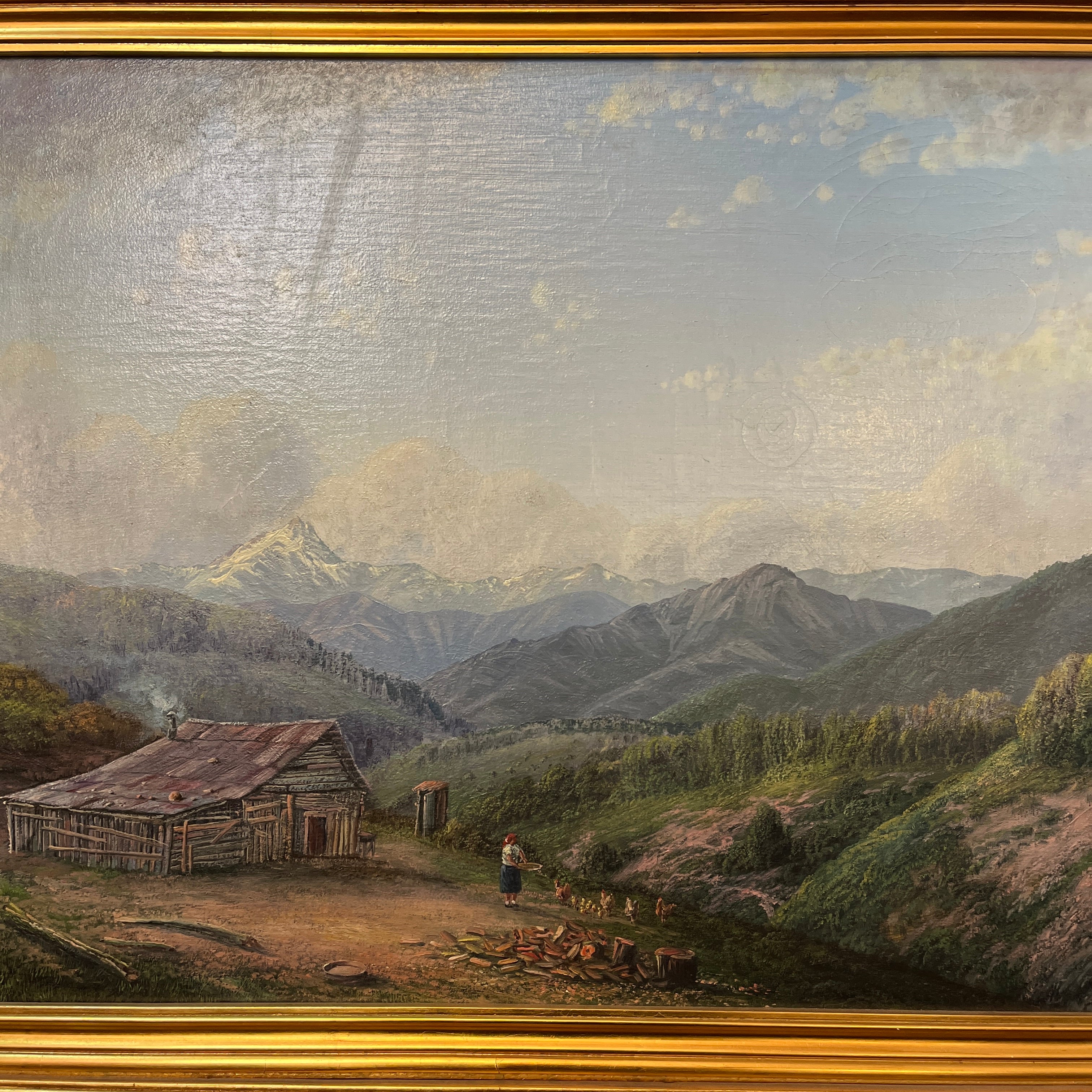 Hermosa obra del reconocido artista chileno Carlos Jaramillo, representando una mirada panorámica del campo chileno y una mujer en sus tareas cotidianas. Presenta un marco de madera tallada pintado en dorado.