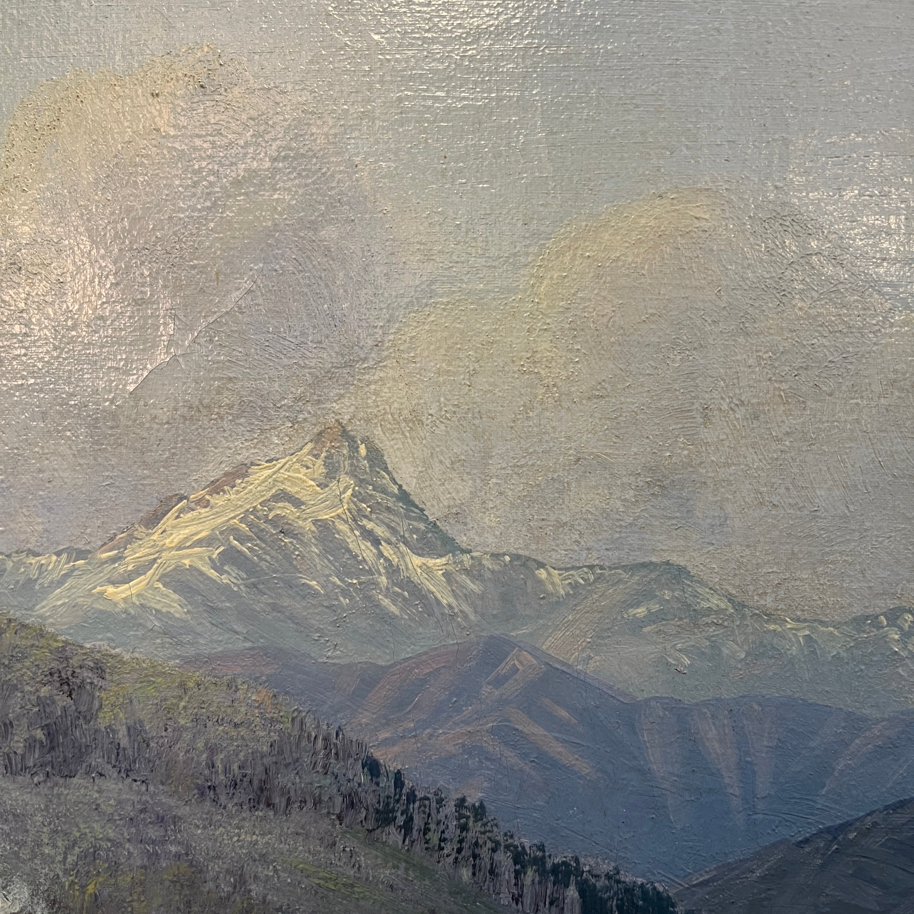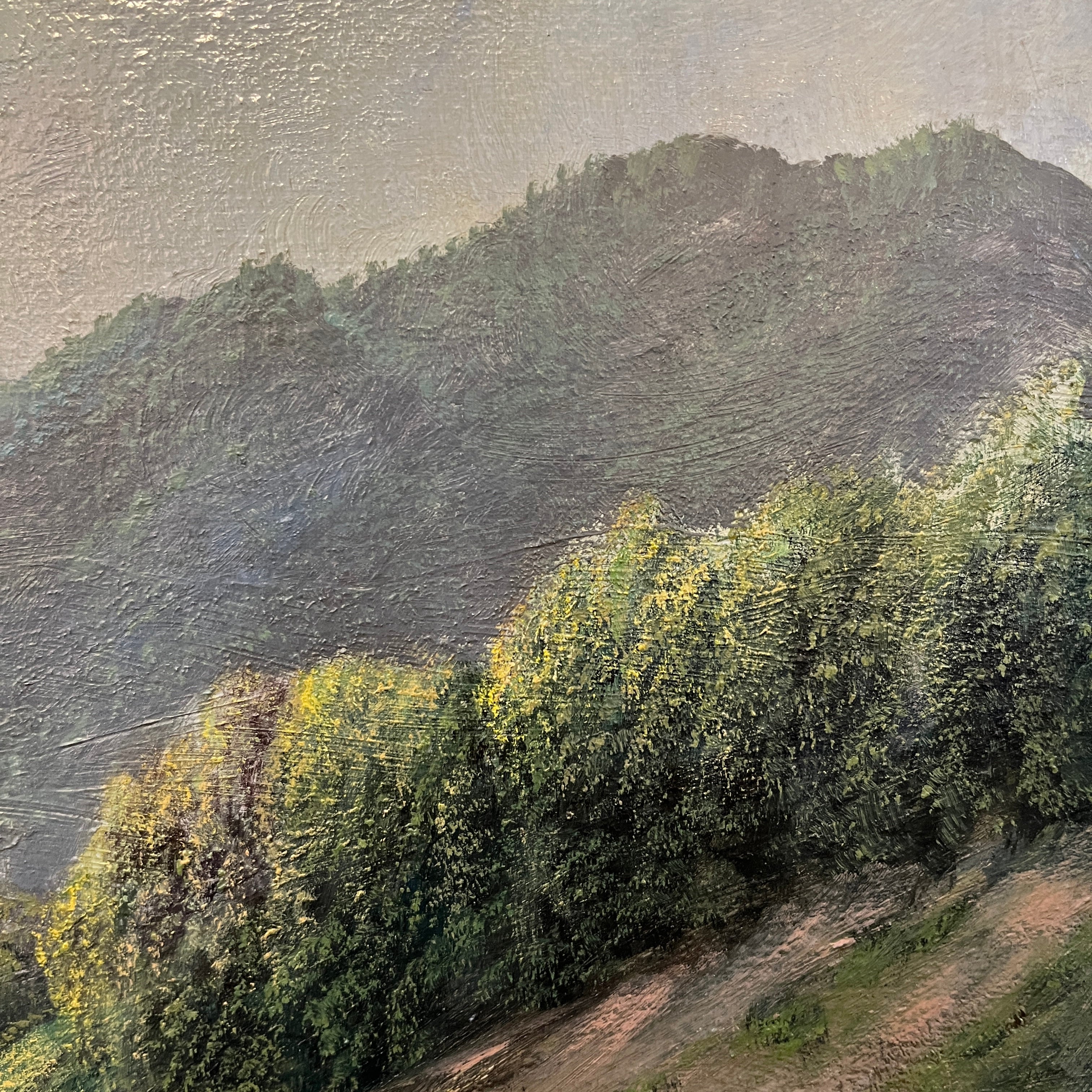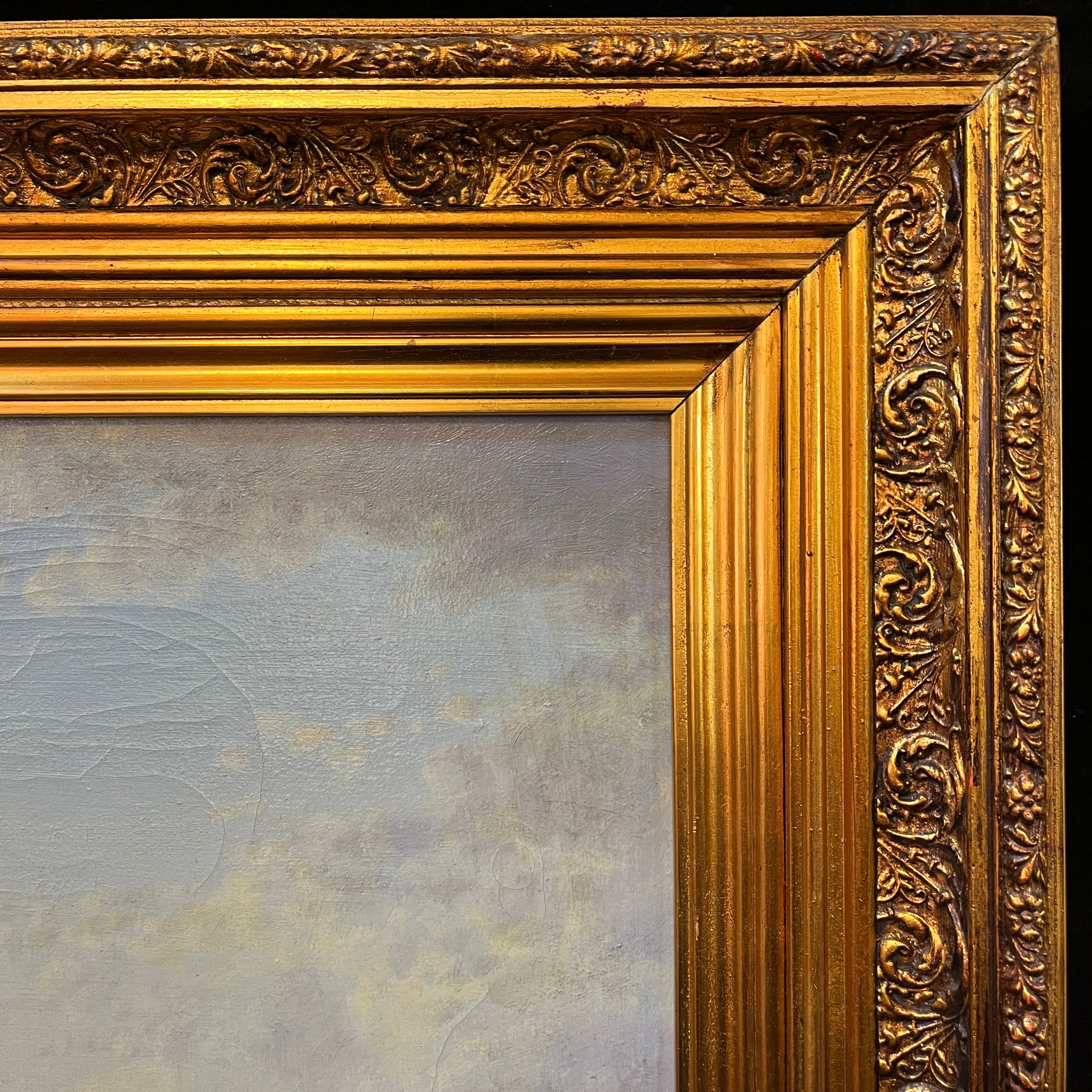 Hermosa obra del reconocido artista chileno Carlos Jaramillo, representando una mirada panorámica del campo chileno y una mujer en sus tareas cotidianas. Presenta un marco de madera tallada pintado en dorado.