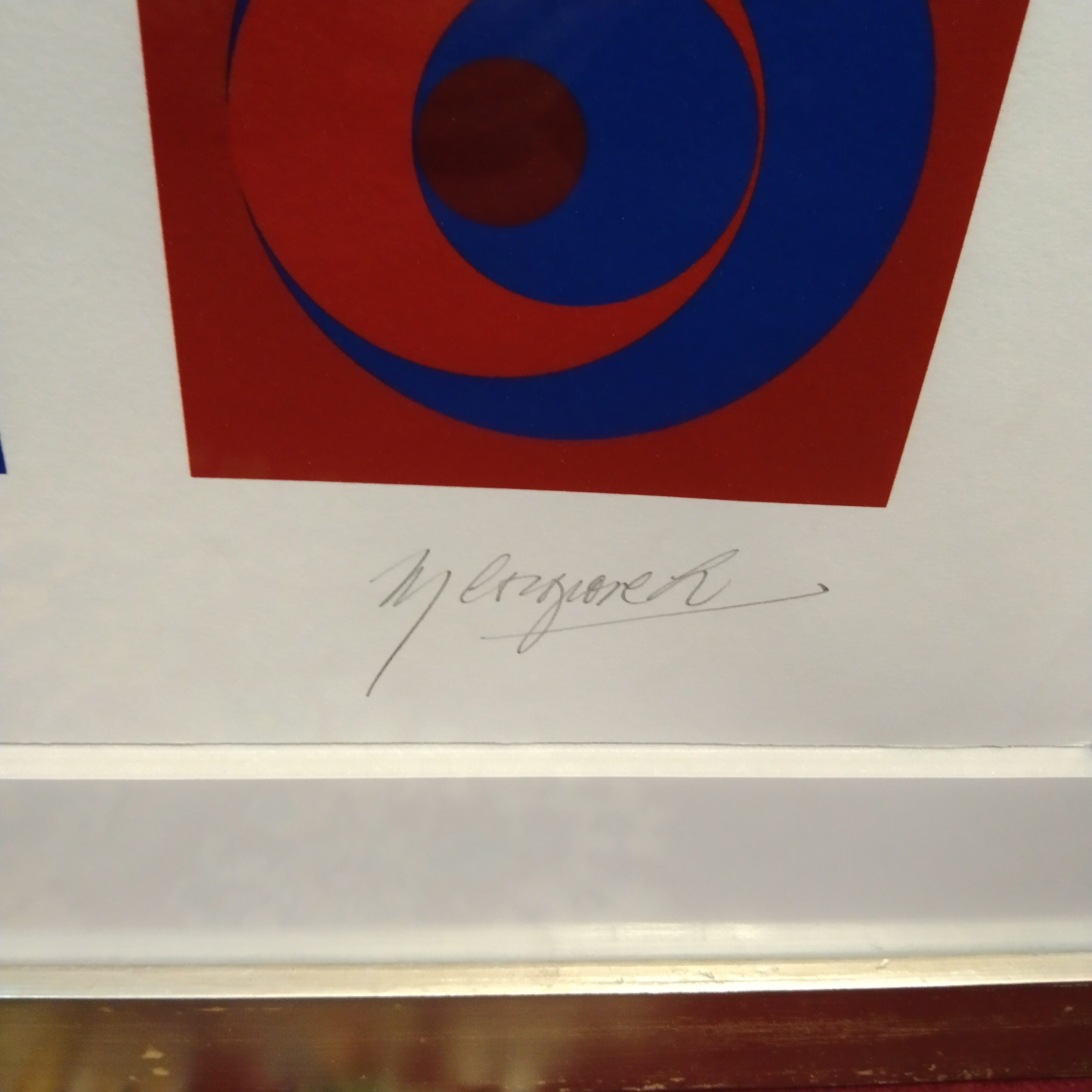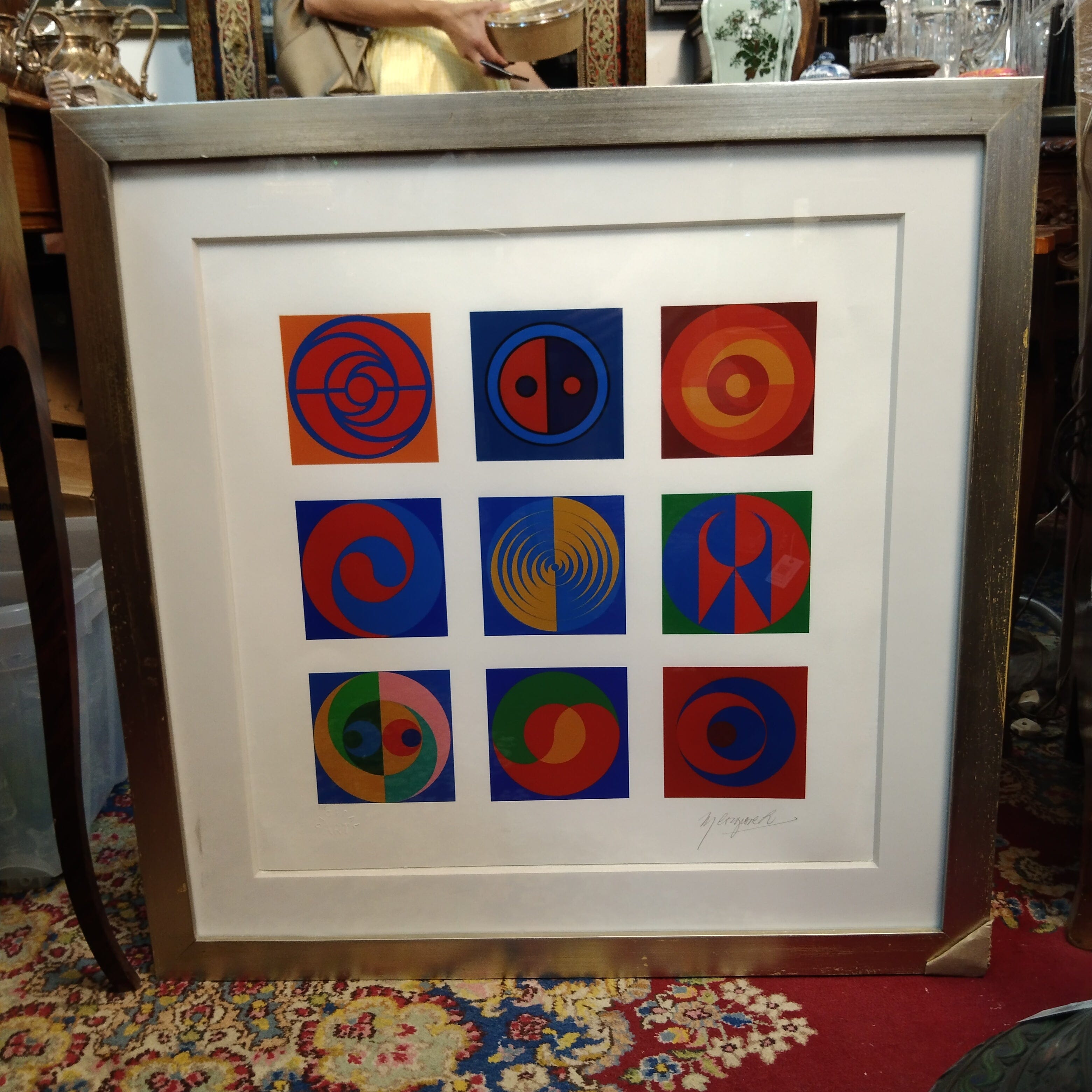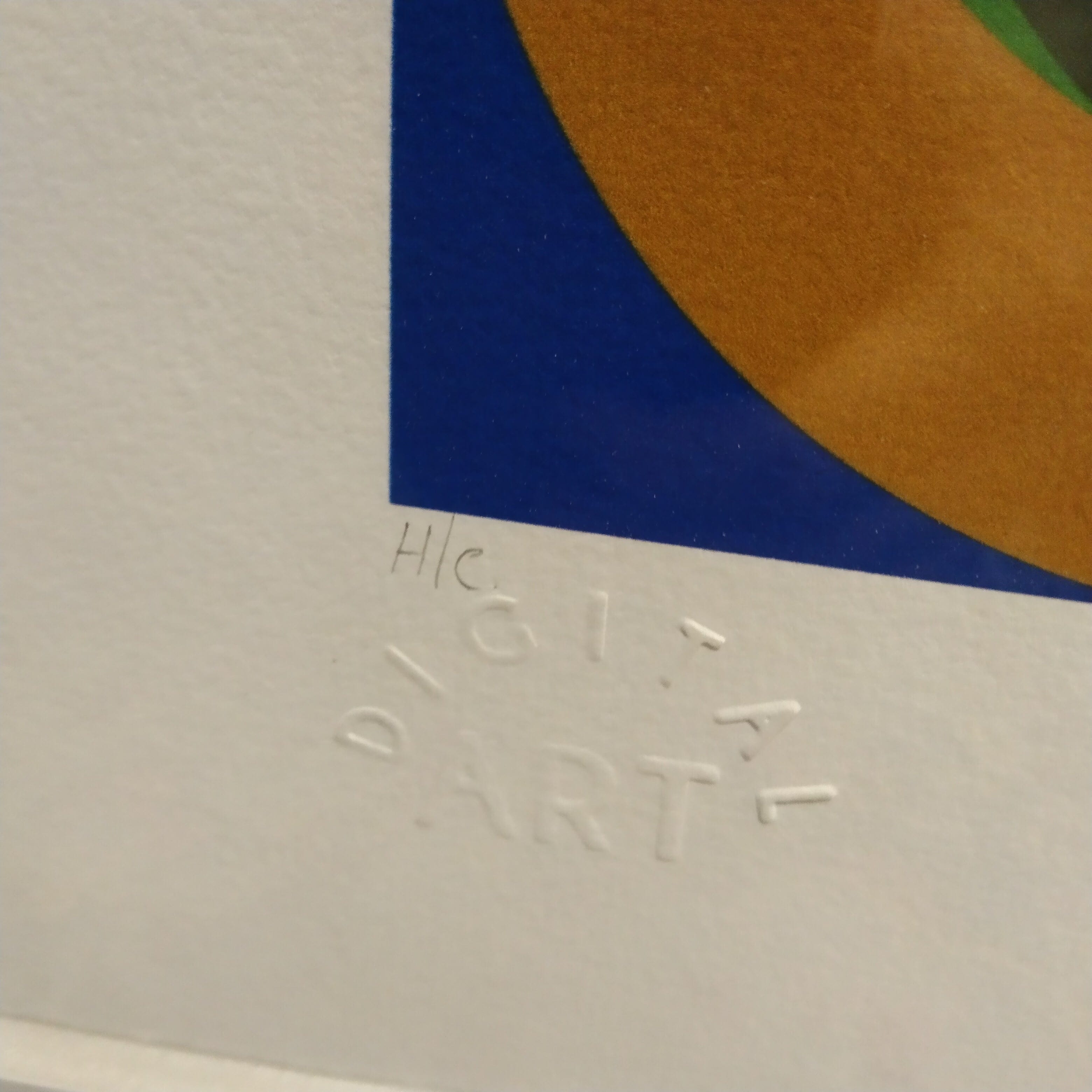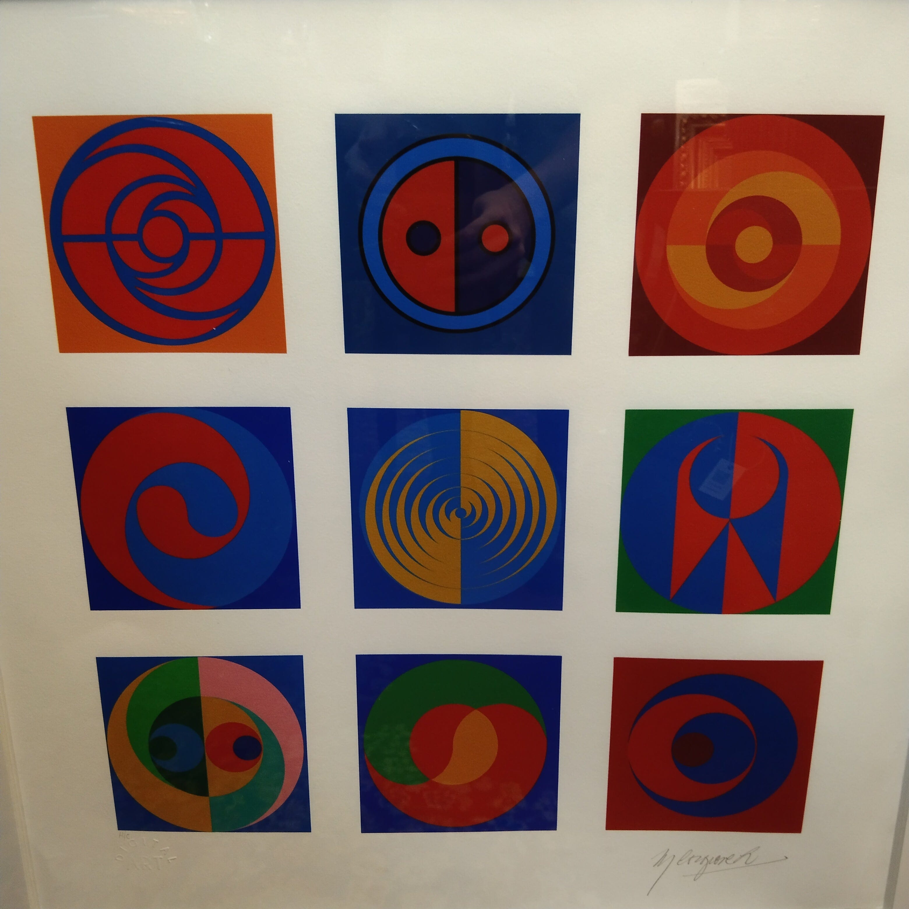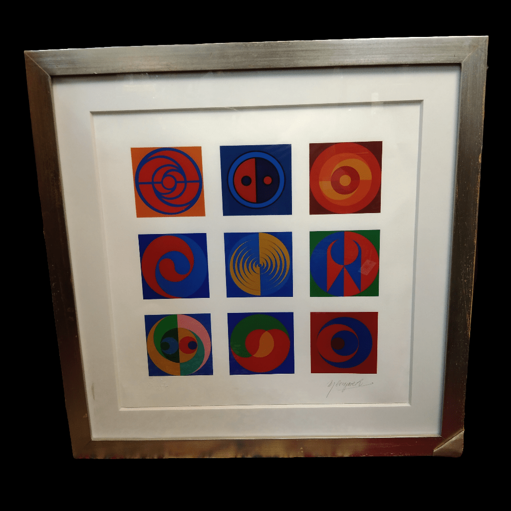 Grabado digital del artista chileno Miguel Cosgrove representando 9 esferas con distintos diseños gráficos, jugando con distintas relaciones de color. La pieza está firmada por el artista y timbrada con un sello de autentificación de arte digital. Tiene un marco nuevo, de madera lisa pintada en plateado.