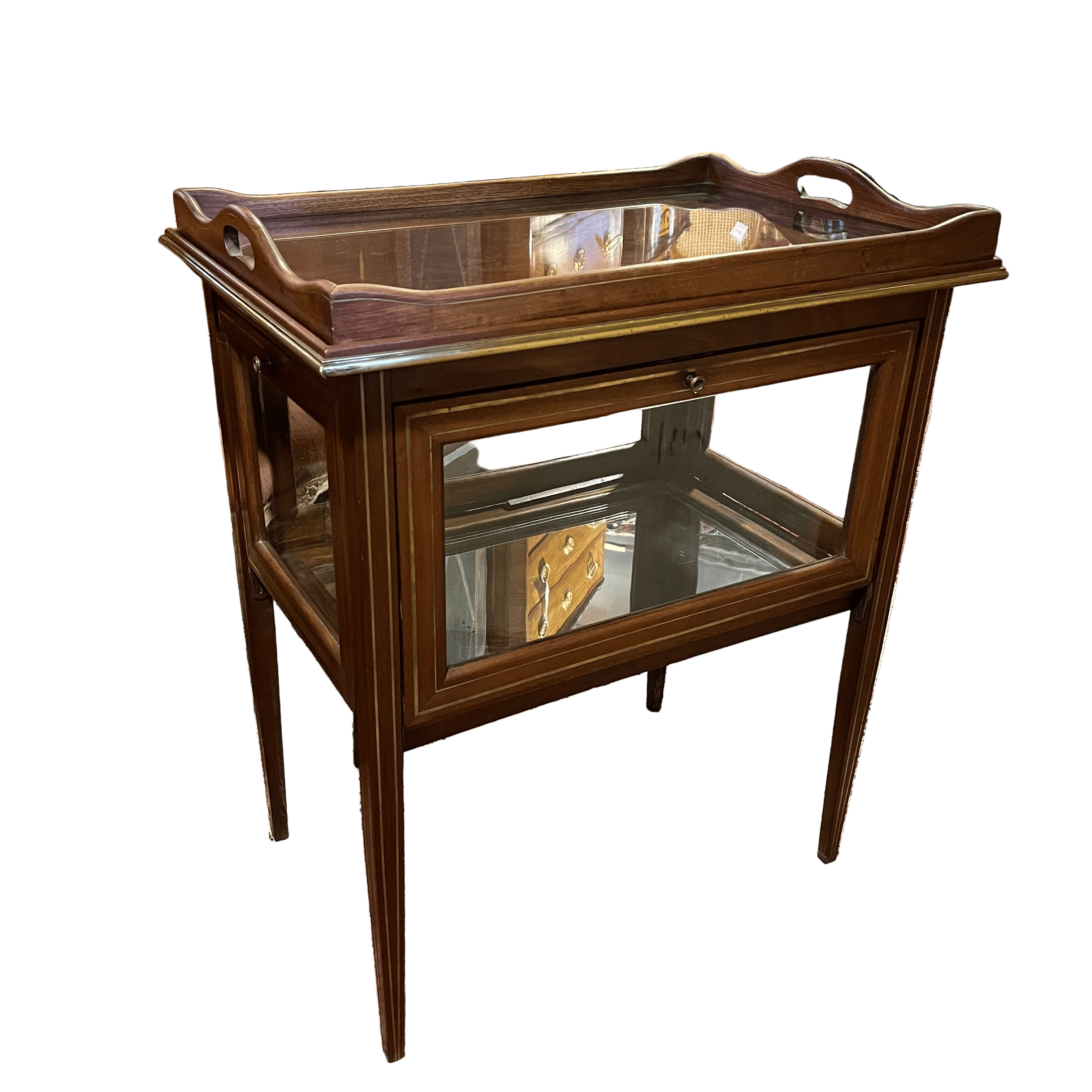 Carro de té de origen inglés estilo Edwardian, hecho de madera de caoba con filete de incrustación en bronce, incluyendo la bandeja. La pieza tiene 4 compuertas con tiradores en bronce y superficie de vidrio, que caen mediante sus bisagras y que permiten ver los objetos en el interior, terminado con un espejo en su superficie.