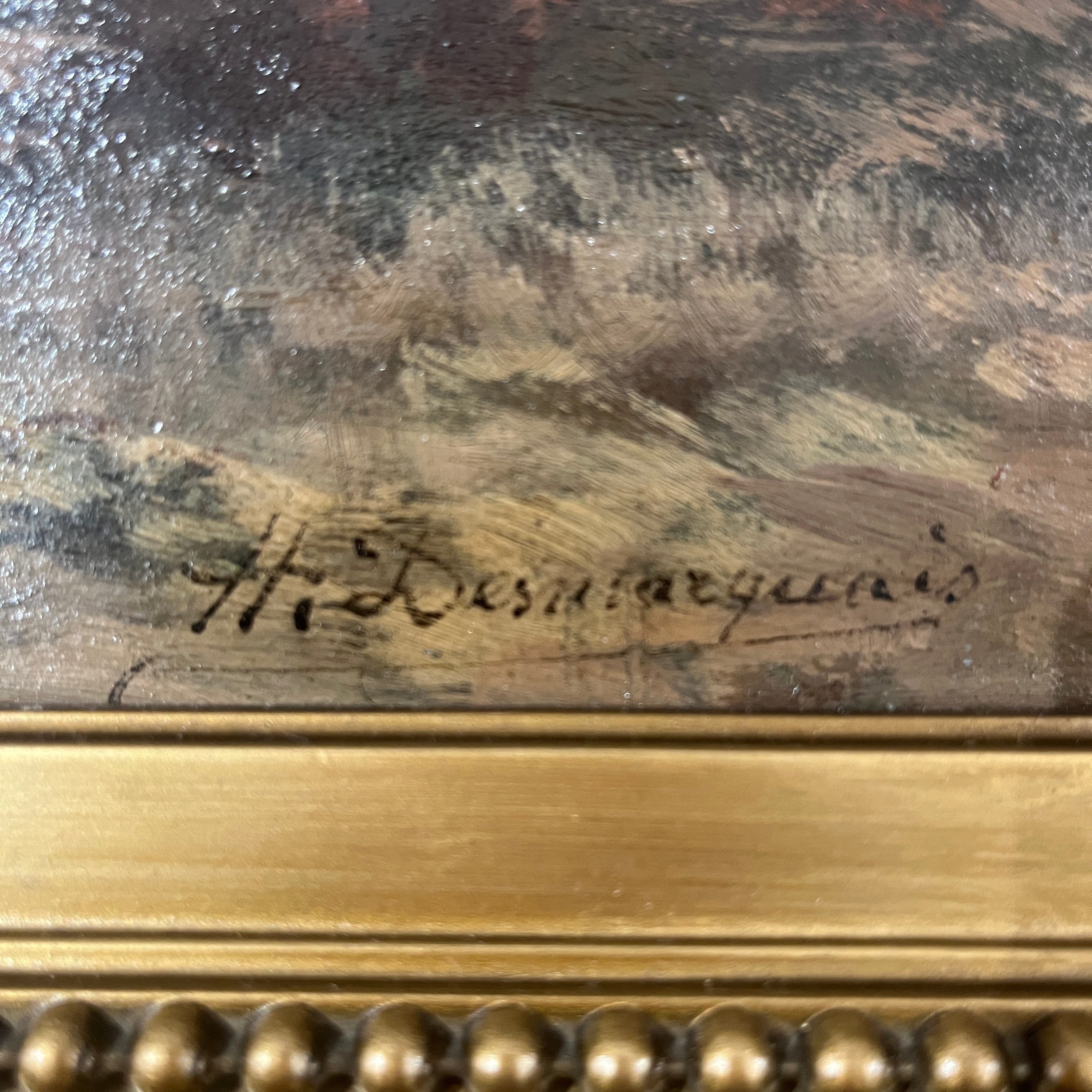 Atrayente óleo del pintor francés Charles Hippolyte Desmarquais (1823 - 1910) de un paisaje compuesto por una deslucida y seca llanura que termina con un frondoso bosque verde y un celeste cielo cubierto por leves nubes en su horizonte. El cuadro viene enmarcado en madera dorada con relieve lo cual le otorga mayor perspectiva a la obra.