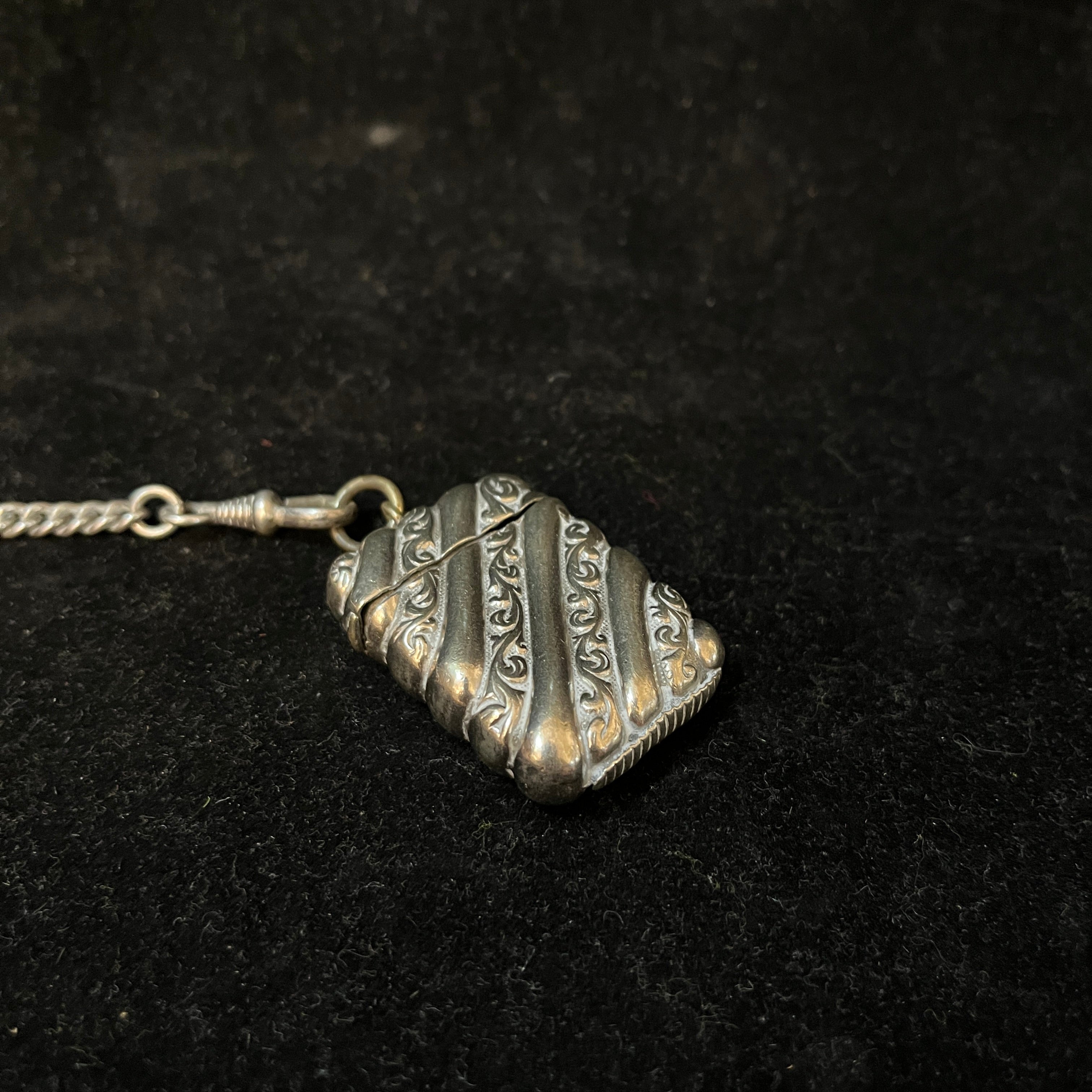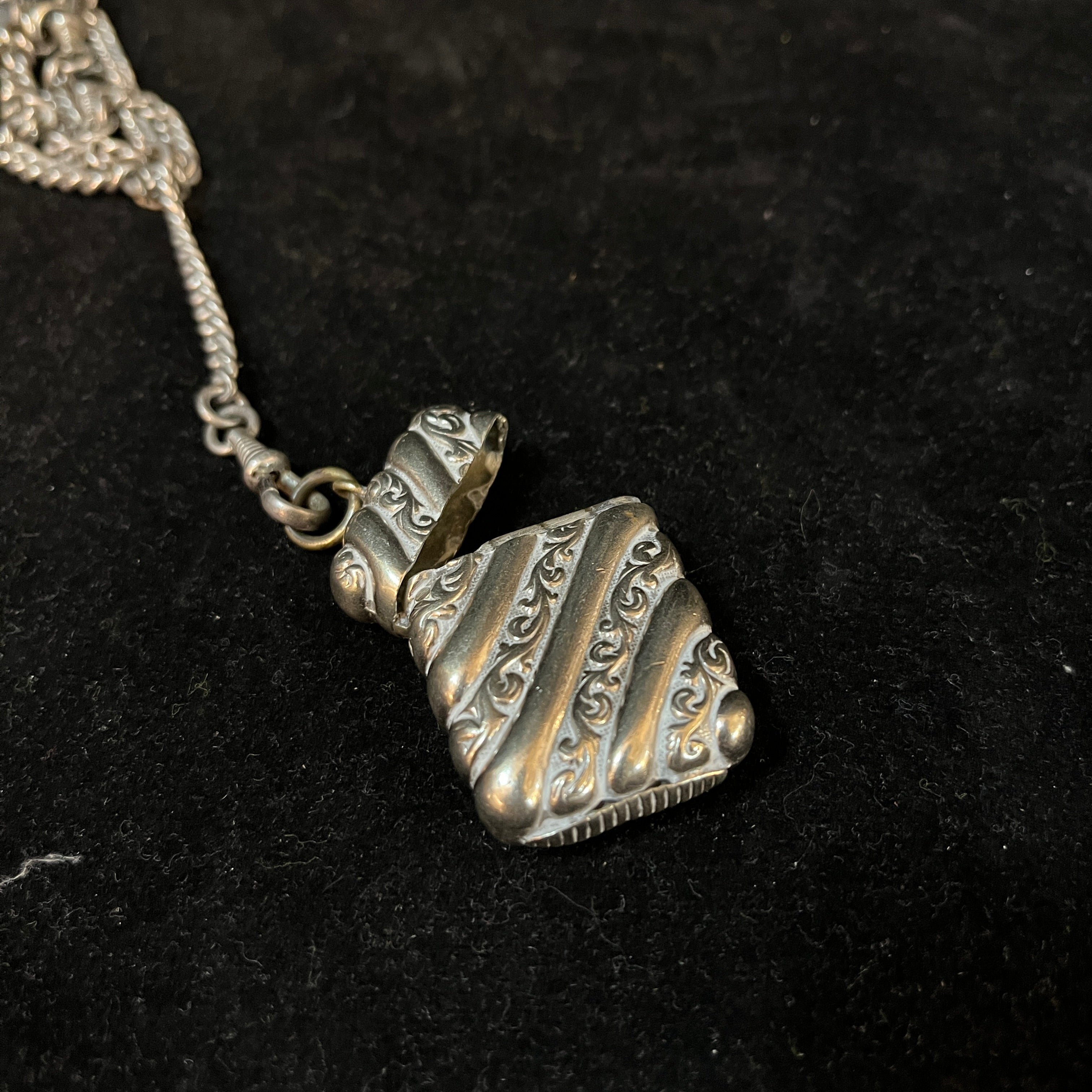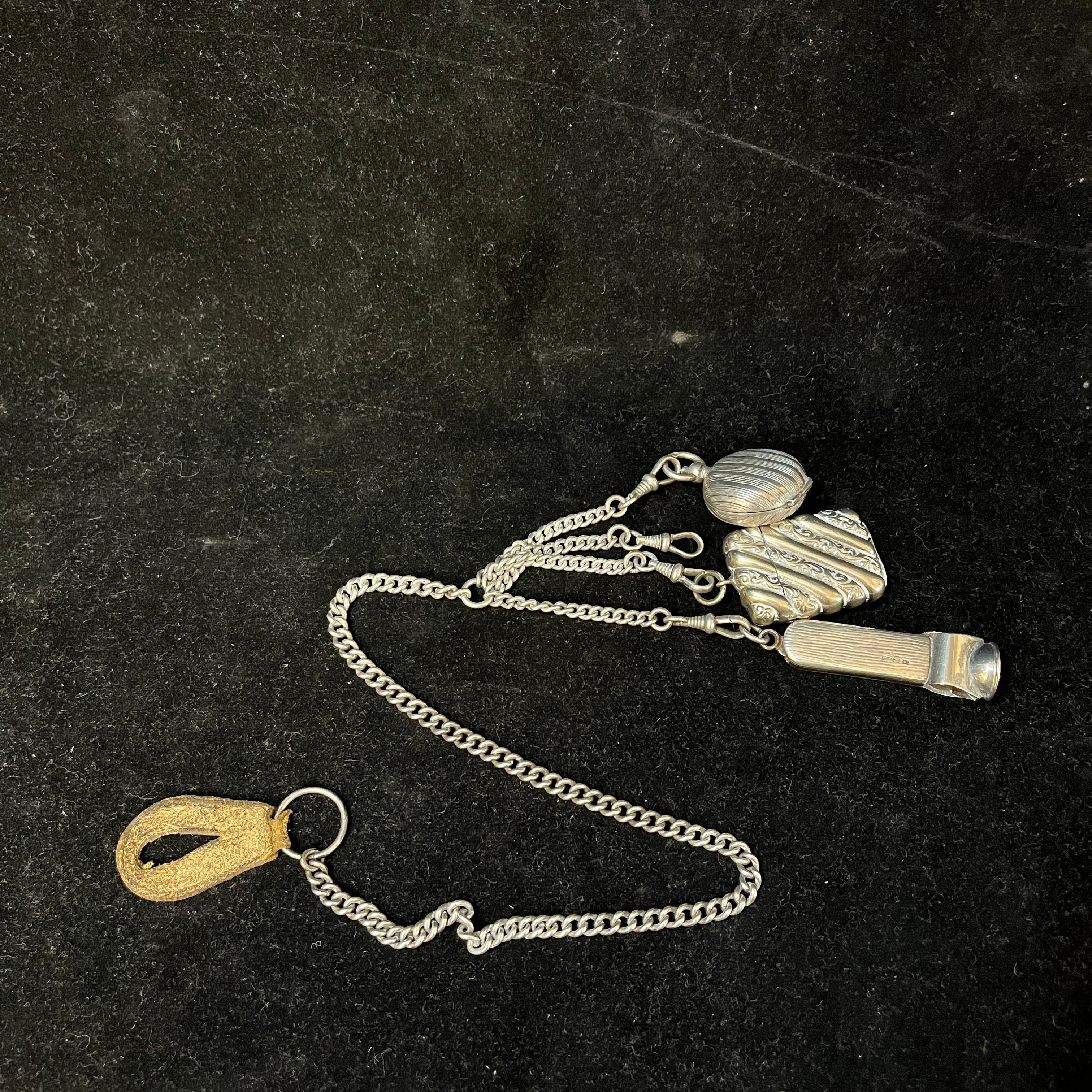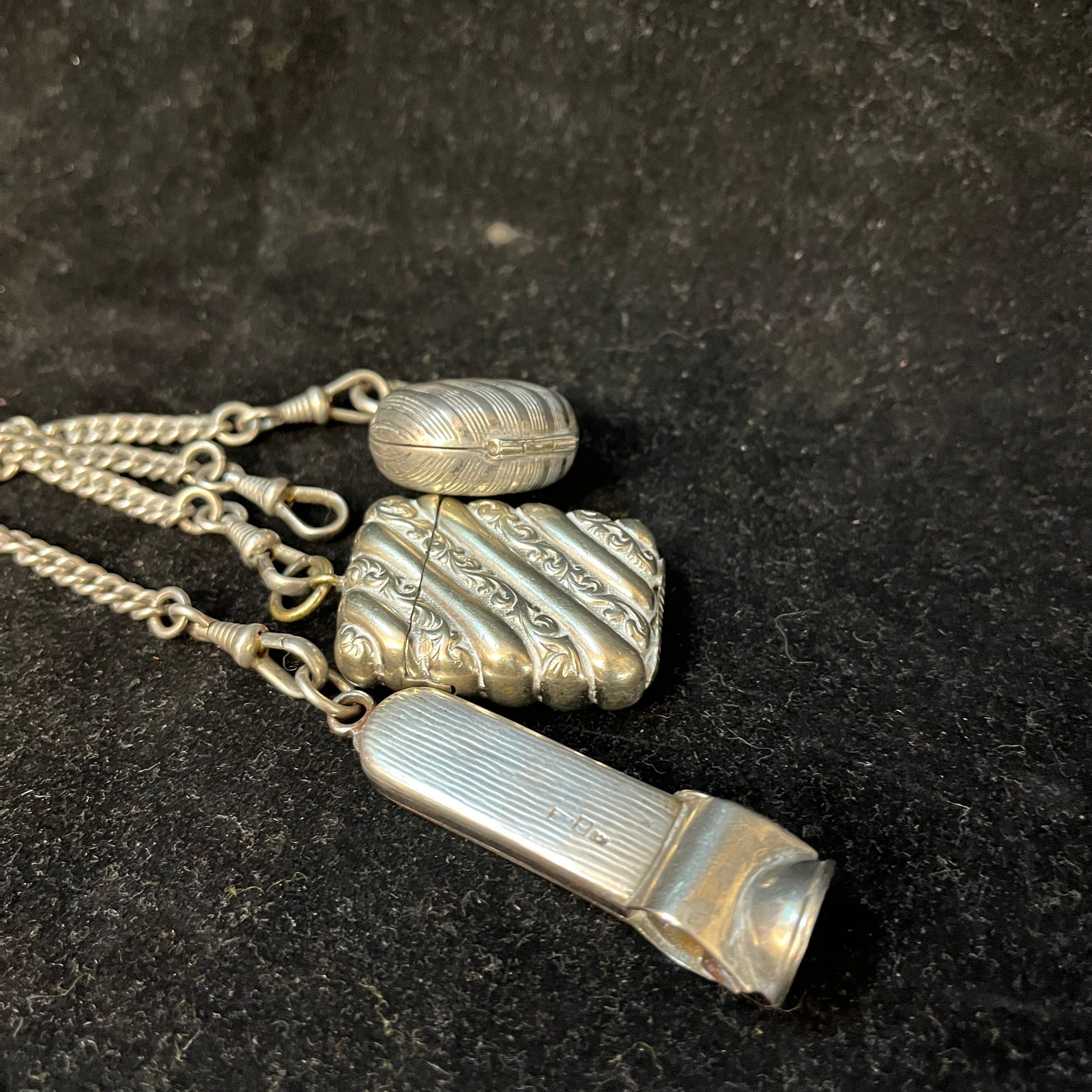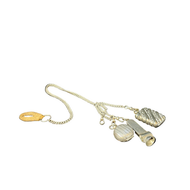 Chatelaine francés hecho de plata ley 800, con tres colgantes: un monedero, un cortador de puros y una pequeña caja para guardar fósforos. Es por estos elementos, y la época en que se usó este accesorio, que podemos decir que se trata de un Chatelaine masculino.