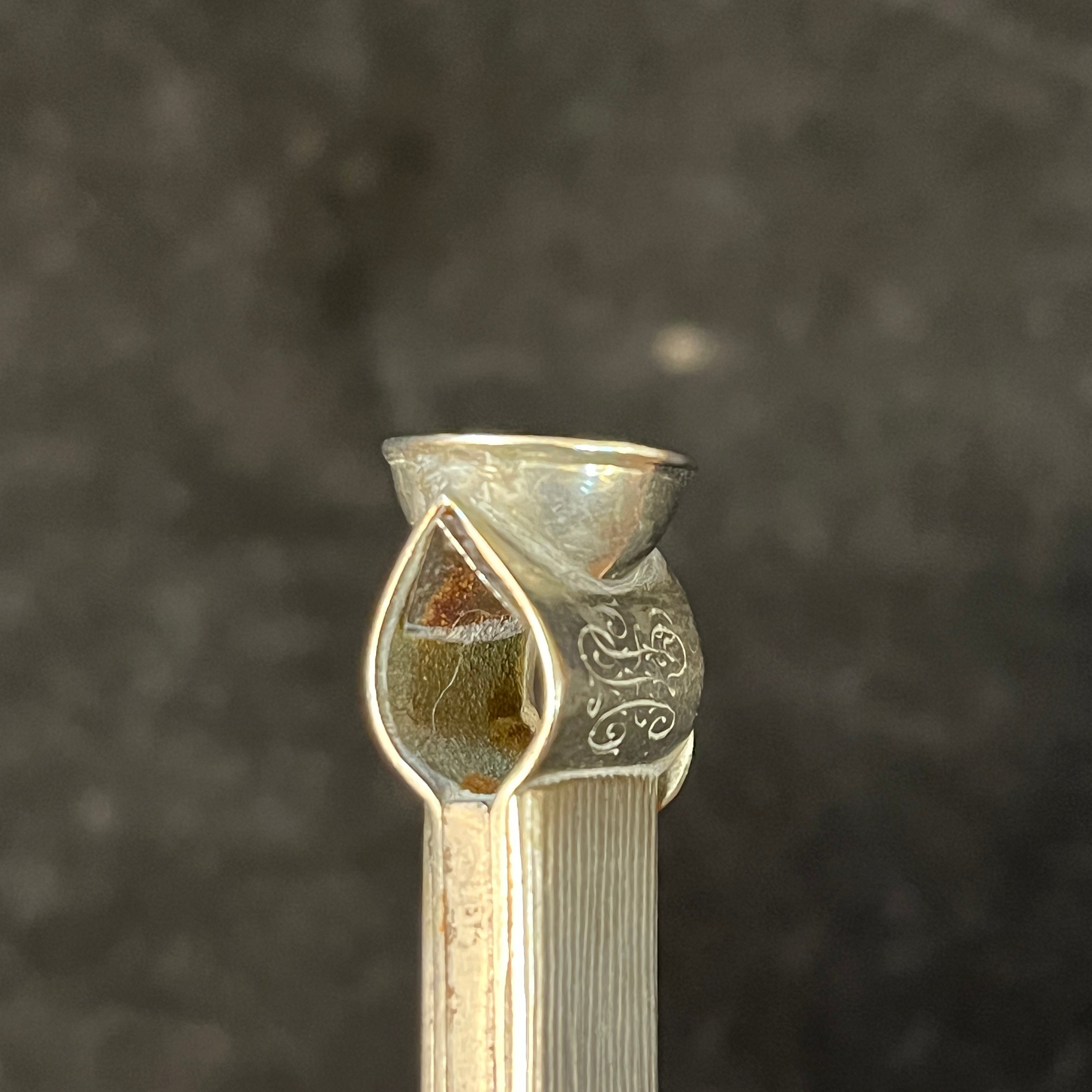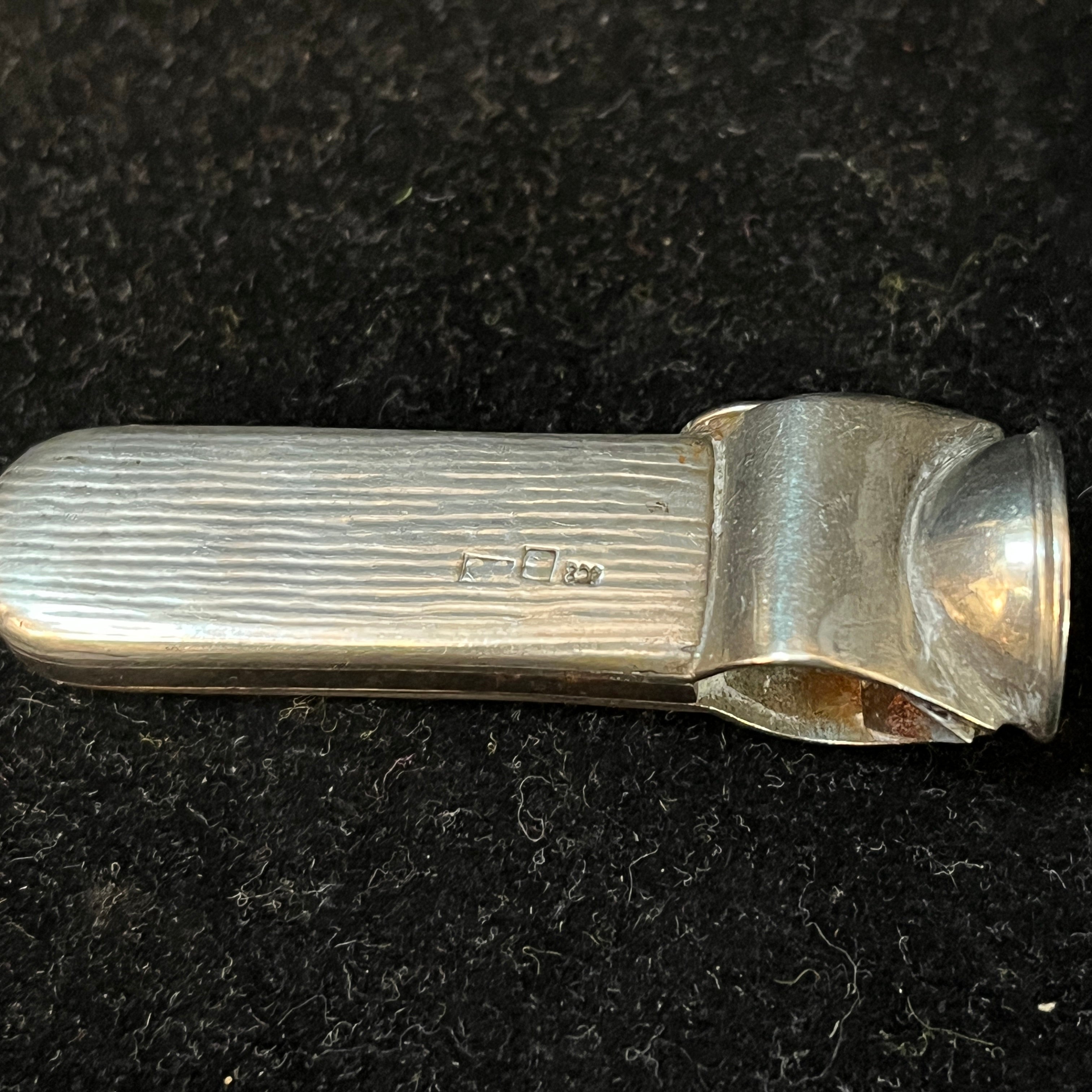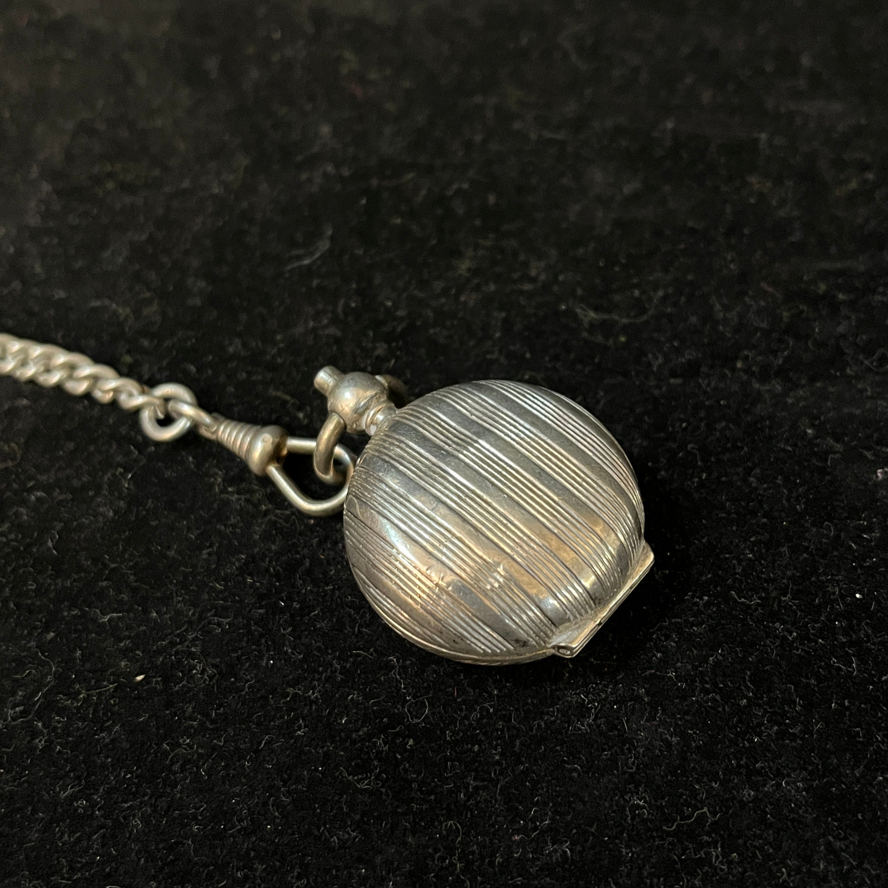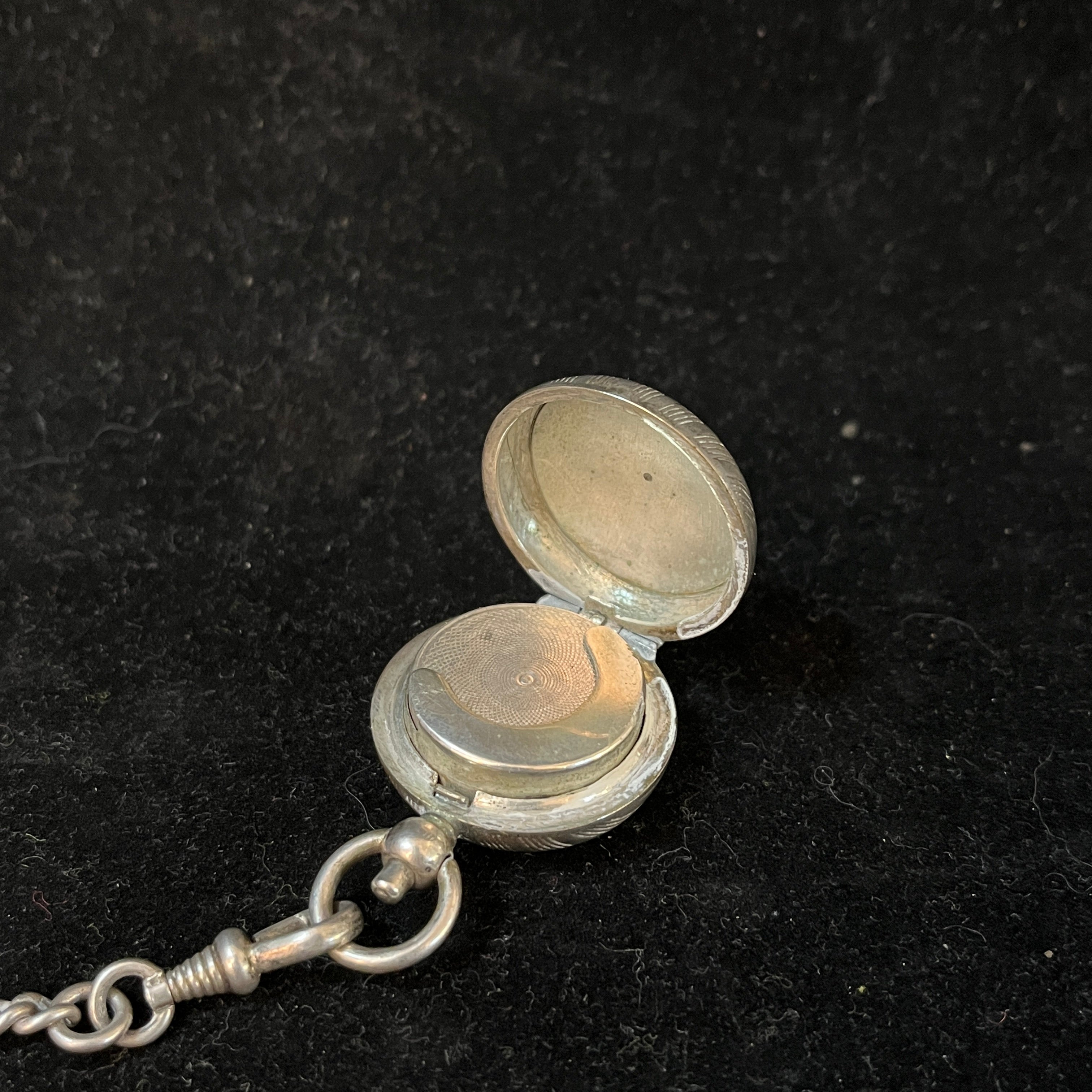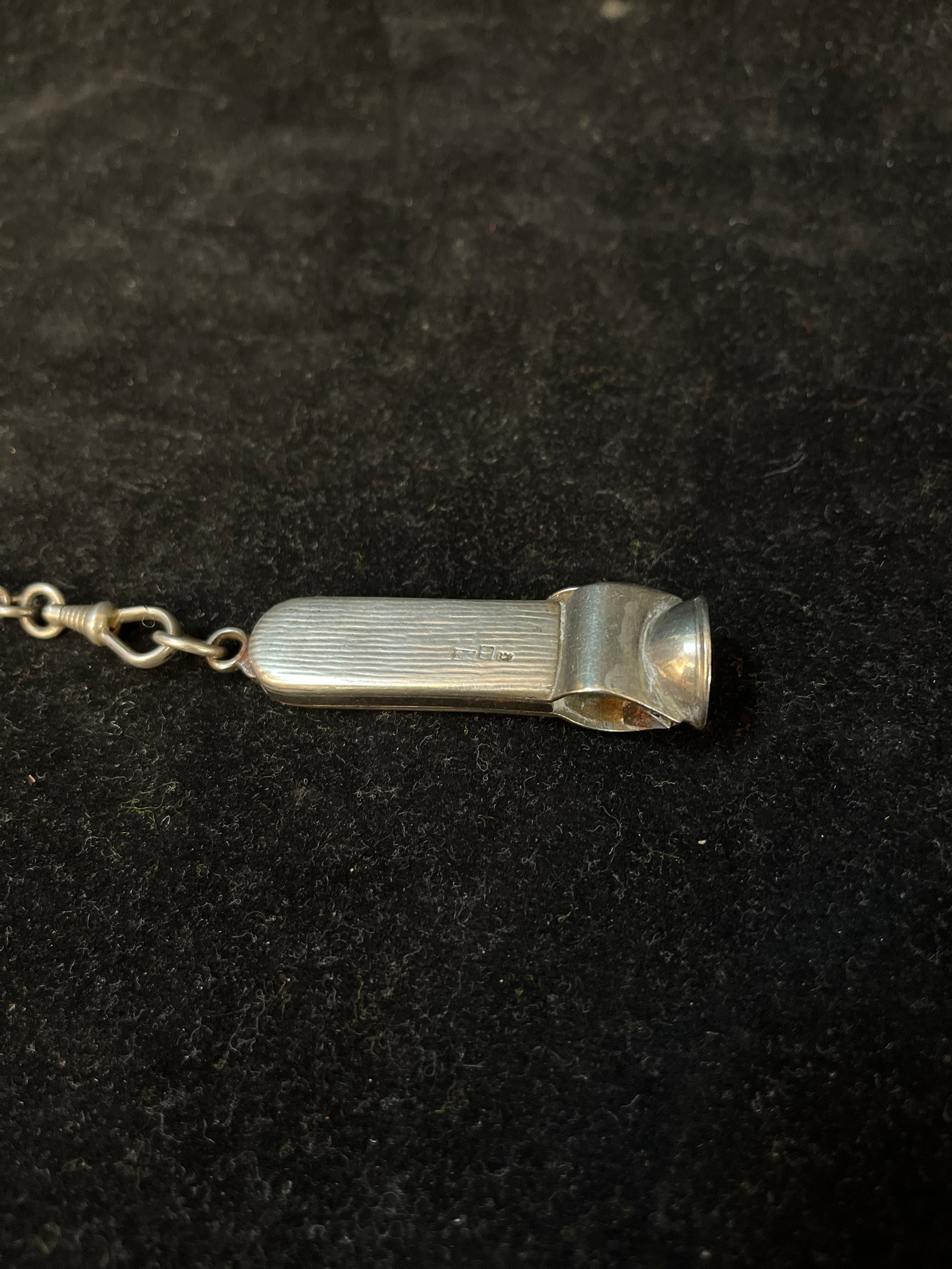 Chatelaine francés hecho de plata ley 800, con tres colgantes: un monedero, un cortador de puros y una pequeña caja para guardar fósforos. Es por estos elementos, y la época en que se usó este accesorio, que podemos decir que se trata de un Chatelaine masculino.
