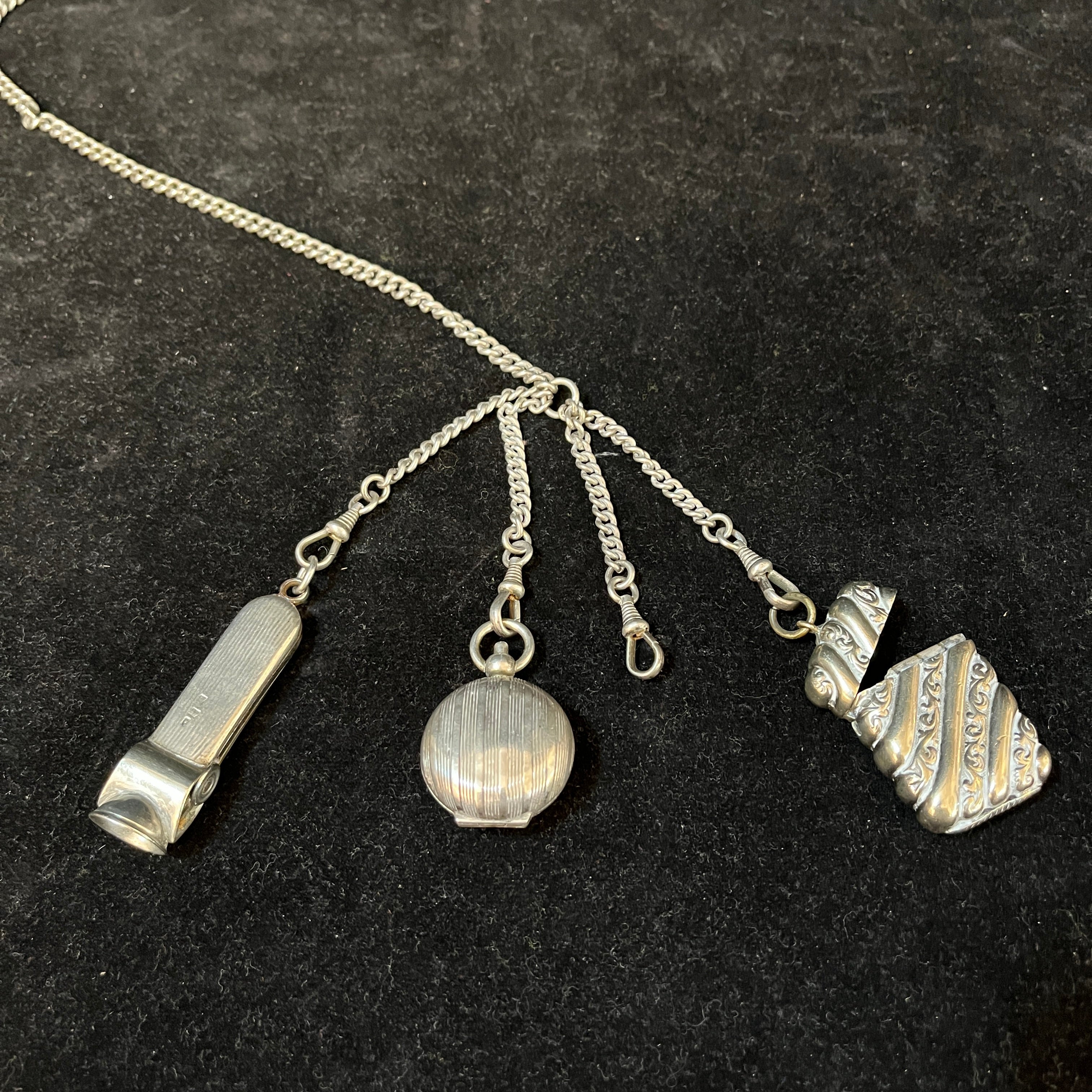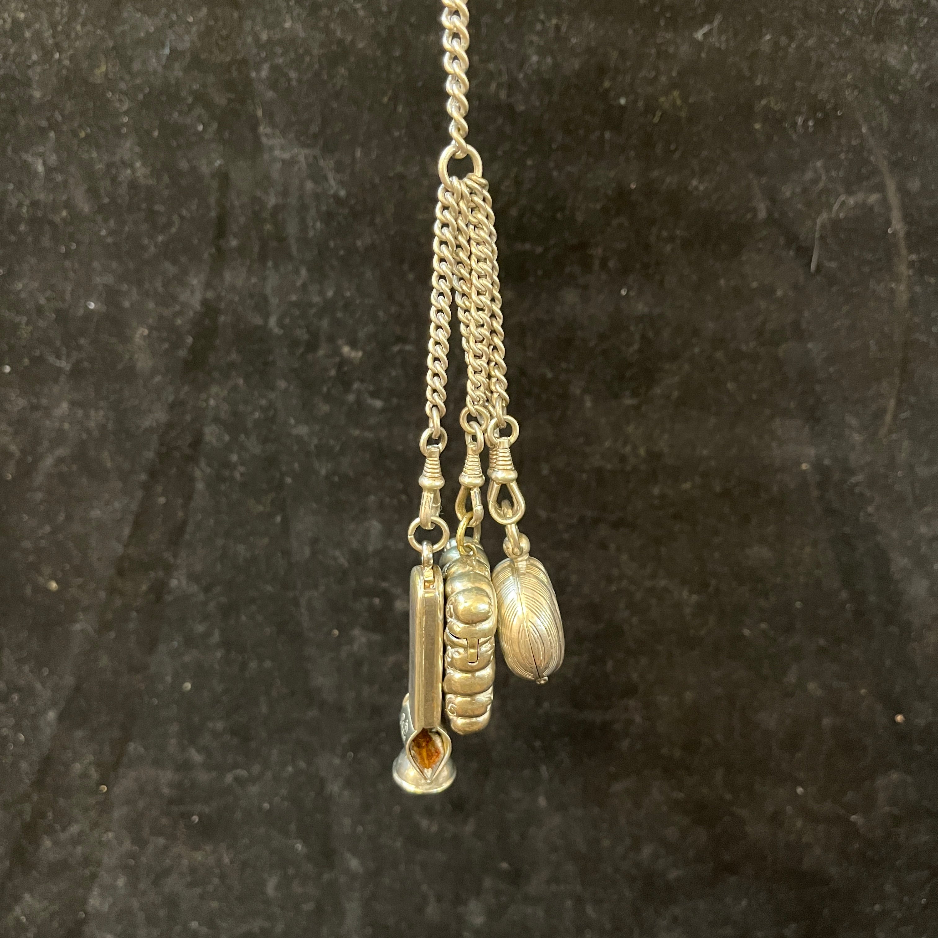 Chatelaine francés de caballero plata ley 800 tres colgantes
