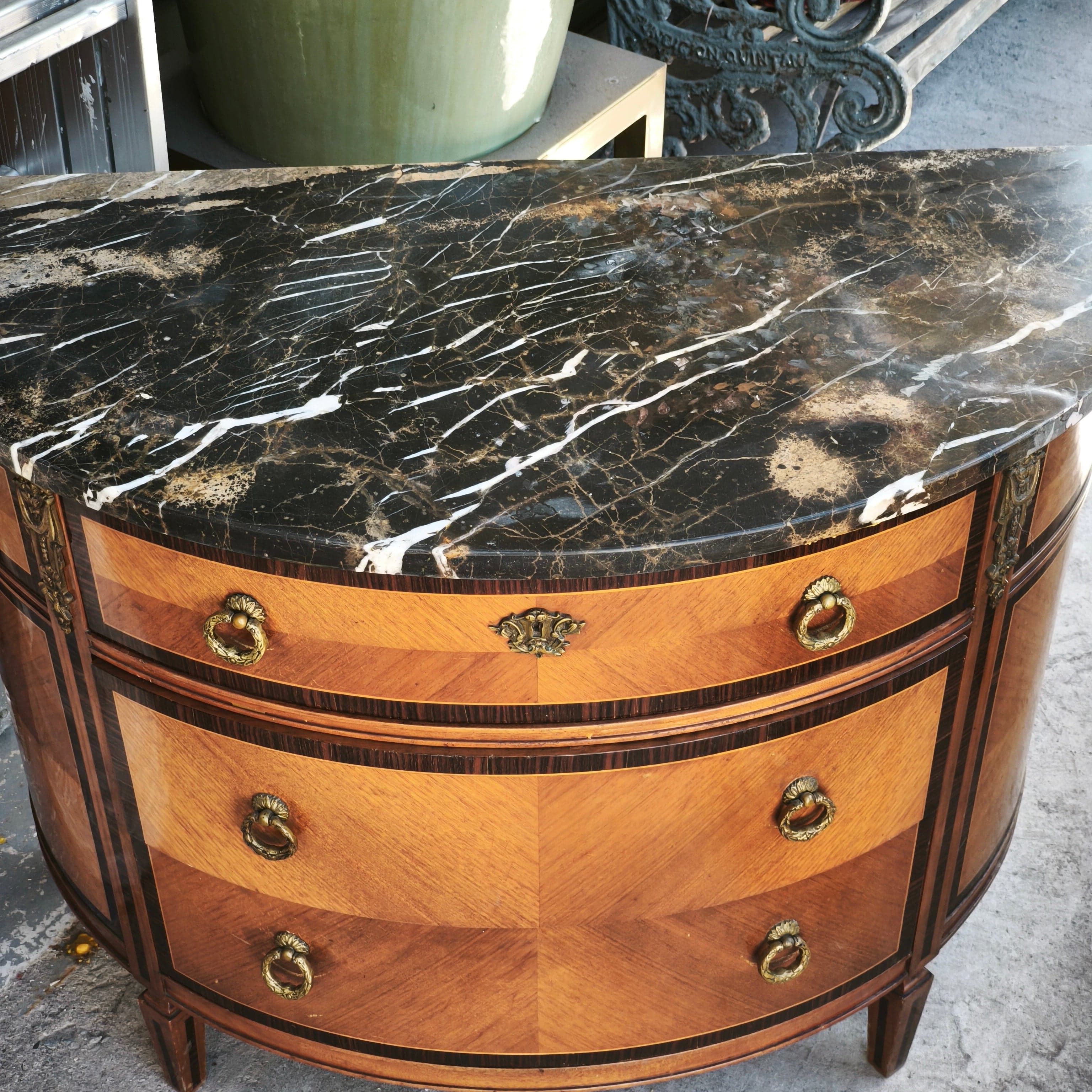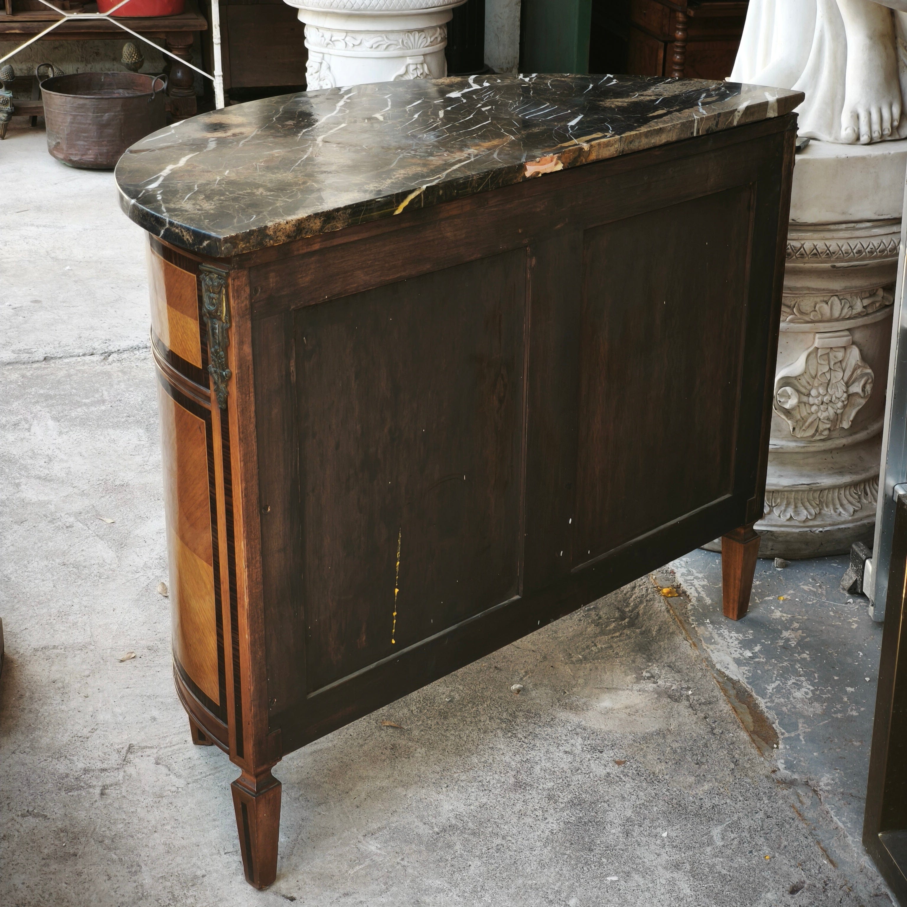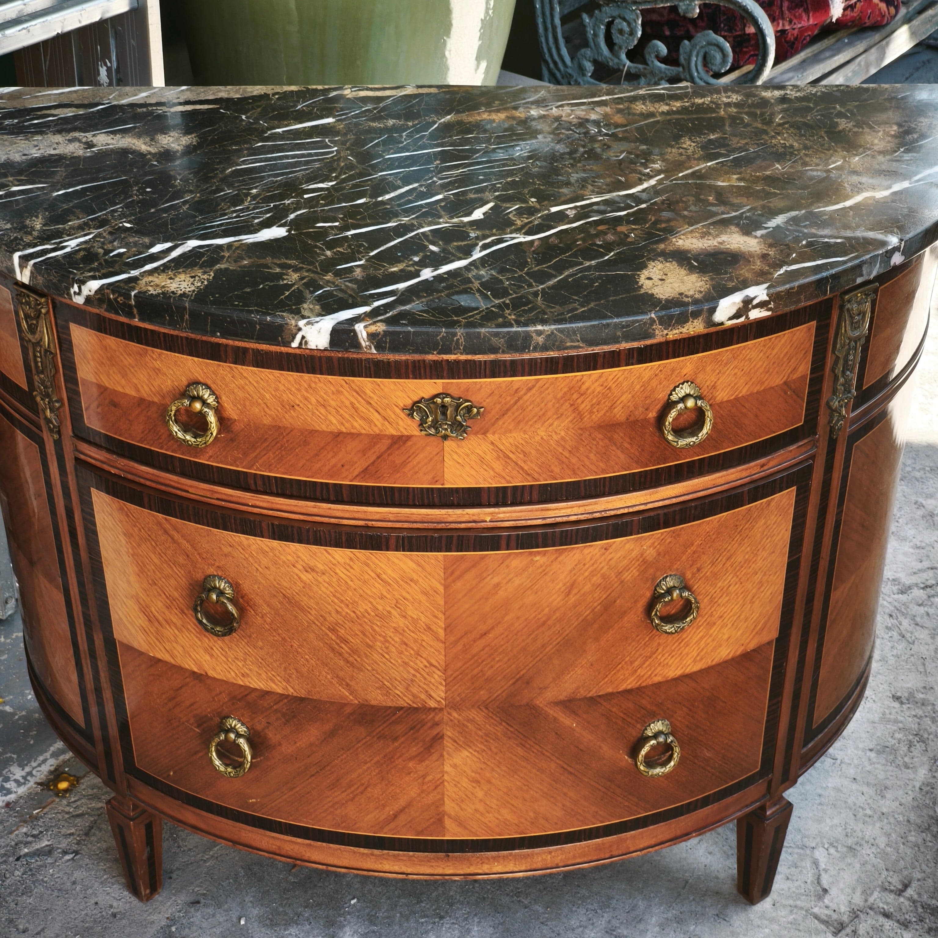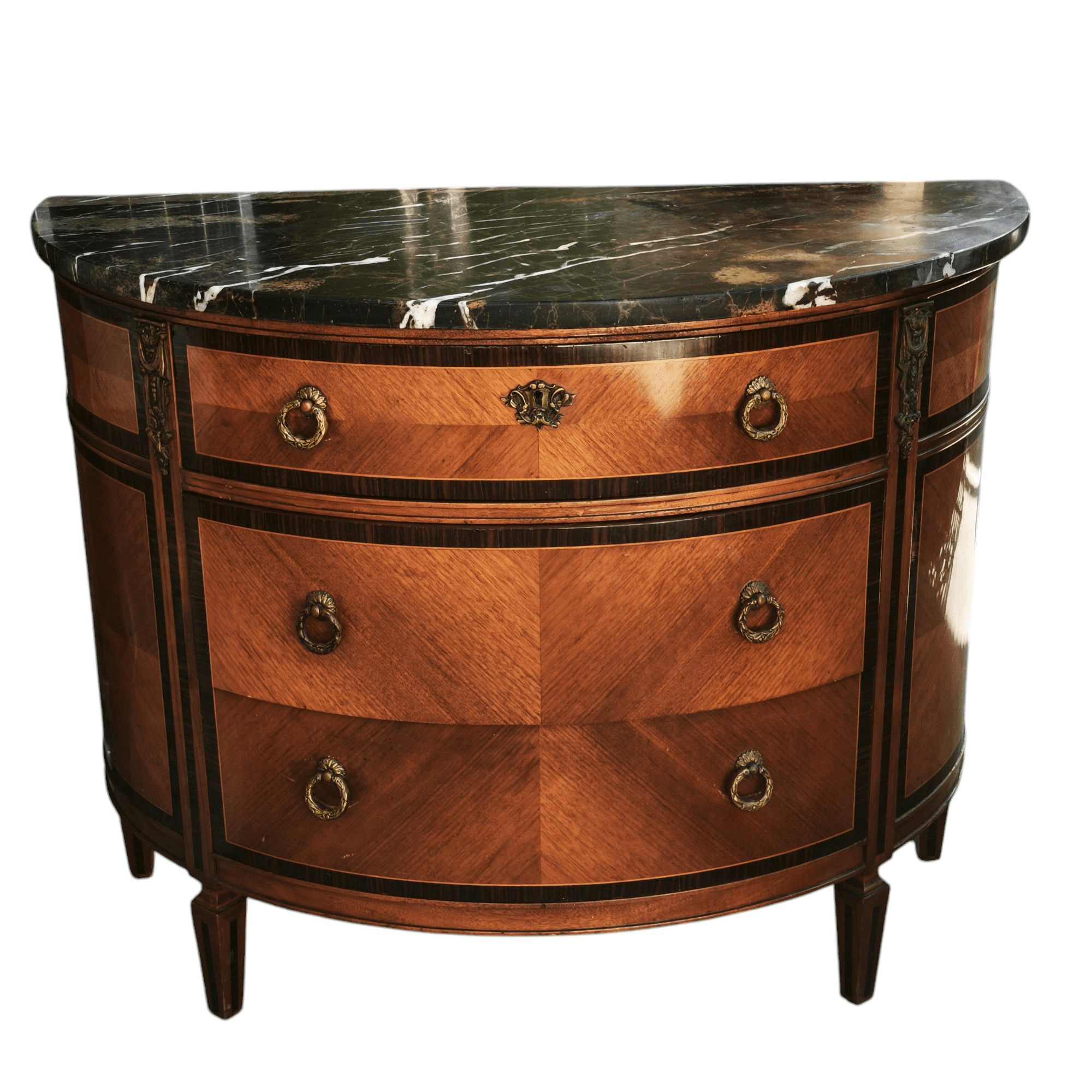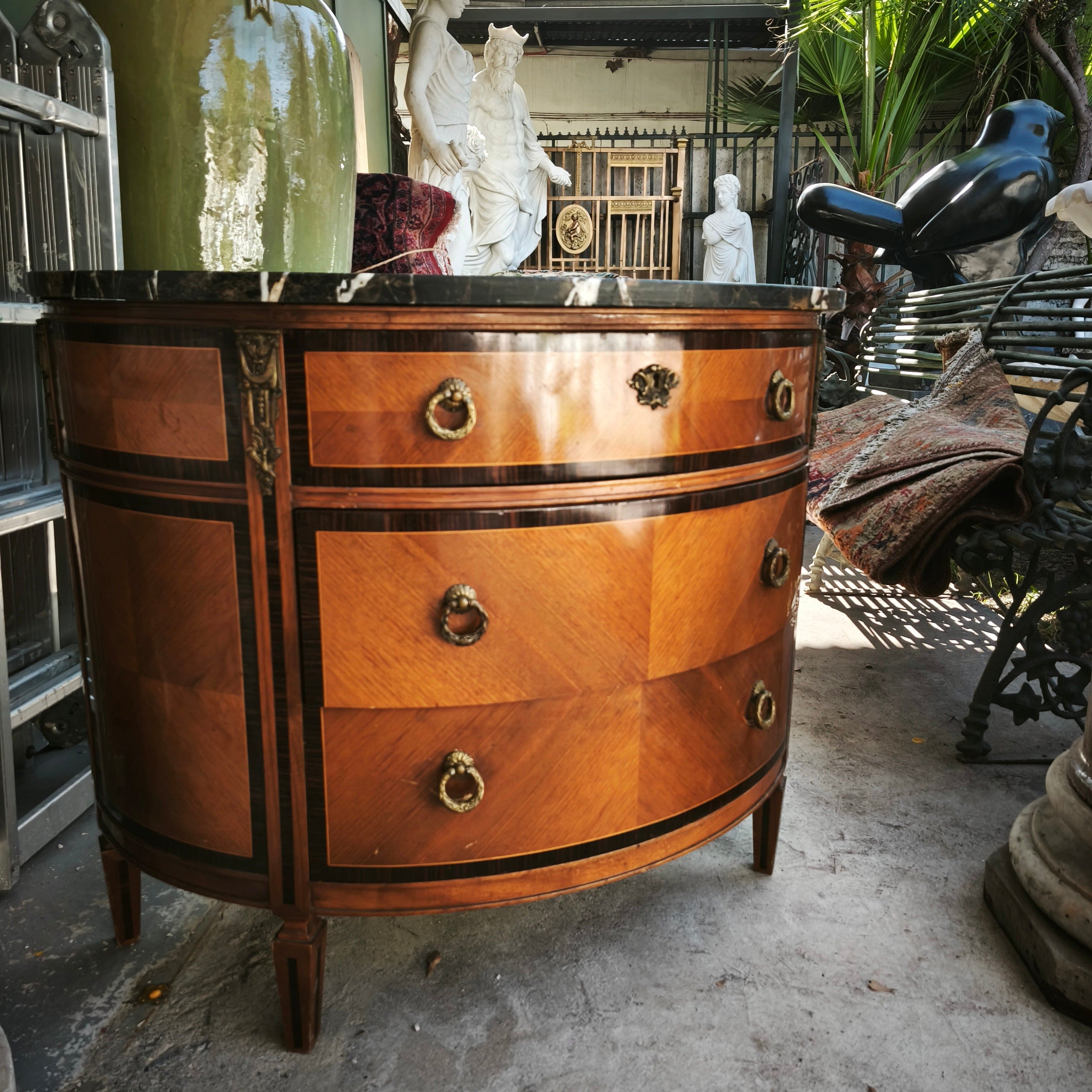 Bellísima cómoda medio punto estilo Luis XVI de caoba rubia. Tiene tres cajones en su interior varios compartimentos de madera de nogal, con tiradores de bronce, cubierta de mármol original restaurada.