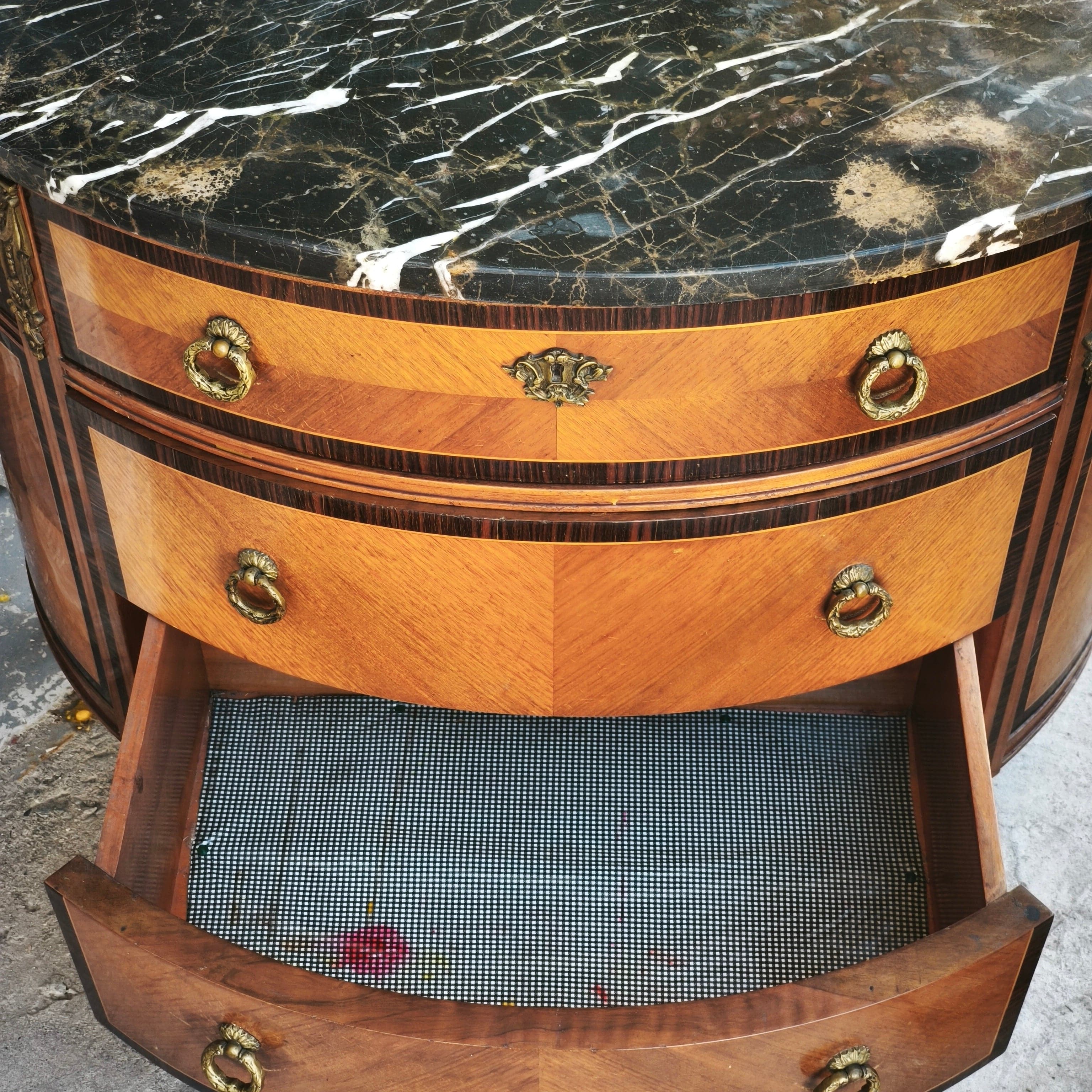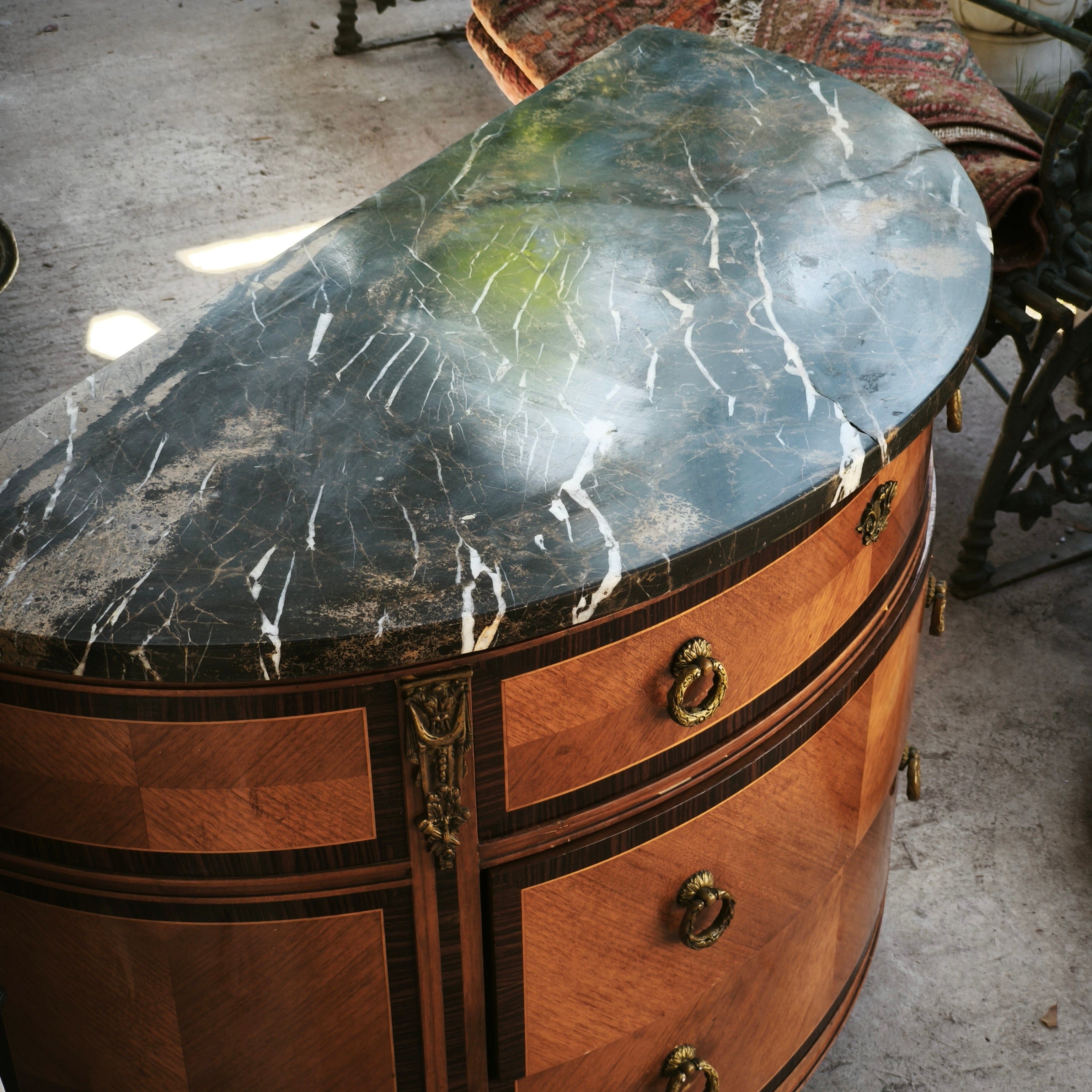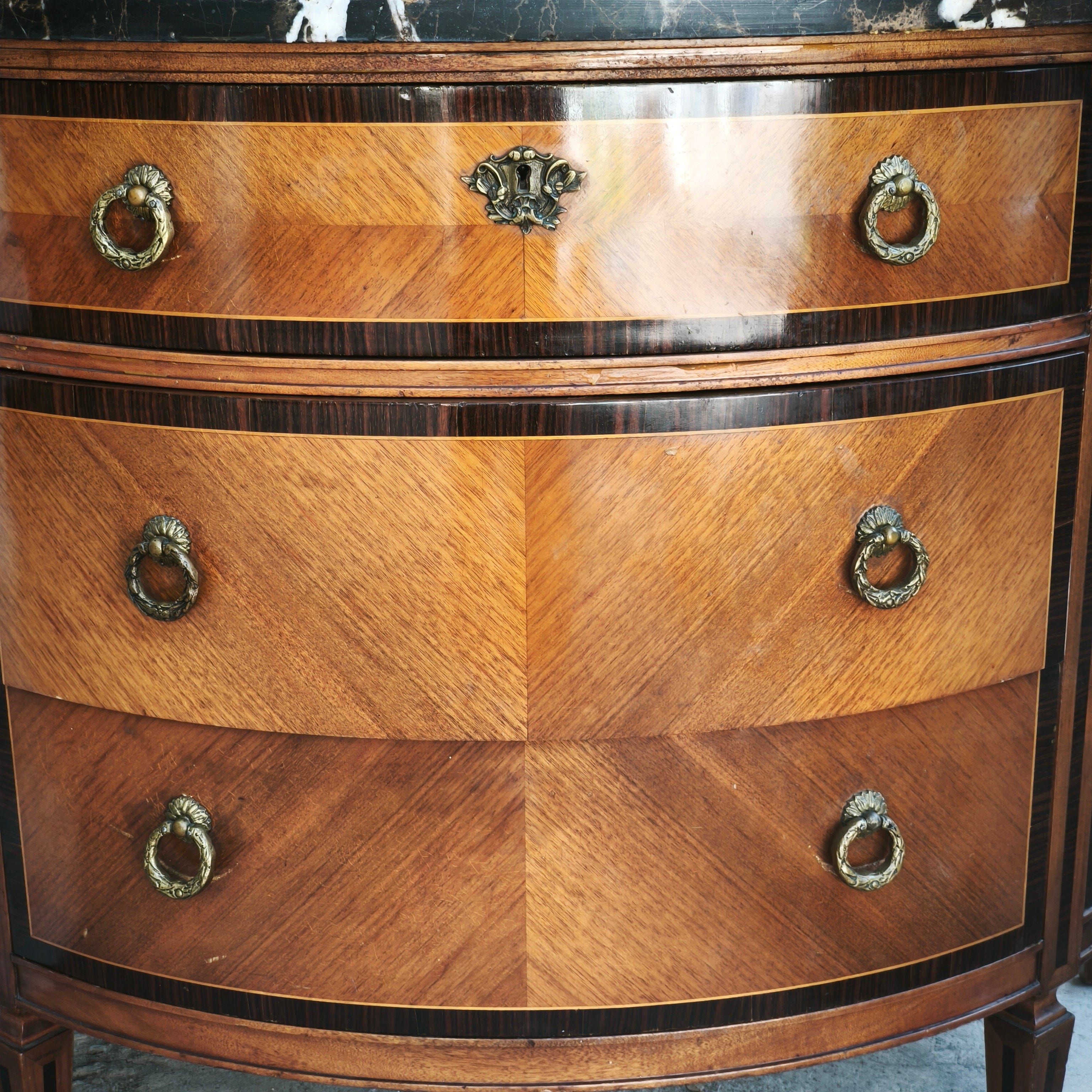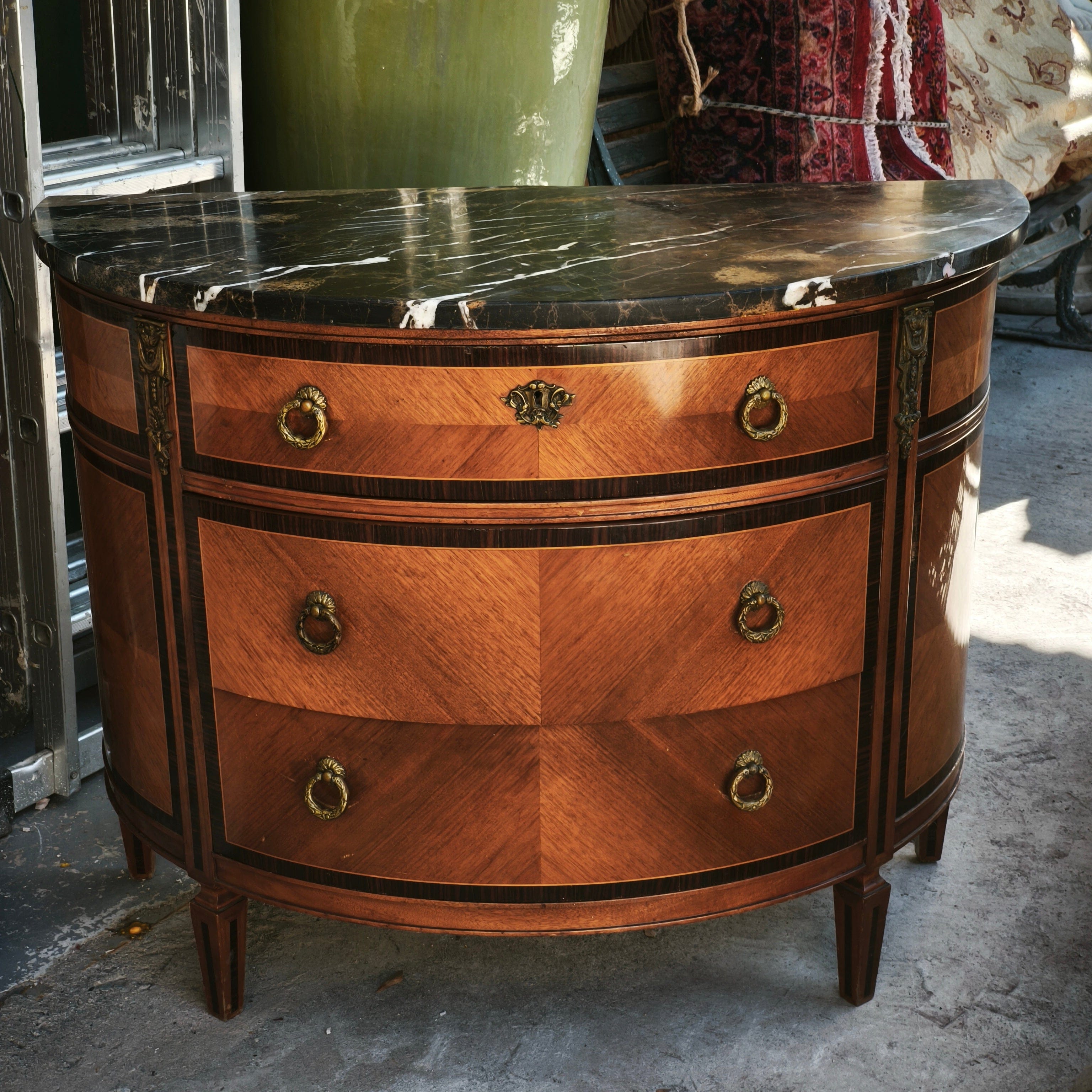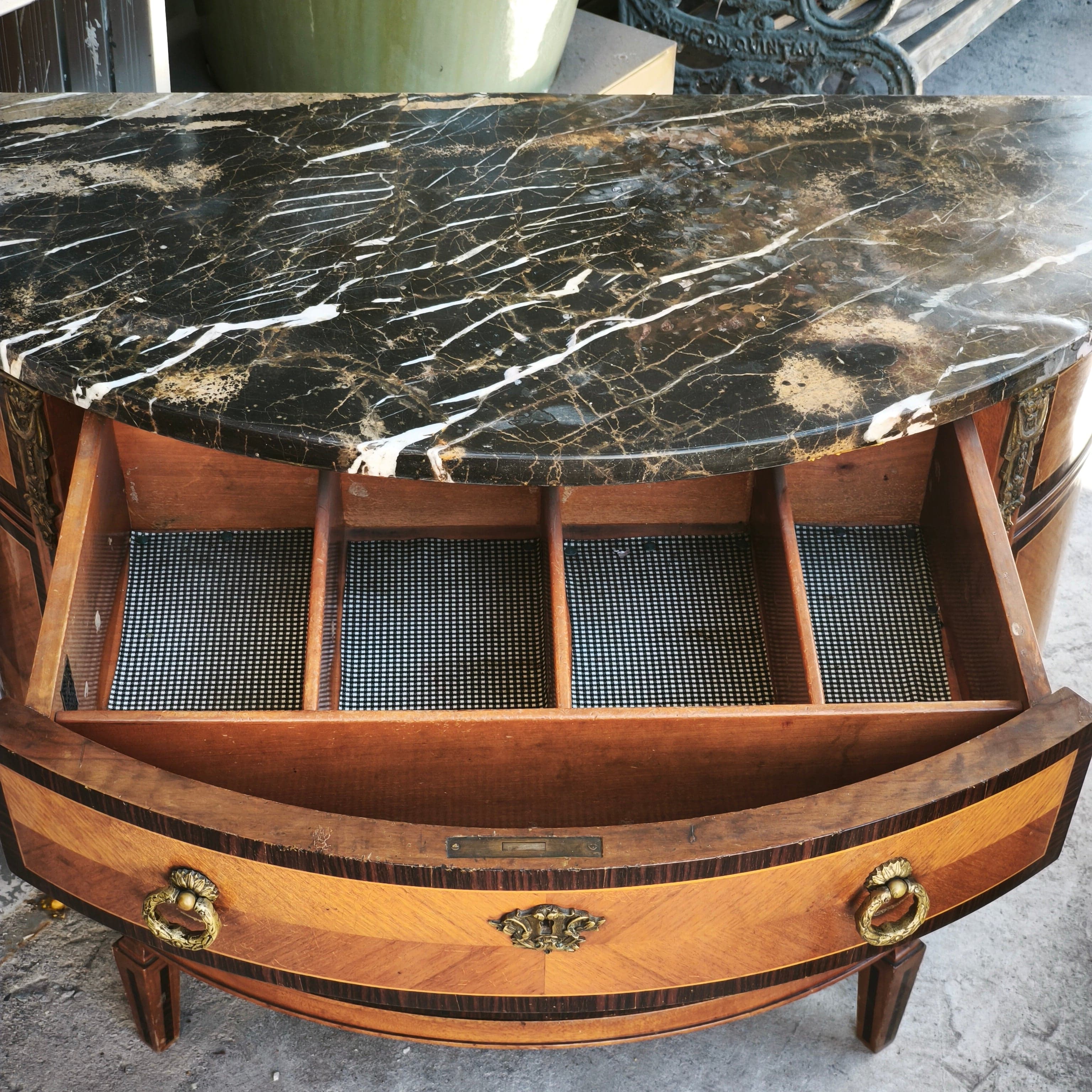 Bellísima cómoda medio punto estilo Luis XVI de caoba rubia. Tiene tres cajones en su interior varios compartimentos de madera de nogal, con tiradores de bronce, cubierta de mármol original restaurada.