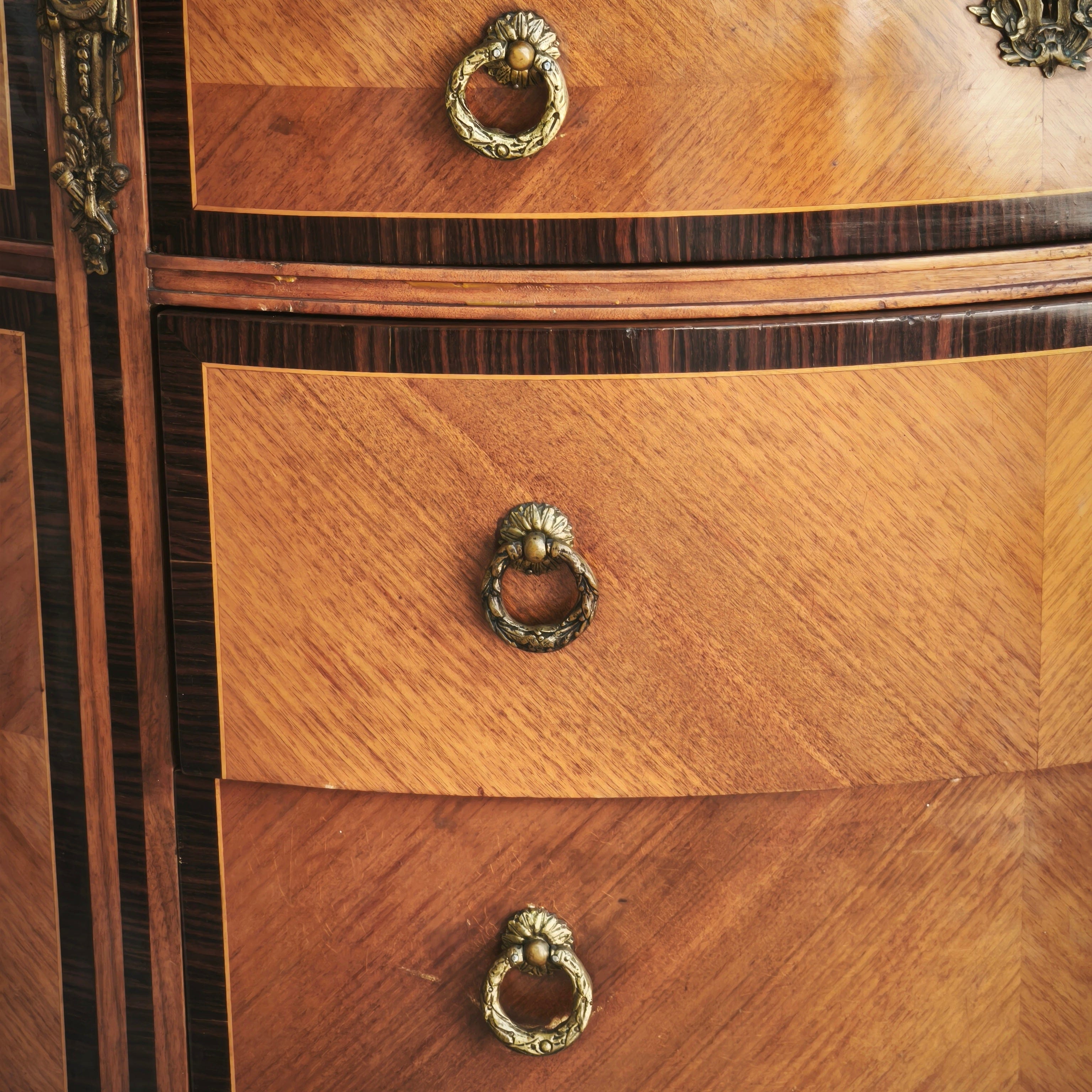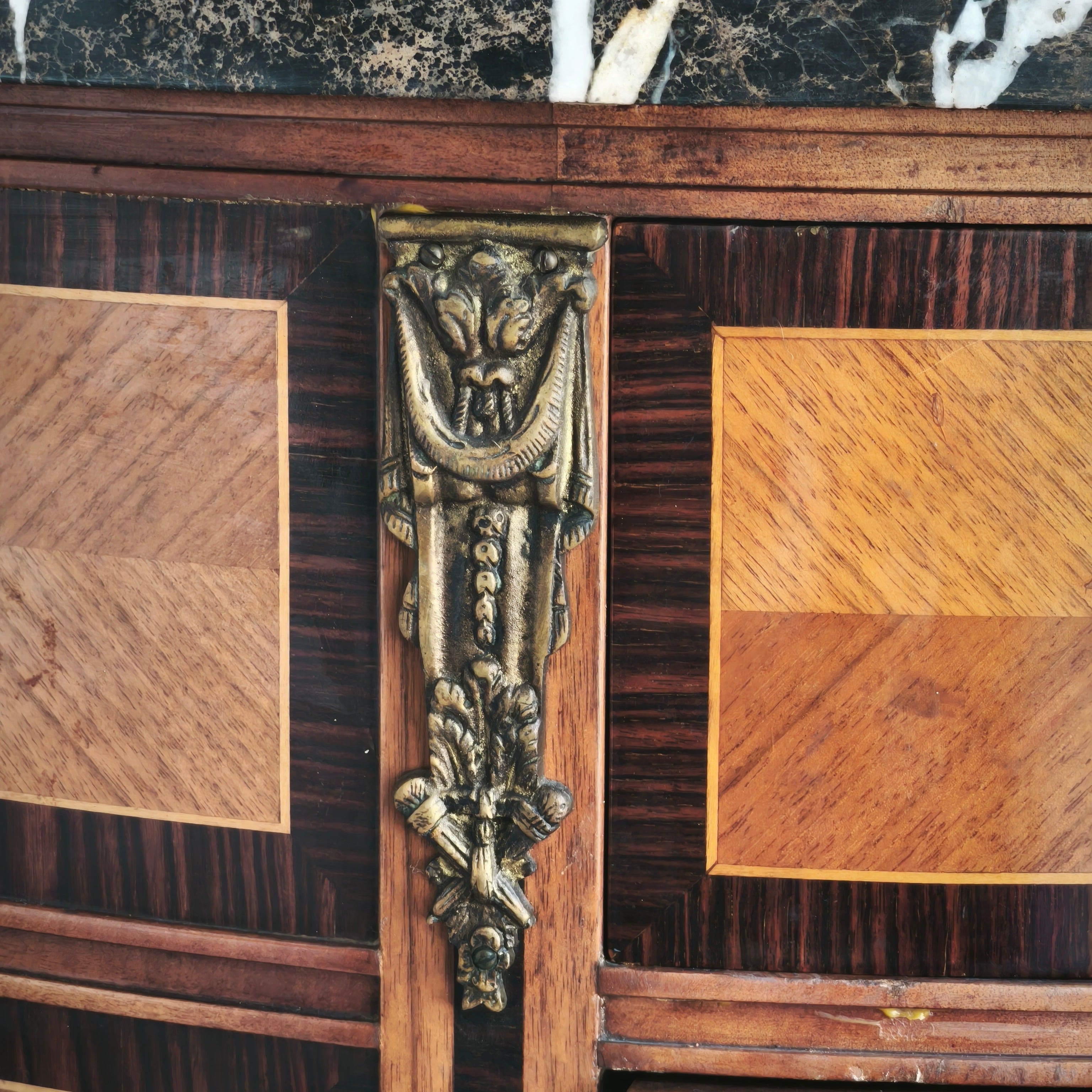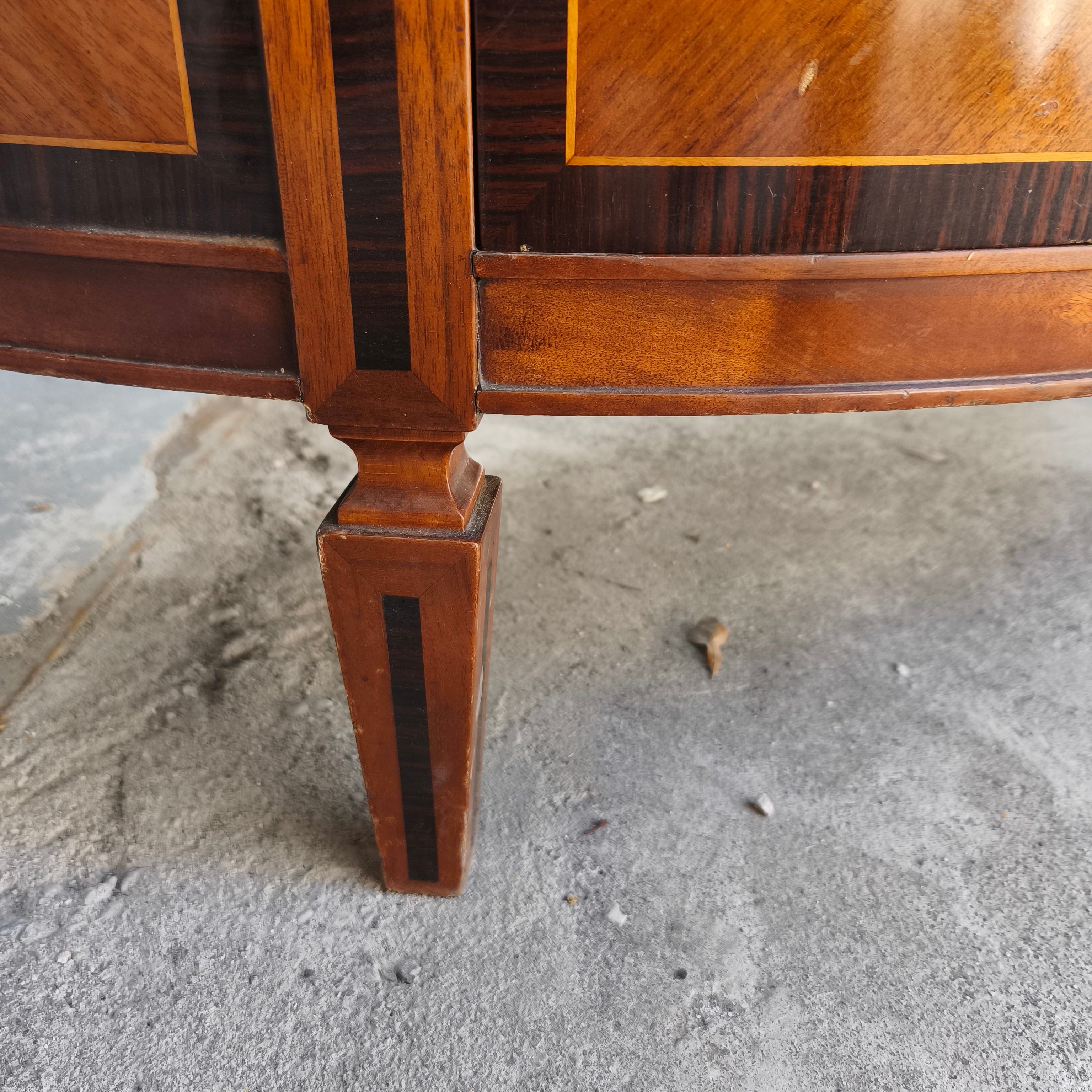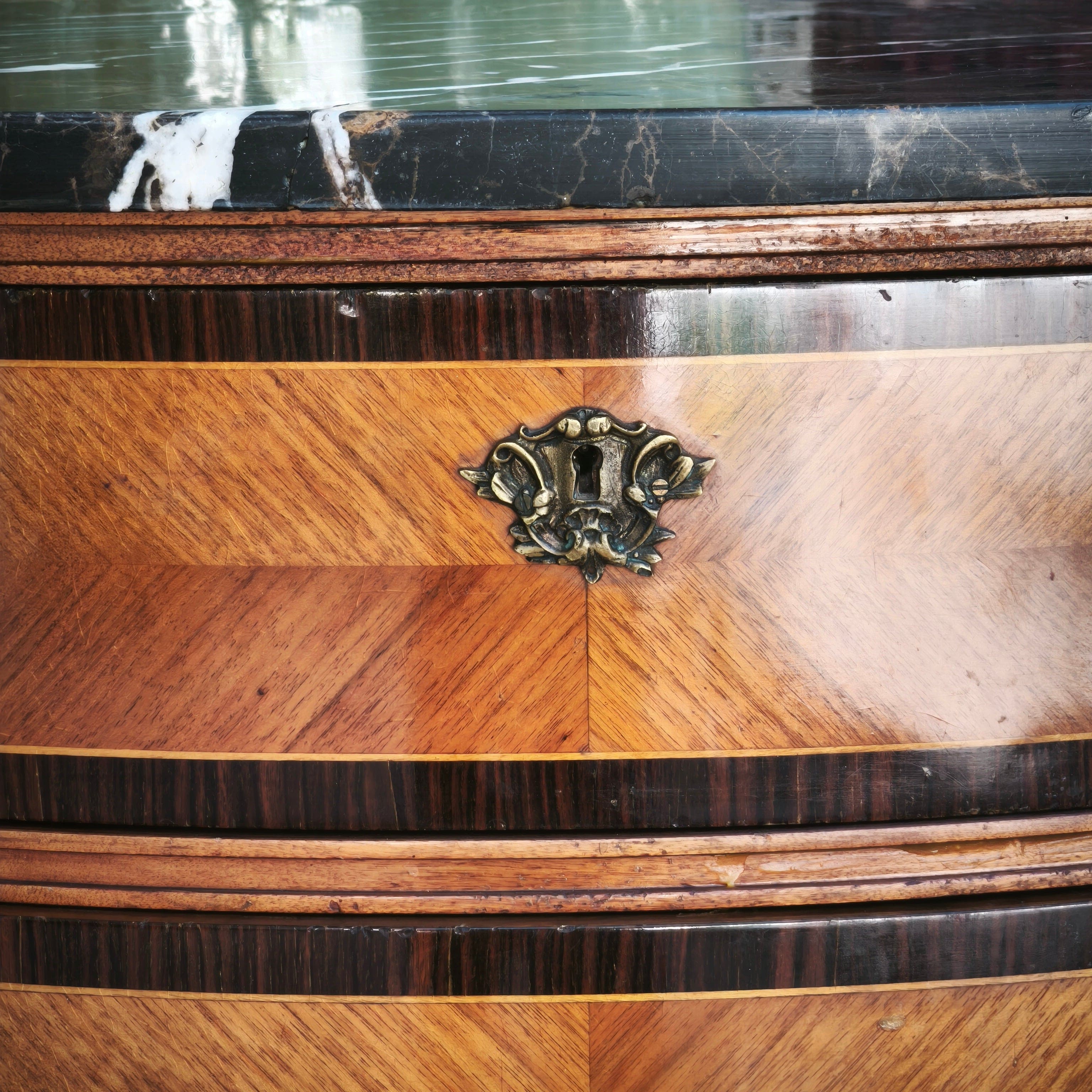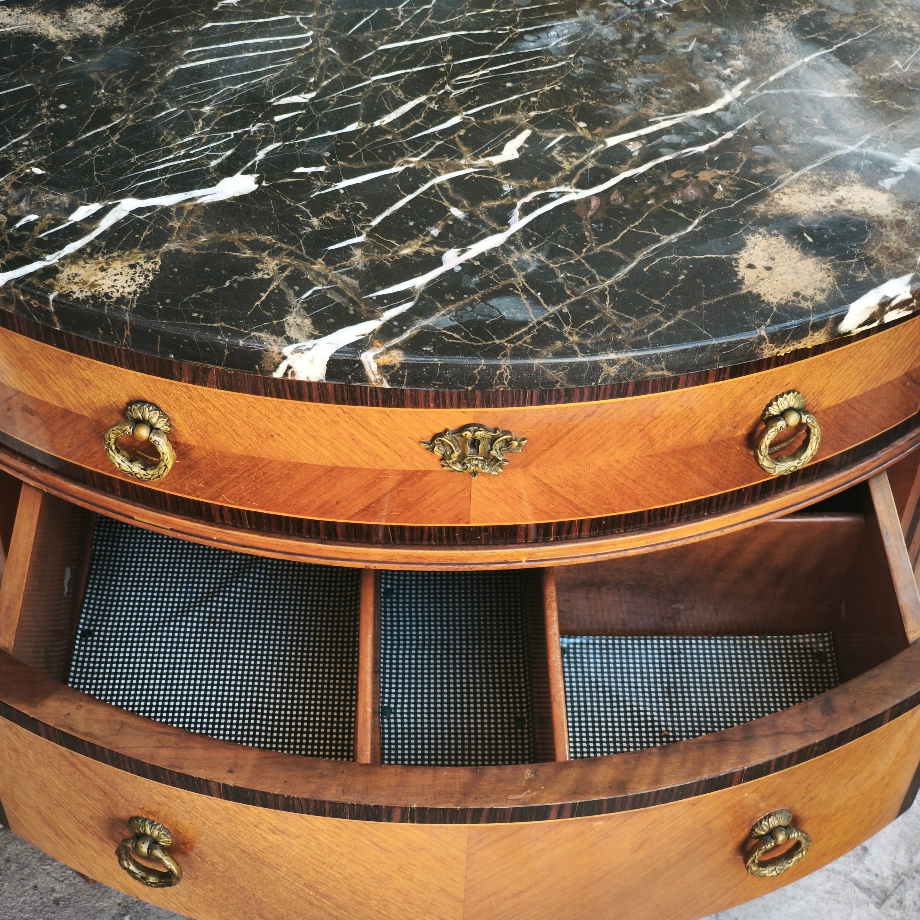 Bellísima cómoda medio punto estilo Luis XVI de caoba rubia. Tiene tres cajones en su interior varios compartimentos de madera de nogal, con tiradores de bronce, cubierta de mármol original restaurada.