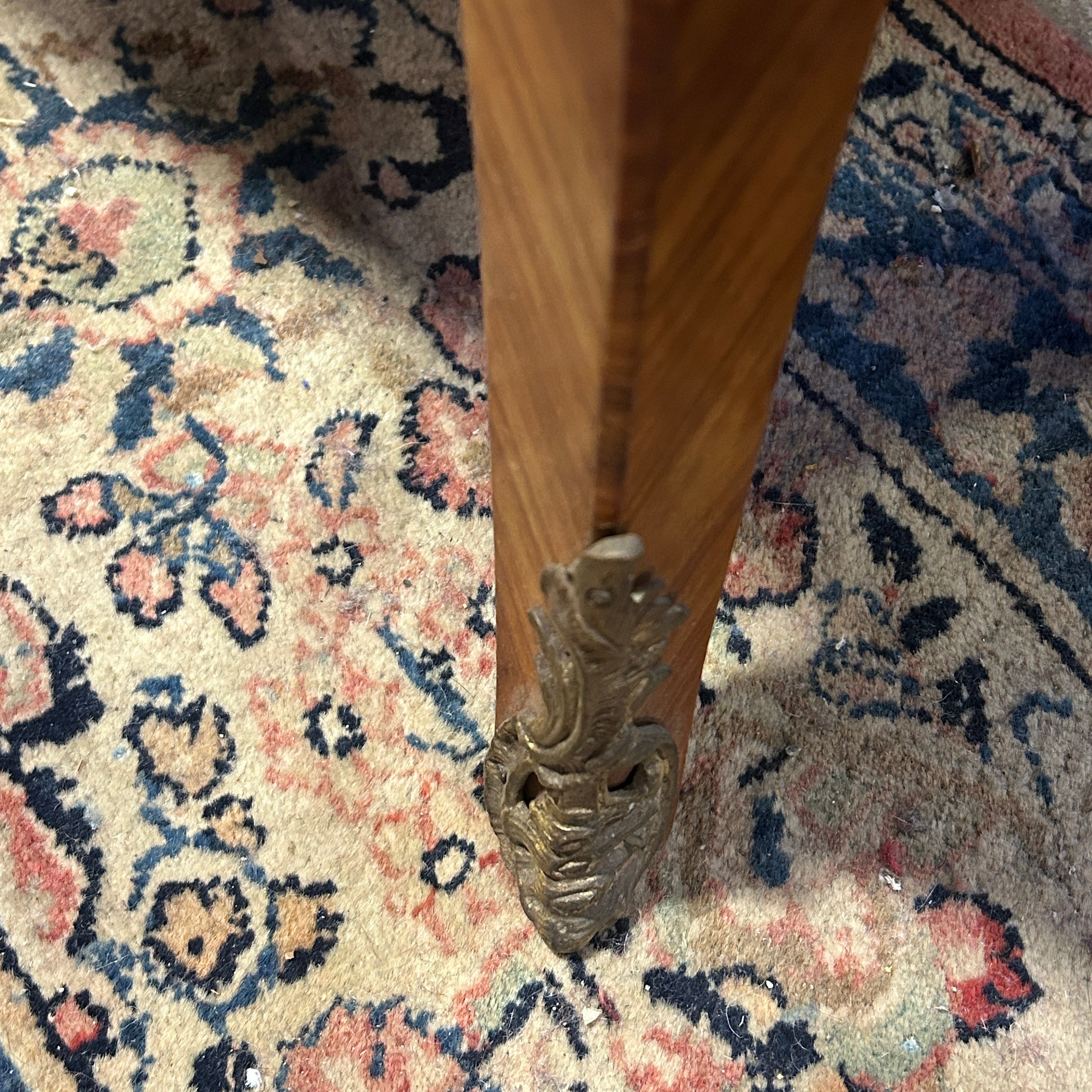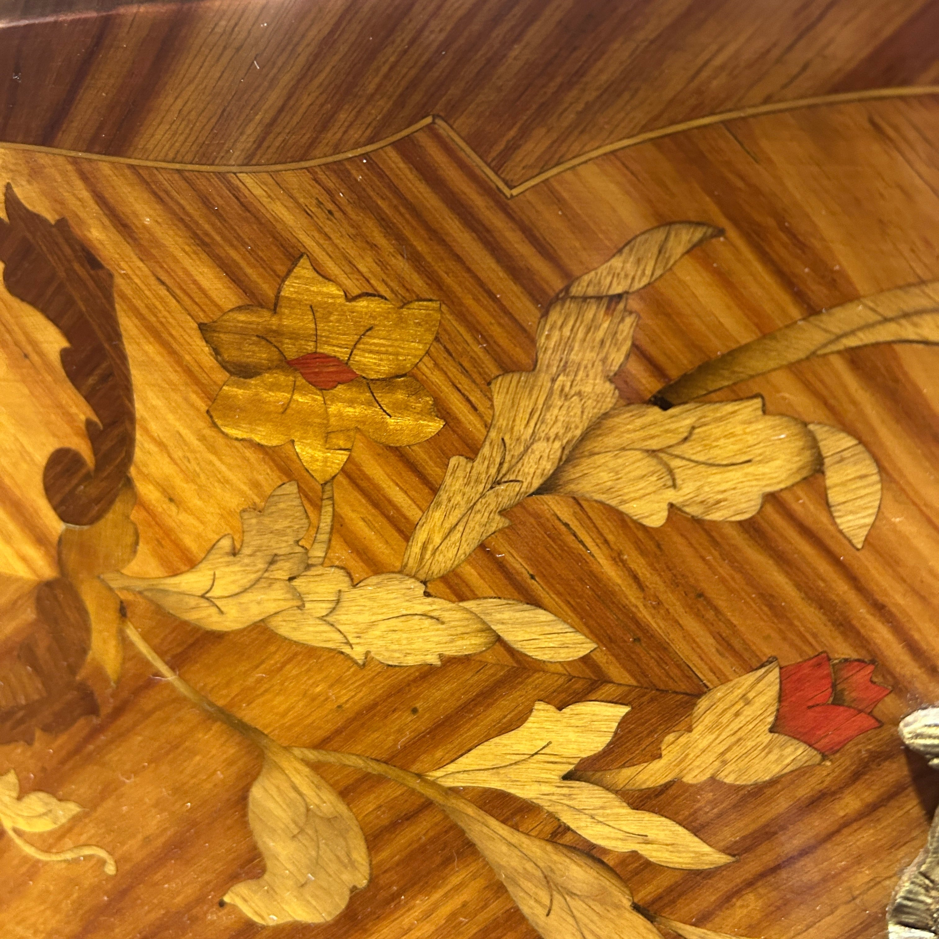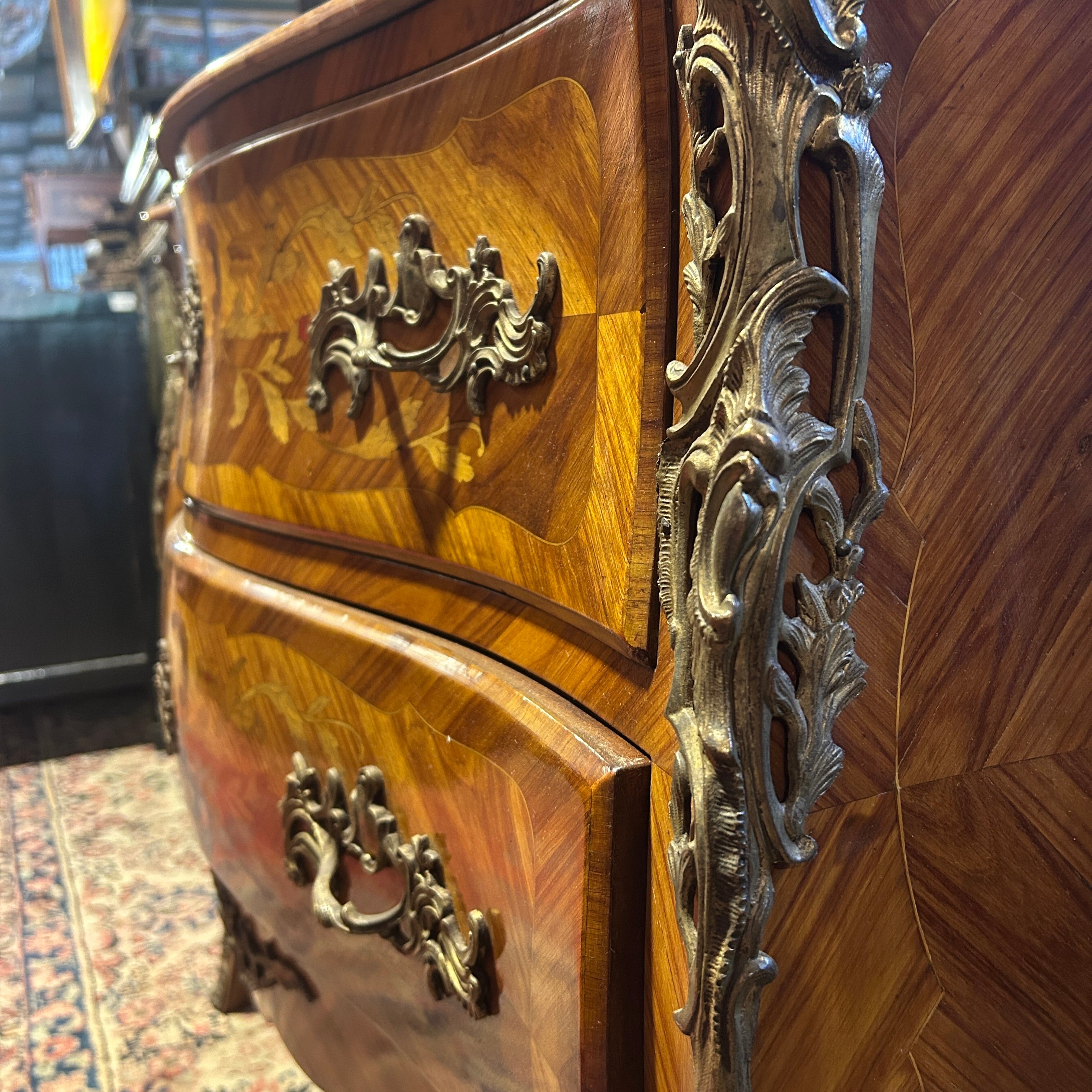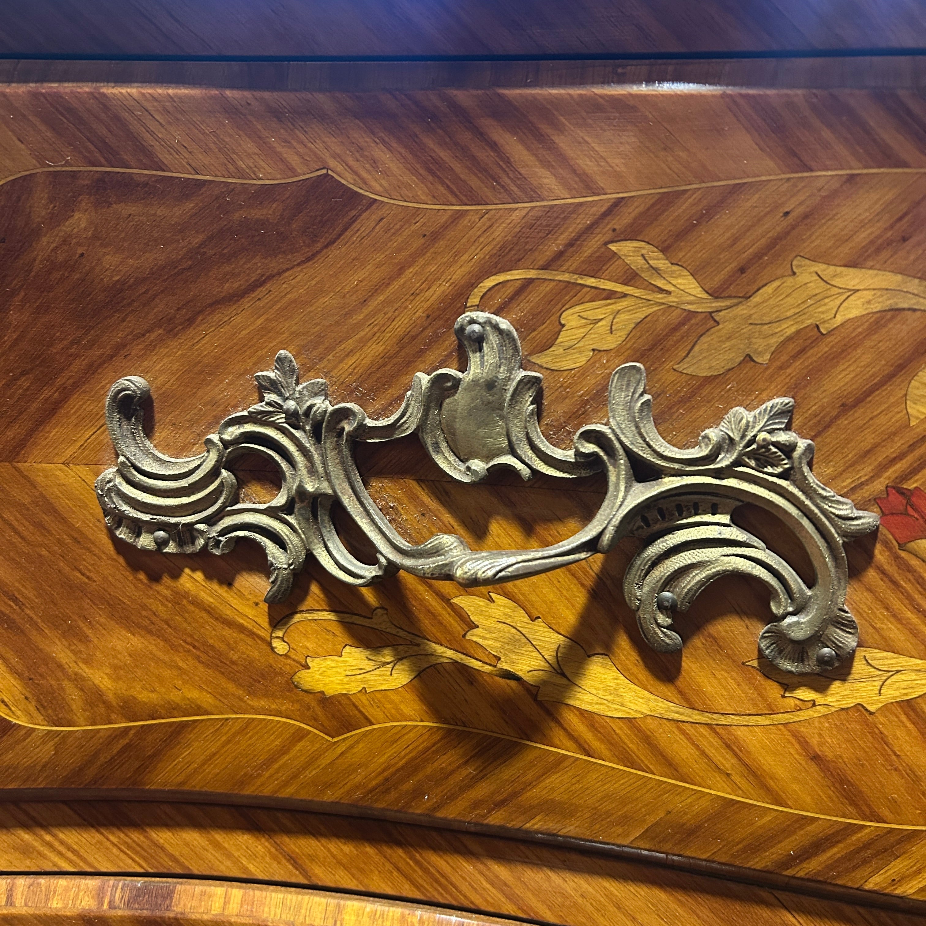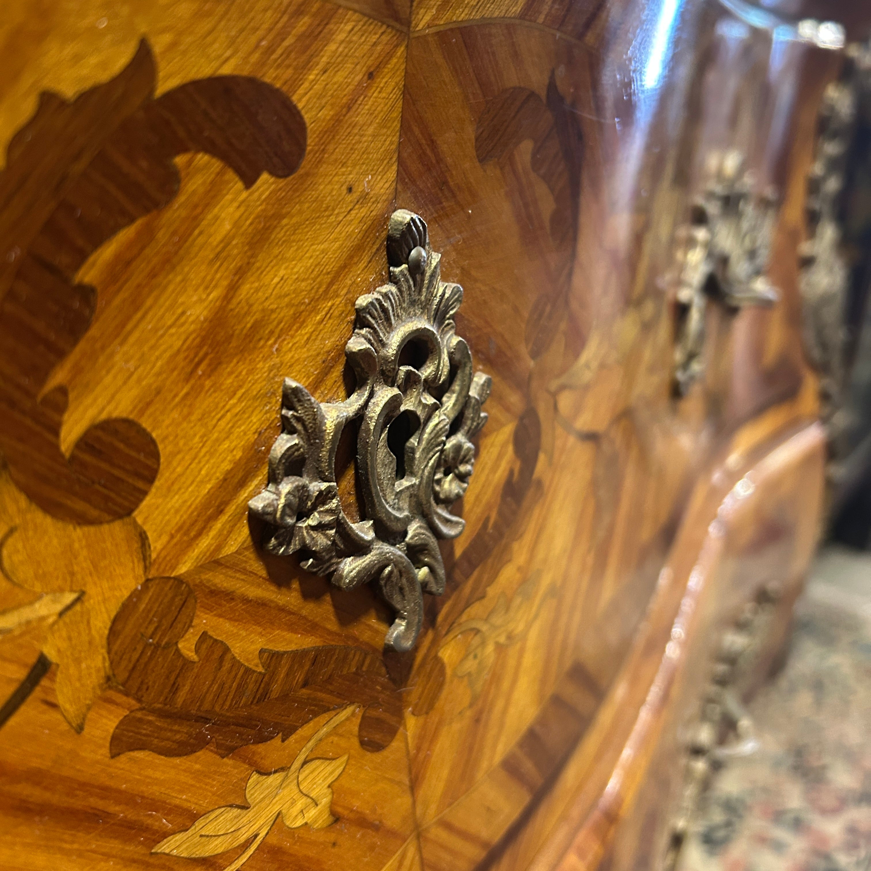 Espectacular cómoda de origen francés estilo Luis XV, hecha en madera enchapada en fina marquetería con motivos florales y parquetería en sus costados. La pieza tiene una cubierta de mármol con tonos anaranjados y una marca de caracol en su superficie, dos cajones, tiradores y aplicaciones en bronce.