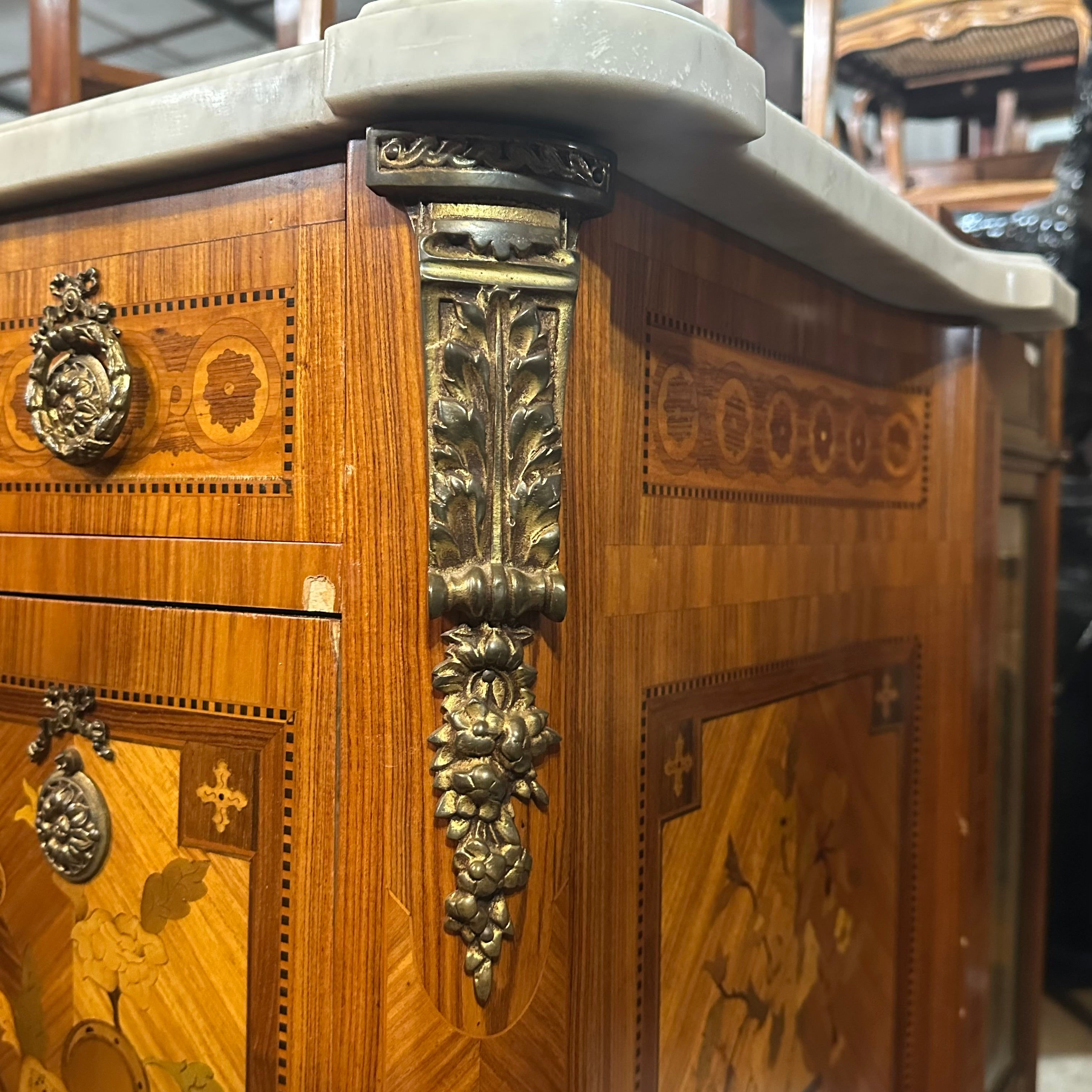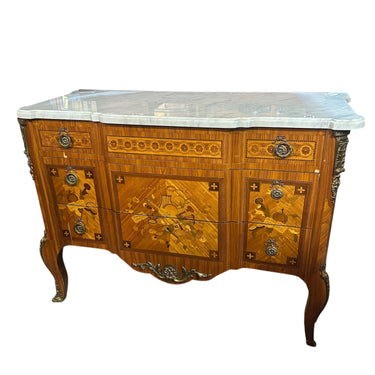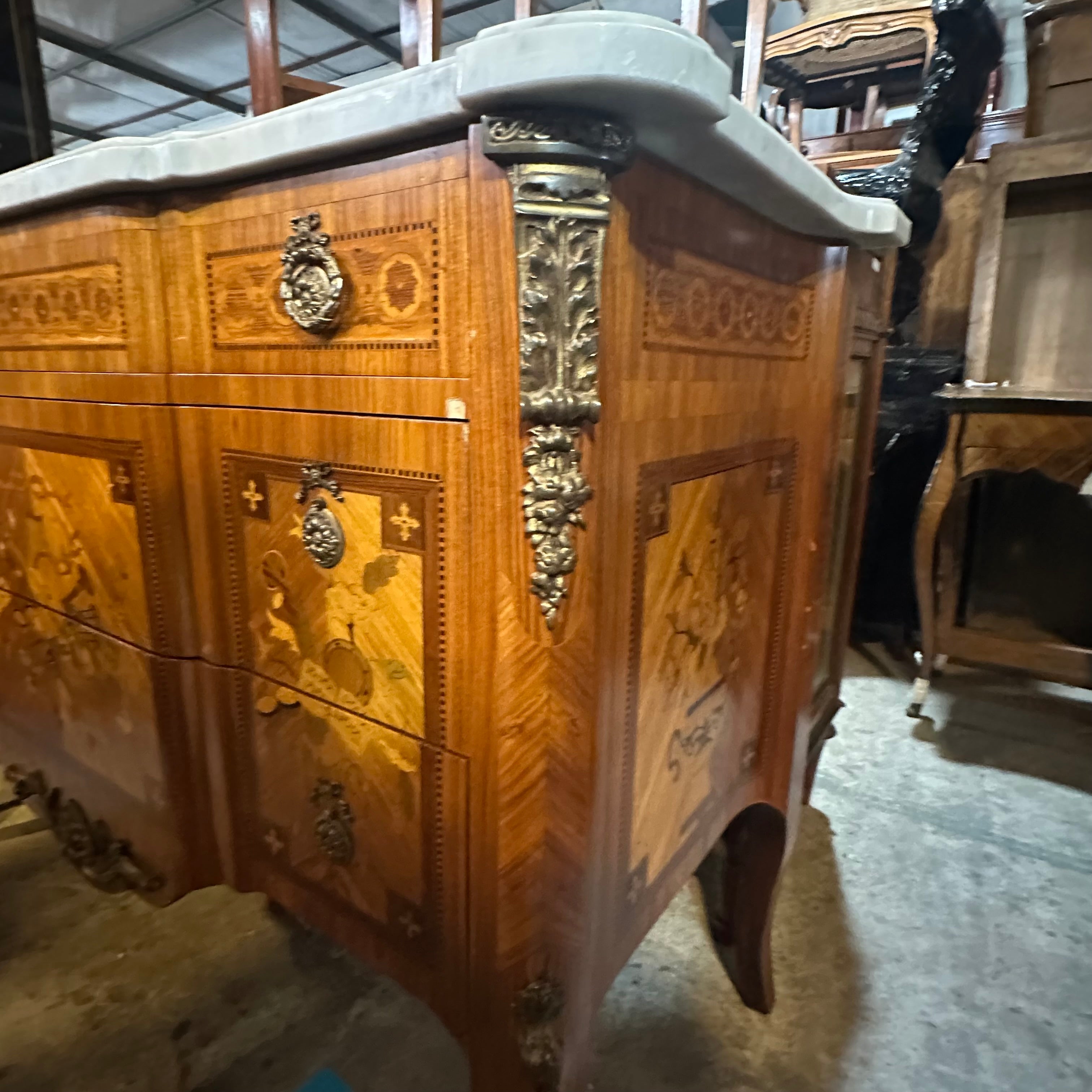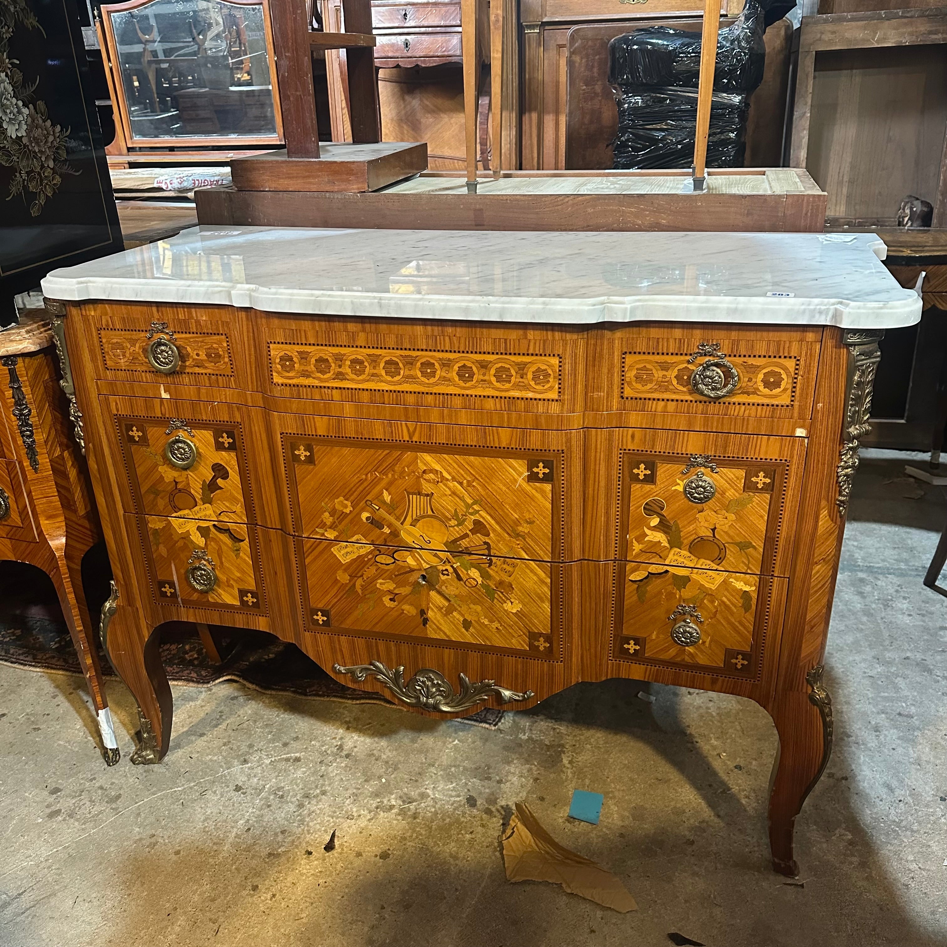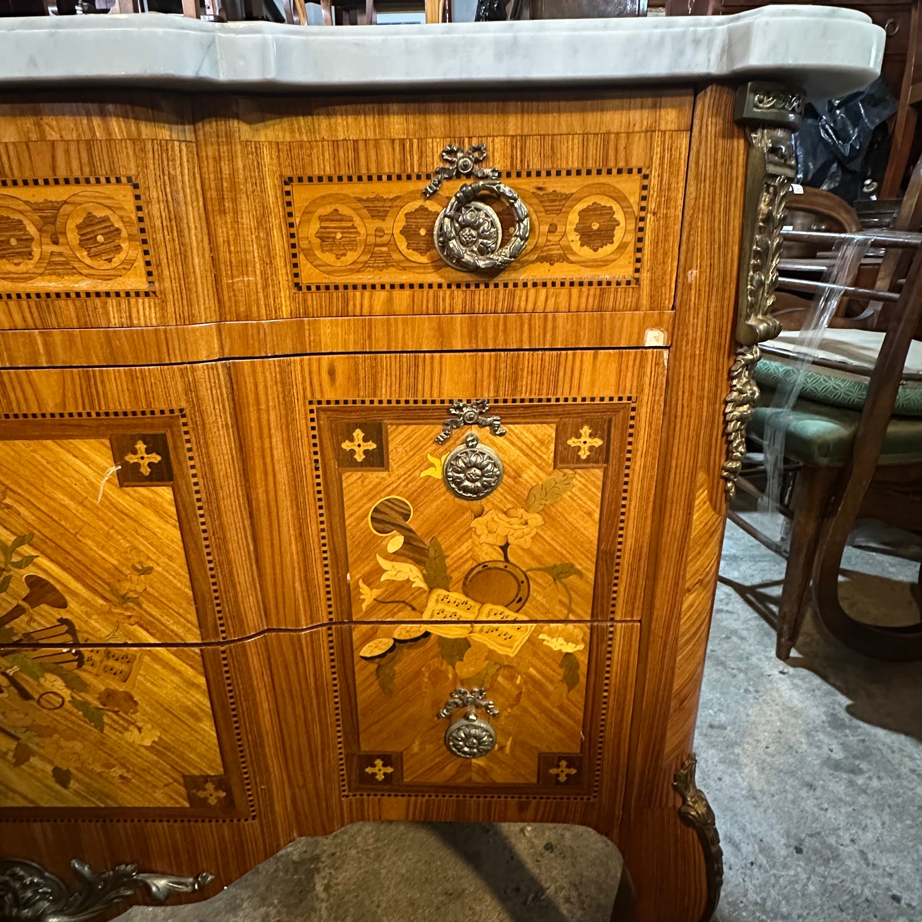 Elegante cómoda, de origen francés, hecha de madera enchapada en palo rosa y palo violeta, marquetería con carquois, instrumentos musicales y flores. La cómoda tiene también tiradores y aplicaciones en bronces dorados, y una cubierta de Mármol blanco de Carrere. Esta pieza está firmada por René Barde en la parte superior del mueble, indicando quién la construyó.