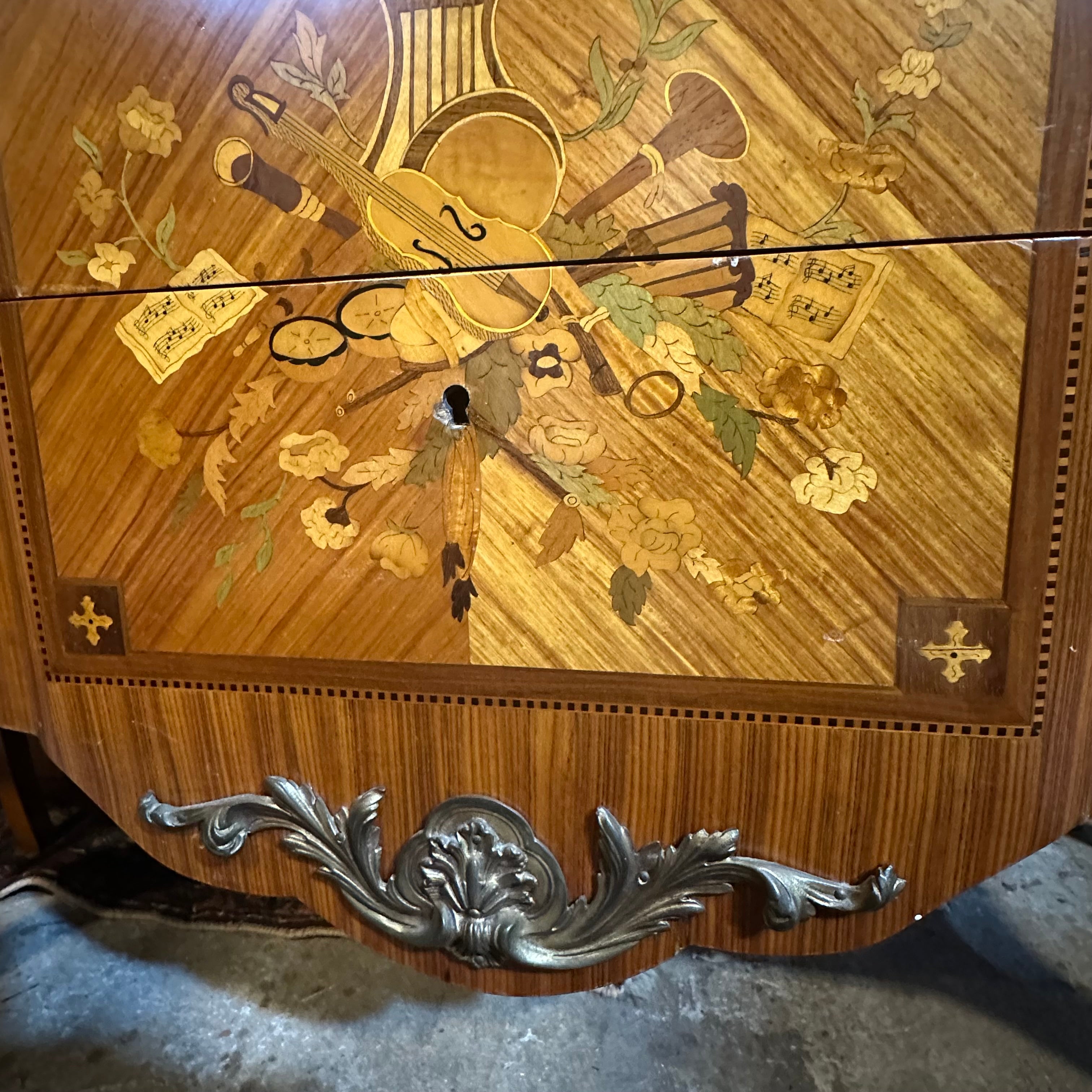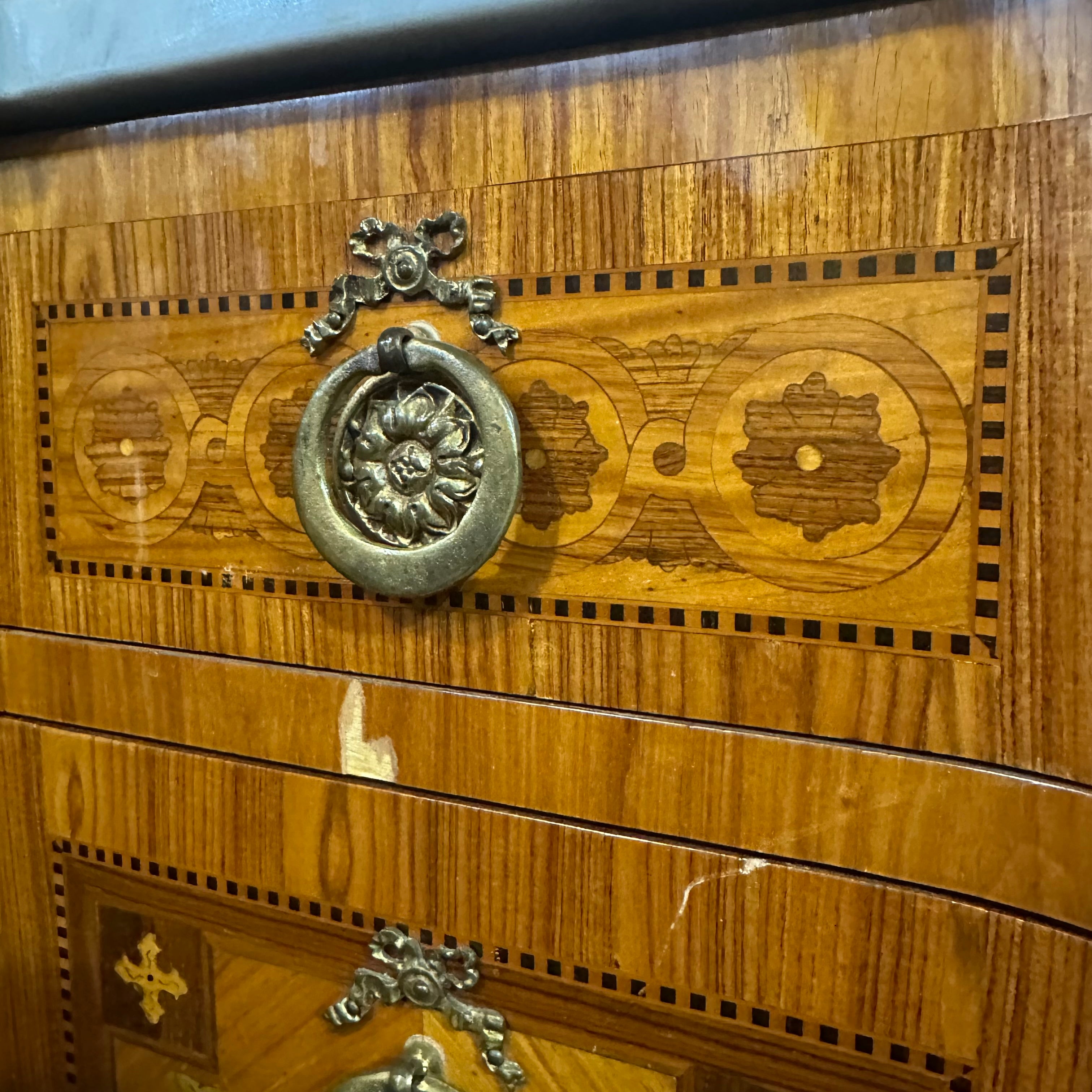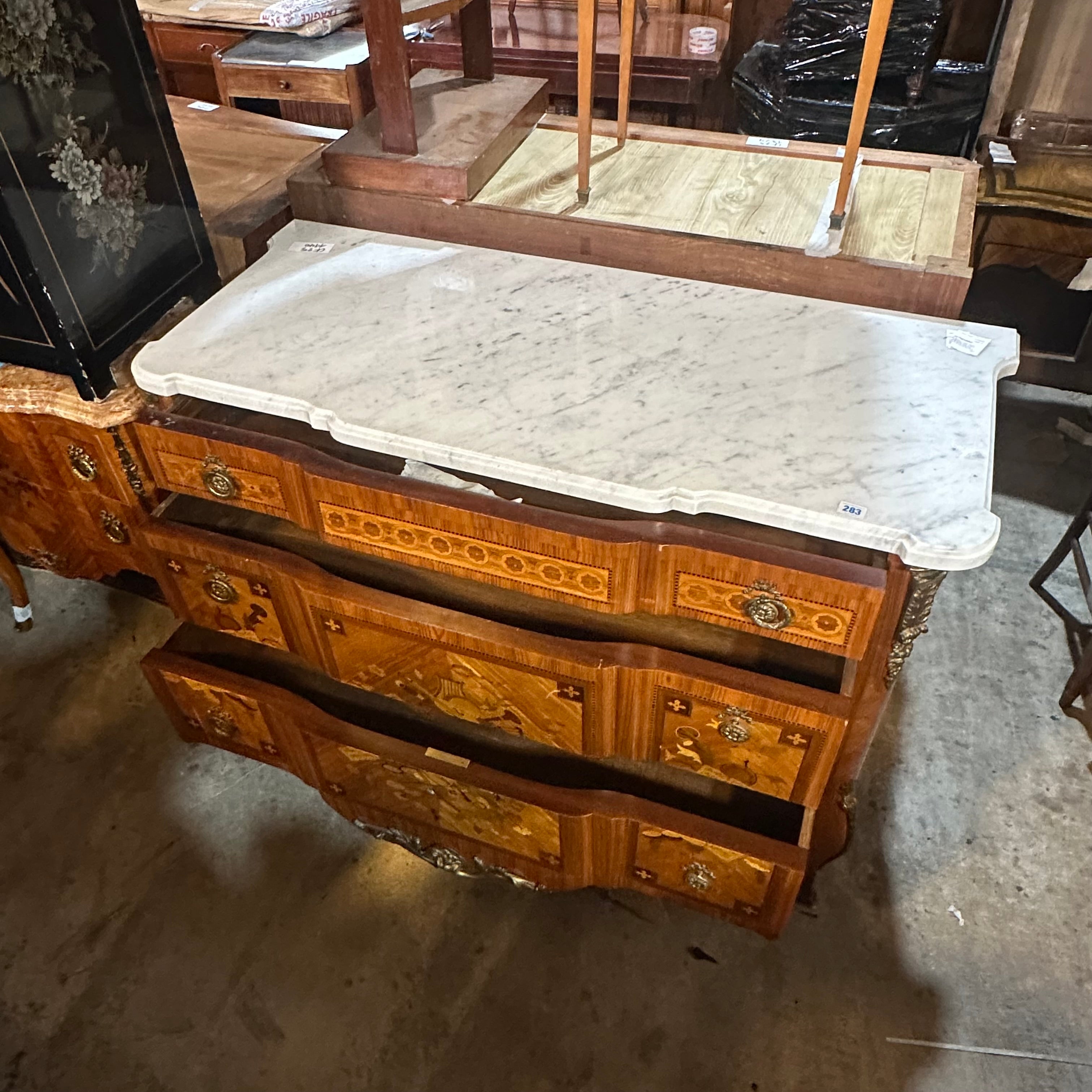 Elegante cómoda, de origen francés, hecha de madera enchapada en palo rosa y palo violeta, marquetería con carquois, instrumentos musicales y flores. La cómoda tiene también tiradores y aplicaciones en bronces dorados, y una cubierta de Mármol blanco de Carrere. Esta pieza está firmada por René Barde en la parte superior del mueble, indicando quién la construyó.