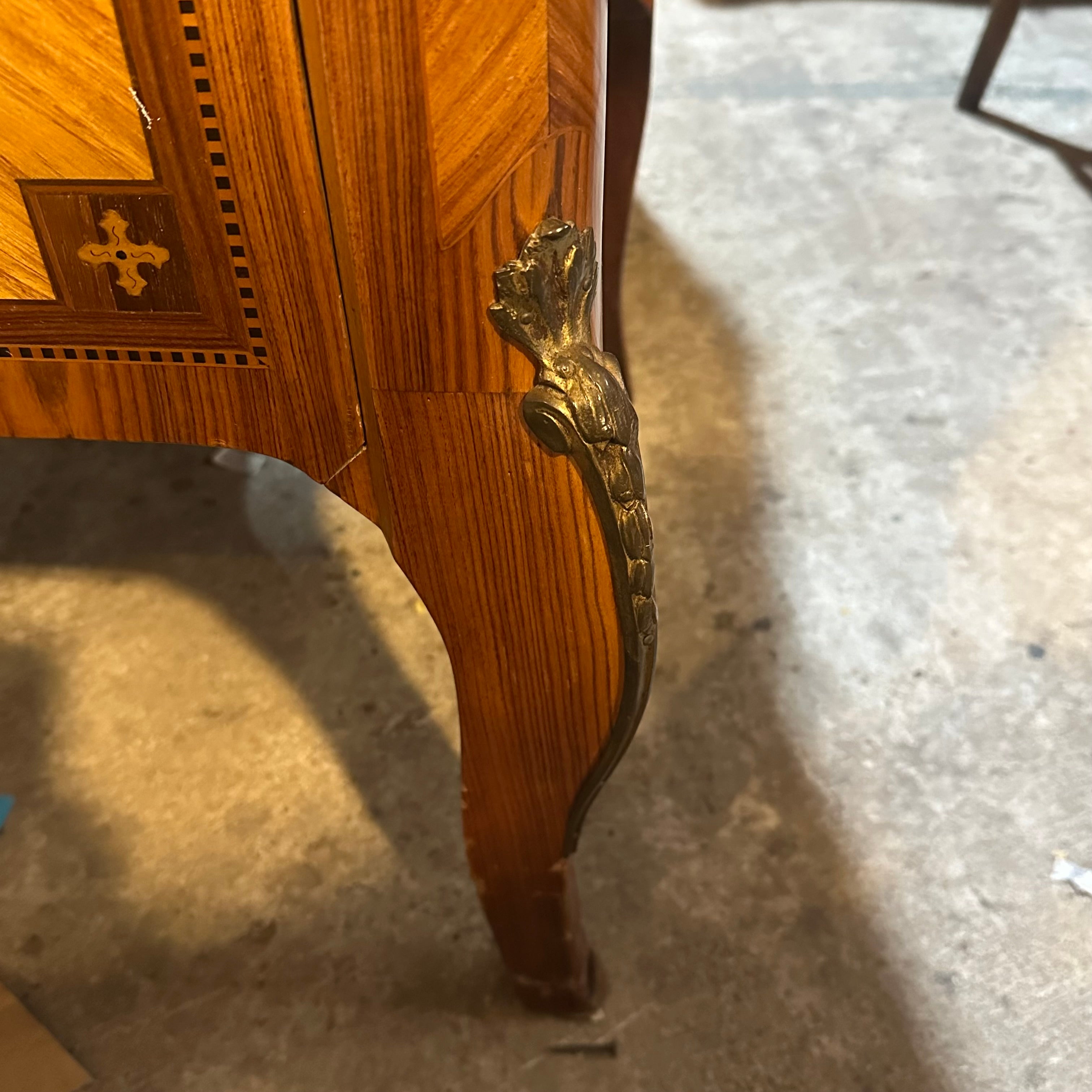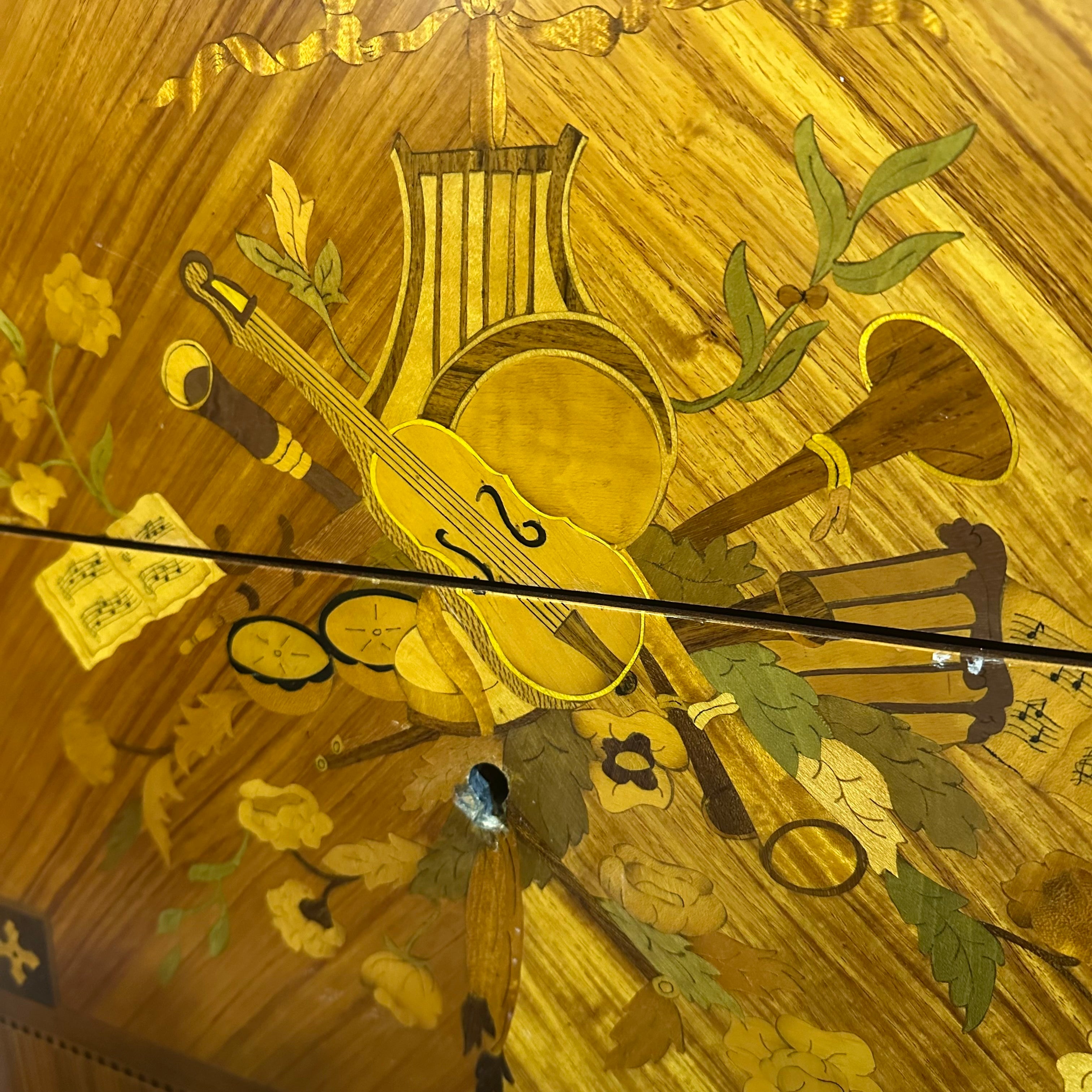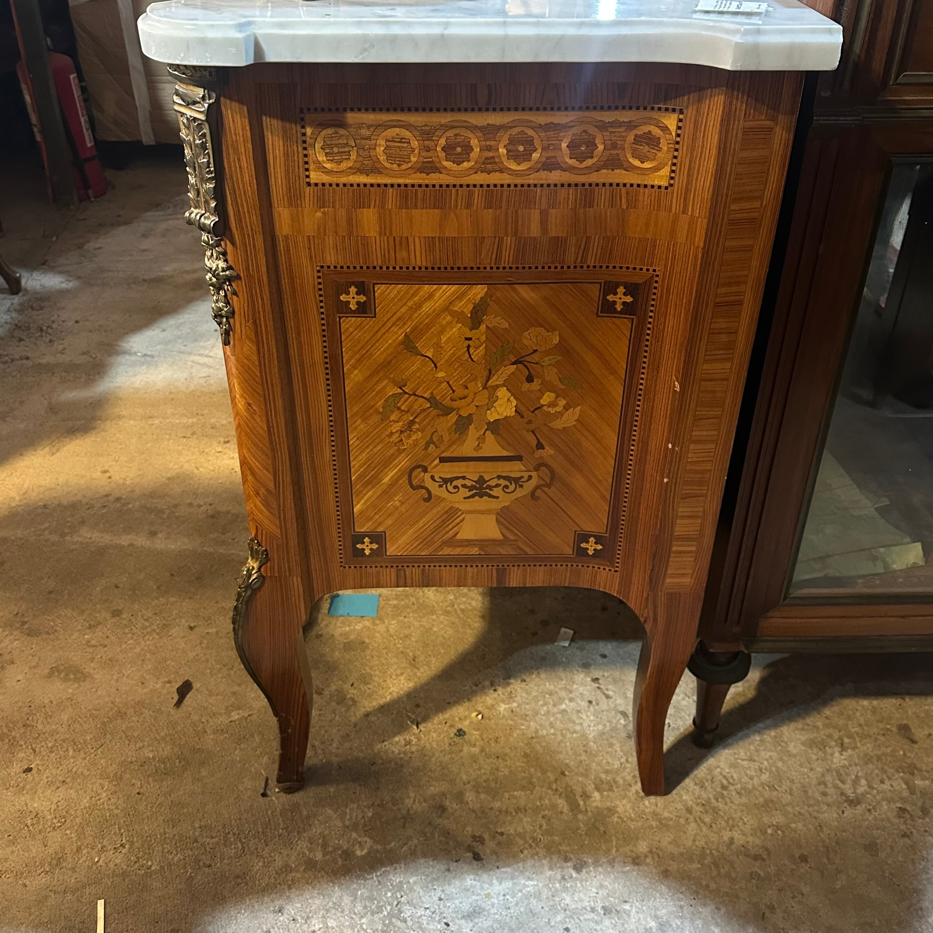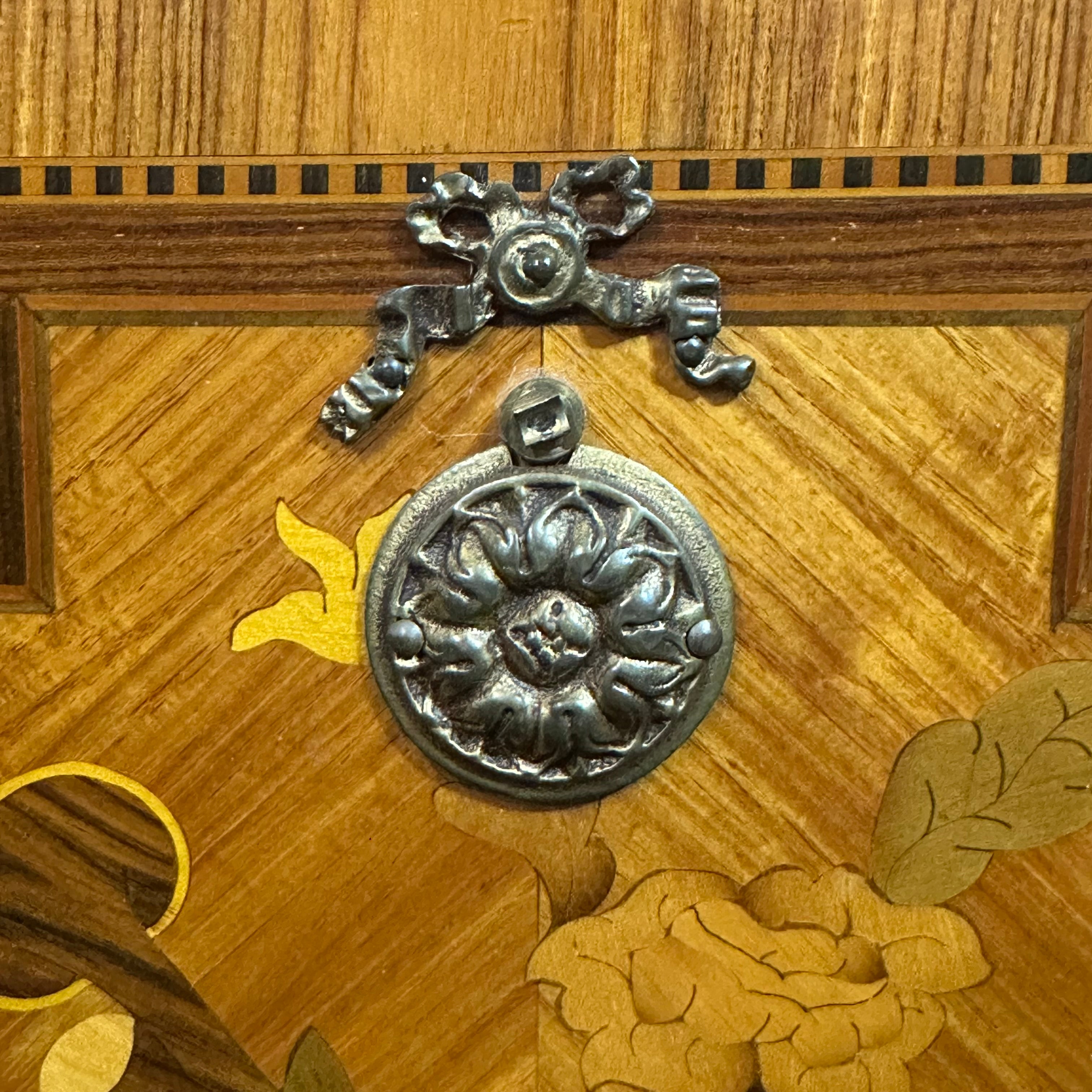 Elegante cómoda, de origen francés, hecha de madera enchapada en palo rosa y palo violeta, marquetería con carquois, instrumentos musicales y flores. La cómoda tiene también tiradores y aplicaciones en bronces dorados, y una cubierta de Mármol blanco de Carrere. Esta pieza está firmada por René Barde en la parte superior del mueble, indicando quién la construyó.
