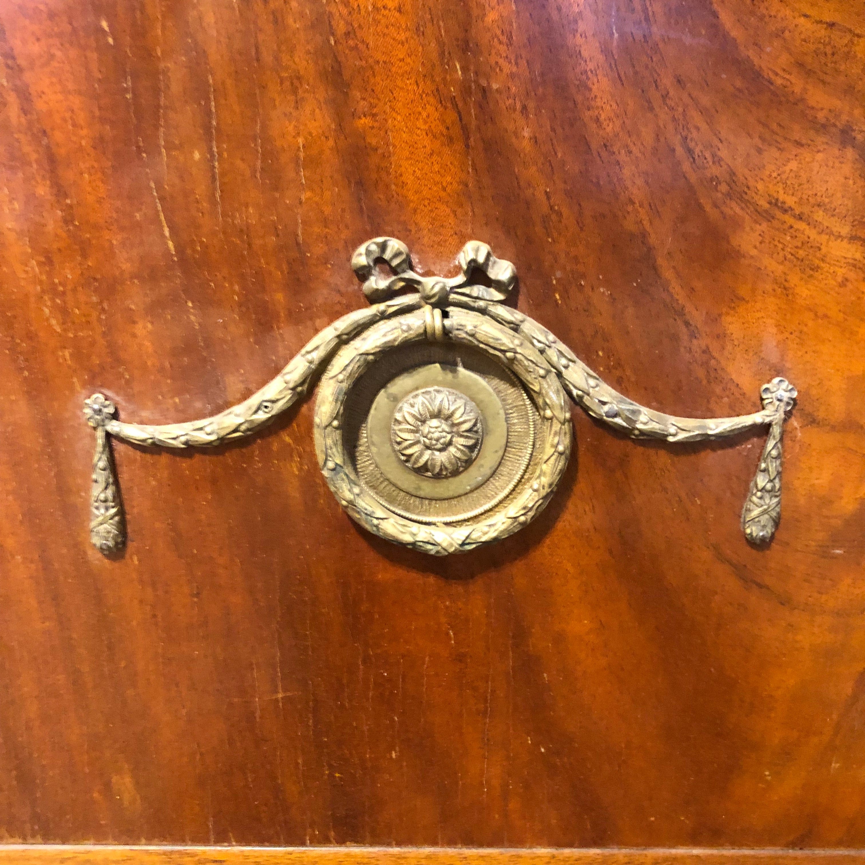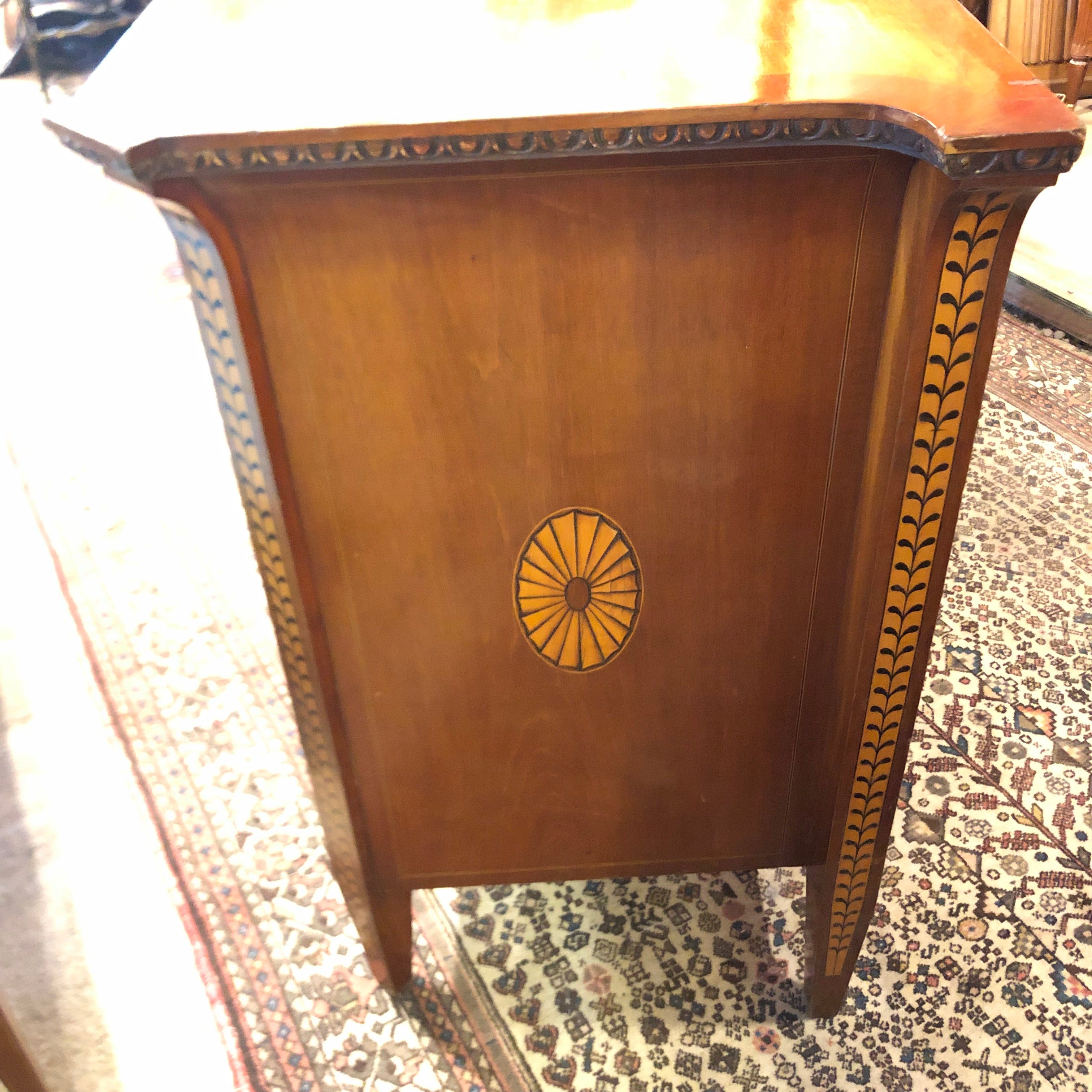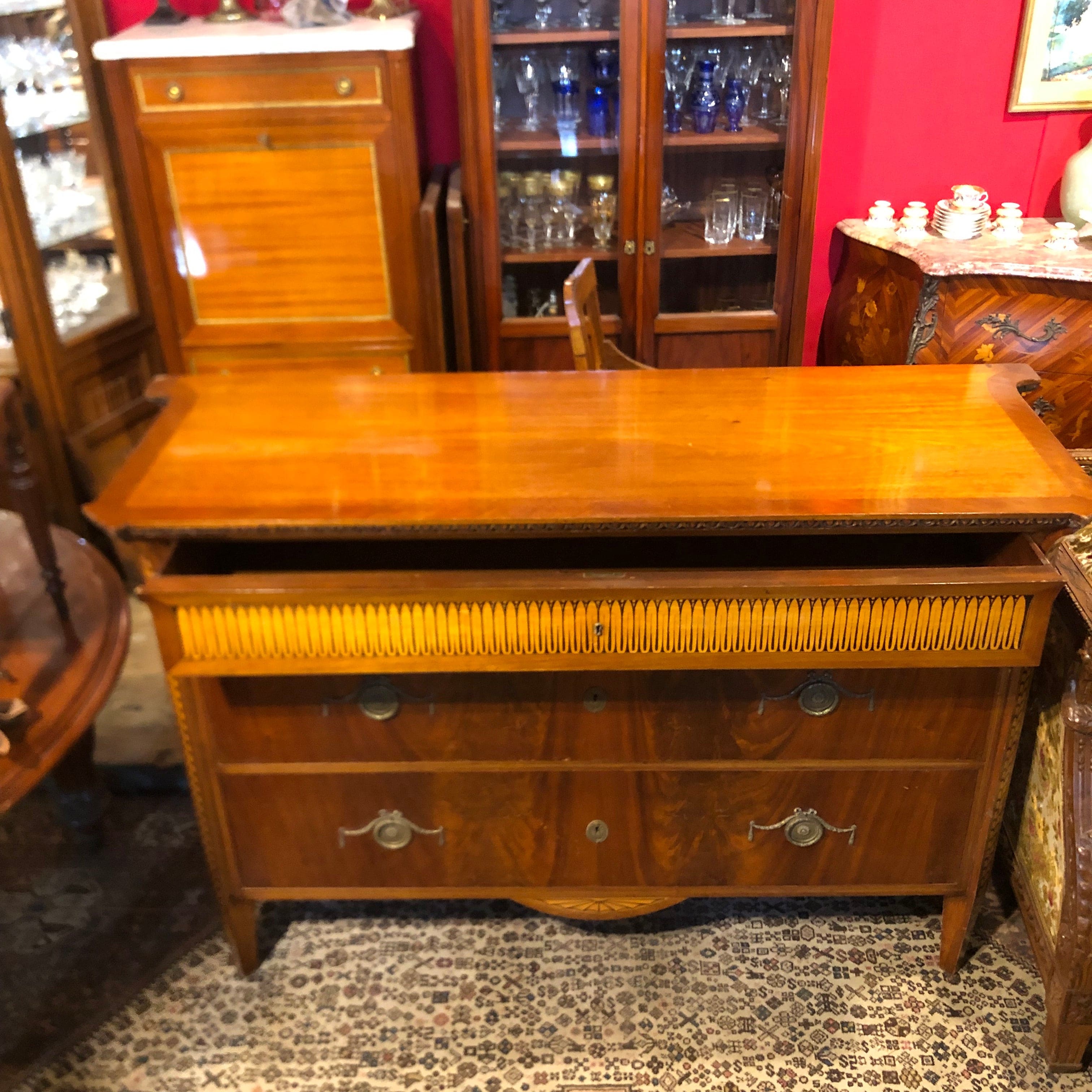 Hermosa y gran cómoda francesa estilo Carlos IV, con marqueteria, tres cajoneras principales y un cajón en la superficie alta, todos con tiradores de bronce.