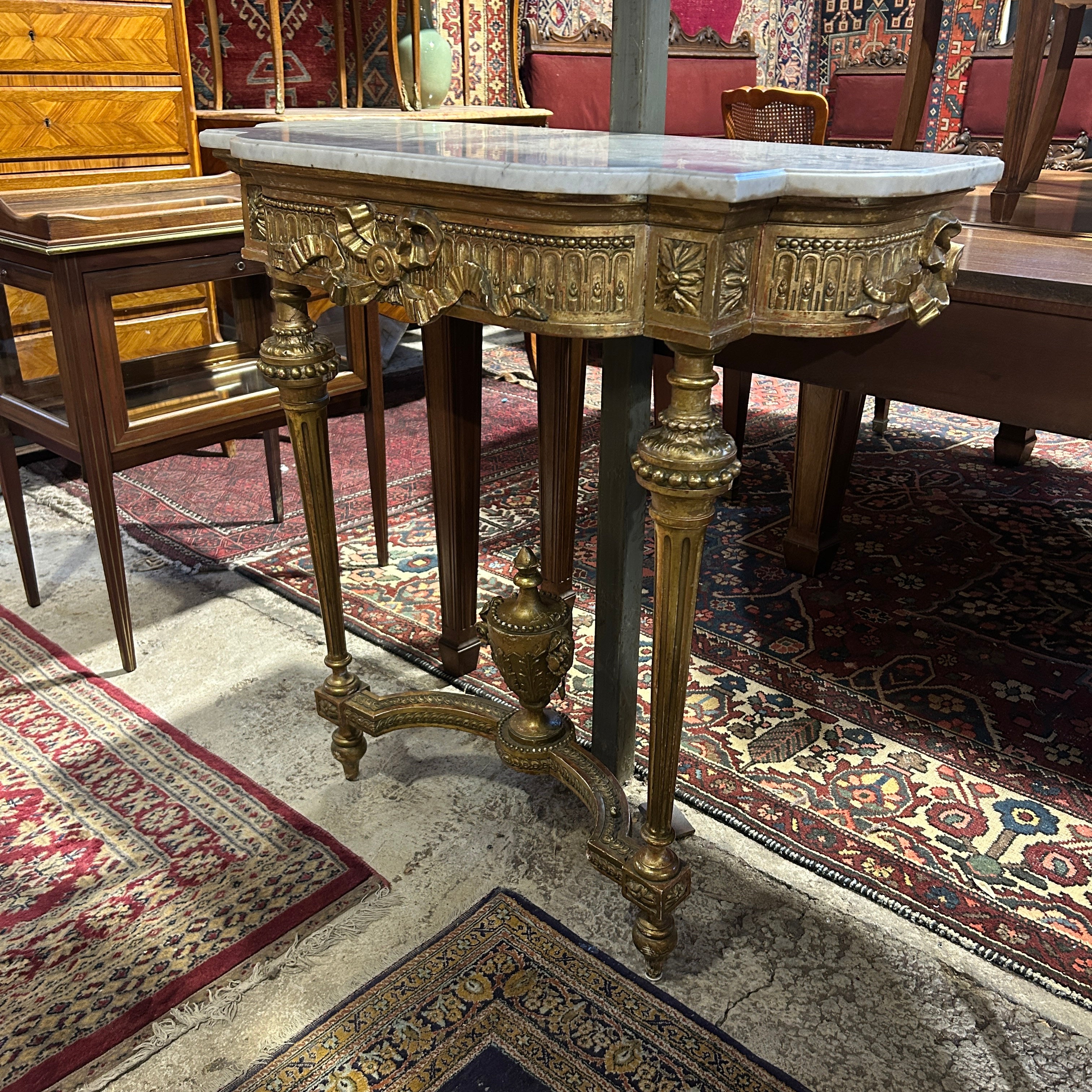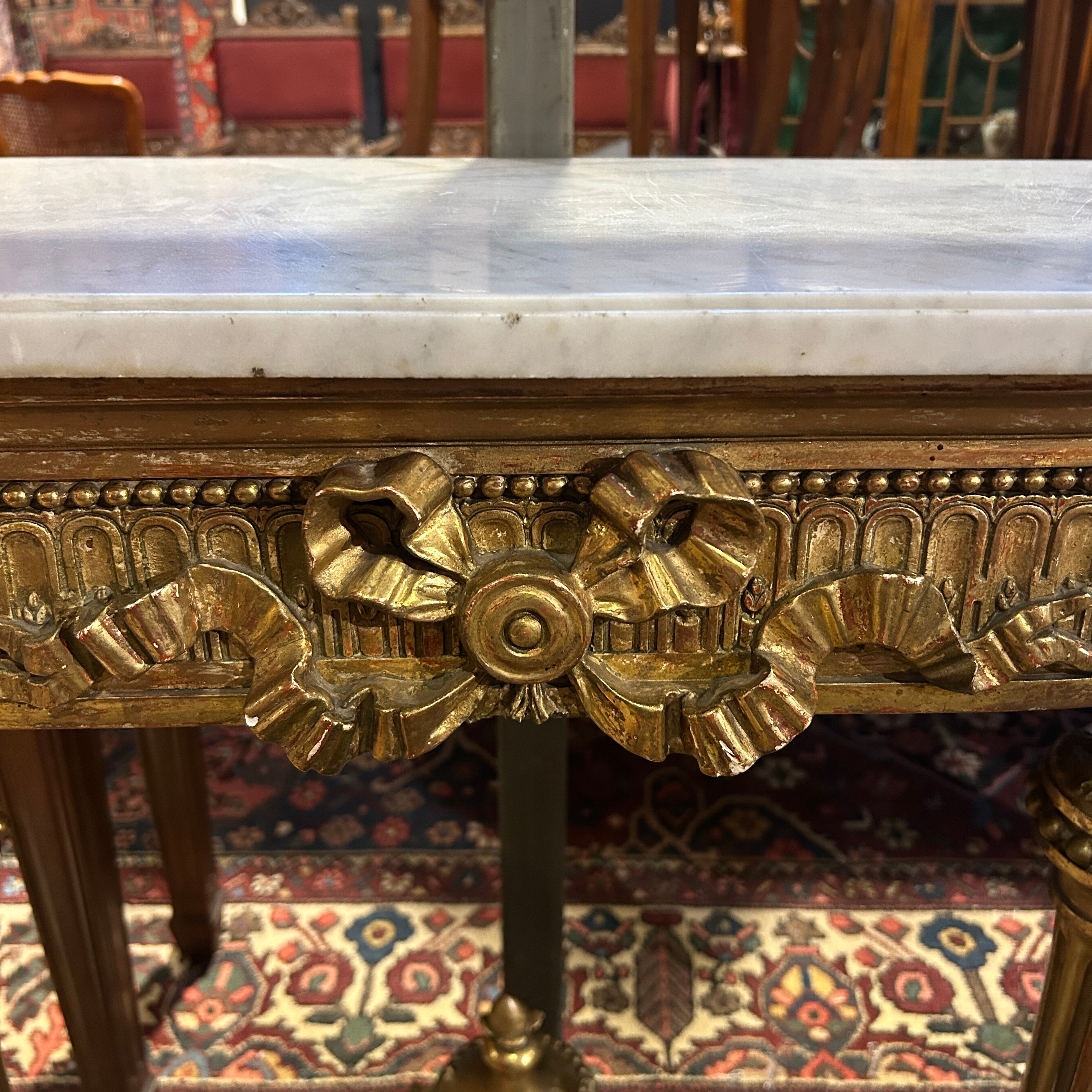 El arrimo tiene hermosos tallados en madera, todo en dorados a fuego. Tiene extraordinarios movimientos con cordones perlé, imponentes cintillos en los tres costados y un sin fin de detallitos, en su cubierta un mármol original blanco.