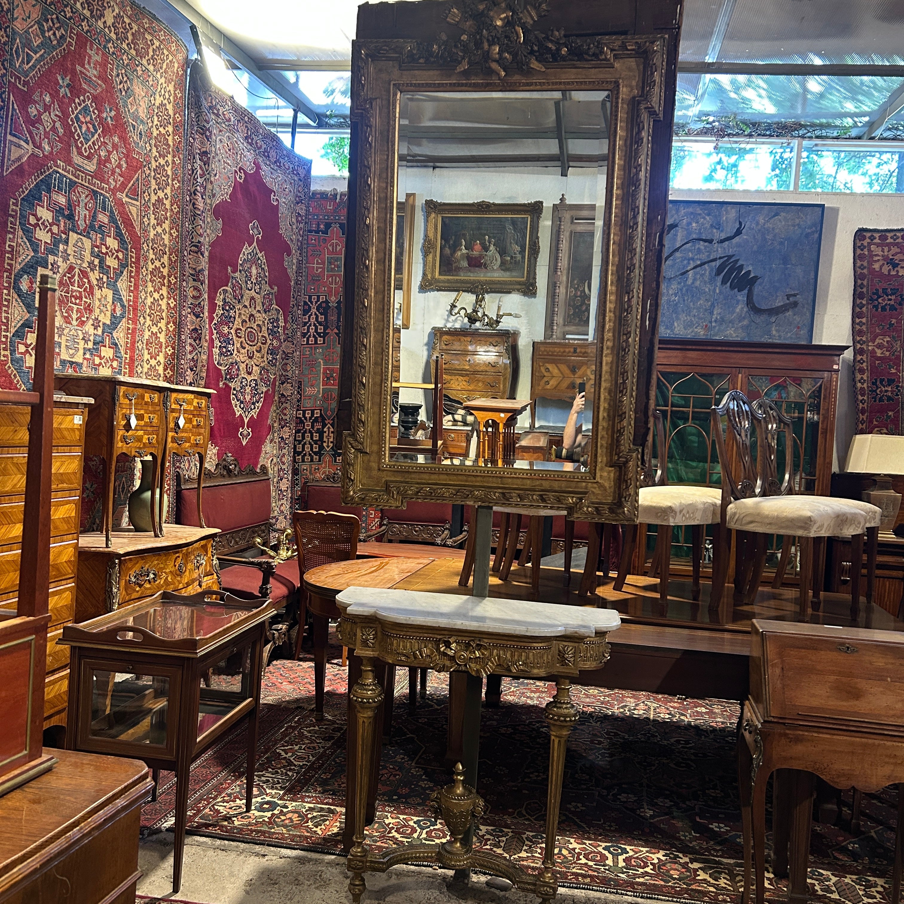 El espejo estilo Luis XVI, con finos tallados en madera. Tiene bellas olas talladas en relieve en su arco interior. Es un espejo original con doble vicelado, de 3cm y 3mm, en forma rectangular y con una imponente coronación con un ángel cupido tallado de 30cm de alto 50cm en la parte superior del espejo.