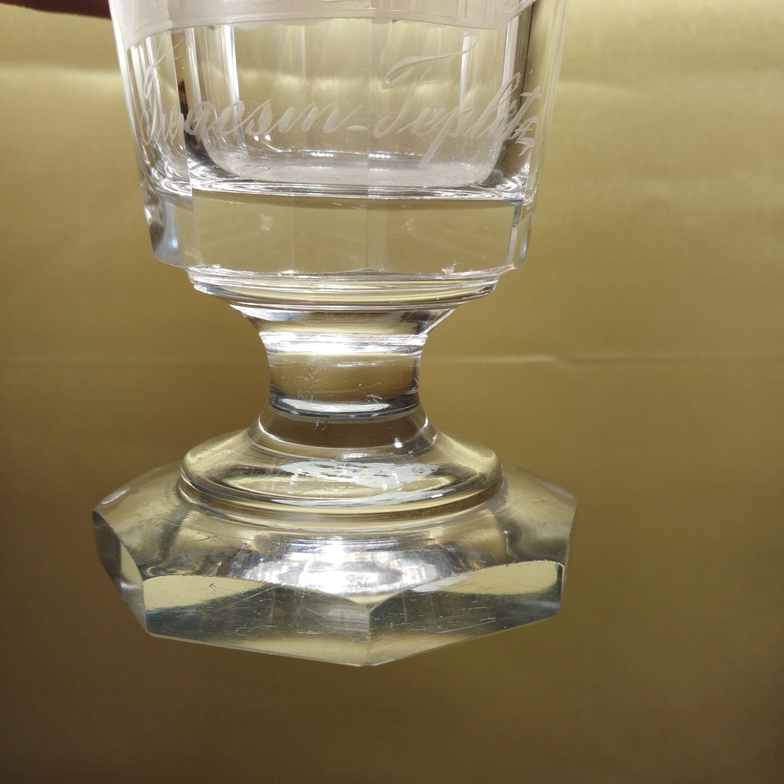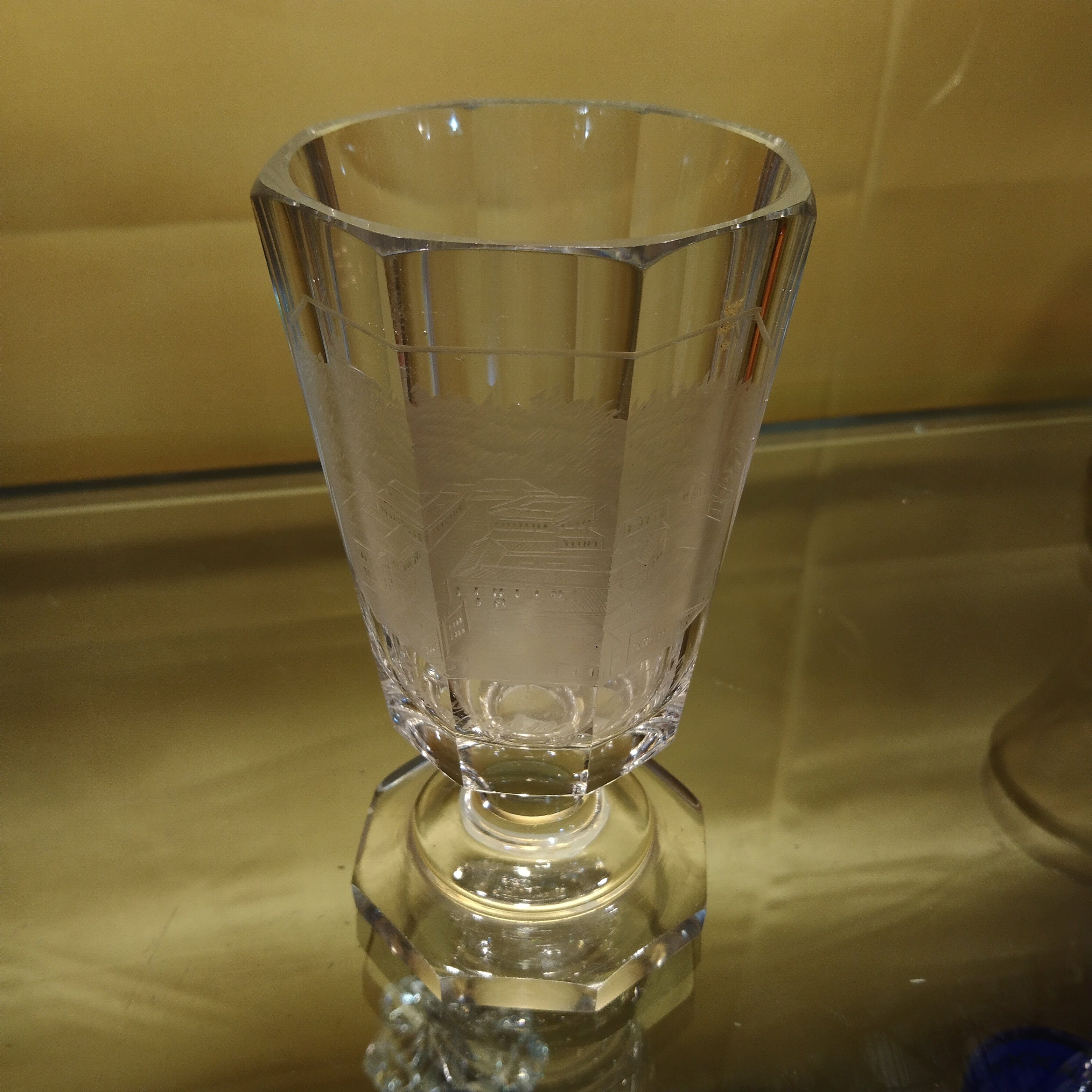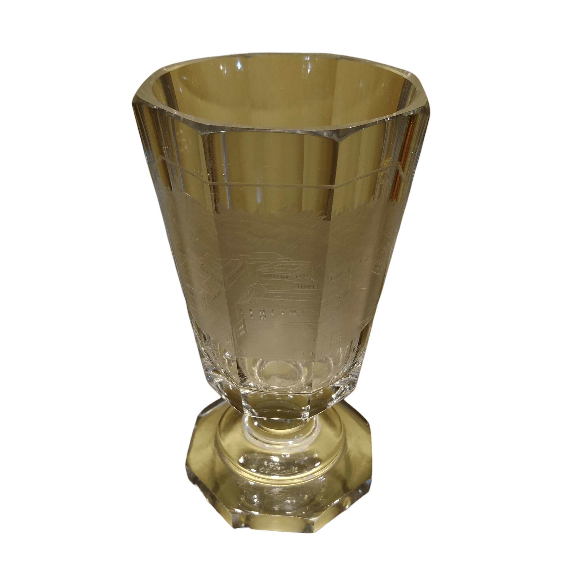 Bella copa de vidrio tratado con un sutil tallado con el paisaje de un pueblo rodeado de un bosque.