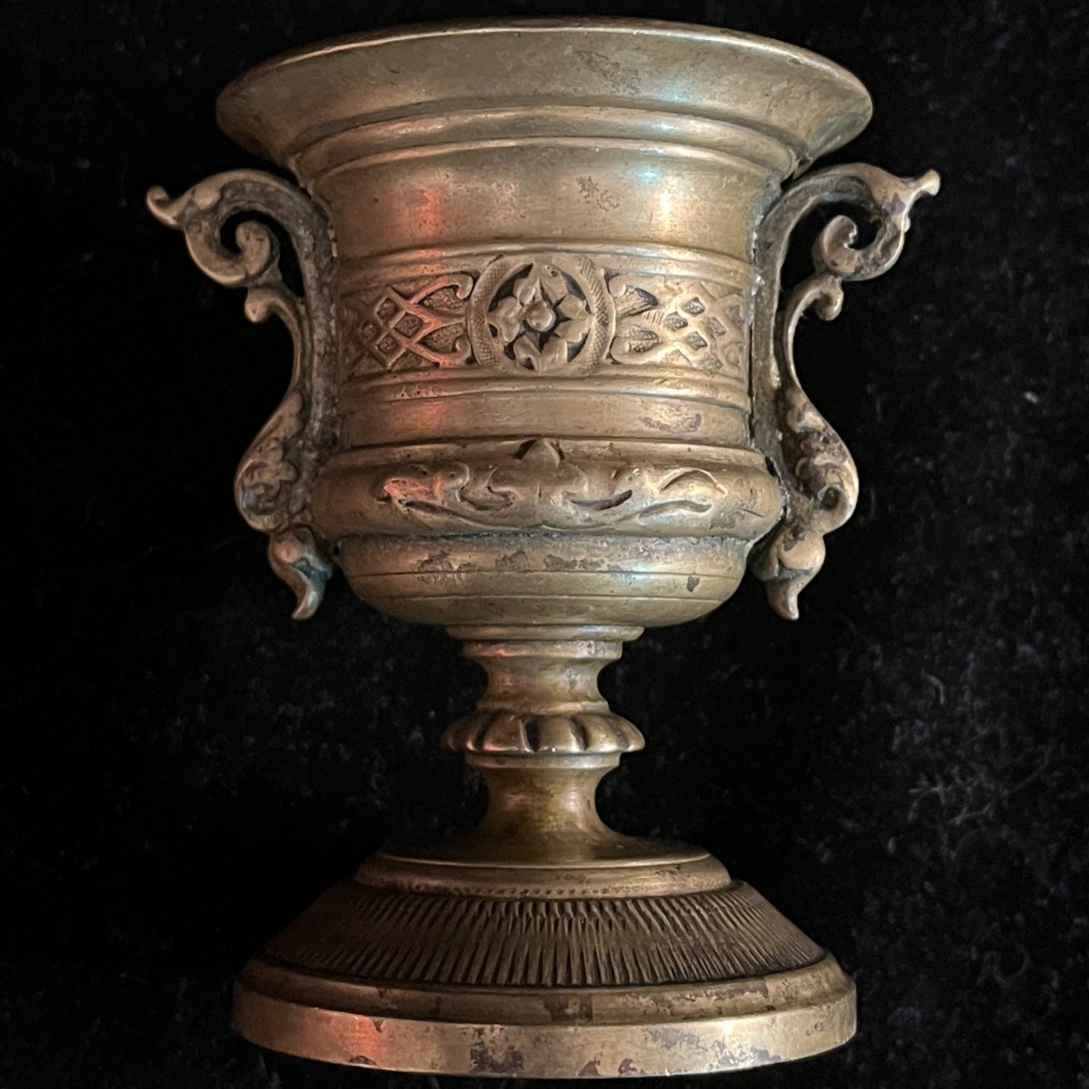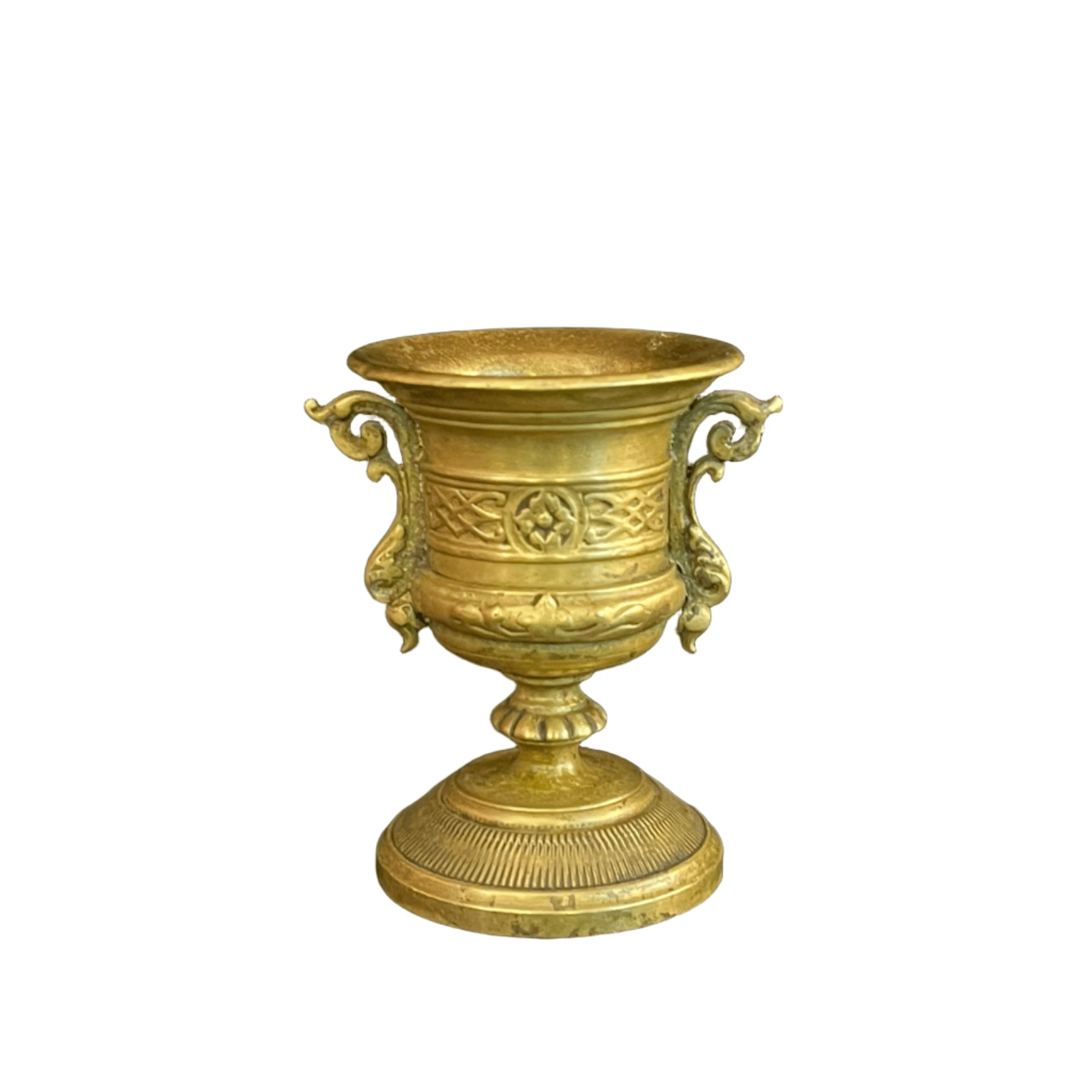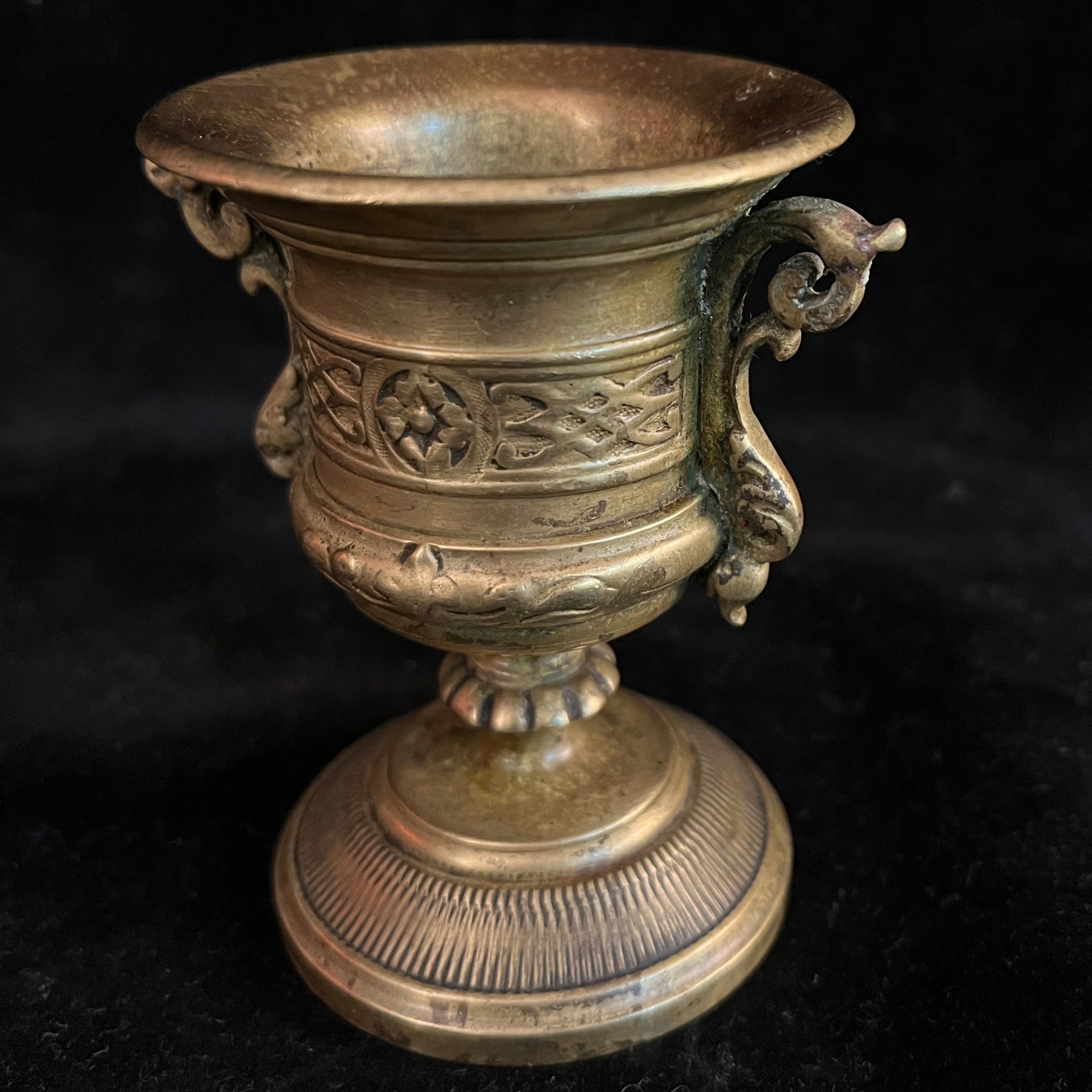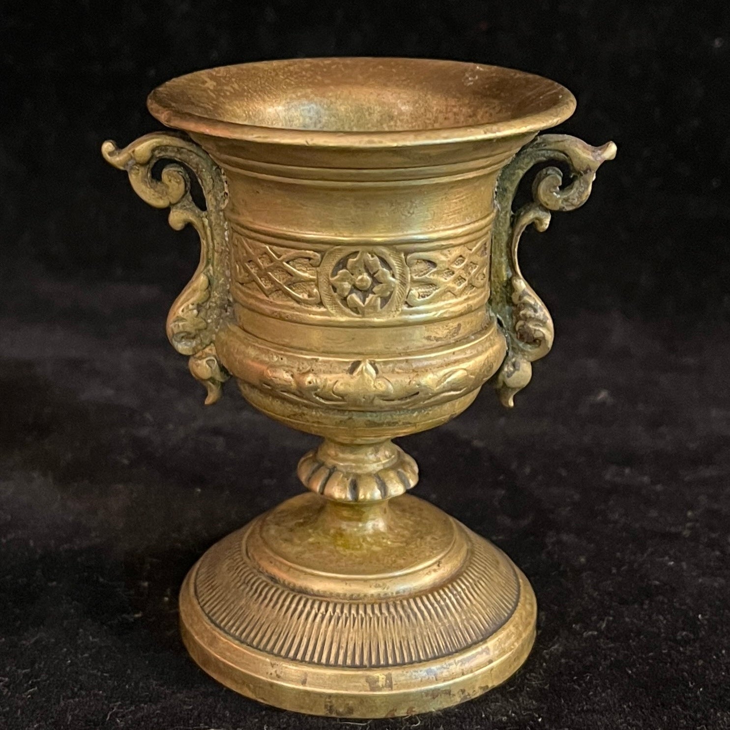 Bella copa decorativa en bronce de origen francés, decorada en relieve con un elegante y clásico diseño. Se puede utilizar como pieza decorativa y también para exhibir flores pequeñas.