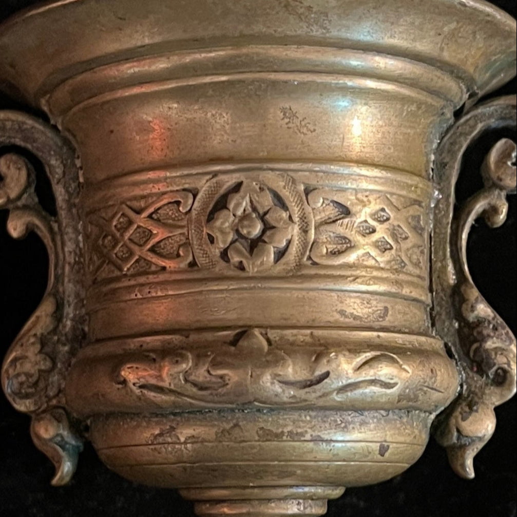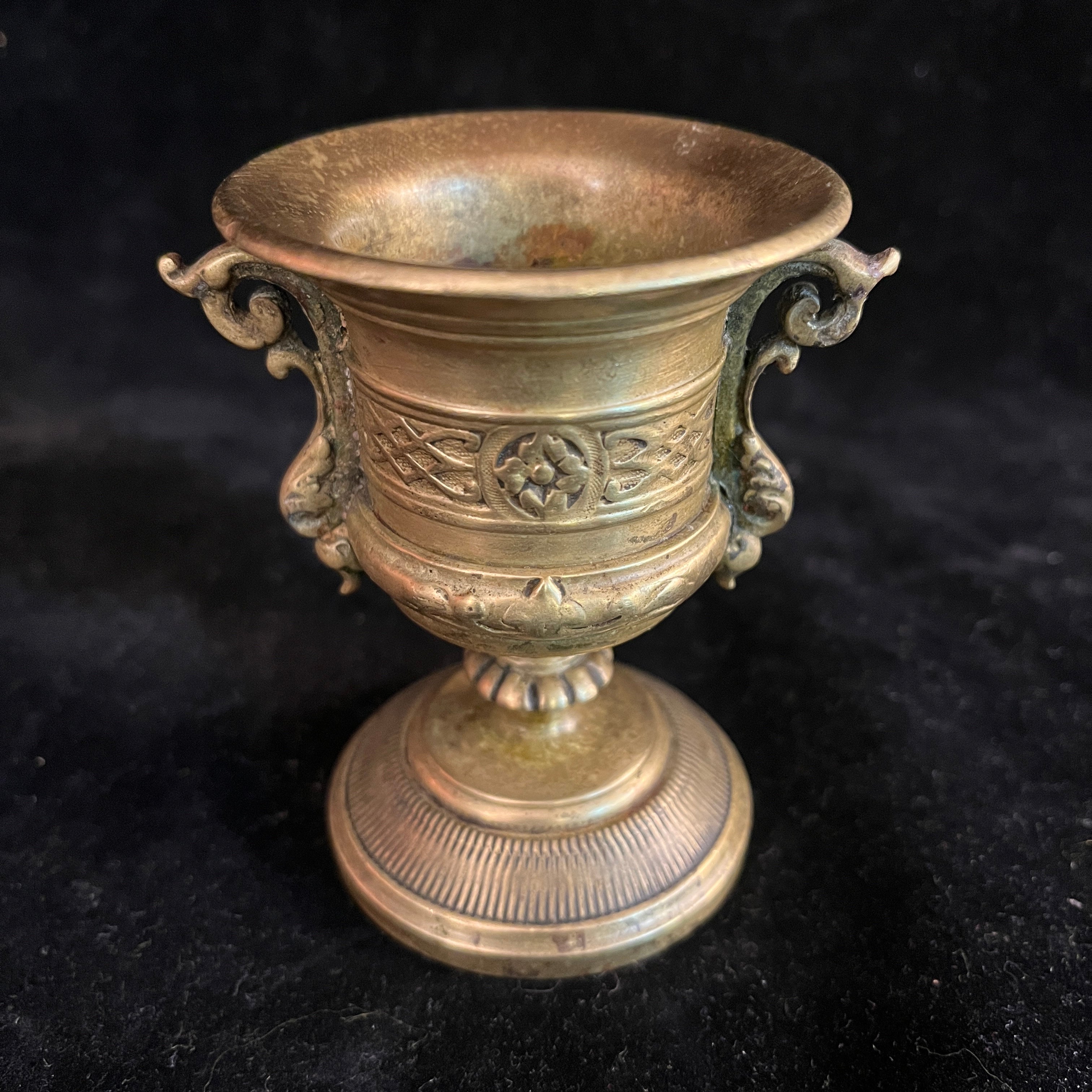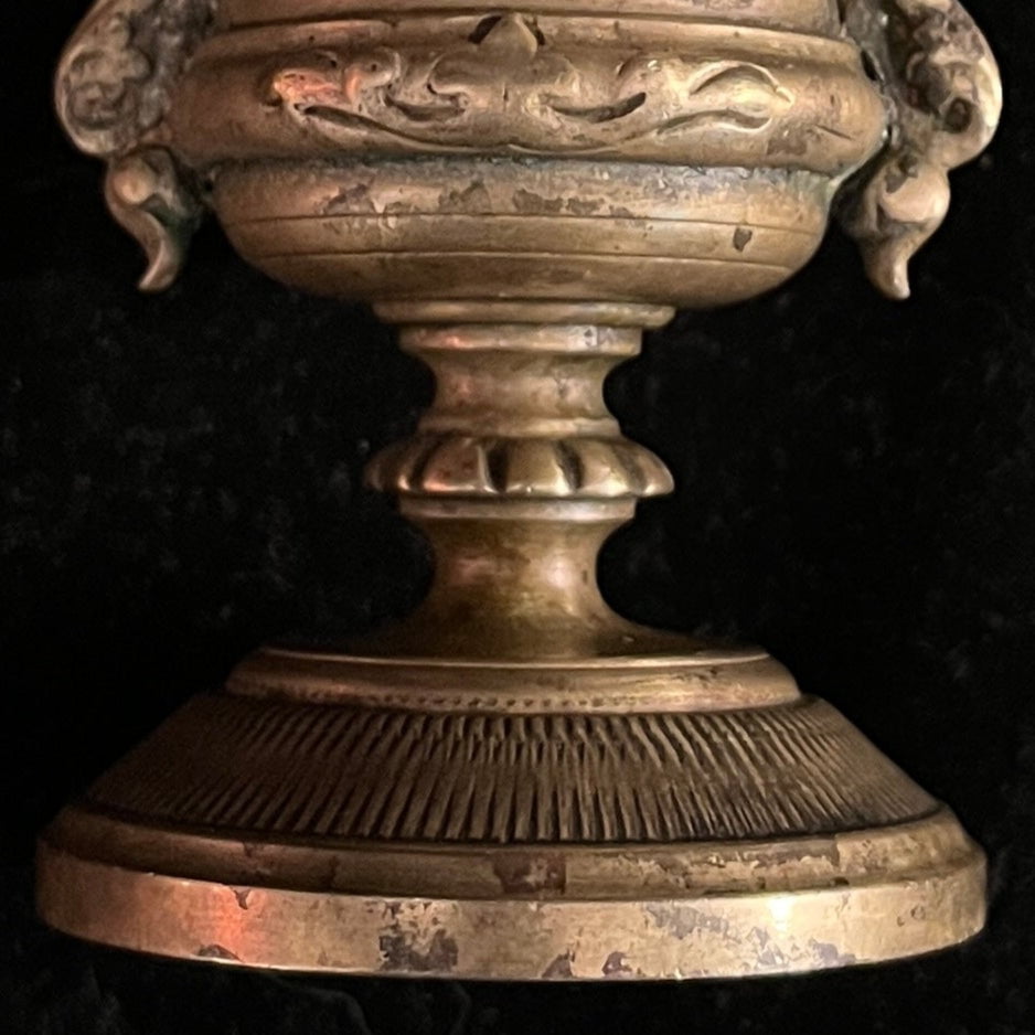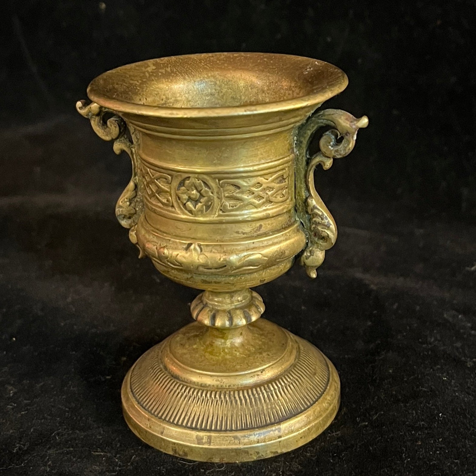 Bella copa decorativa en bronce de origen francés, decorada en relieve con un elegante y clásico diseño. Se puede utilizar como pieza decorativa y también para exhibir flores pequeñas.