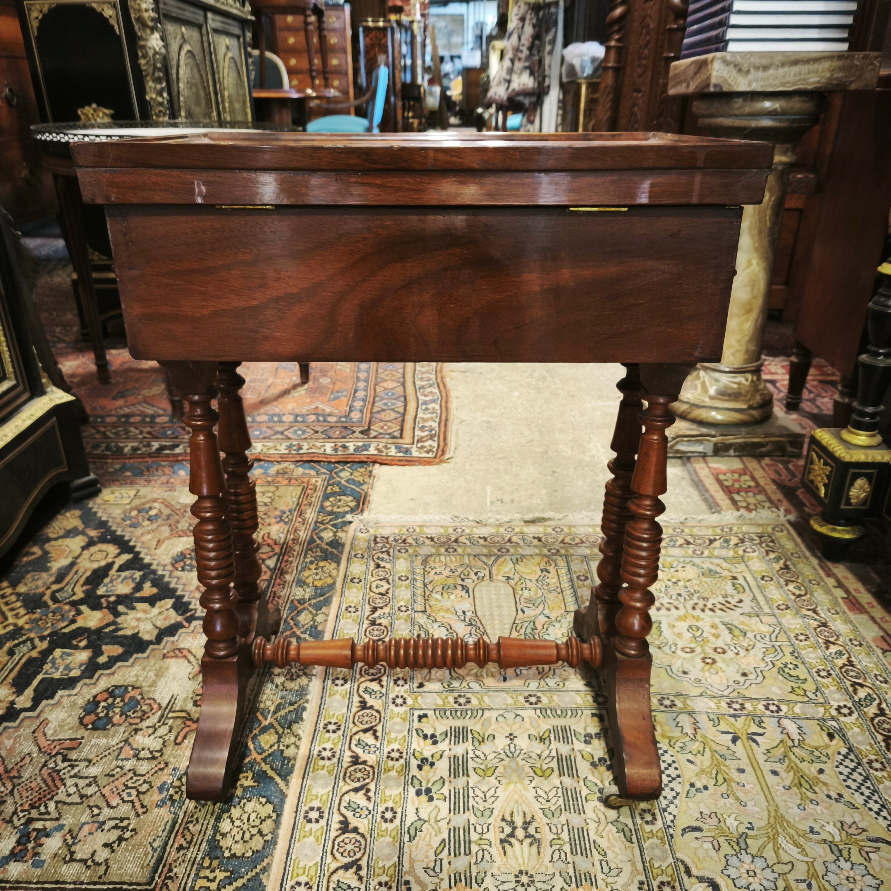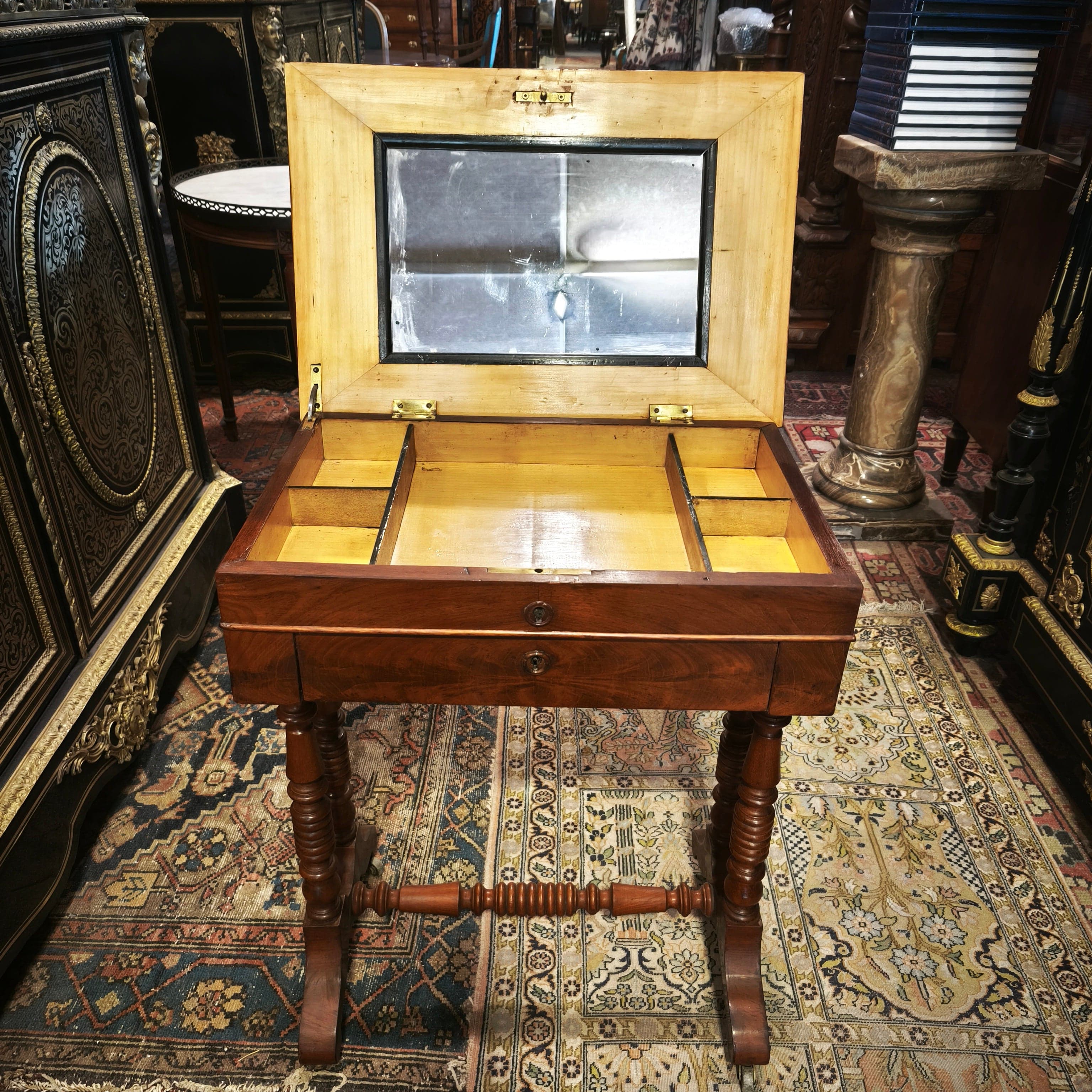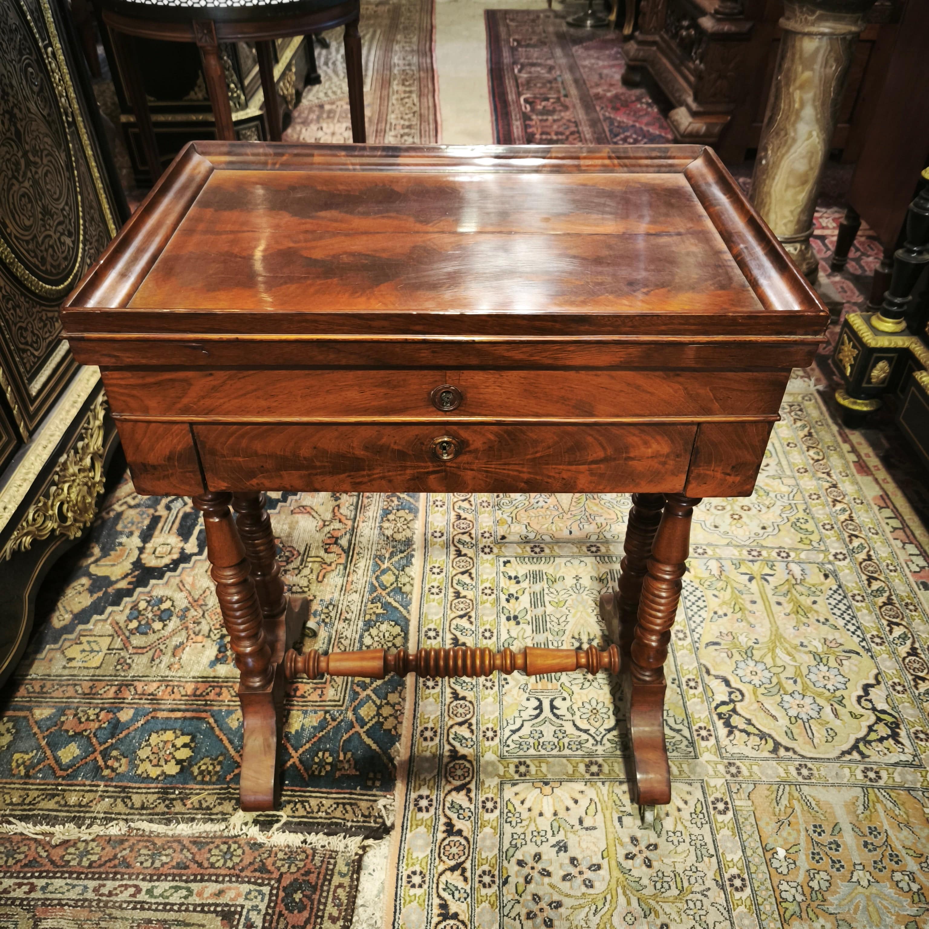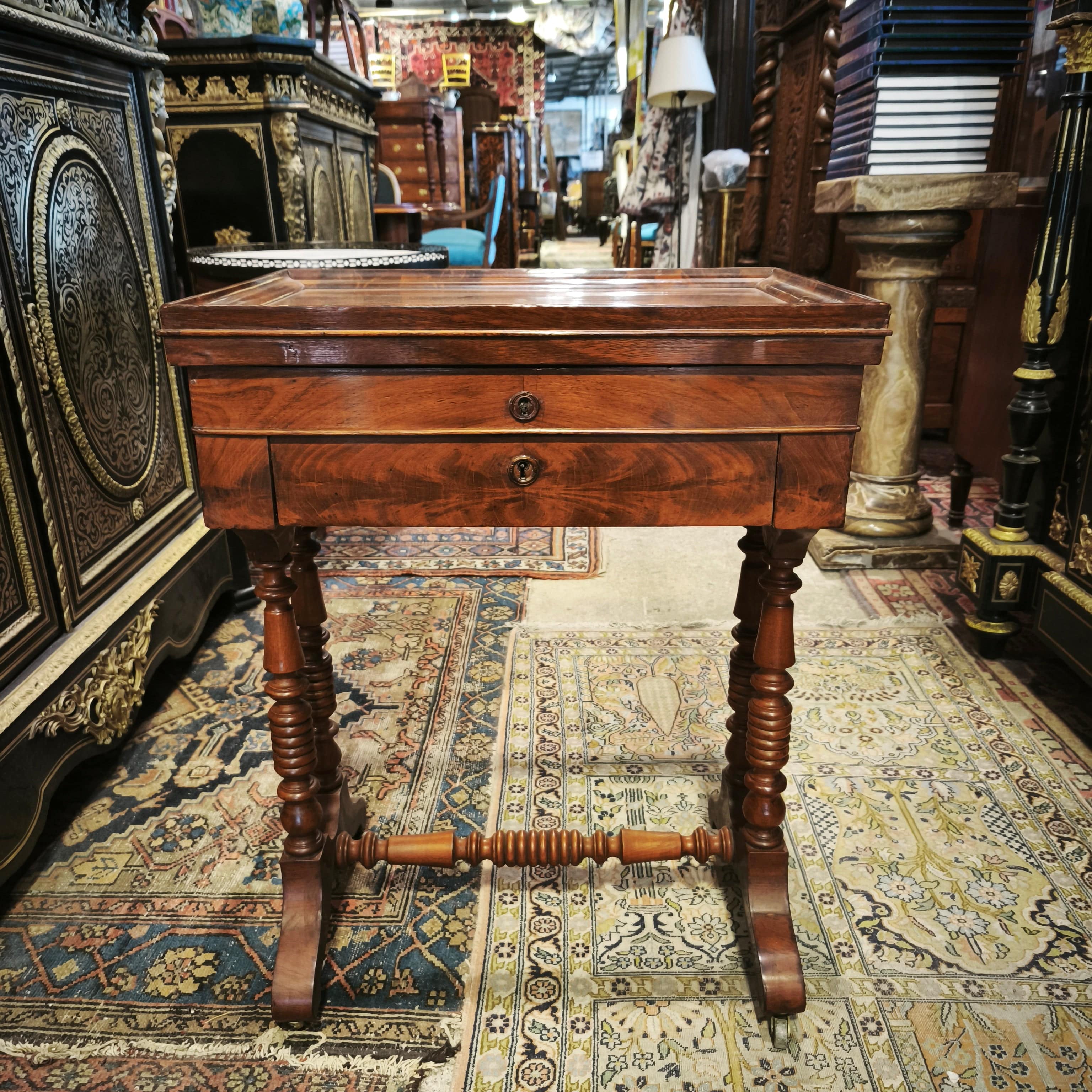 Linda mesita costurero peinador Francés con rueditas y un cajoncito. De caoba y raíz de caoba y erable al interior. Travesaño y patas torneadas.