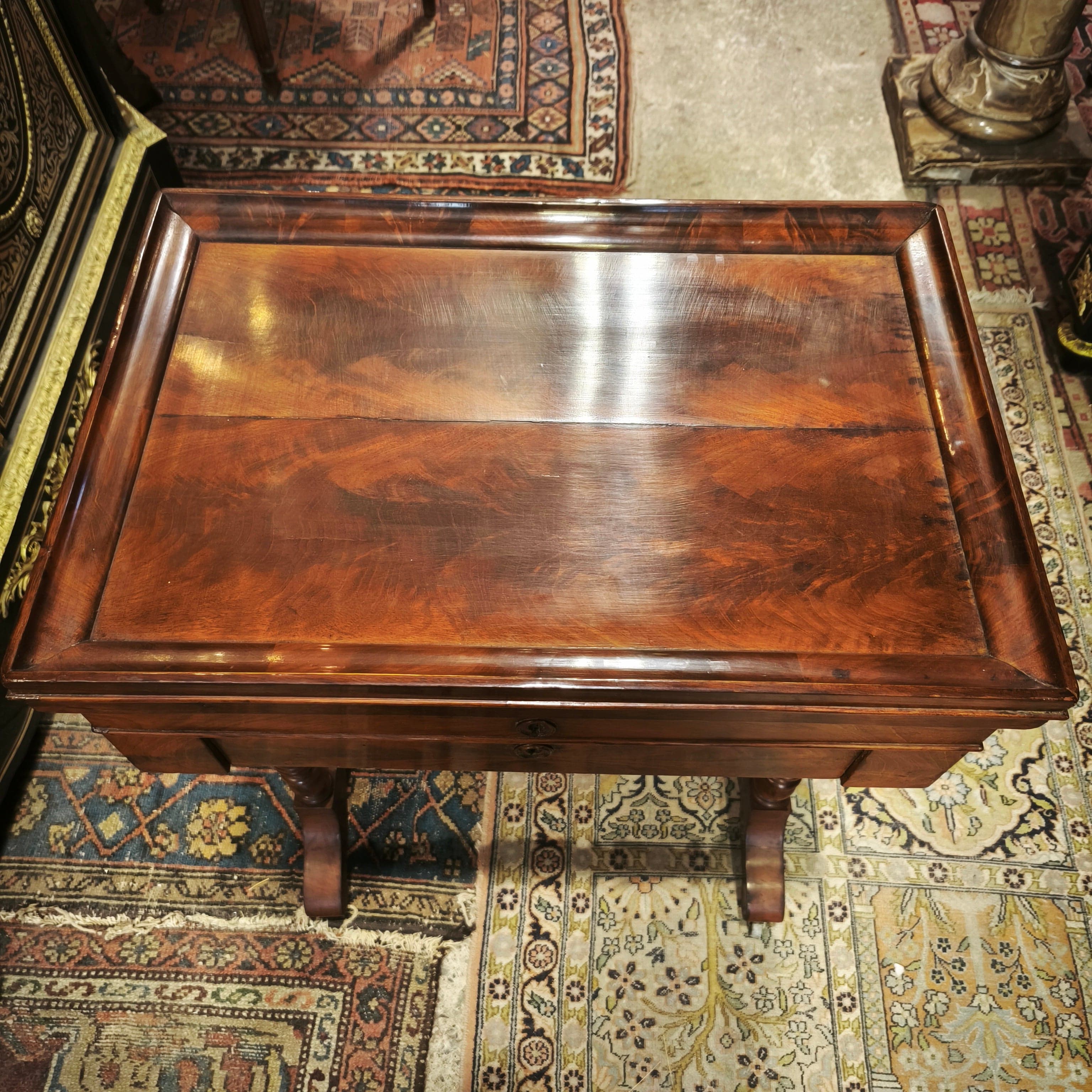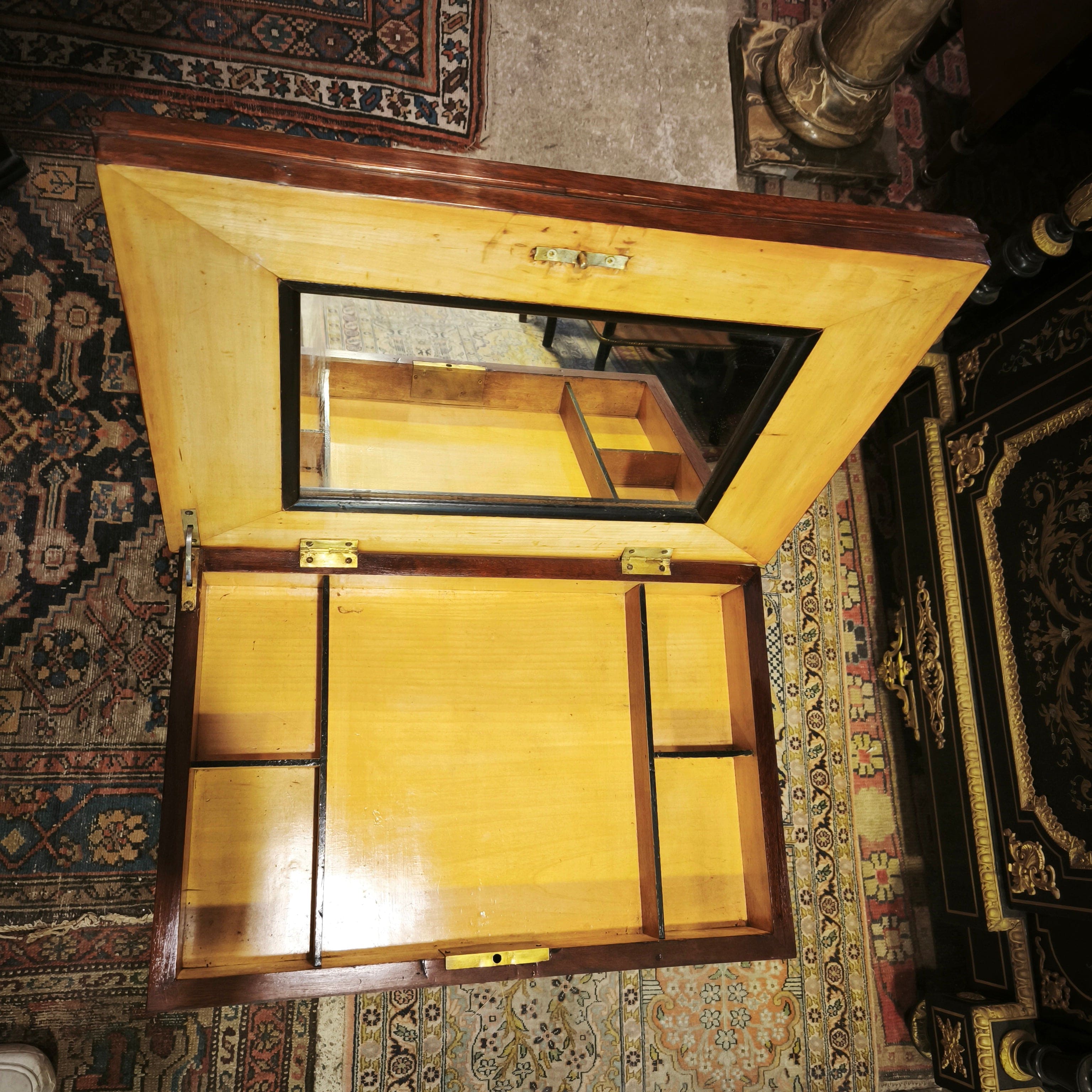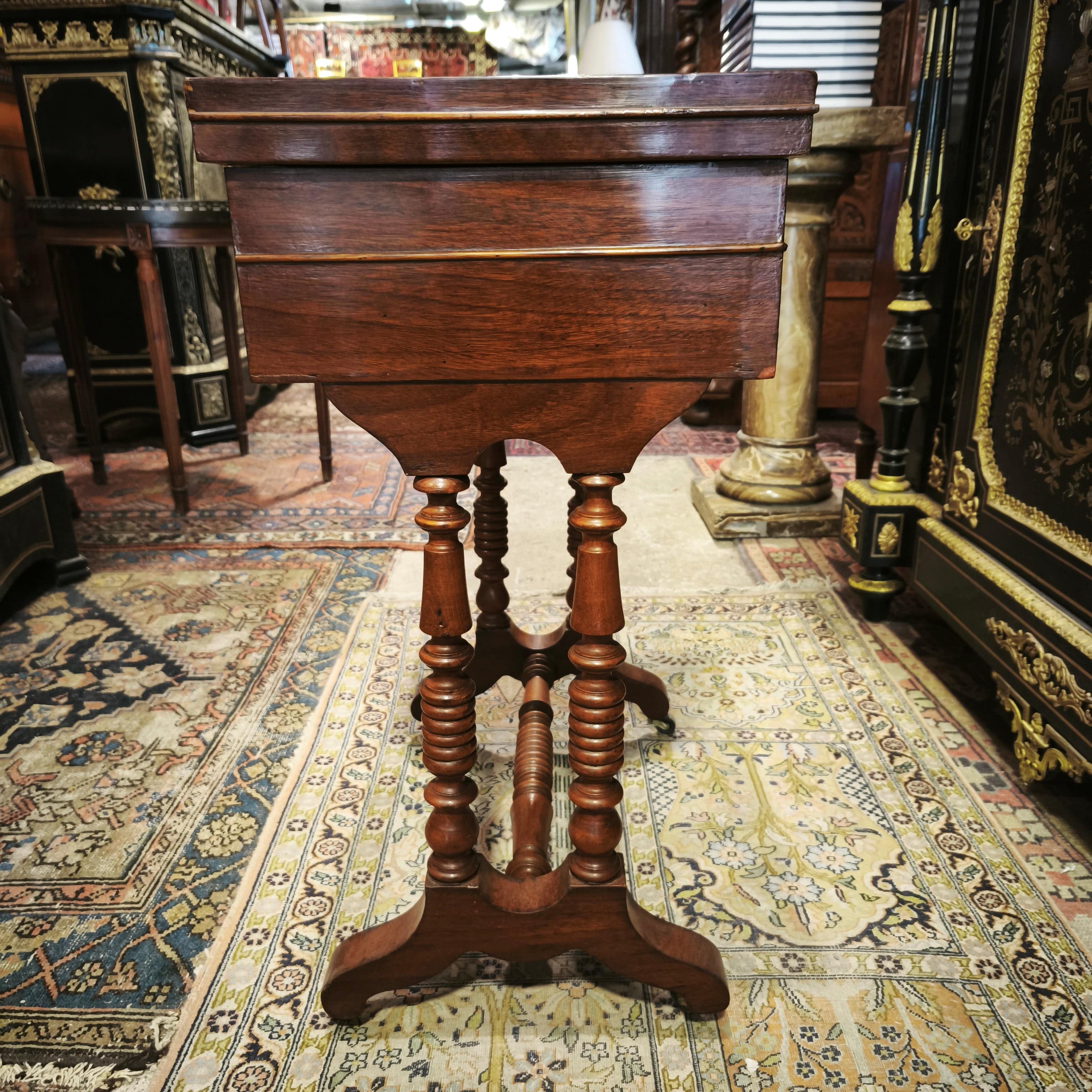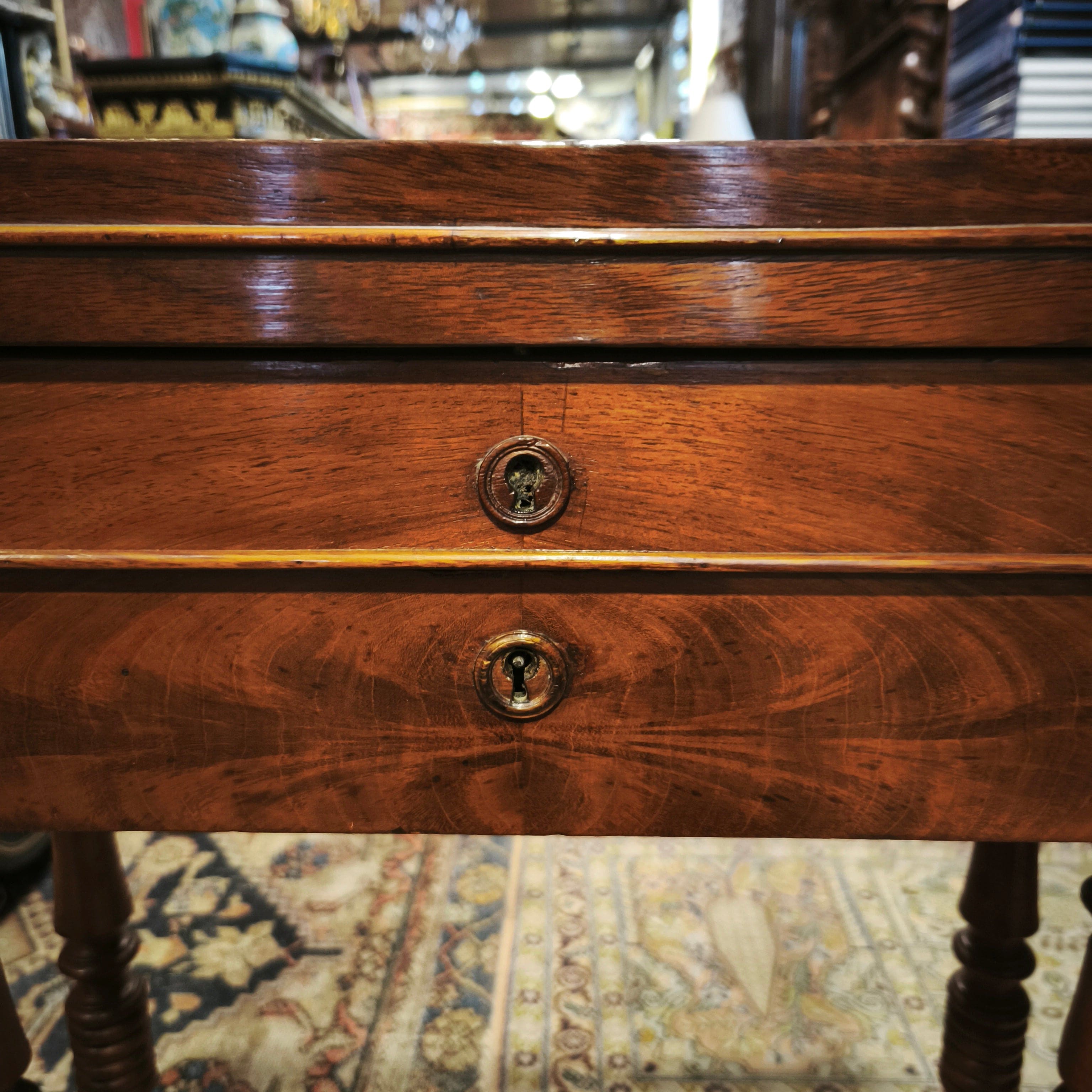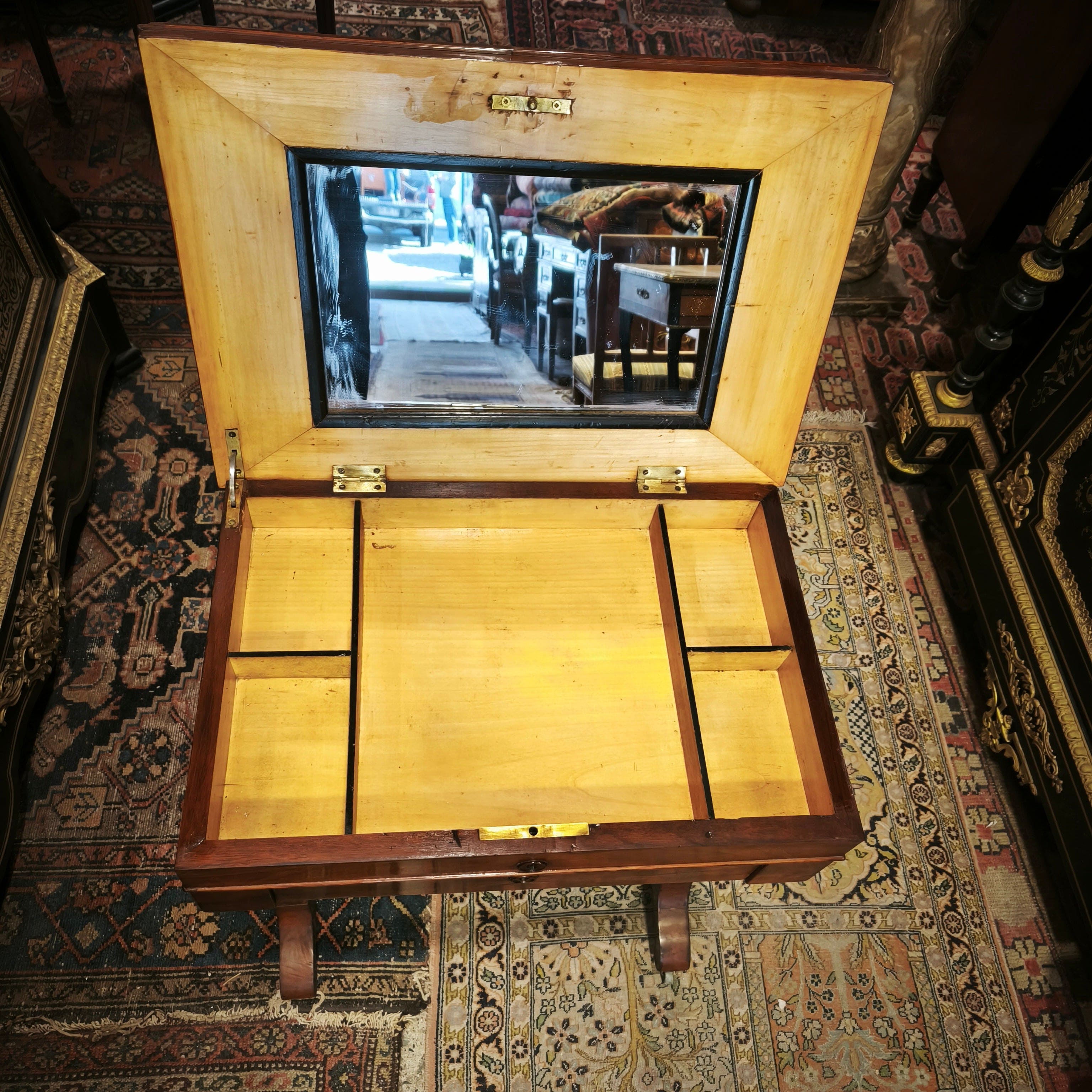 Linda mesita costurero peinador Francés con rueditas y un cajoncito. De caoba y raíz de caoba y erable al interior. Travesaño y patas torneadas.