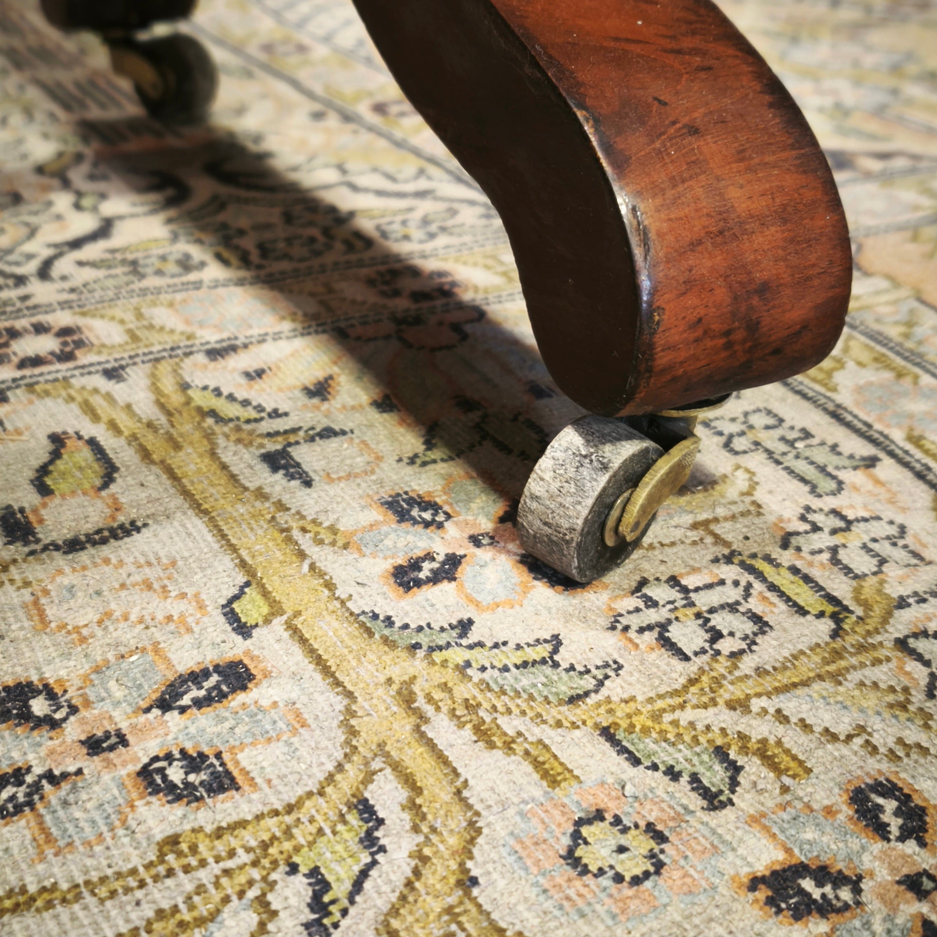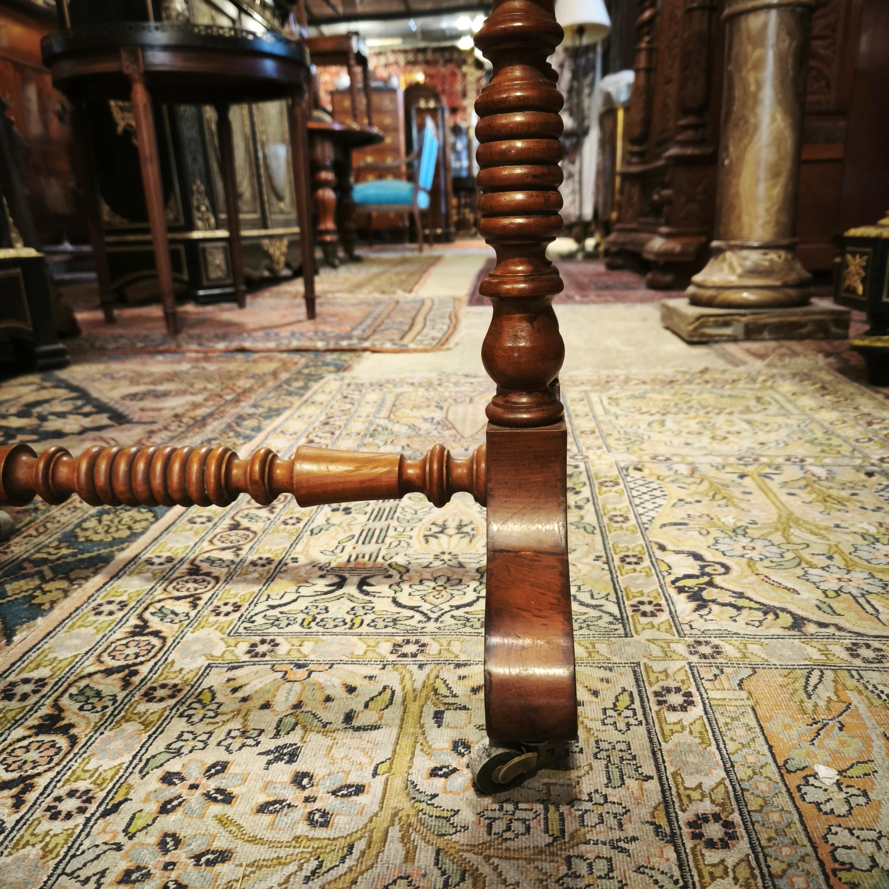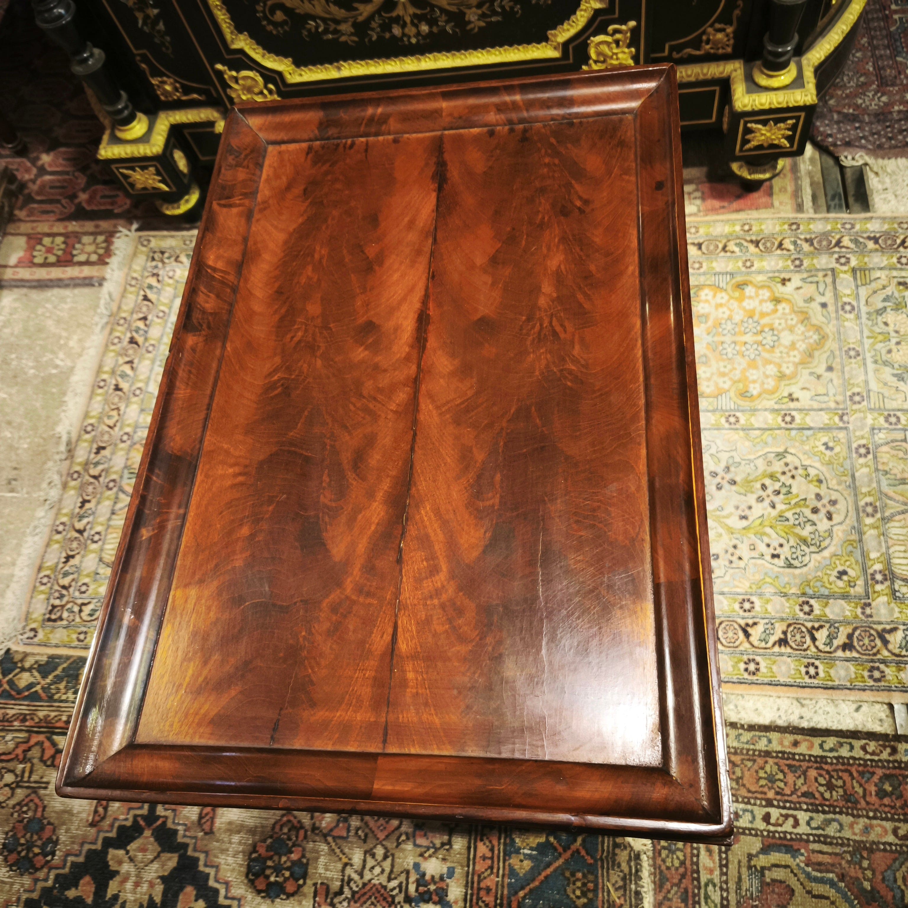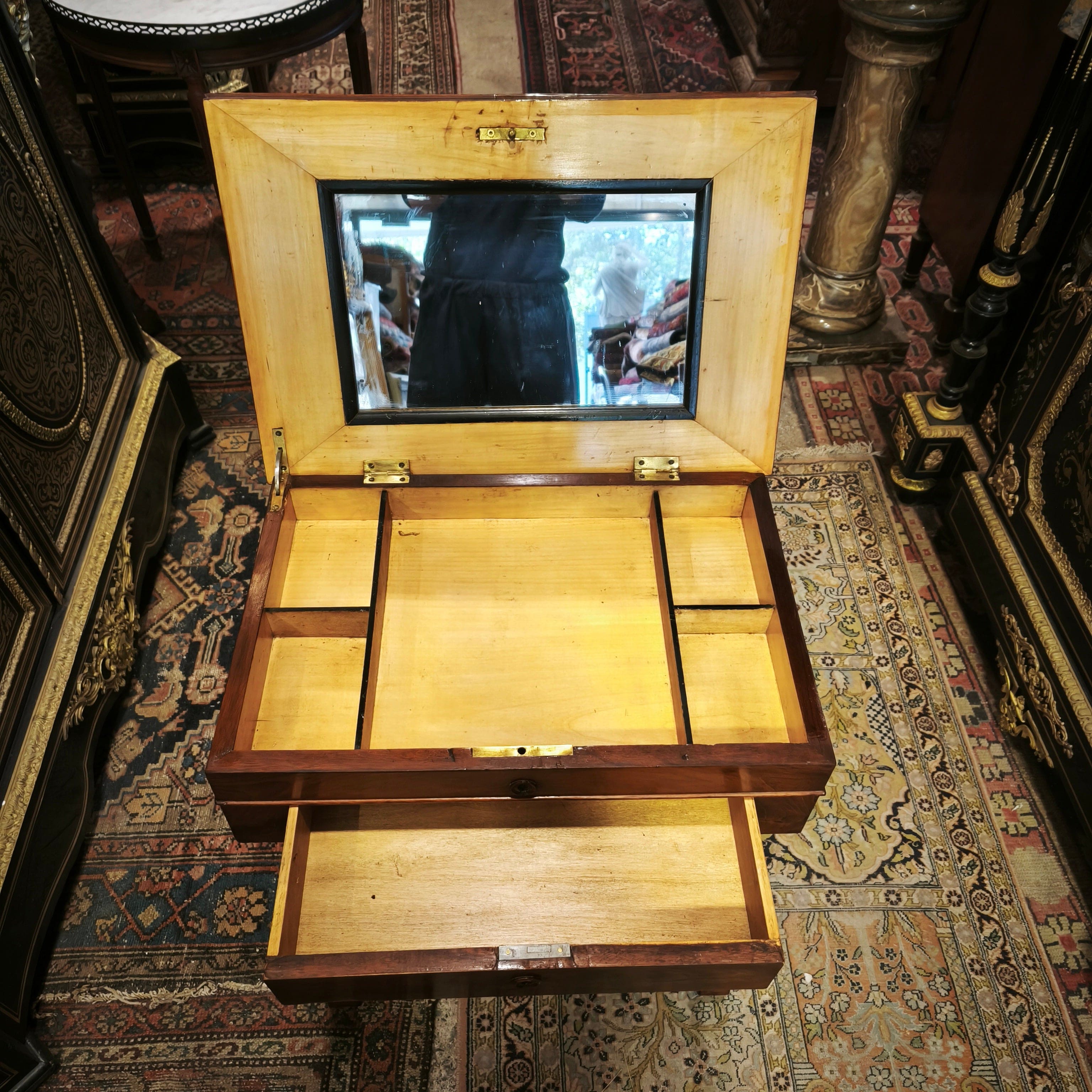 Linda mesita costurero peinador Francés con rueditas y un cajoncito. De caoba y raíz de caoba y erable al interior. Travesaño y patas torneadas.