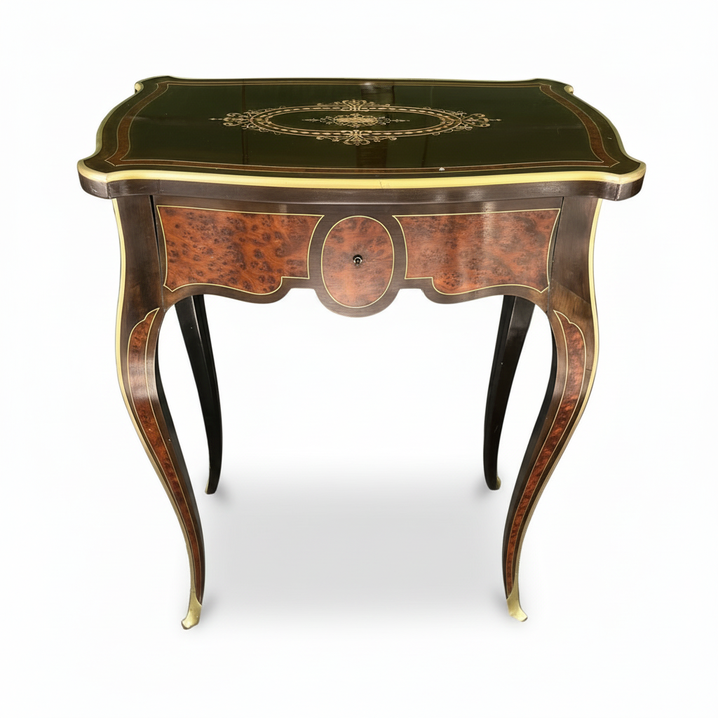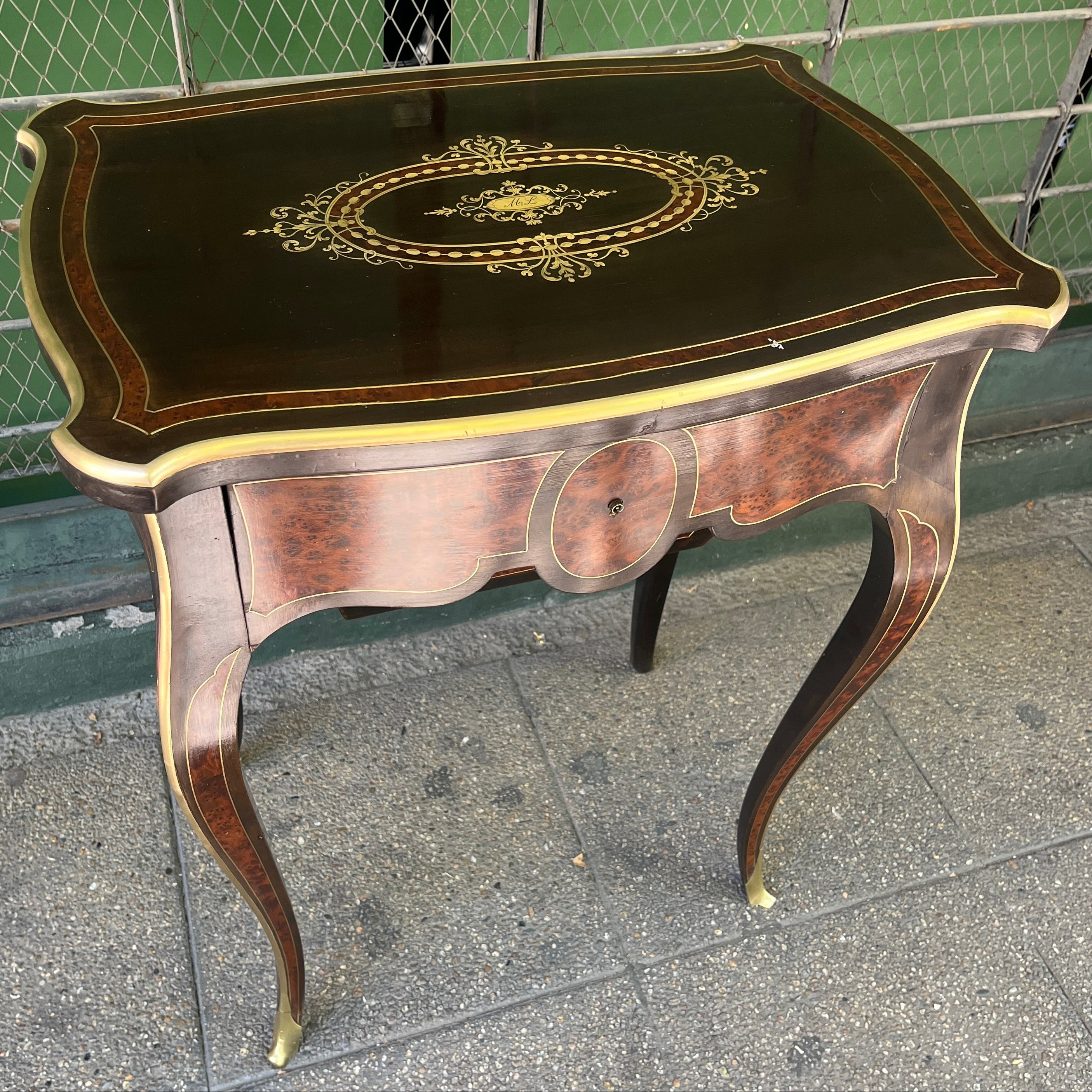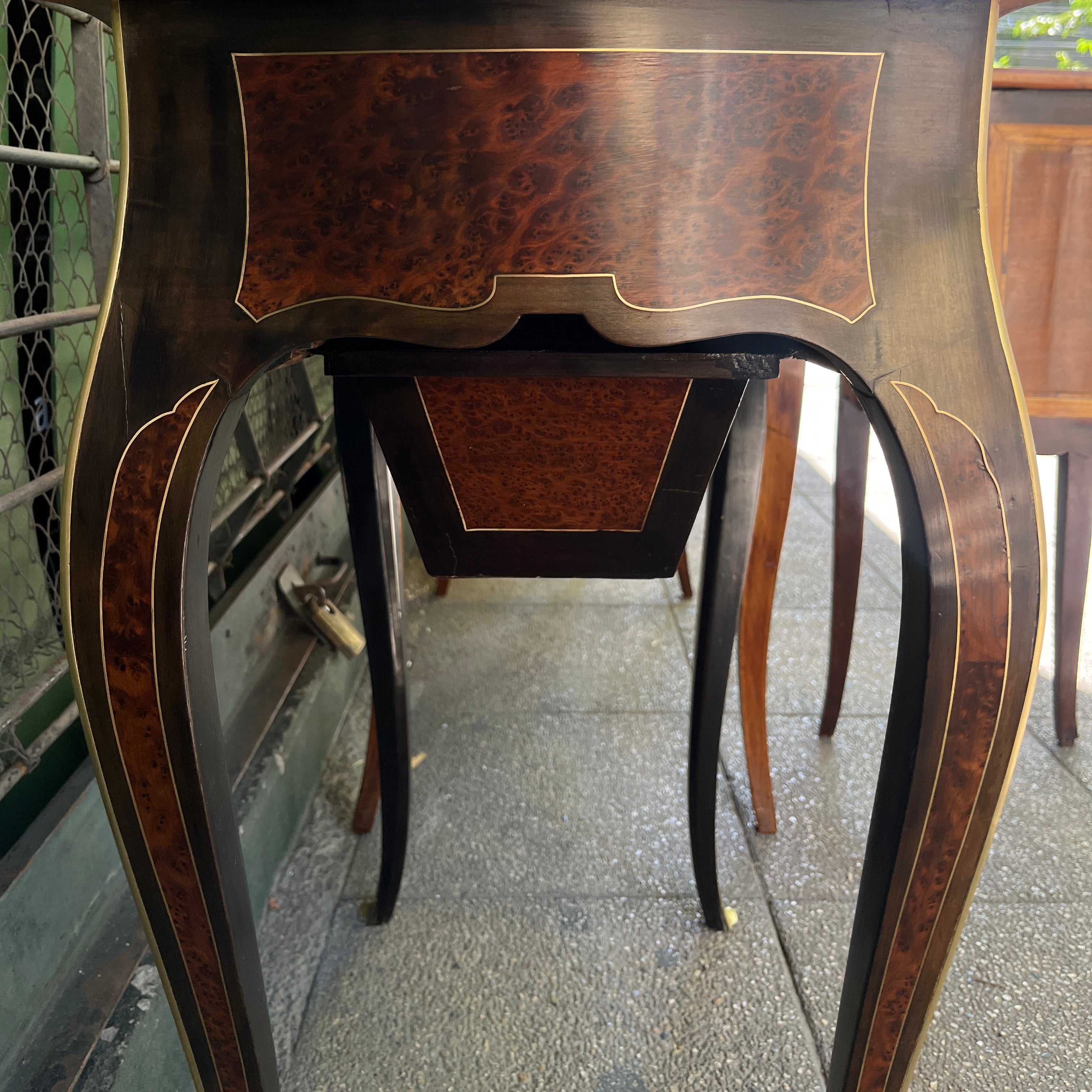 Precioso costurero francés de madera enchapada con incrustaciones de latón y raíz, cajón en la cintura. Posee distintos compartimentos ideales, cubierta decorada con un óvalo con elementos vegetales y motivos geométricos lineales, además de un monograma en el centro con las iniciales 'ML'.