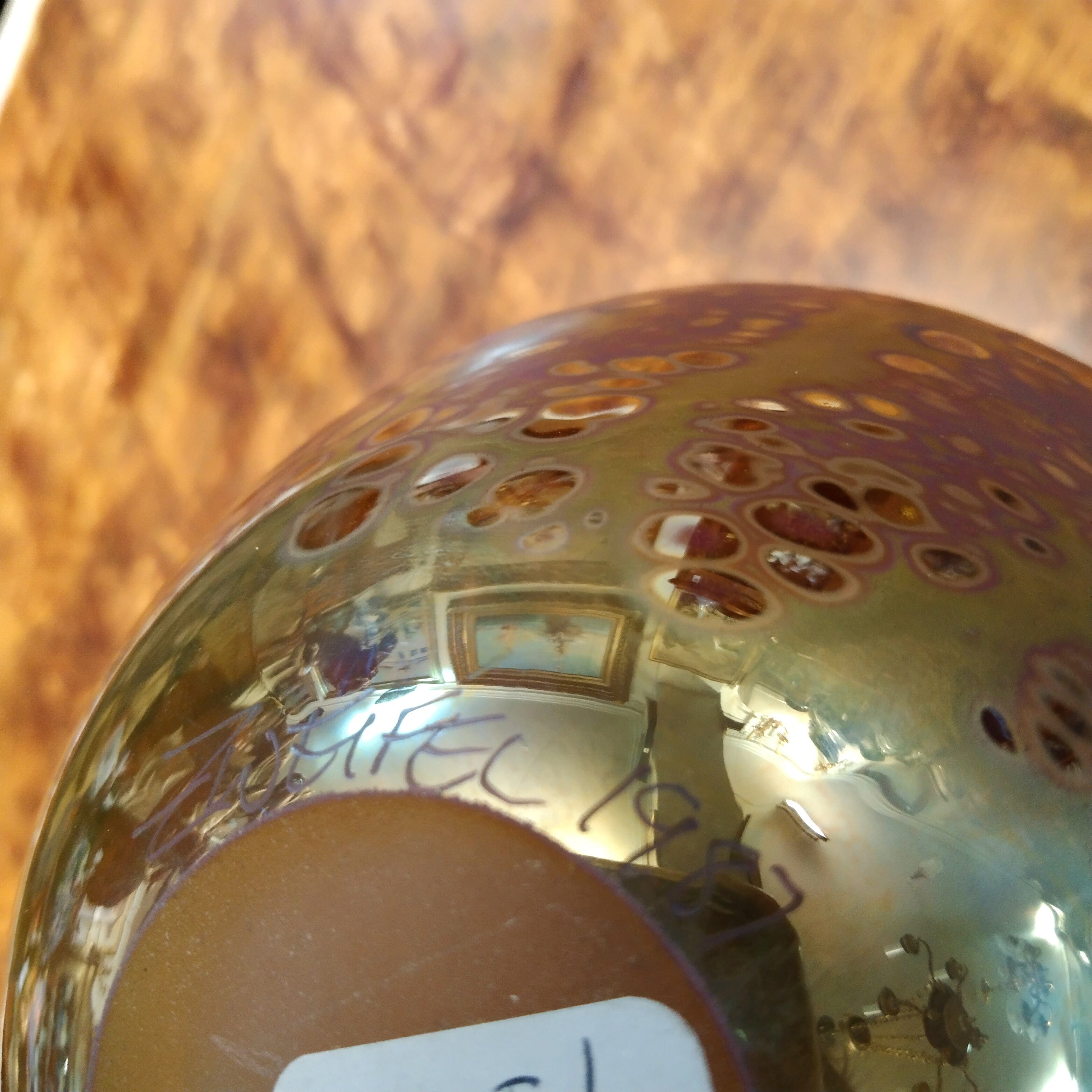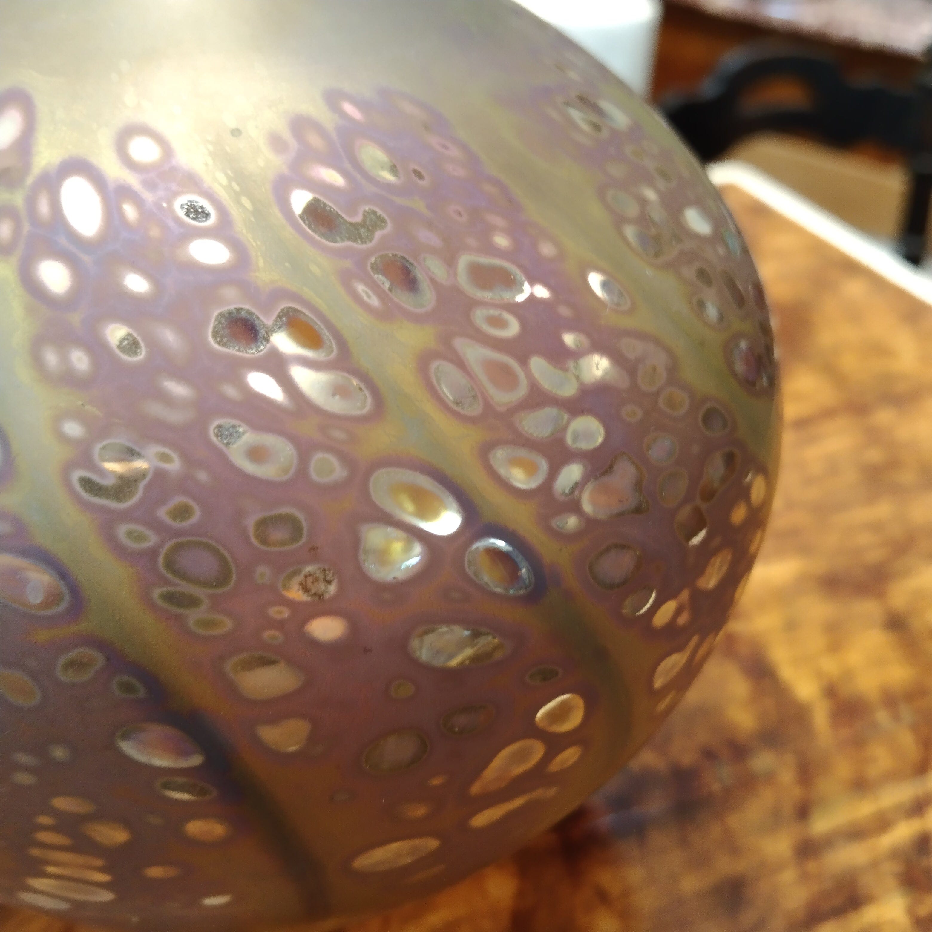 Bello florero del artista estadounidense Craig Zweifel, utilizando la técnica particular a sus obras, que se basa en piezas de vidrio soplado, fundido con plata y otras capas de vidrio a altas temperaturas, generando un efecto iridiscente único. La pieza fue hecha a mano en 1987, fecha inscrita en la base de la pieza, junto a la firma del artista.