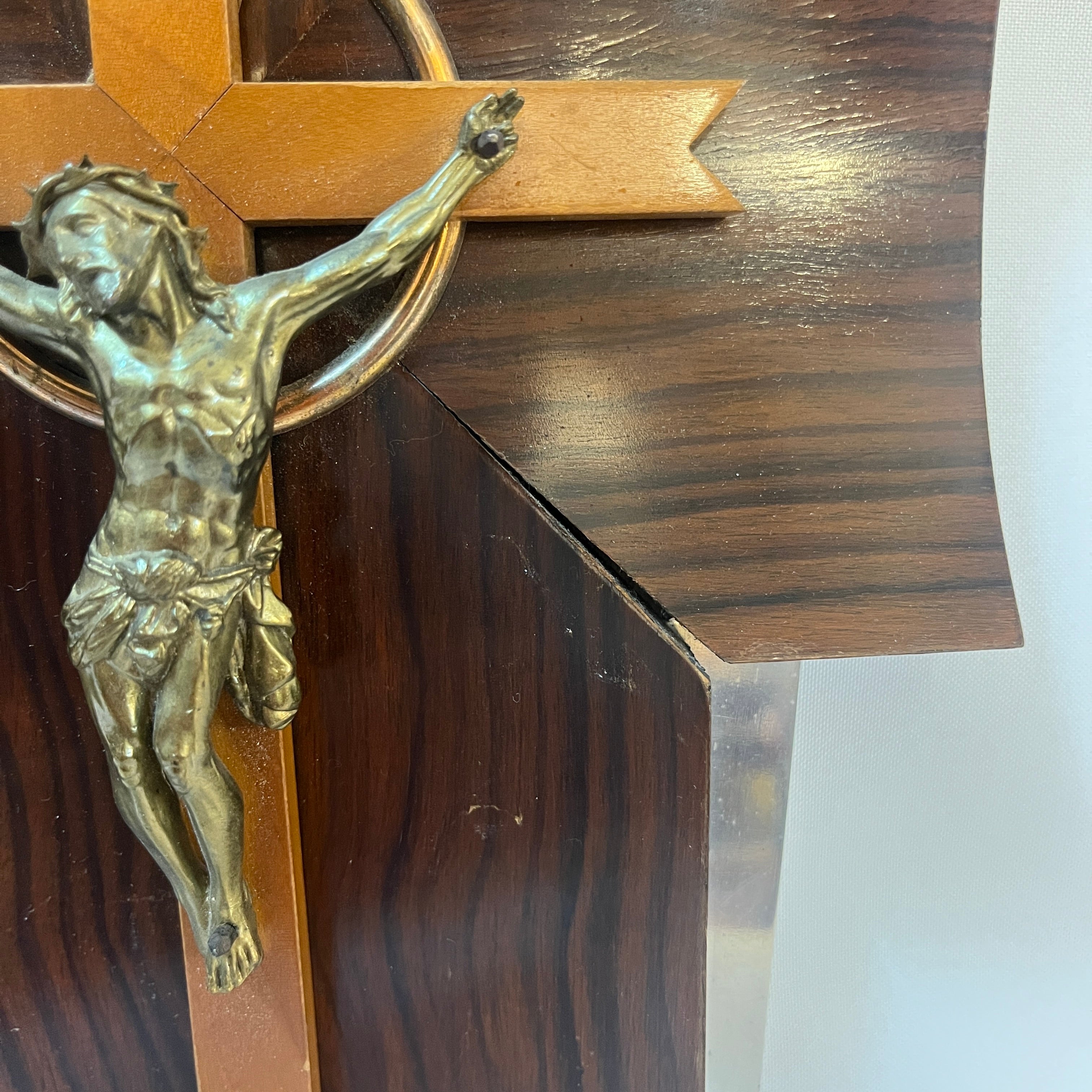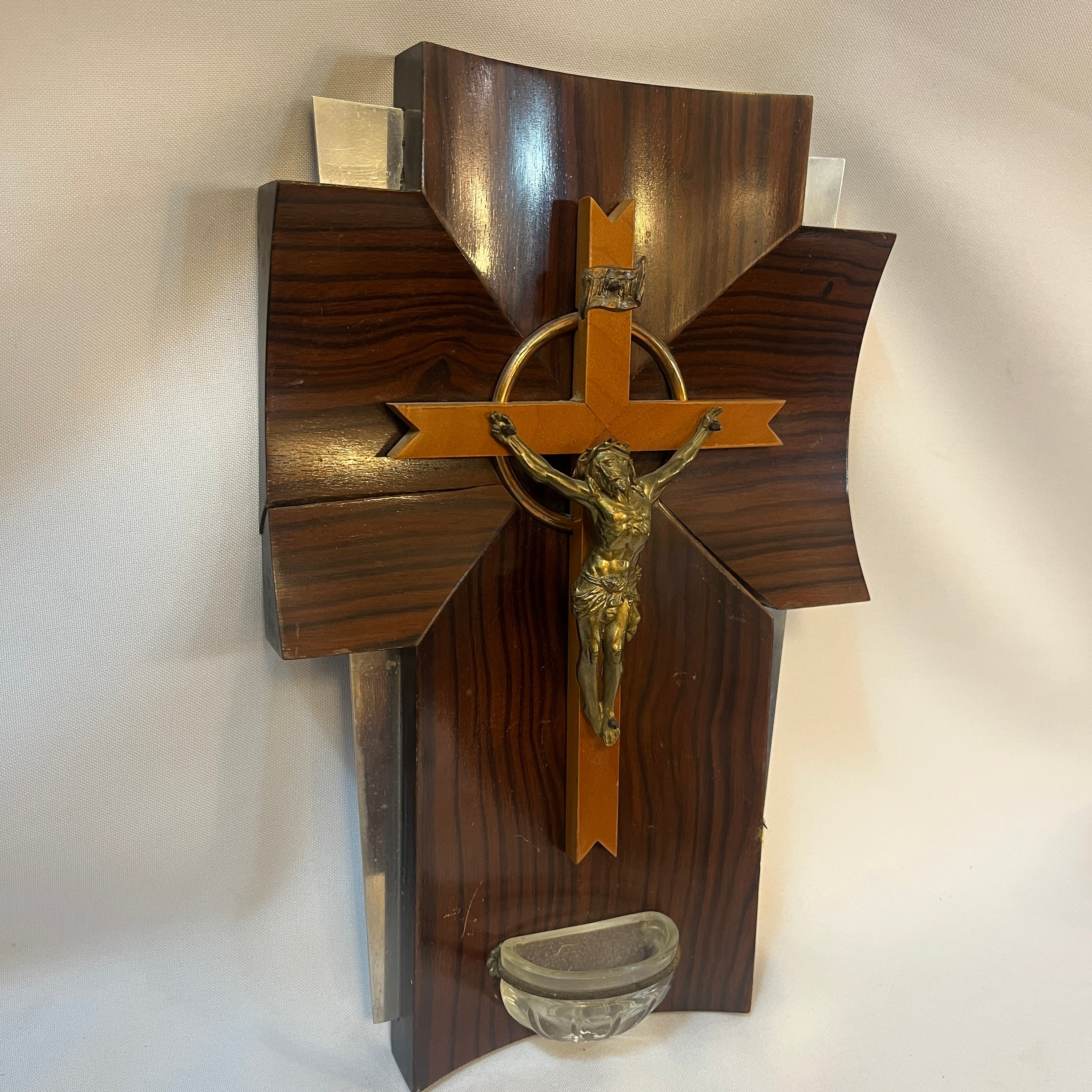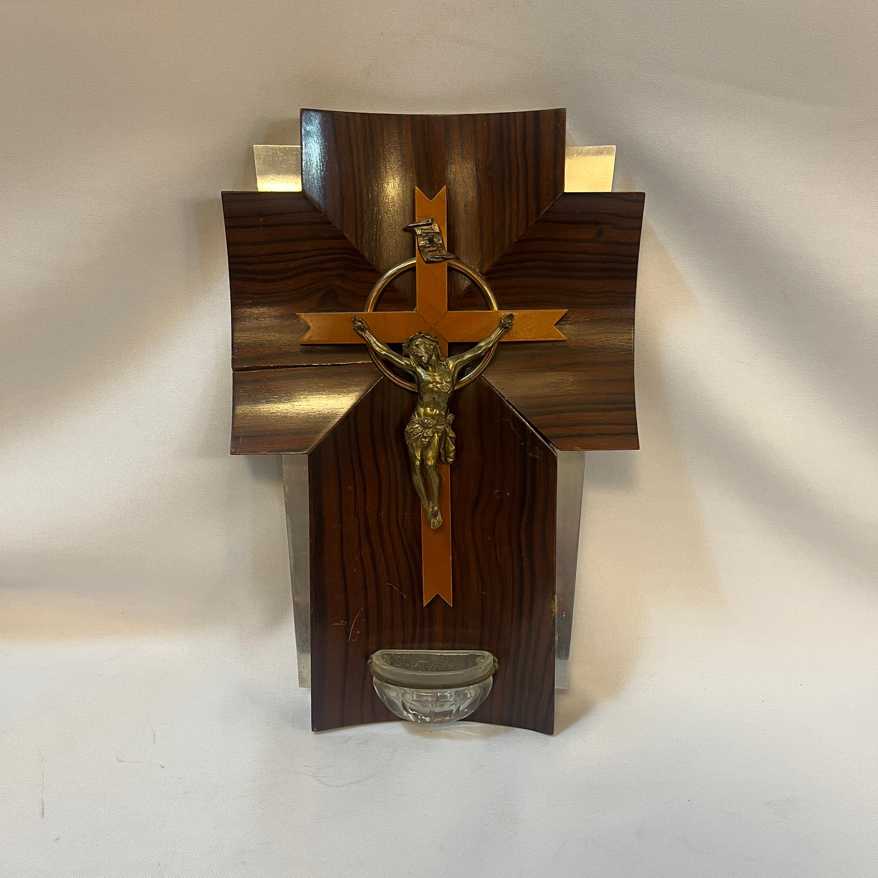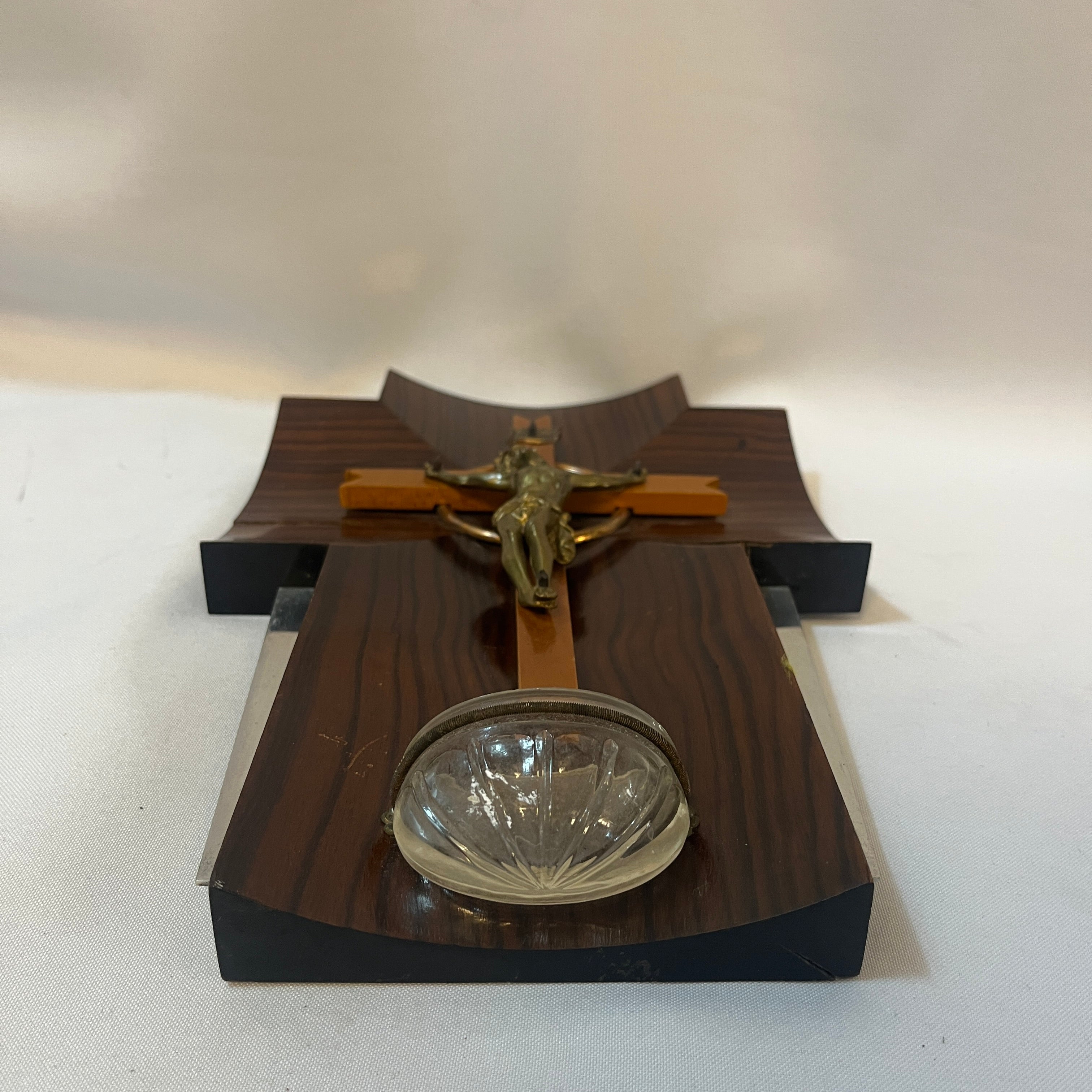Crucifijo con benditera devocional francés de madera bronce y cristal prensado mediados s.XX