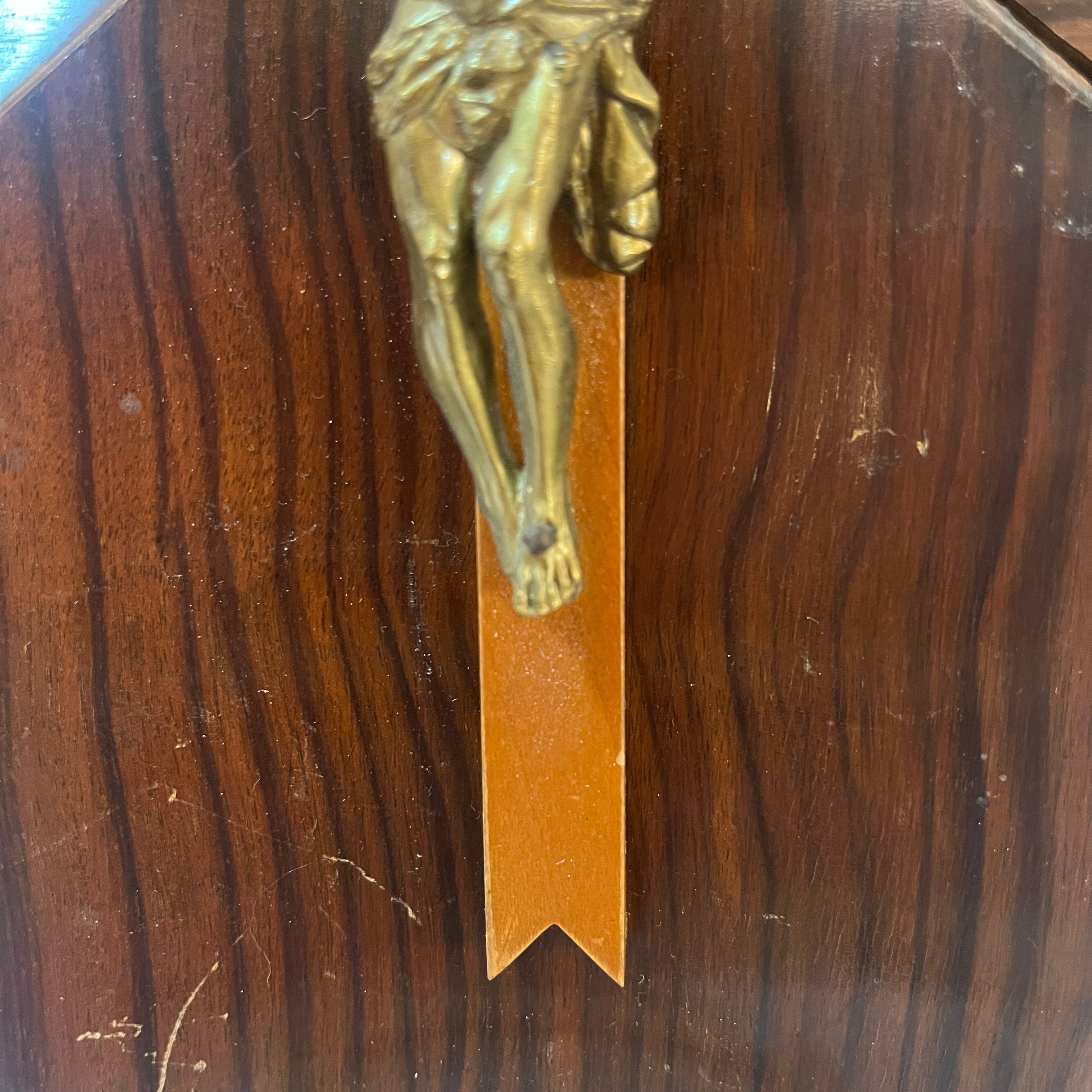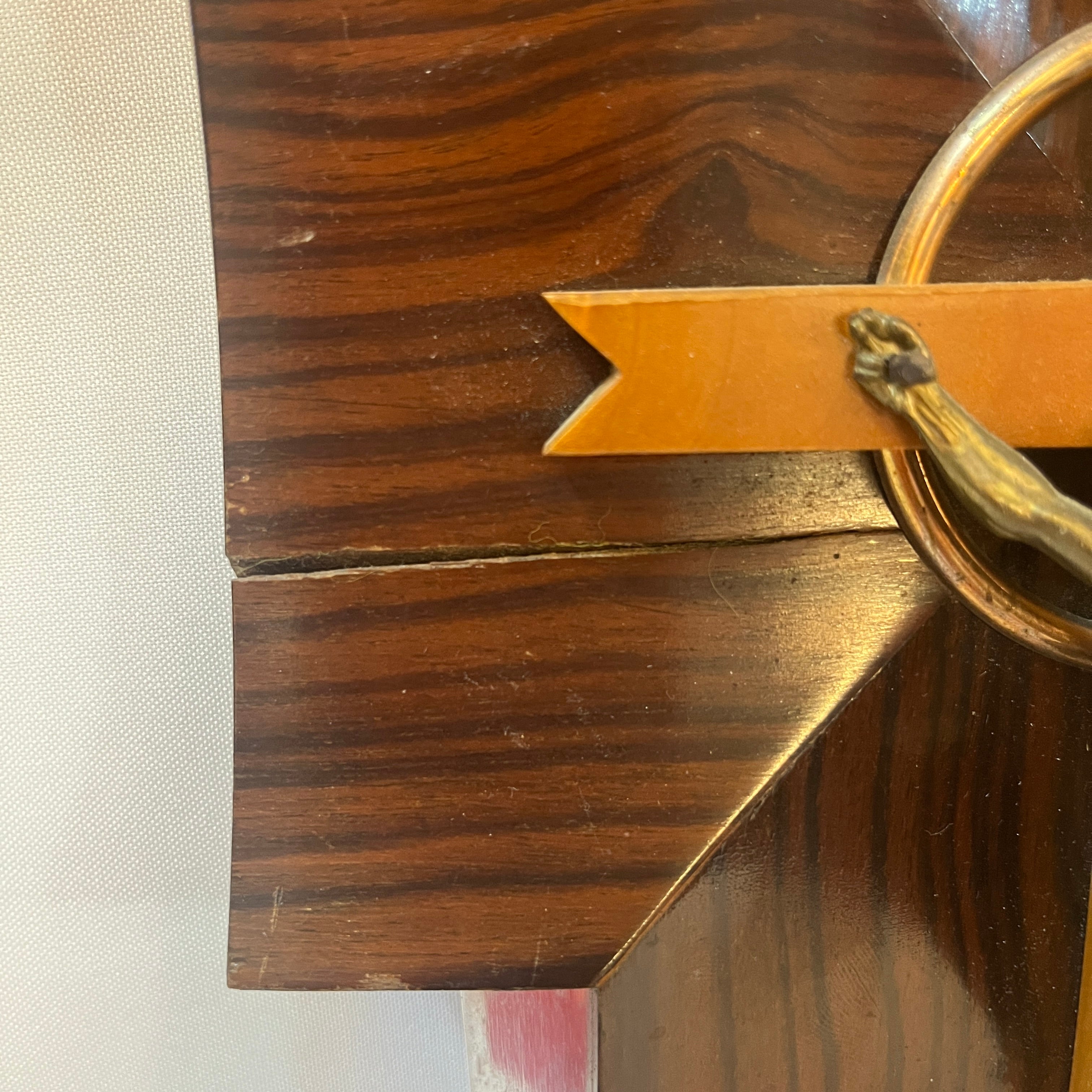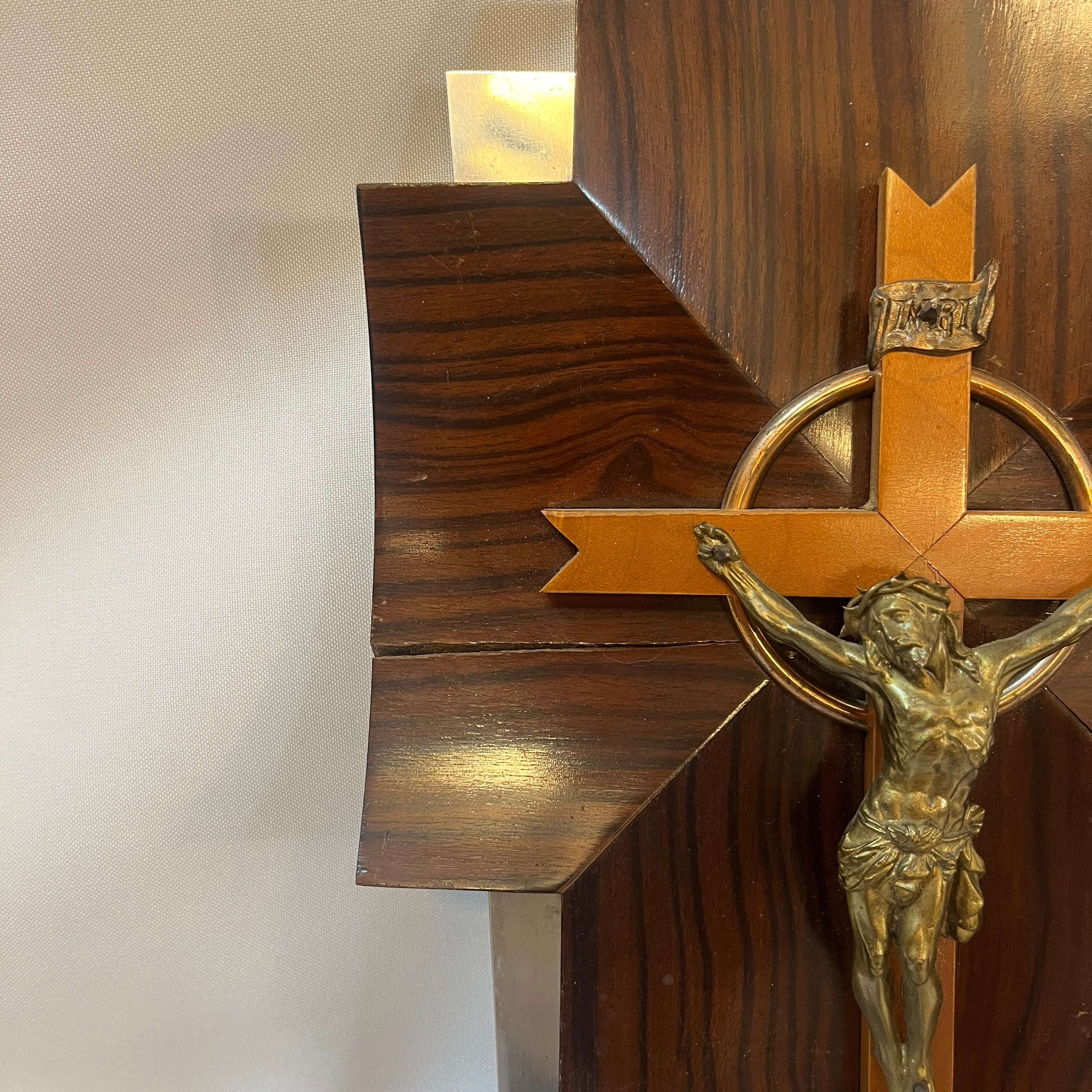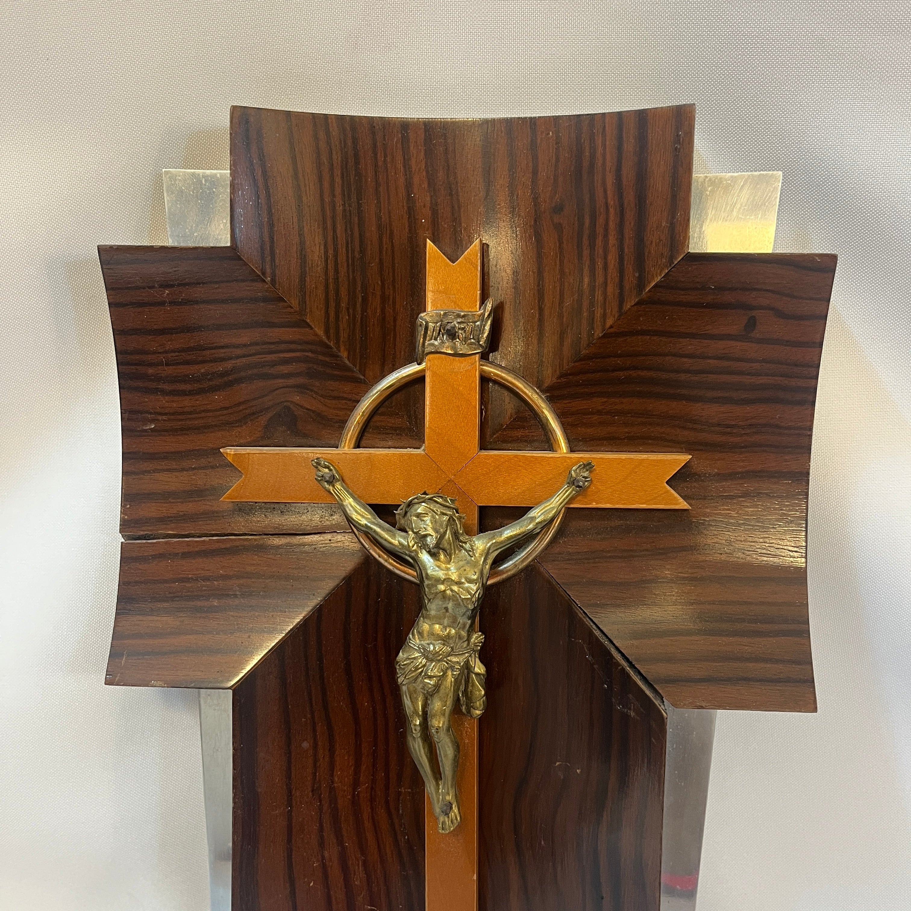Crucifijo con benditera devocional francés de madera bronce y cristal prensado mediados s.XX