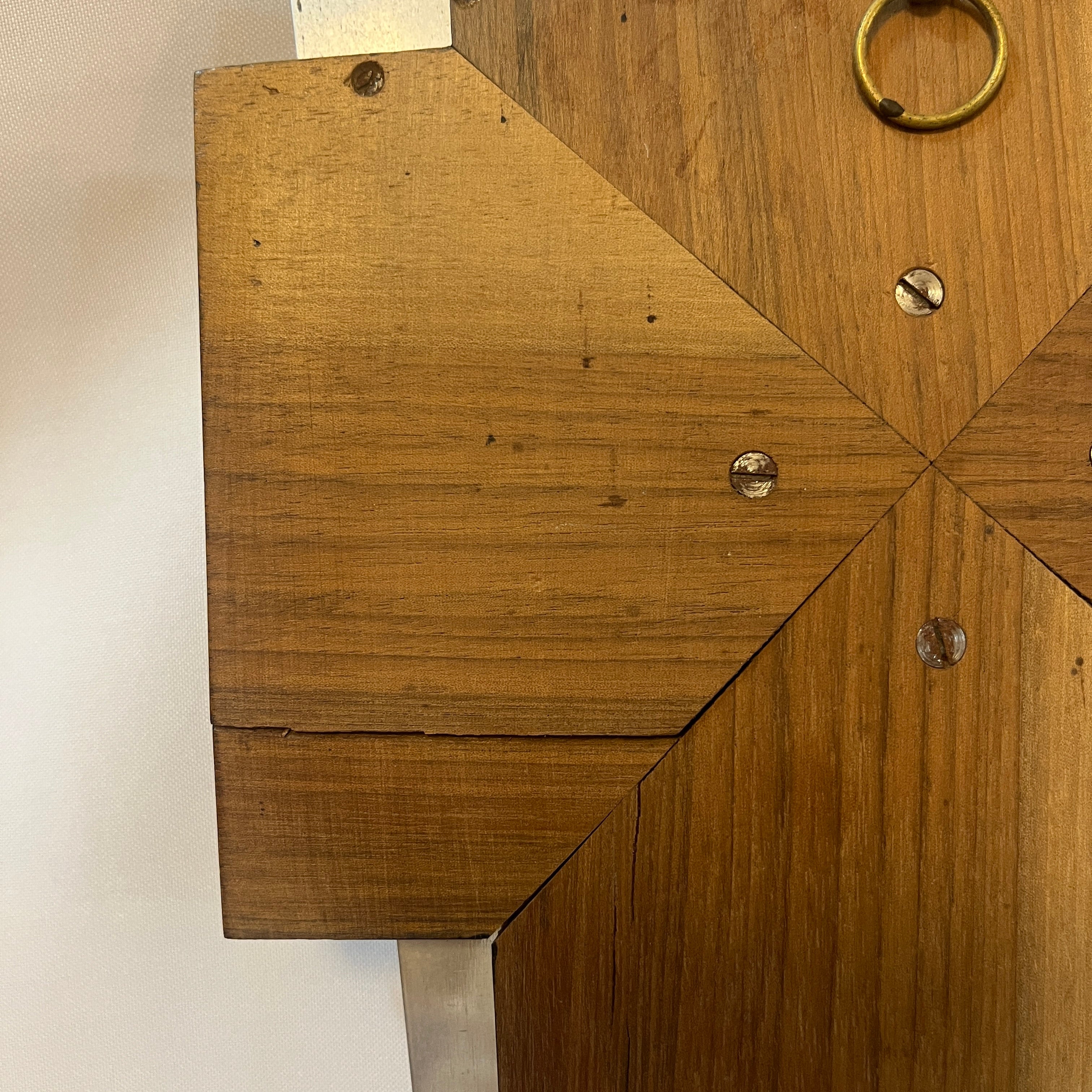 Benditera mural de mediados del siglo XX (c.1950-1970), elaborada en estructura de madera con enchape decorativo en tono nogal oscuro, destadacada por su veta profunda y simétrica .