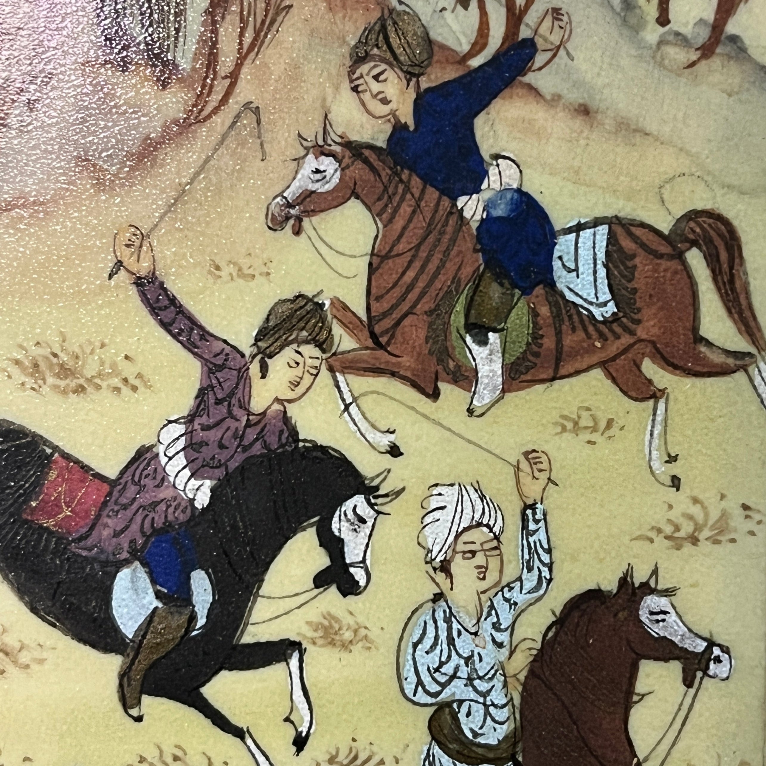 Bello cuadro de origen persa de mediados siglo XX, hecho de marfilina pintada a mano, representando una escena de tres jinetes cabalgando sobre un valle mientras juegan polo. Tanto la vegetación como el vestuario de cada jinete está terminado con detalle y delicadeza. Se trata de una obra de pequeño formato y trazo fino, complementado por un llamativo marco de madera con diseños de marquetería en micromosaicos.