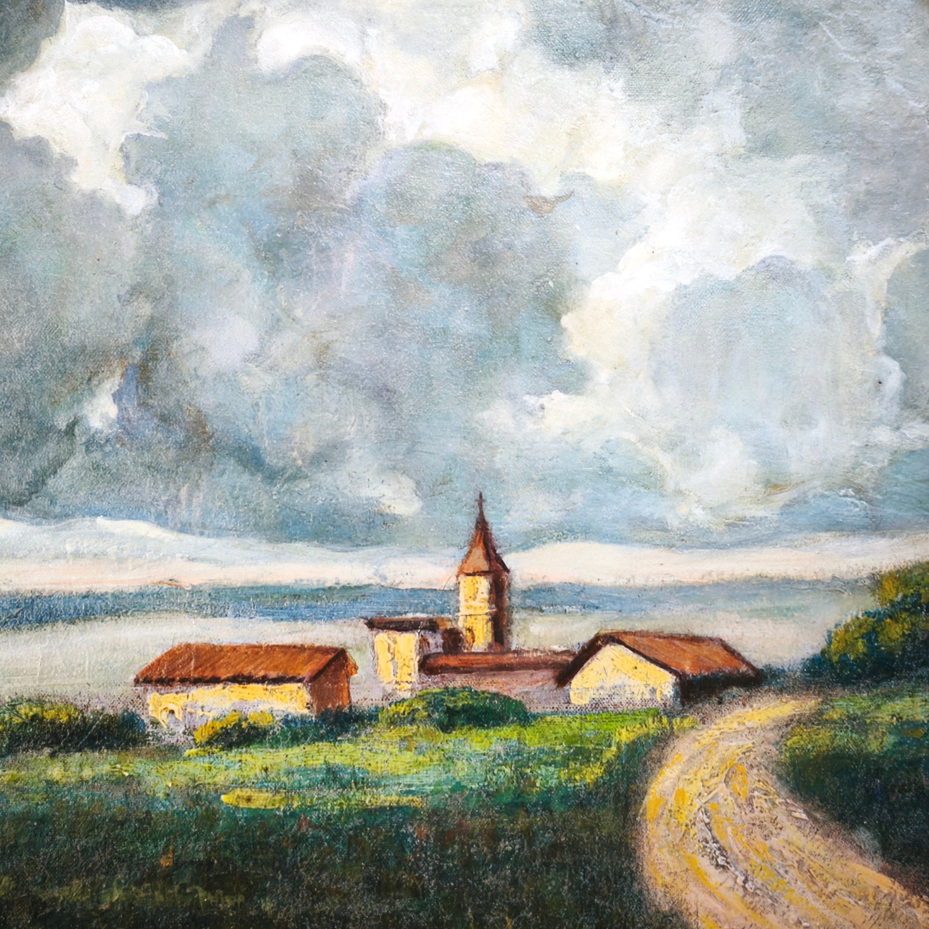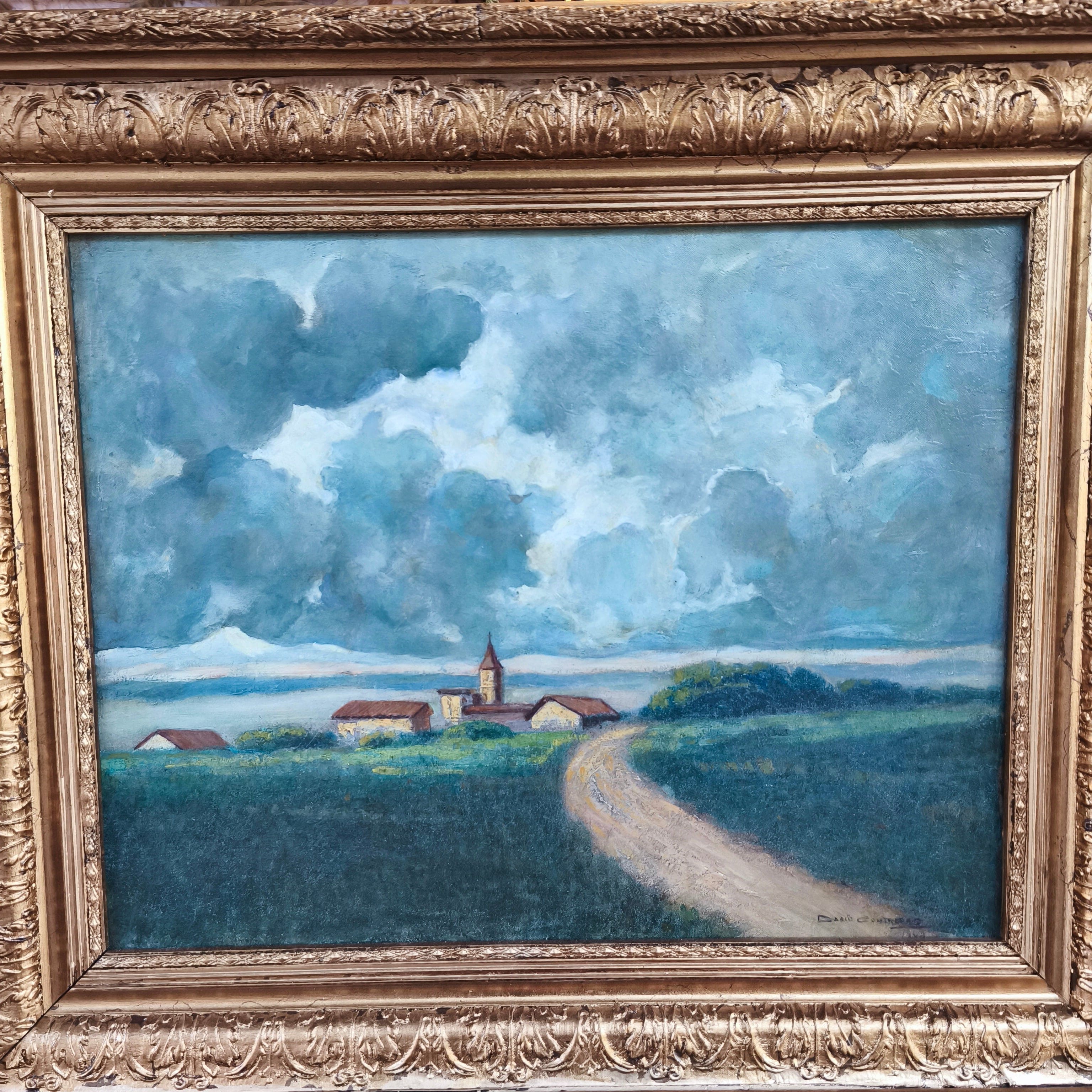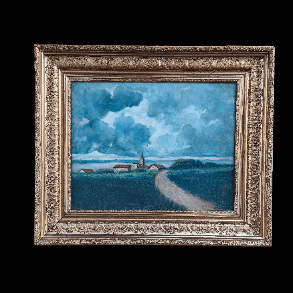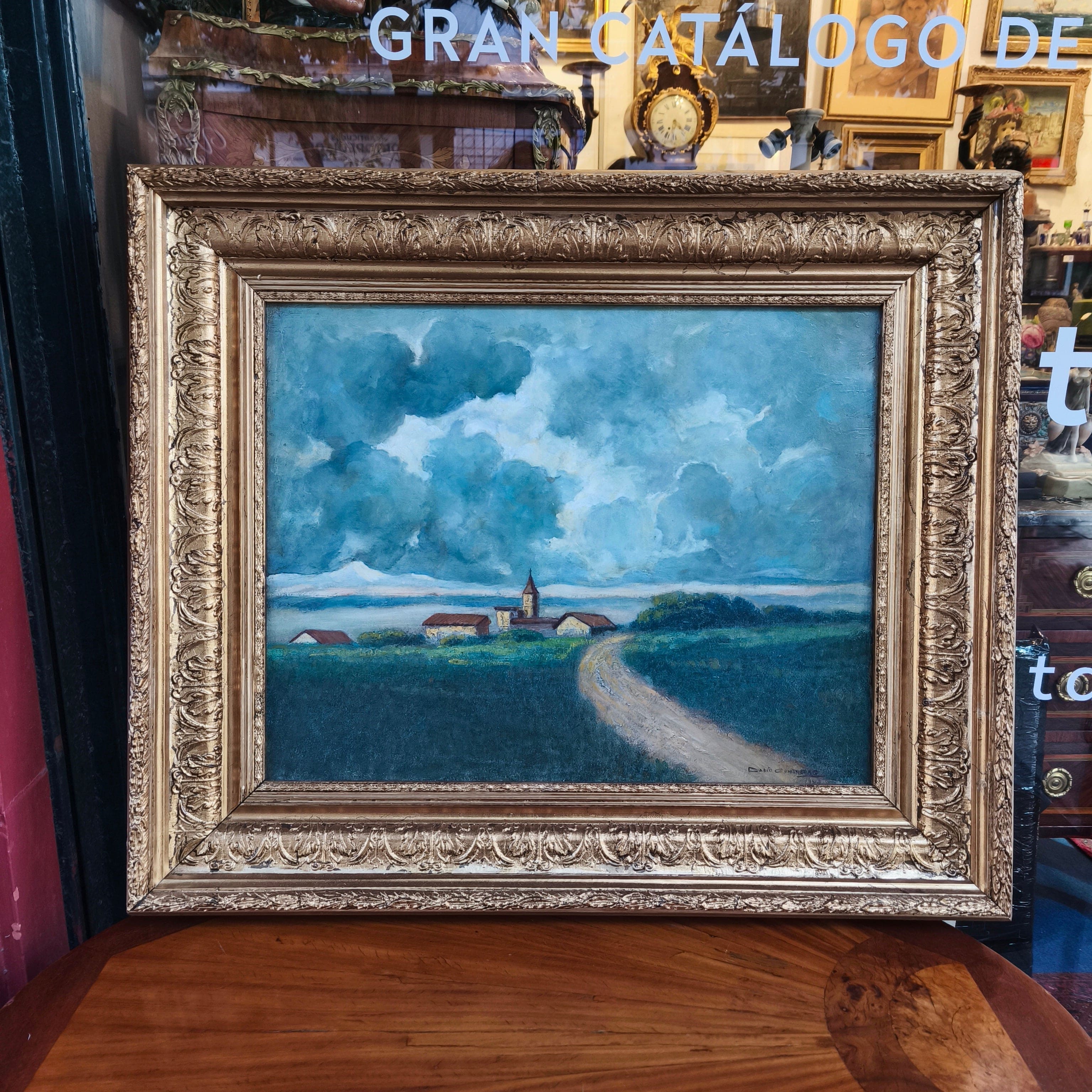 Bello óleo del pintor chileno Dario Contreras, en la obra vemos un paisaje del sur de Chile con un intenso y expresivo cielo propio de esa región.