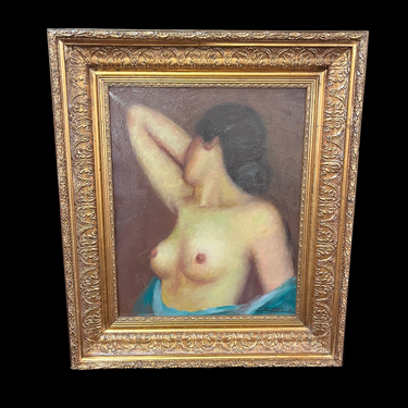 Bello y enigmático trabajo del artista de origen chileno Darío Contreras, representando a una mujer a torso desnudo. La obra cuenta con un marco tallado pintado en dorado y está firmada y fechada por el mismo autor.