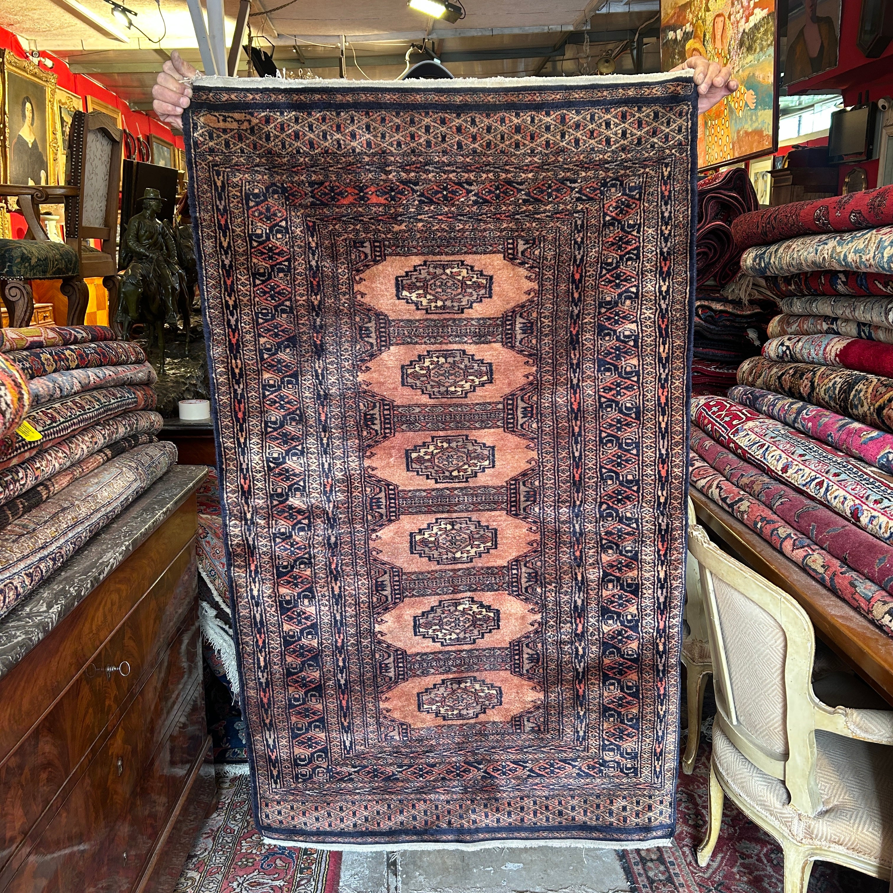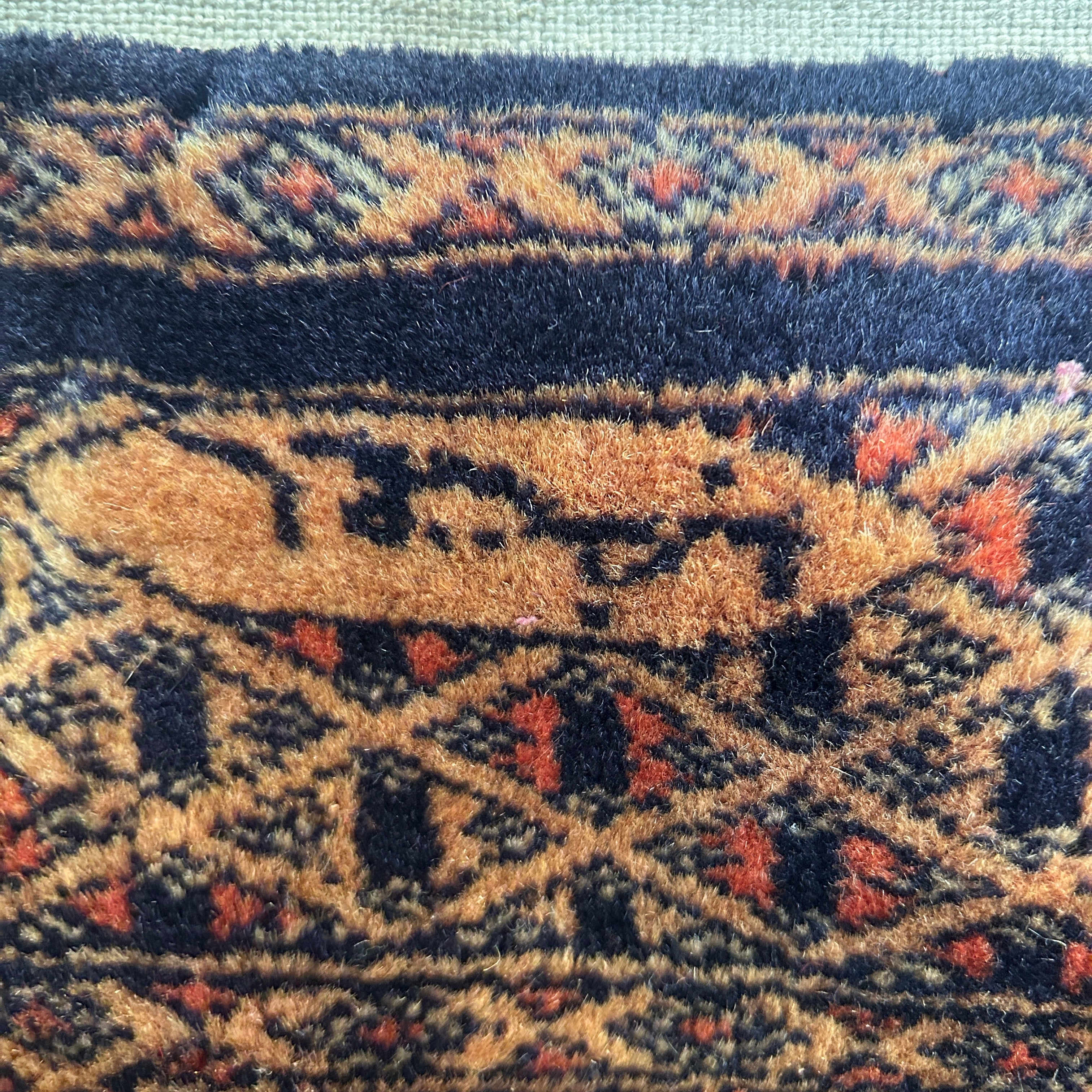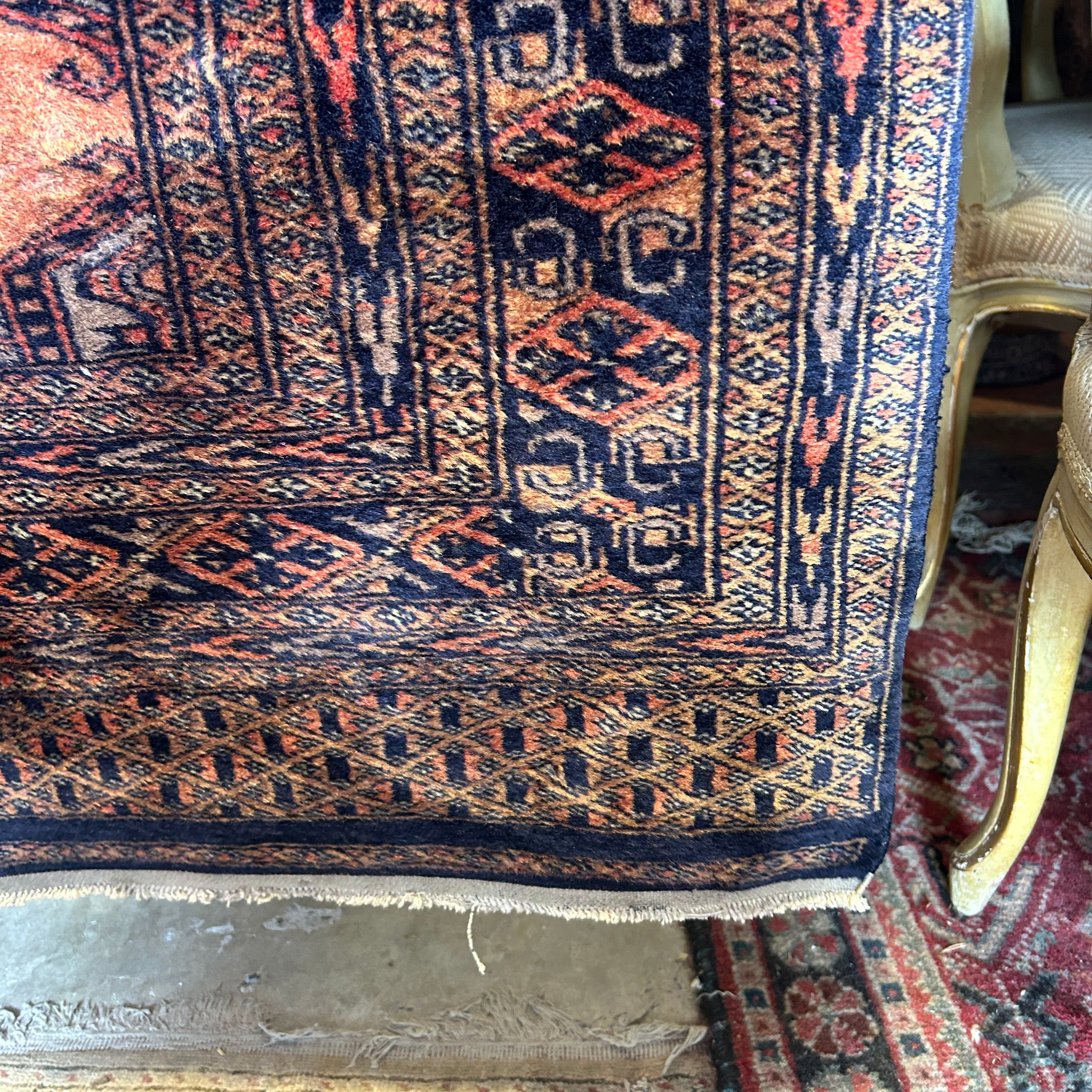 Bella alfombra de origen pakistaní Bockhara, tejida a mano en lana y seda, teñidas en naranjo, azul y amarillo. La pieza tiene seis figuras centrales, en donde prima el naranjo, rodeadas de cadenas decorativas en complejos patrones geométricos. Un elemento distintivo de esta pieza es la firma ubicada en una de sus esquinas, que da cuenta del taller o tejedor que la hizo.