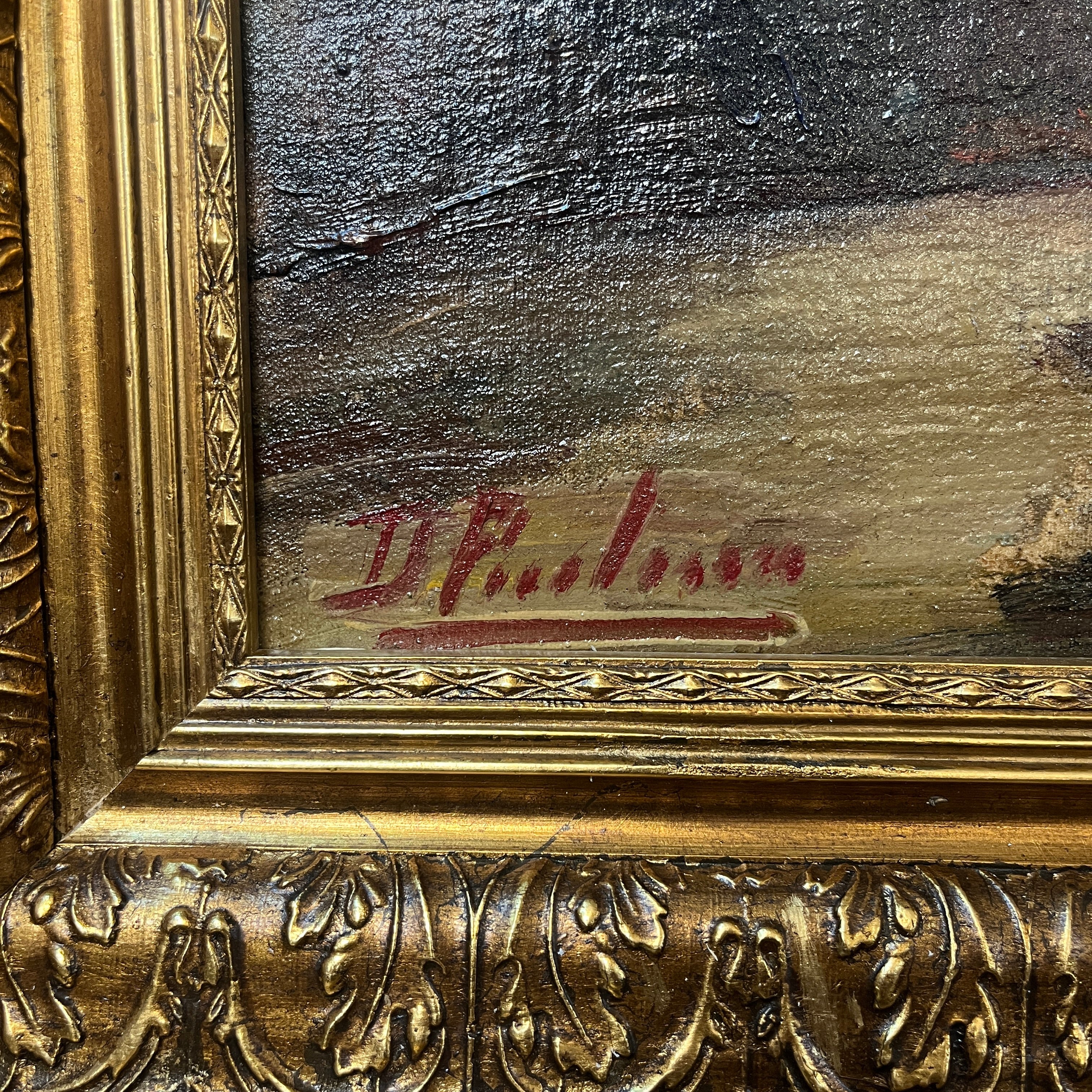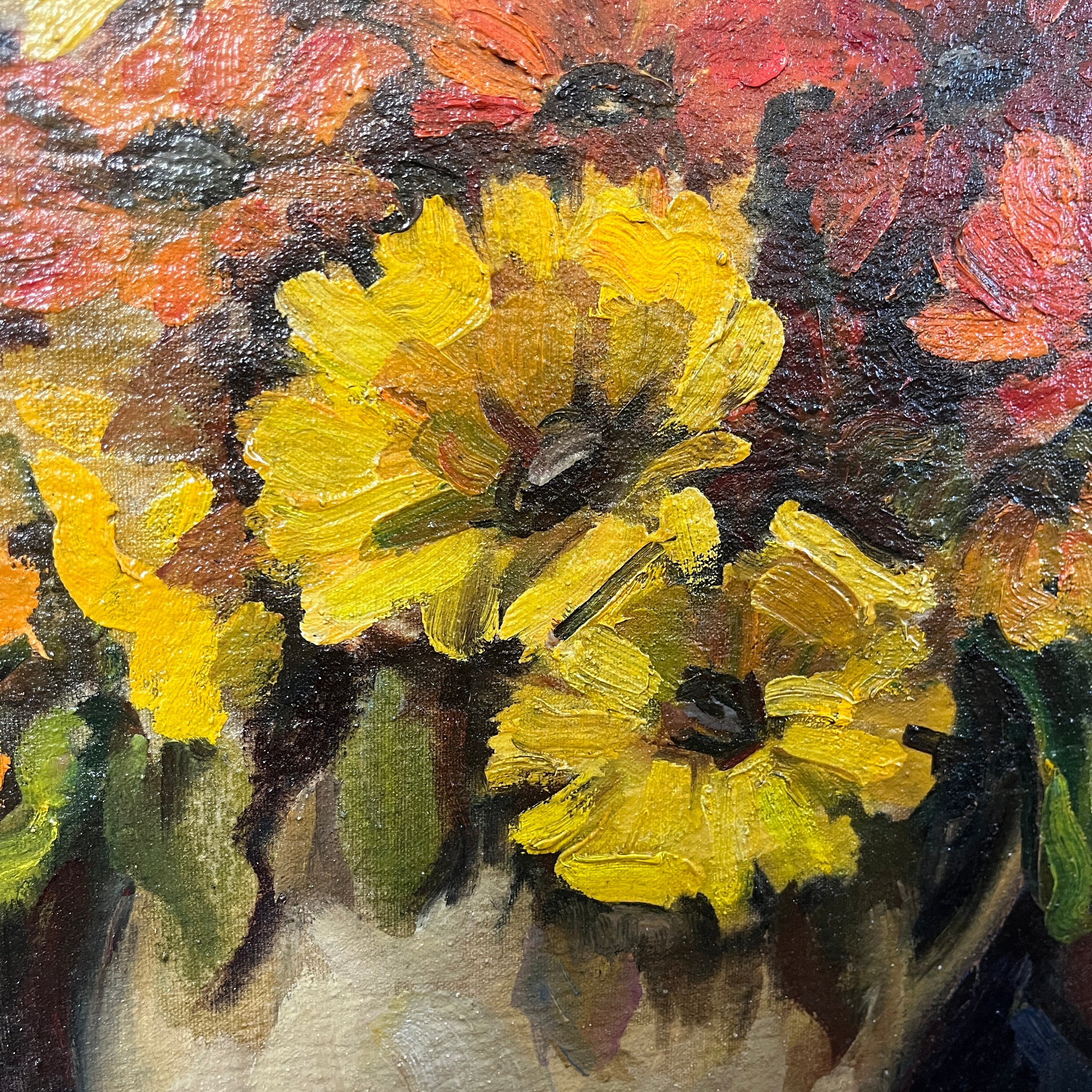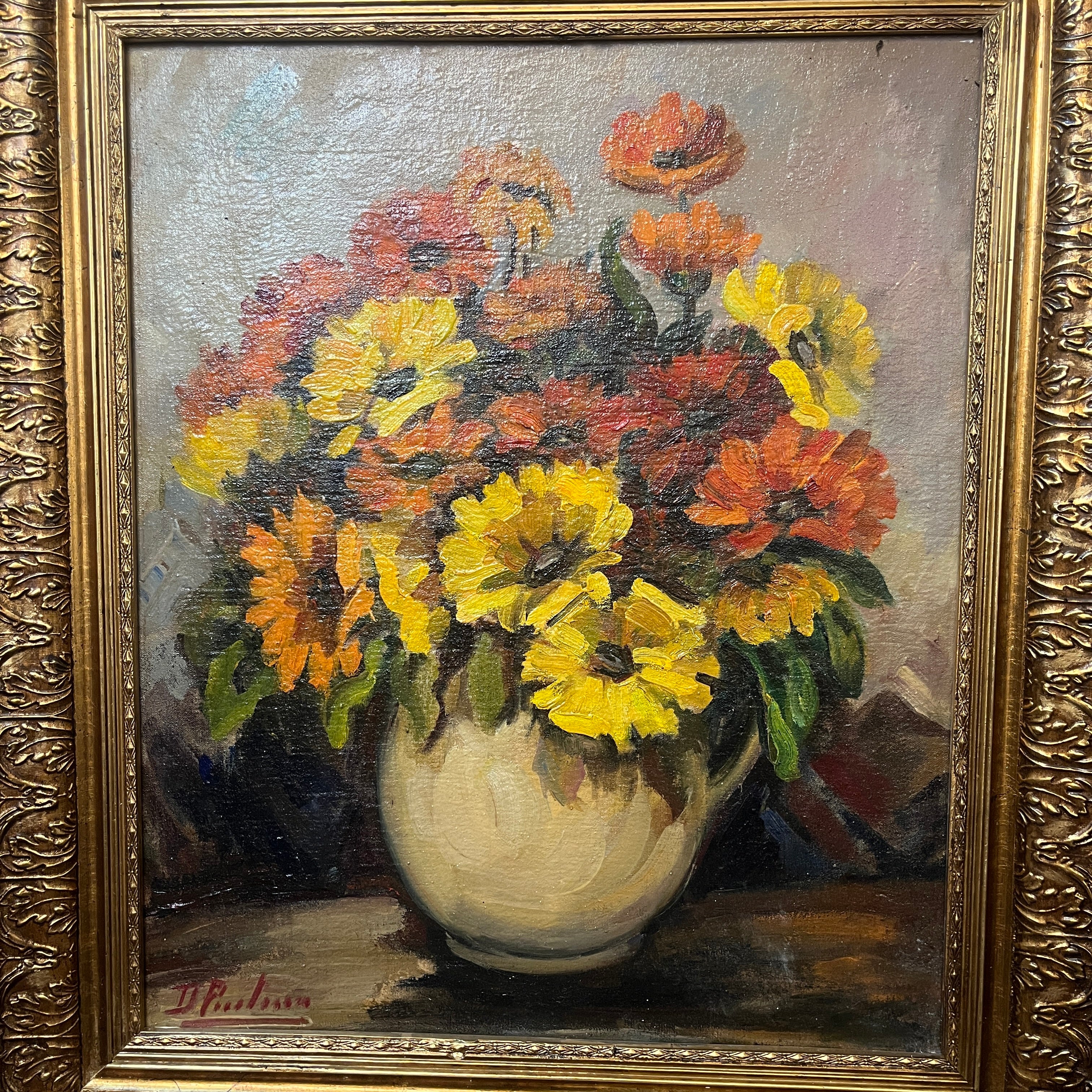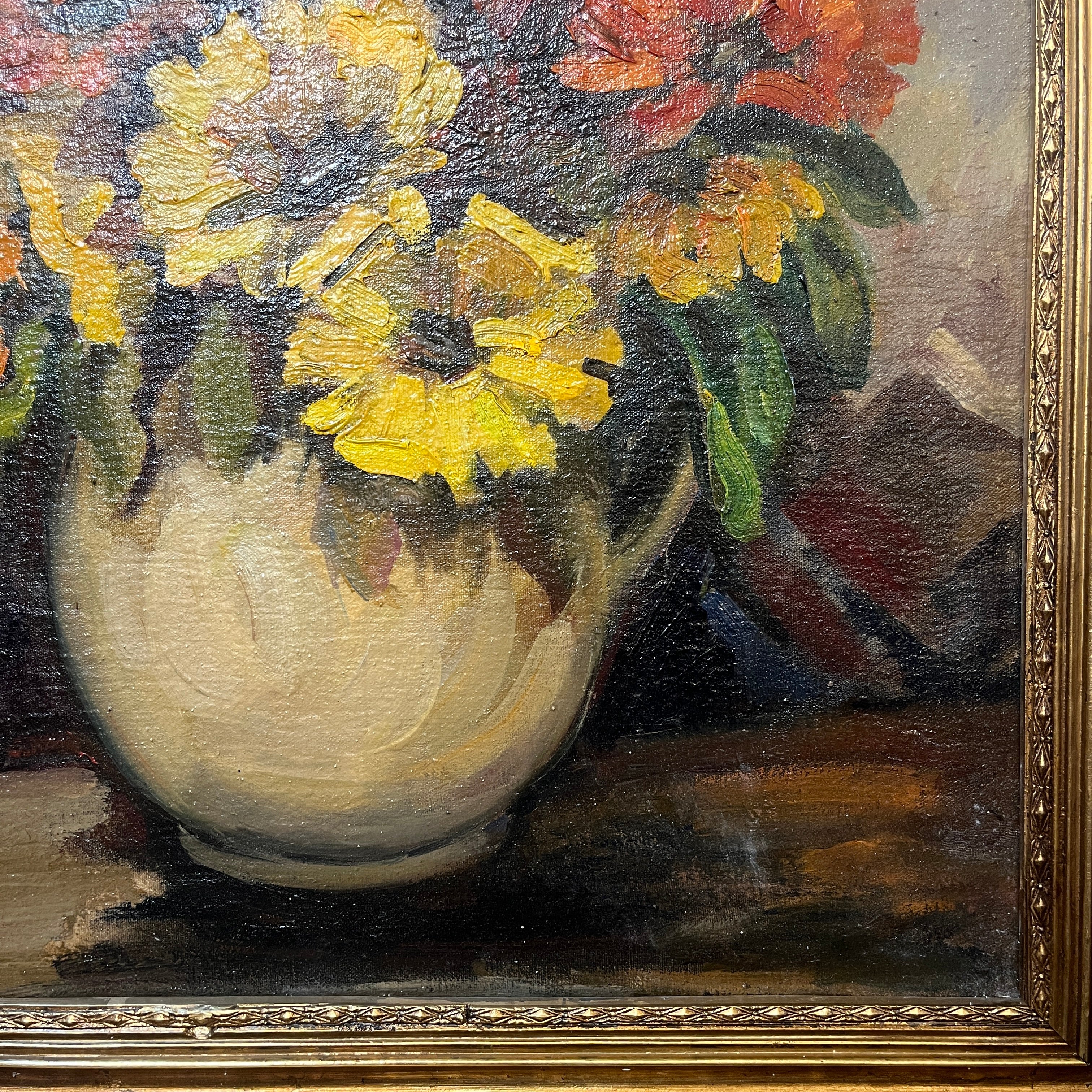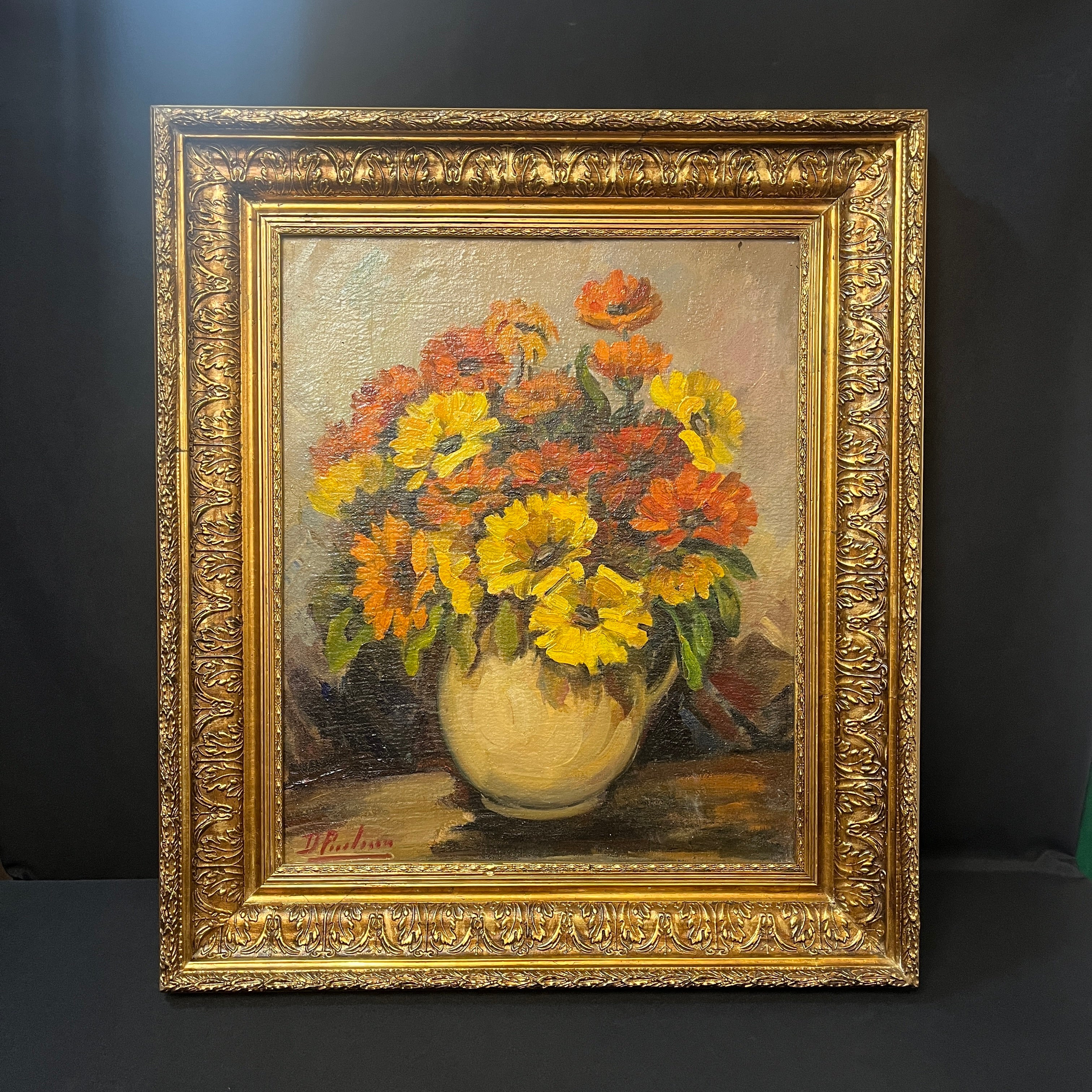 Bello óleo de la reconocida pintora, escultora y profesora chilena Dora Puelma (1898-1972), tenemos en un primer plano un gran jarrón blanco con asa lateral y un ramillete de gerberas de tonos amarillos y naranjos. Es una pintura que cautiva por su realismo e intensidad en sus colores.