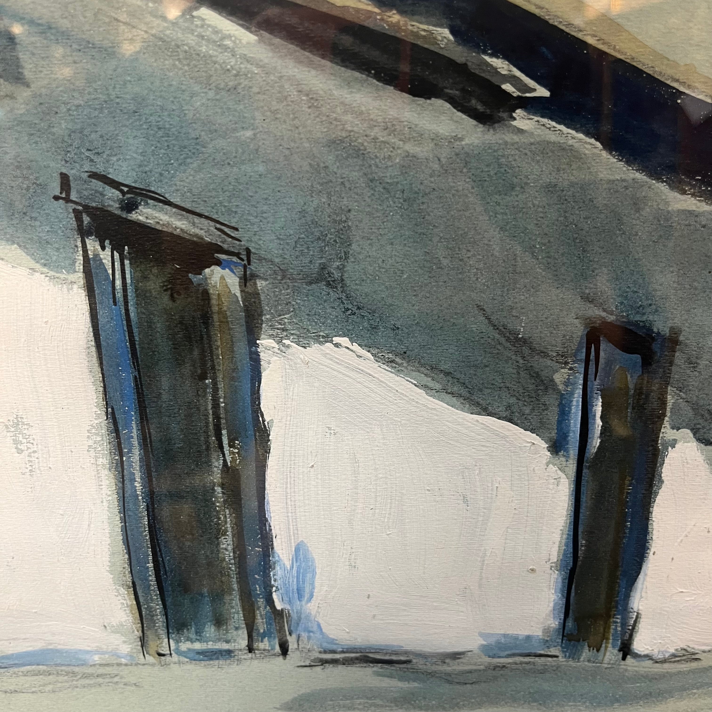 Técnica mixta del pintor chileno Eduardo Ossandón, representando una fachada rural, con una casa blanca, un gran árbol que la acompaña y el horizonte de fondo. El artista utiliza tanto acuarela, medio por el que es más reconocido, como también óleo para resaltar el blanco de la casa, haciendo no solo un bello trabajo de luz y sombra, sino que también de texturas dentro de una paleta sobria. La obra tiene un marco de madera contemporánea en color dorado, complementando las tonalidades del cuadro.