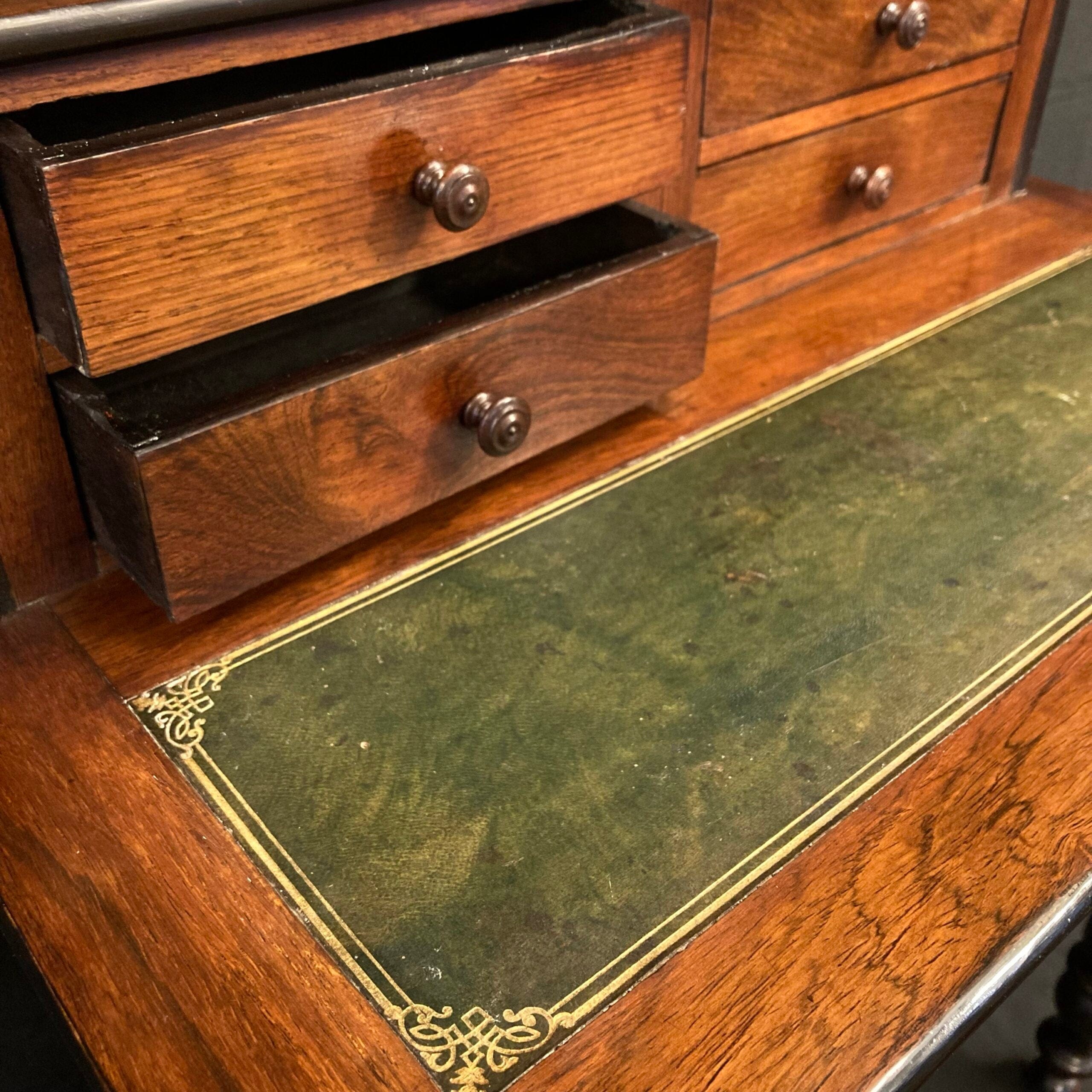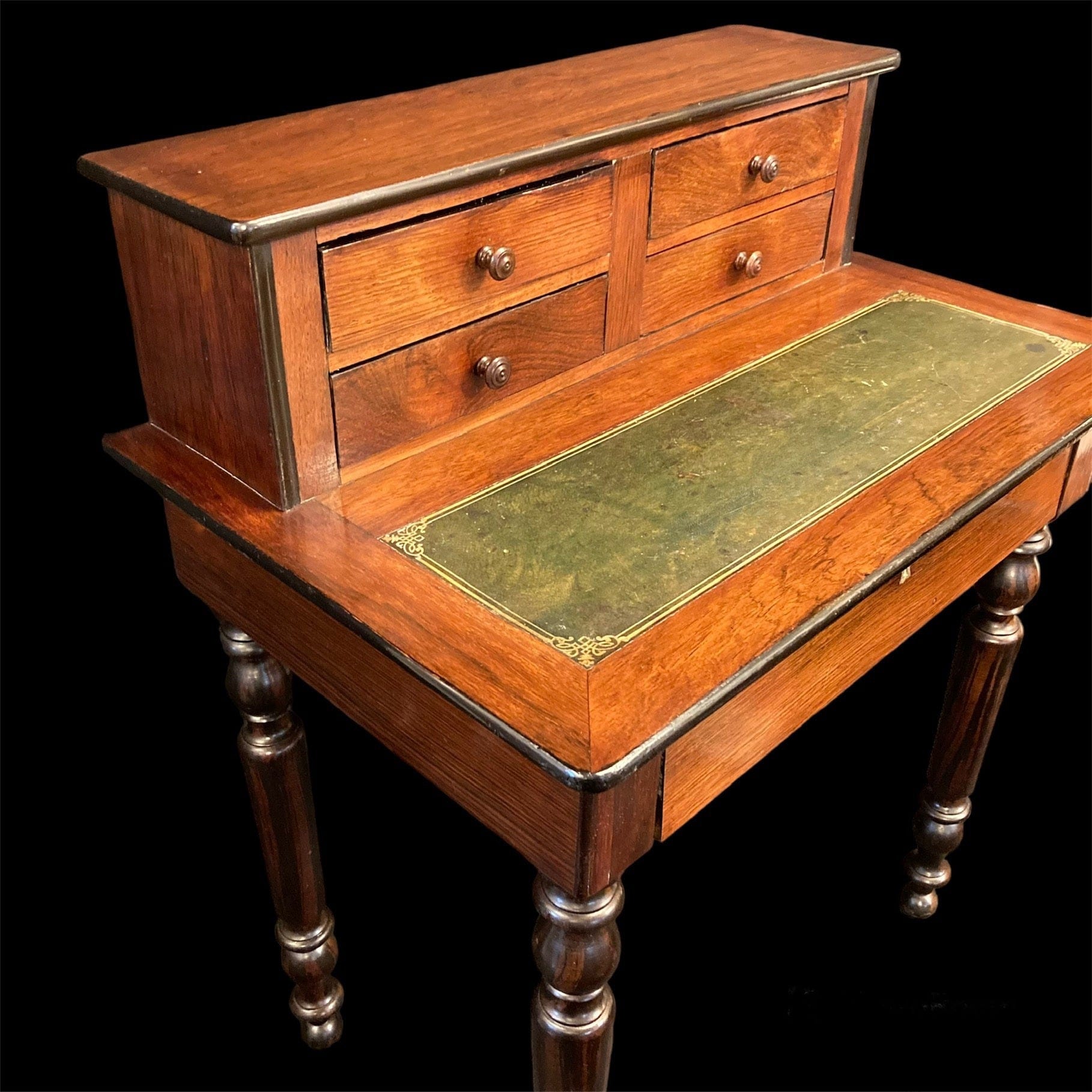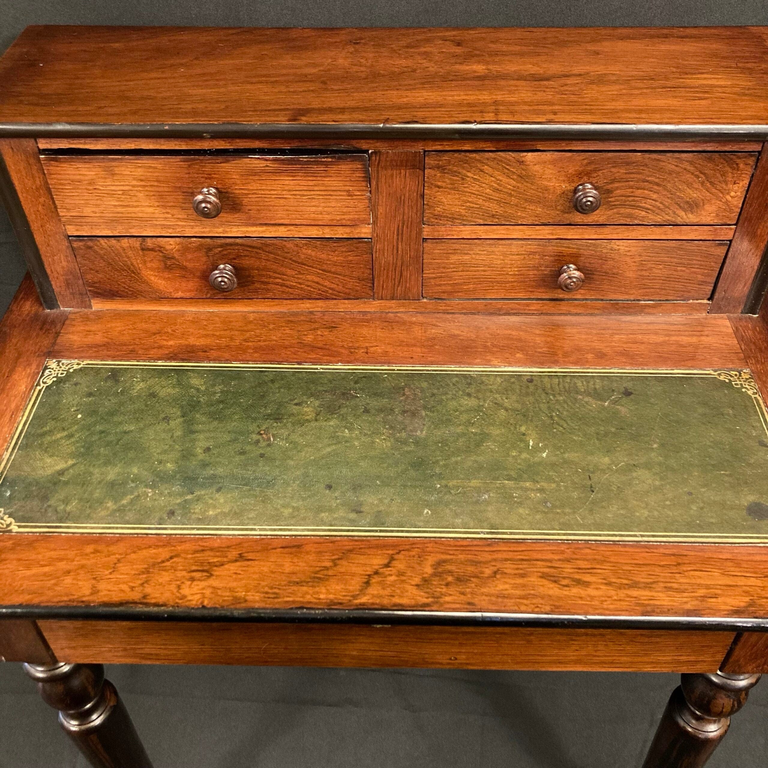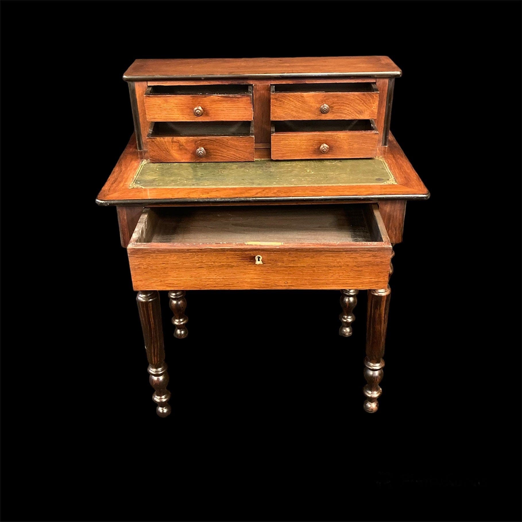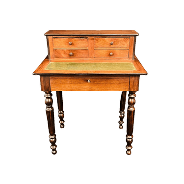 Bello escritorio para niños con cajones en altura. Contiene cuatro cajones pequeños, una cubierta de cuero y un cajón grande bajo la mesa. Sus patas son torneadas.