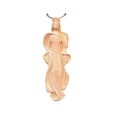 Bella y serena escultura en arcilla del reconocido pintor chileno Héctor Román (1927-2007). En ella se puede apreciar el delicado esculpido de su rostro y el movimiento ondeante del vestuario. La escultura viene con una base de madera y cadena de fierro para colgarla
