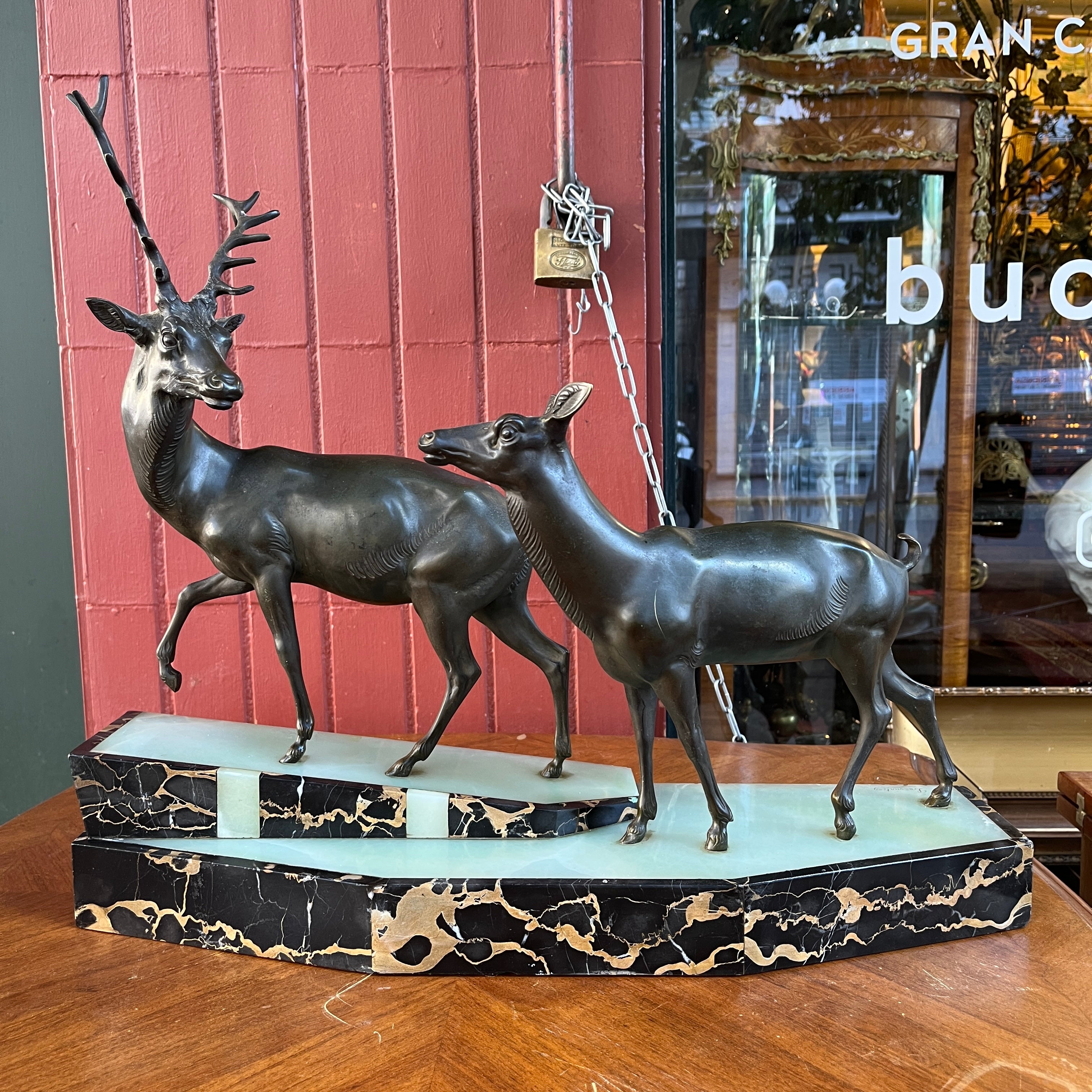 Magnética escultura de bronce de una pareja de ciervos, firmada por que reconocido escultor francés Prosper Lecourtier (1851-1925). El gran tamaño de la pieza permite poder observar en detalle el trabajo manual del escultor, destacando la minuciosidad con que esculpe a los animales y también ofrece un preciosa base de ónix color verde agua y un borde de mármol negro con vetas doradas.