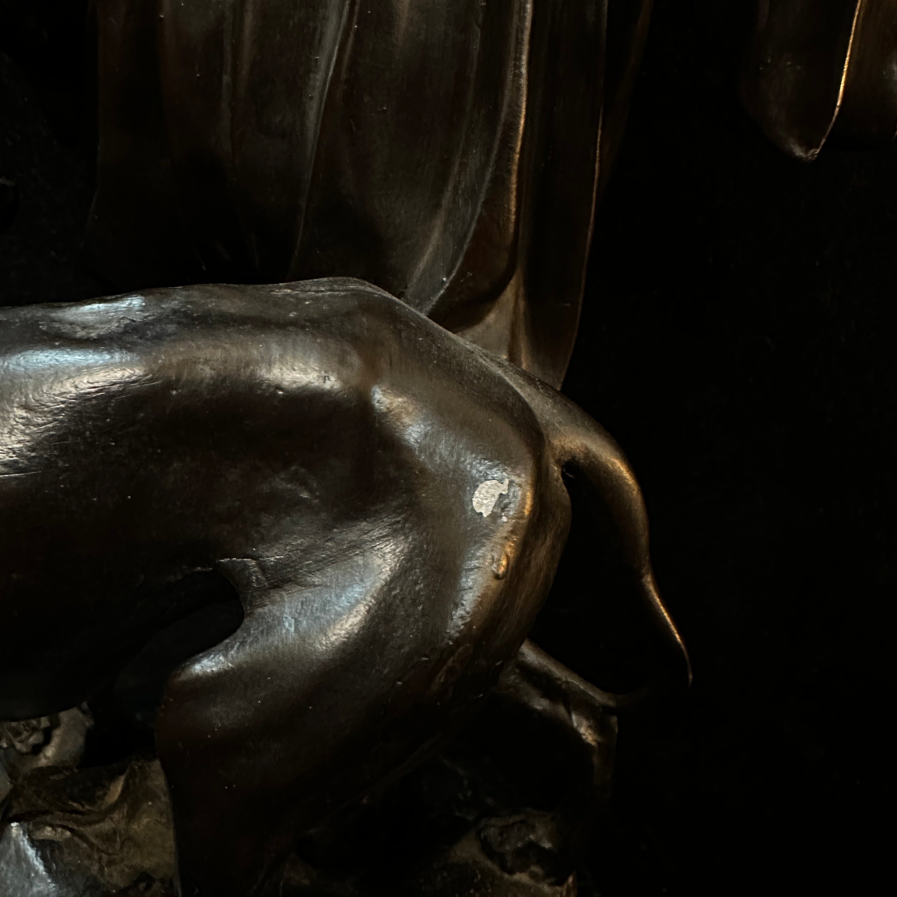 Imponente escultura de estaño de Émile-Coriolan Guillermin, escultor francés, que retrata a un cazador de Medio Oriente en movimiento, ataviado con vestimenta tradicional. Lleva una presa al hombro y camina junto a su perro, en una escena inspirada en los viajes de Guillemin a Oriente Medio y al norte de África para crear obras que reflejaban características antropológicas de las culturas locales.
