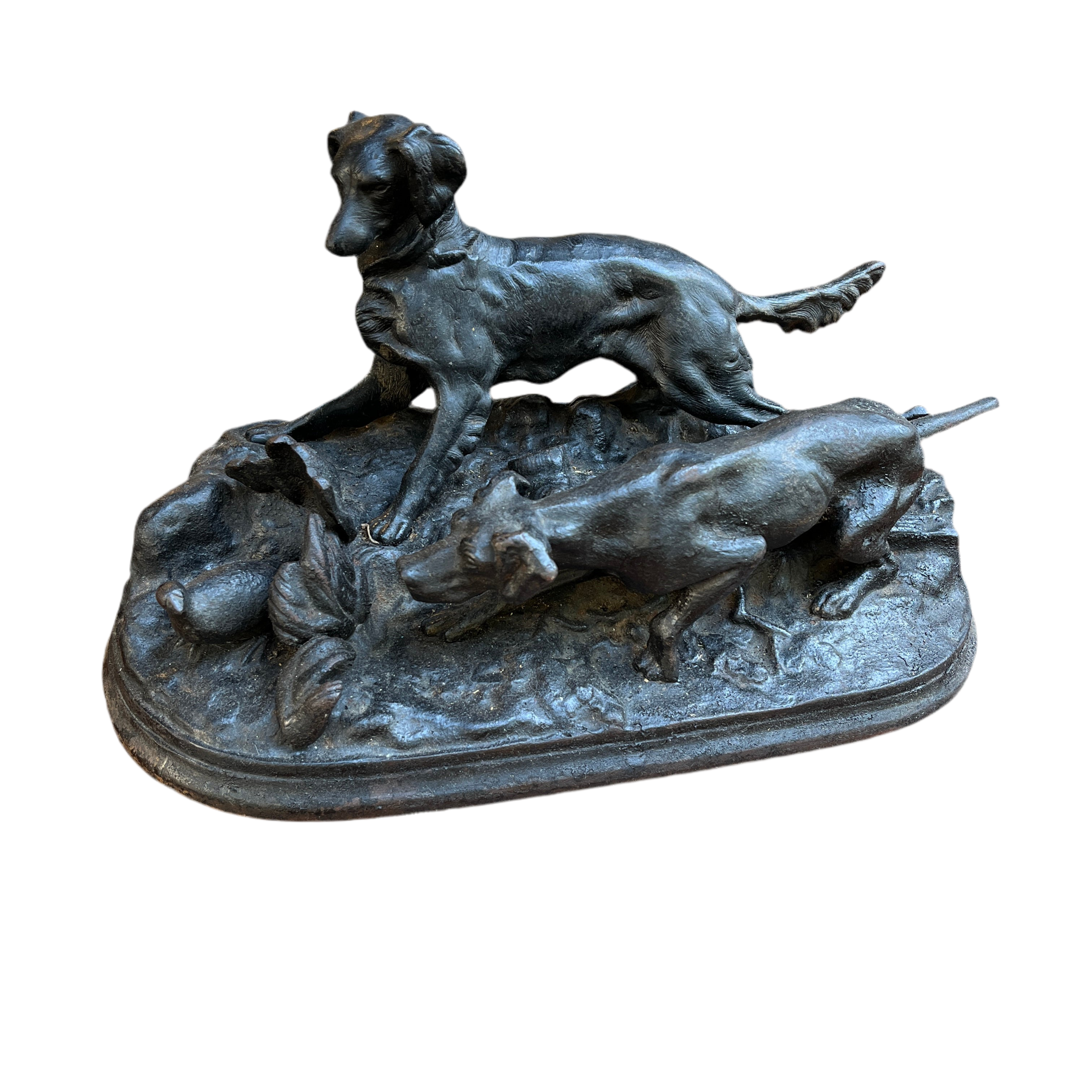 Escultura francesa de fierro fundido perros cazando una codorniz