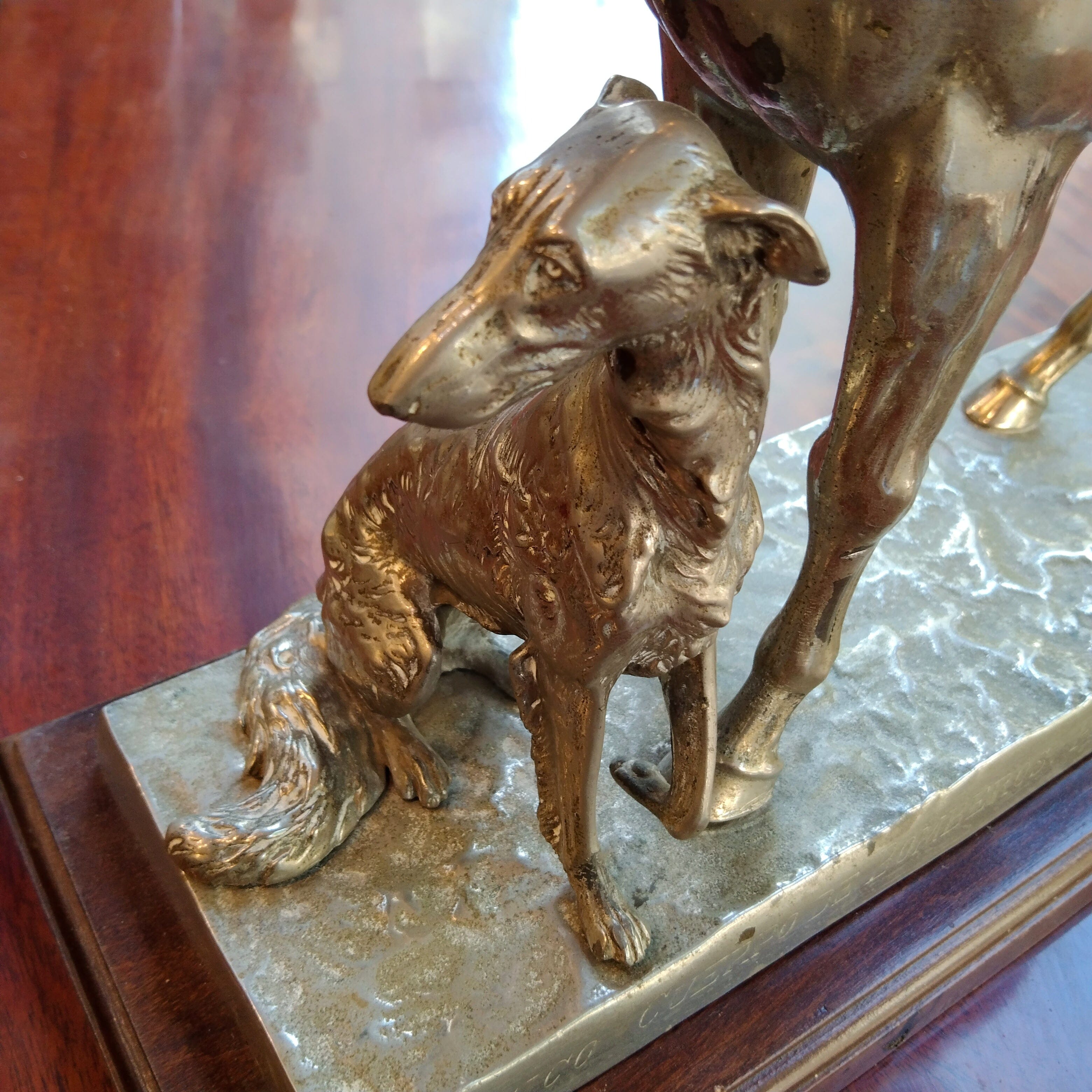 Bella figura de Peltre con base de madera, representando a un majestuoso caballo acompañado de un perro galgo. La figura tiene una inscripción correspondiente al Cuerpo de Bomberos de Punta Arenas y data del año 1938.