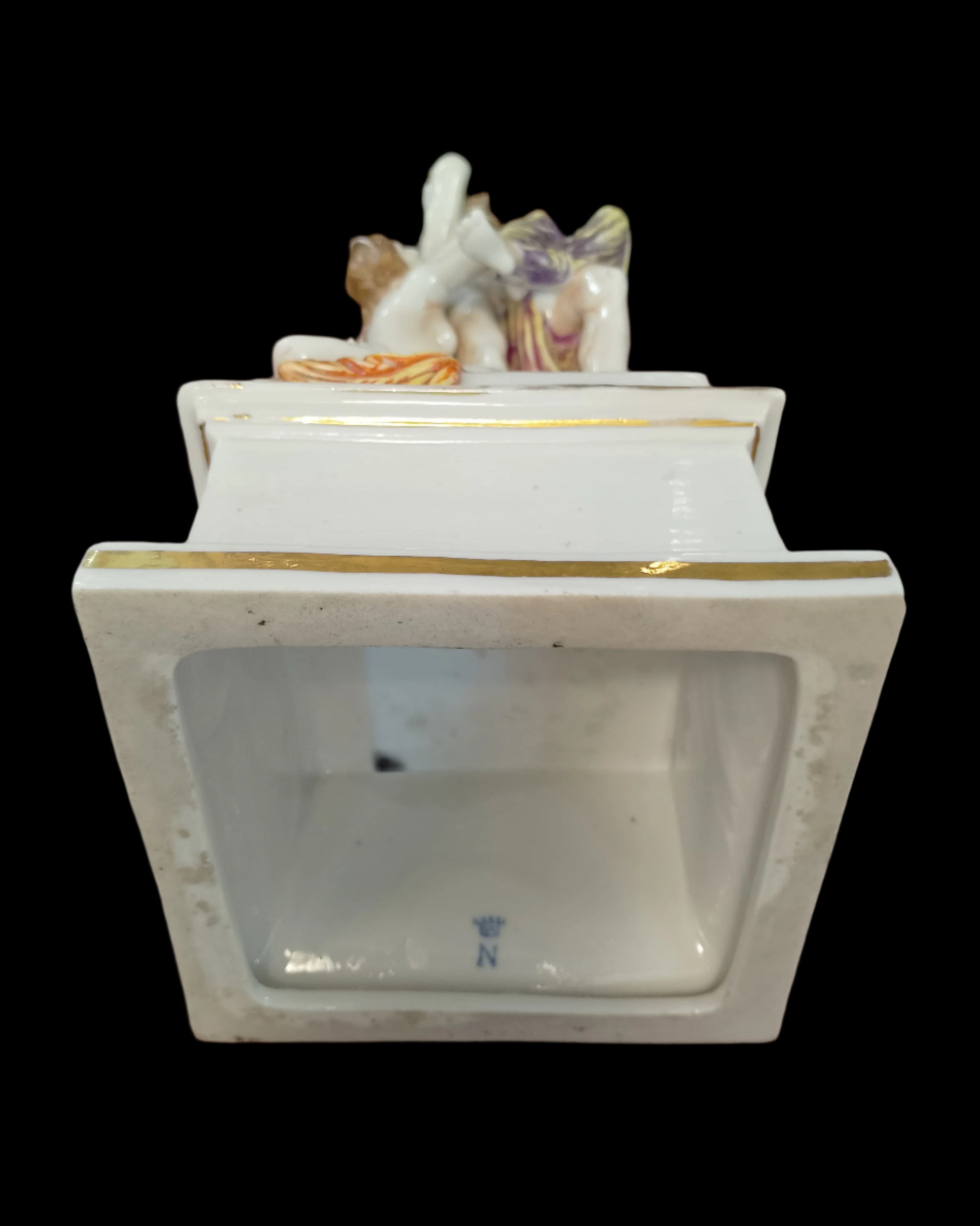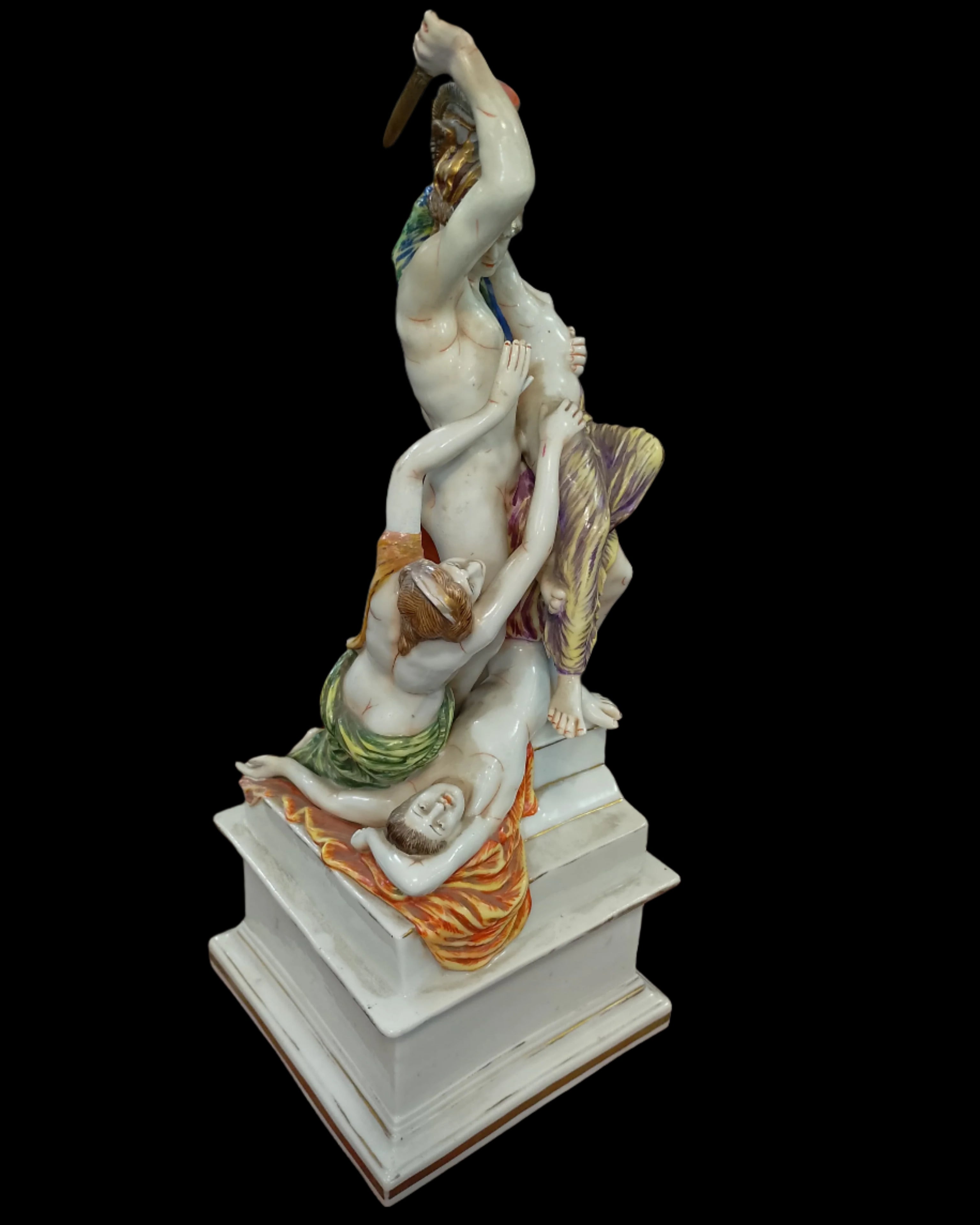Bellísima figura de porcelana italiana Capodimonte representando el rapto de Políxena, hija del rey Príamo de Troya, a manos de Neoptólemo. Presenta colores brillantes en las figuras humanas y líneas doradas en el perímetro de la base pedestal. Por dentro de la base figura el reconocible sello Capodimonte con la N coronada.
