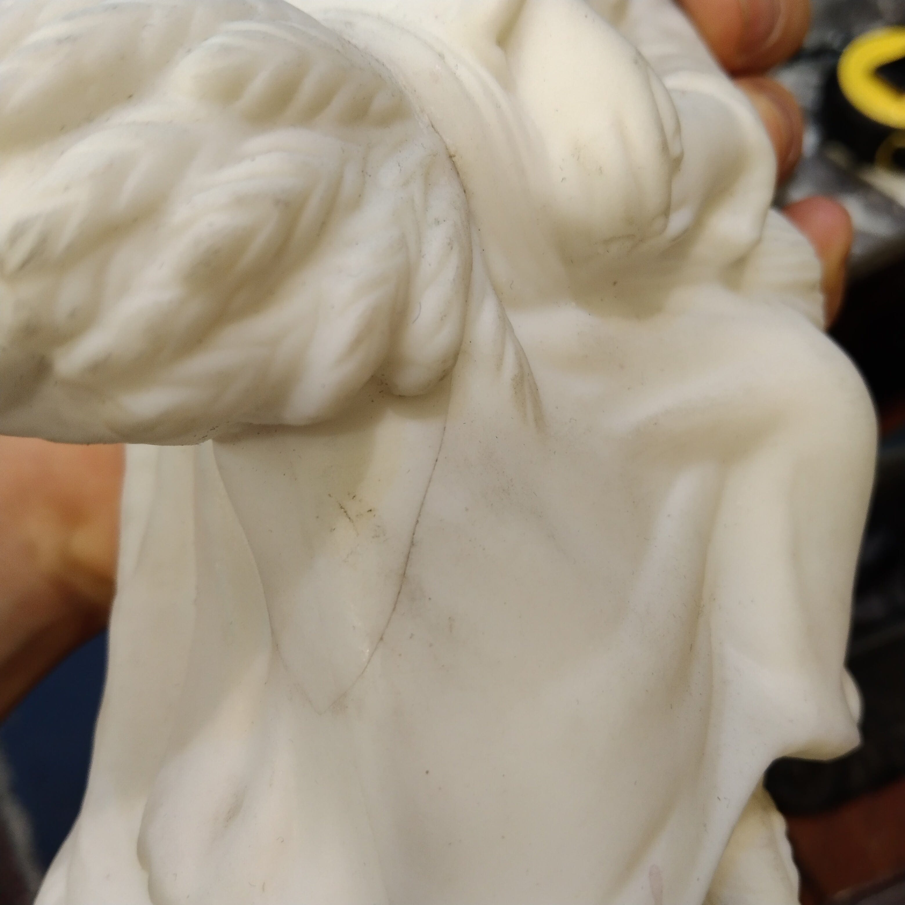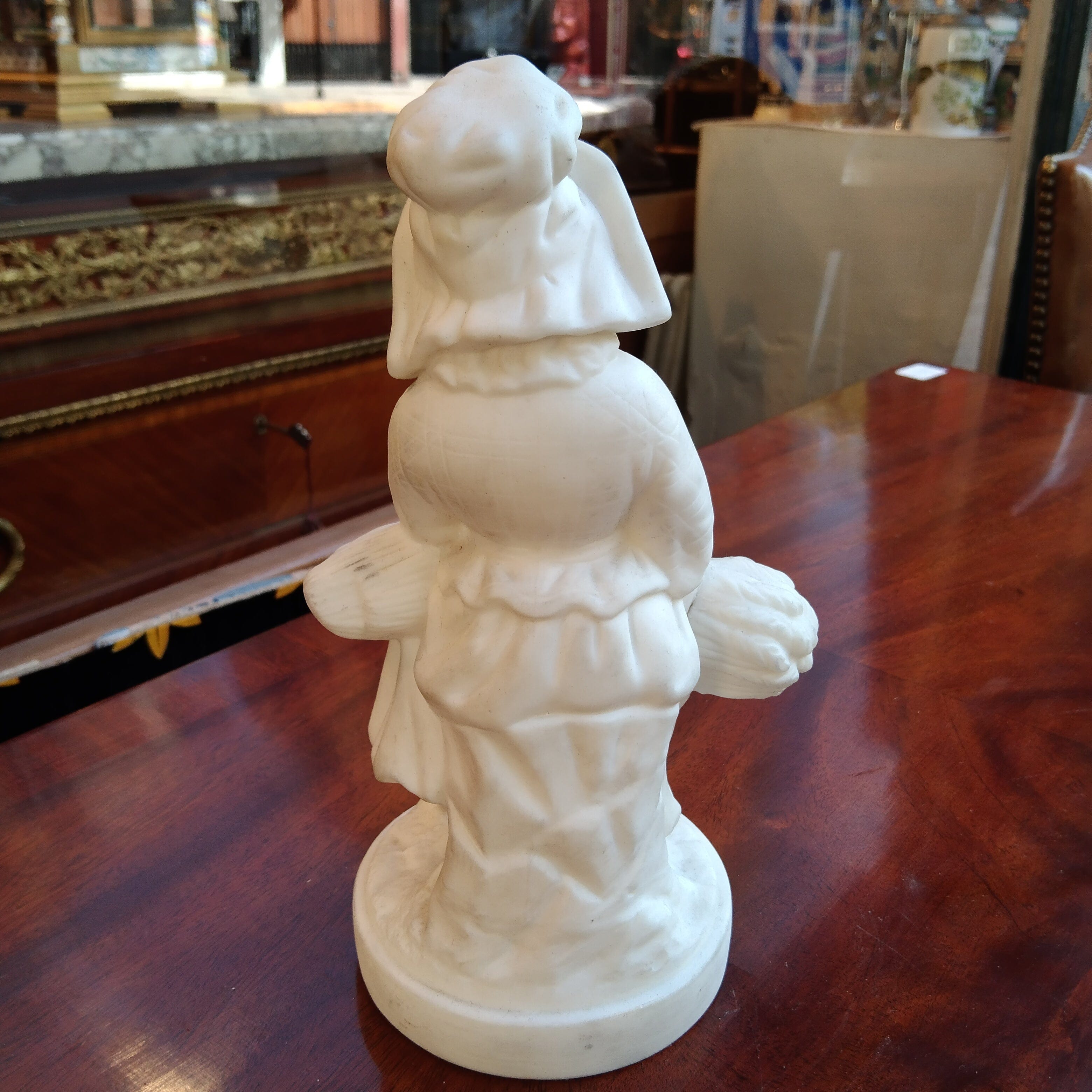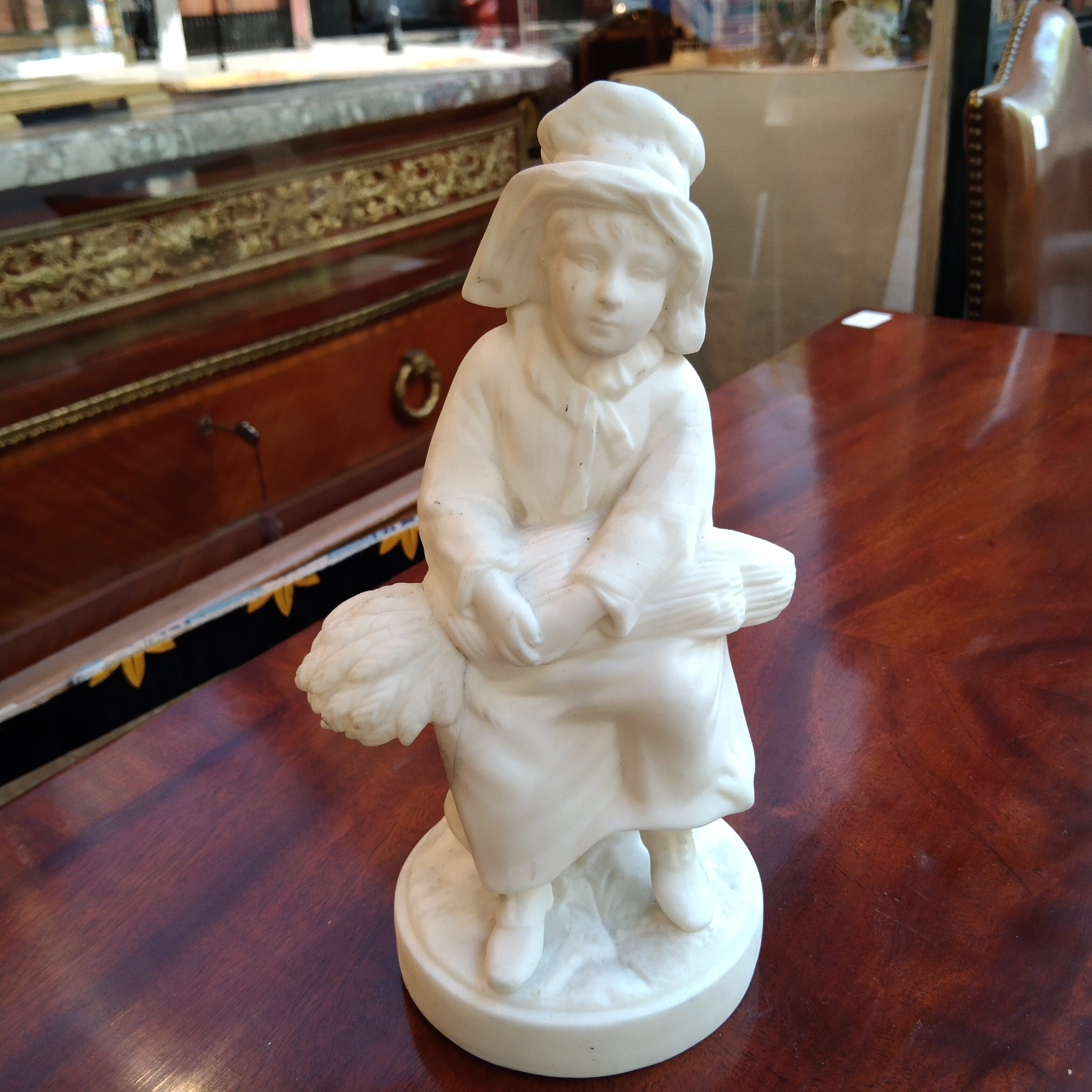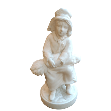 Linda y sobria figura de biscuit representando a una mujer campesina, sentada con un montón de trigo en sobre sus piernas.