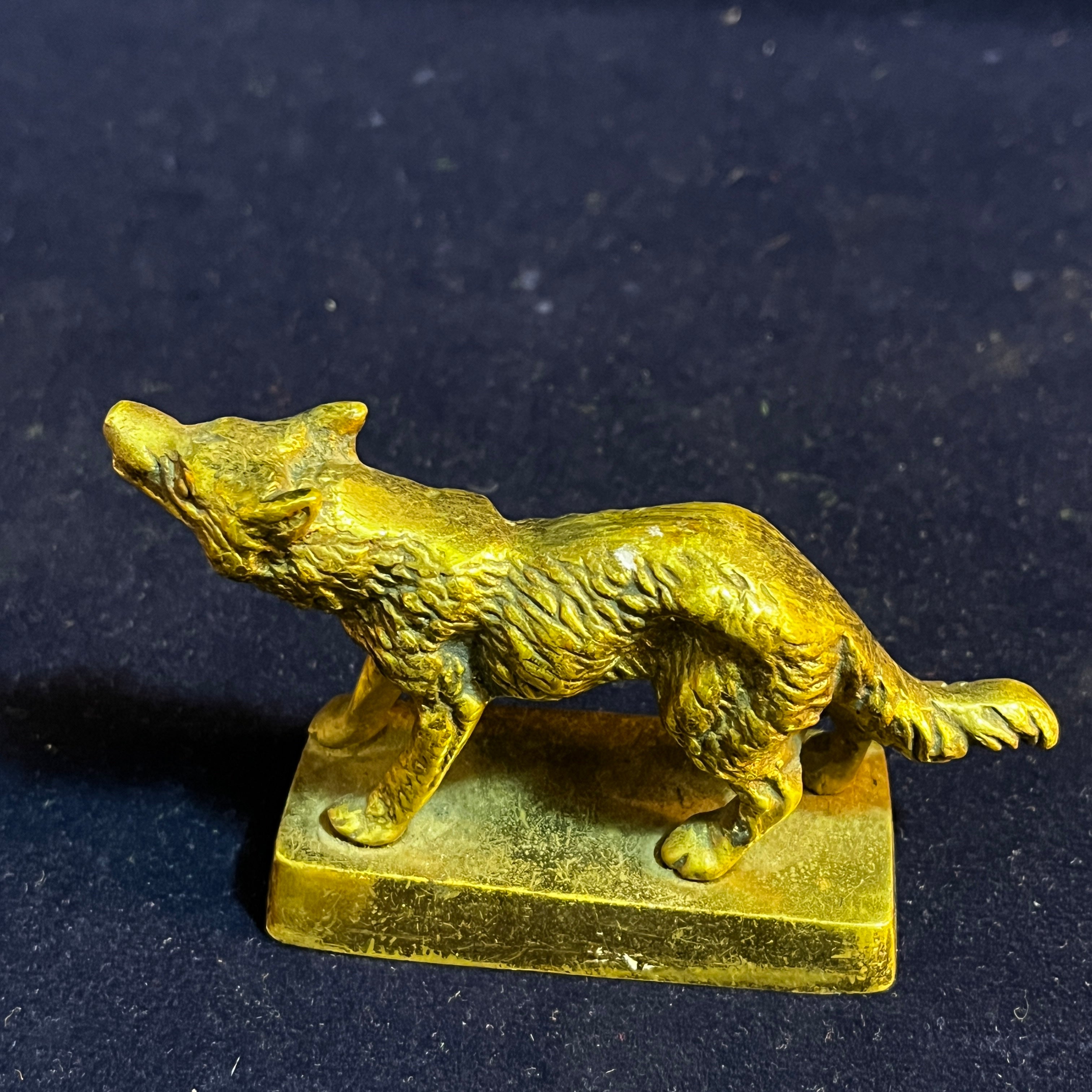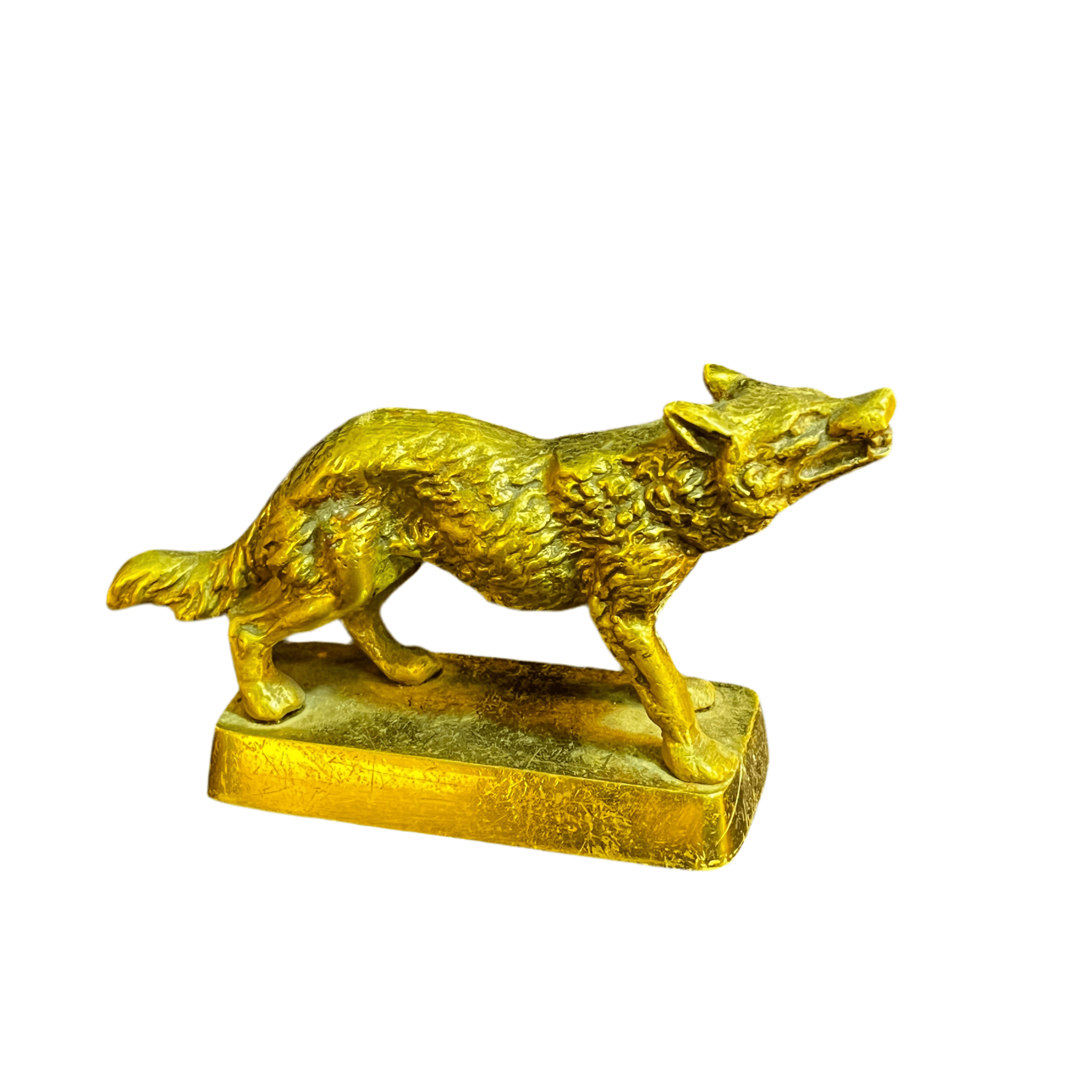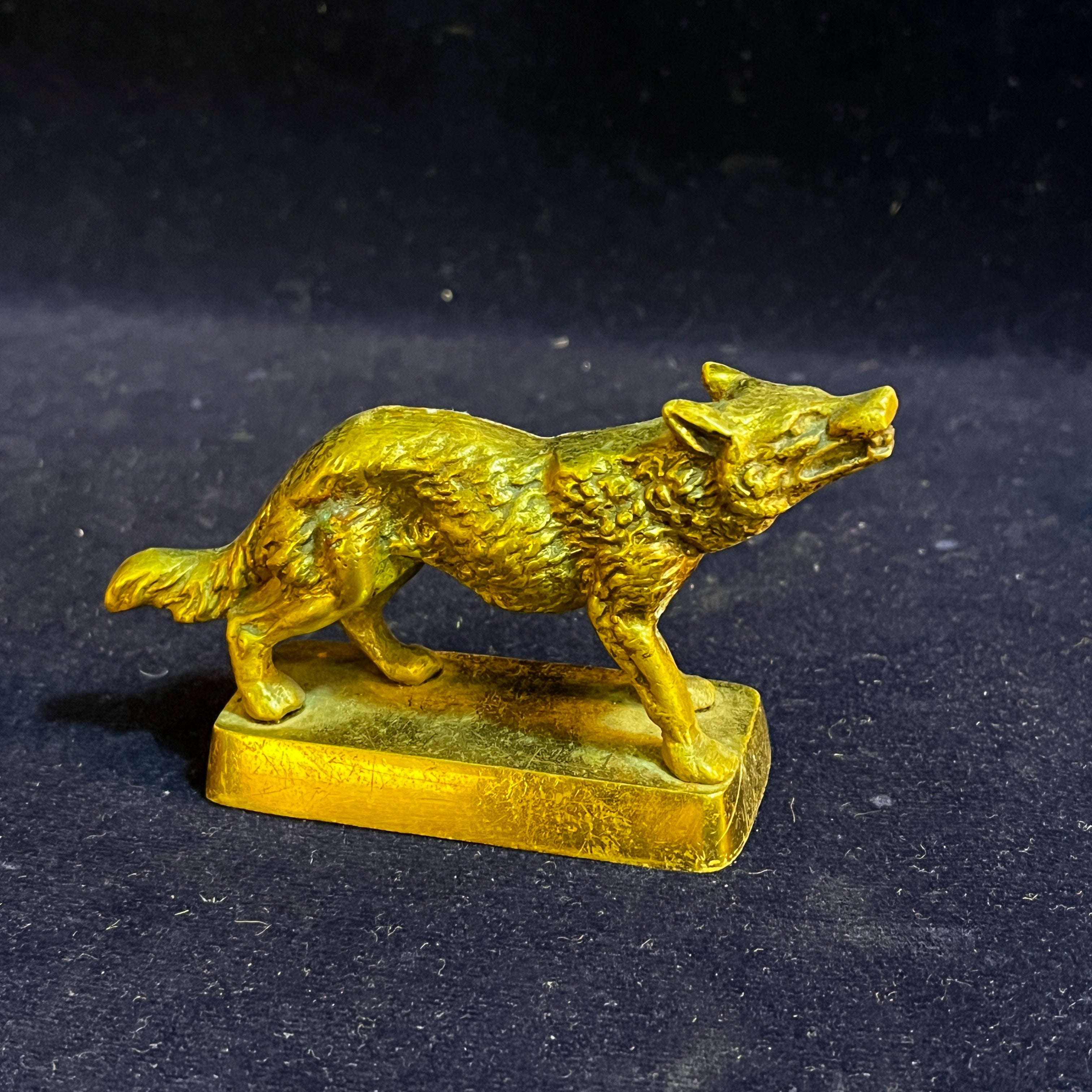 Figura de bronce, de origen francés, representando a un lobo, gruñendo. La figura, que está sobre un pedestal de bronce hecho en la misma pieza, captura muy bien la actitud agresiva del animal y la textura de su pelaje.