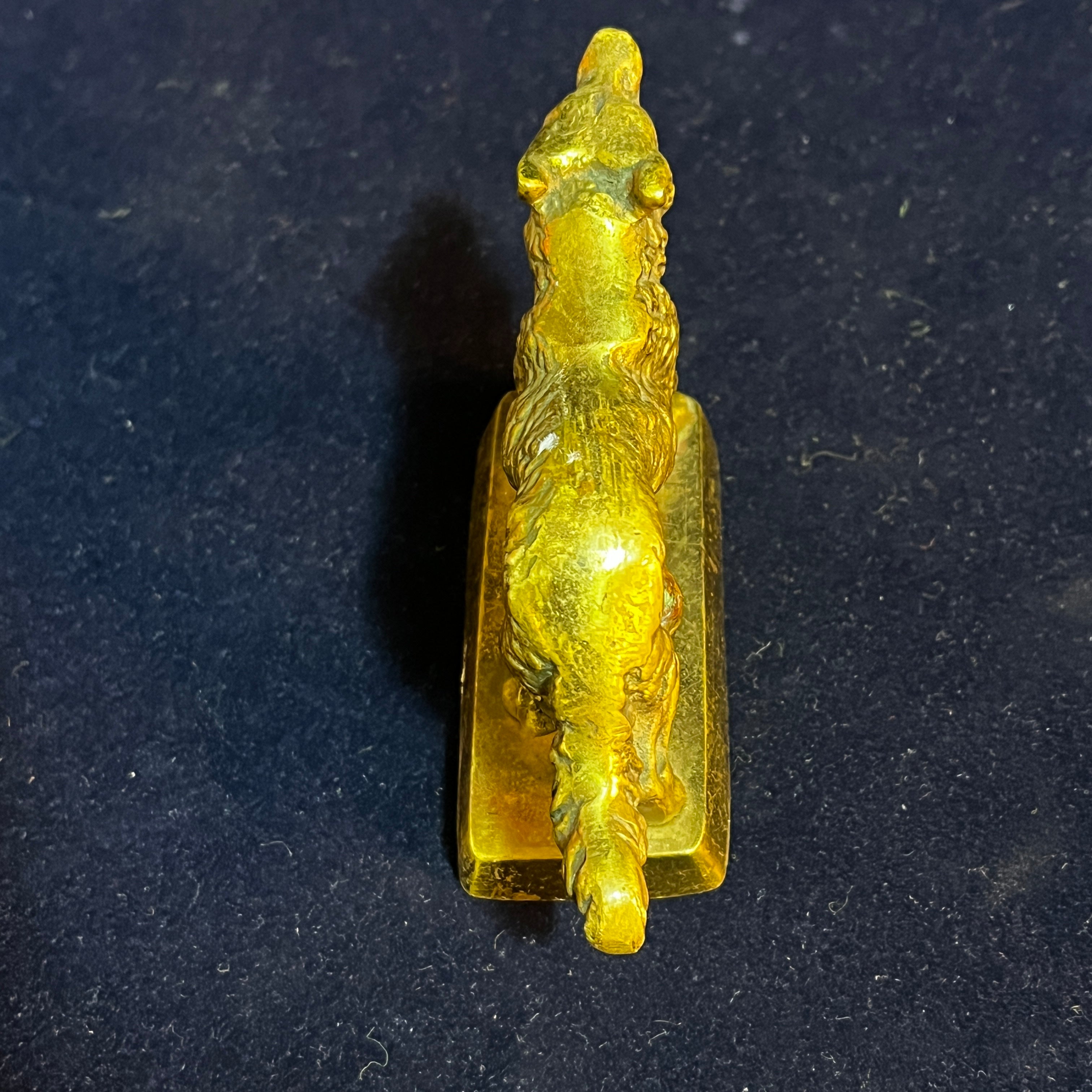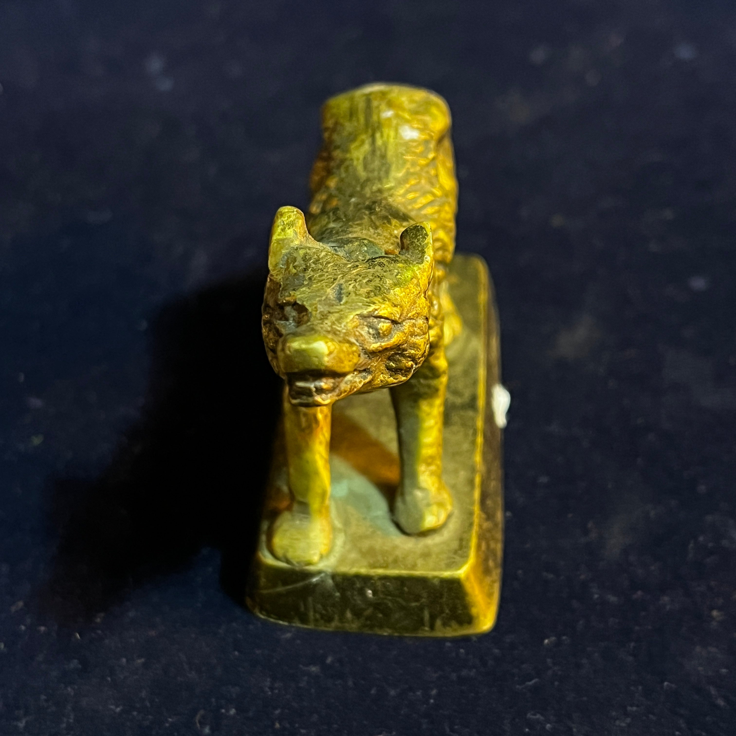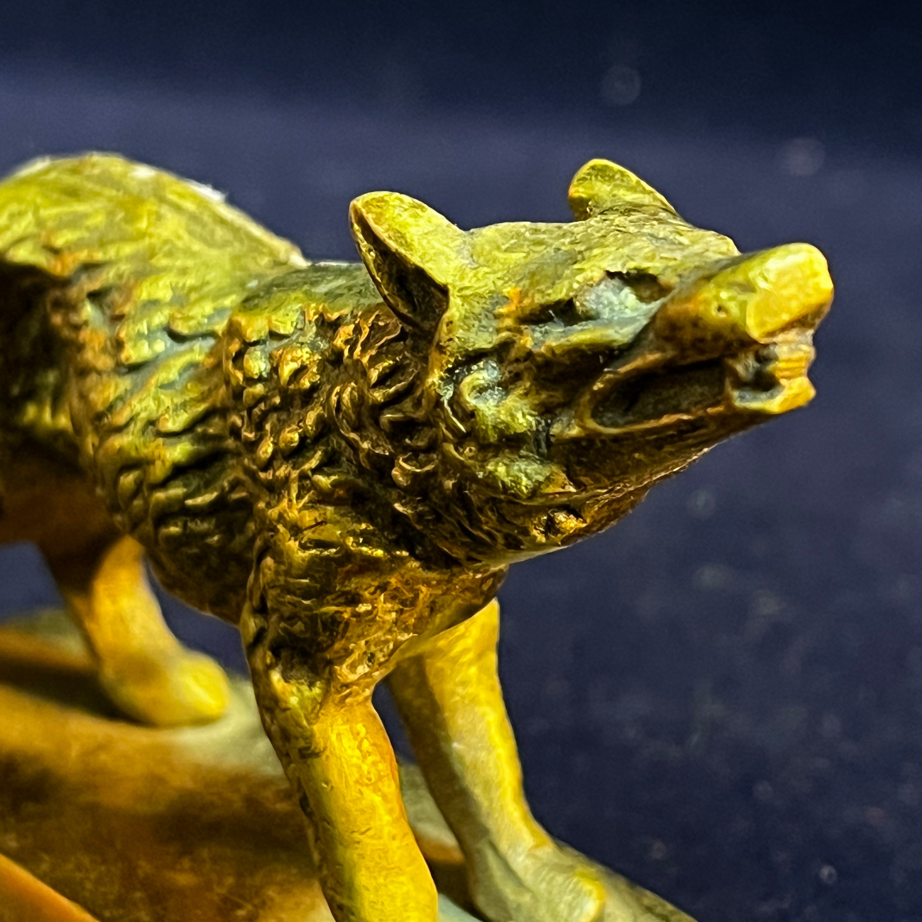 Figura de bronce, de origen francés, representando a un lobo, gruñendo. La figura, que está sobre un pedestal de bronce hecho en la misma pieza, captura muy bien la actitud agresiva del animal y la textura de su pelaje.